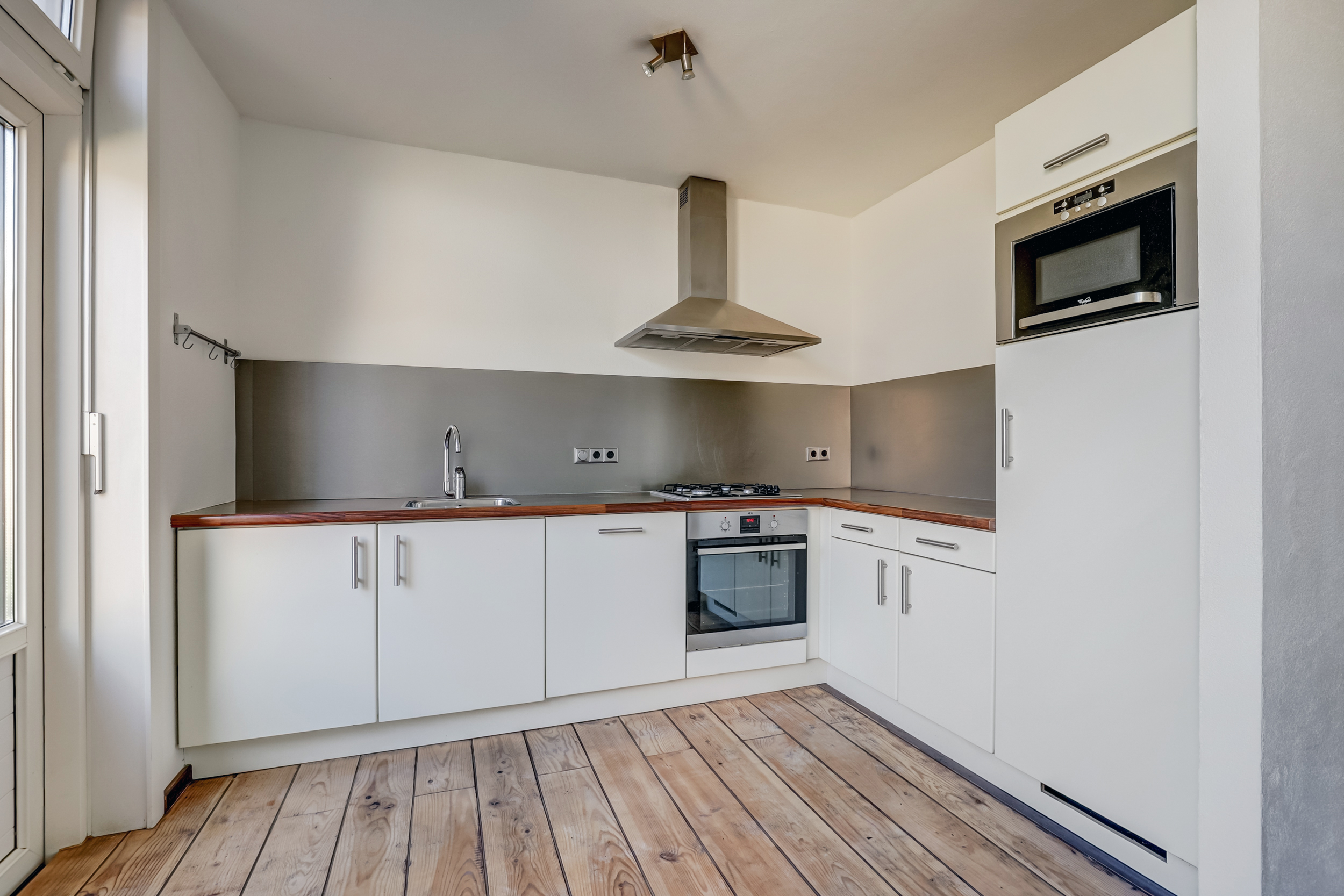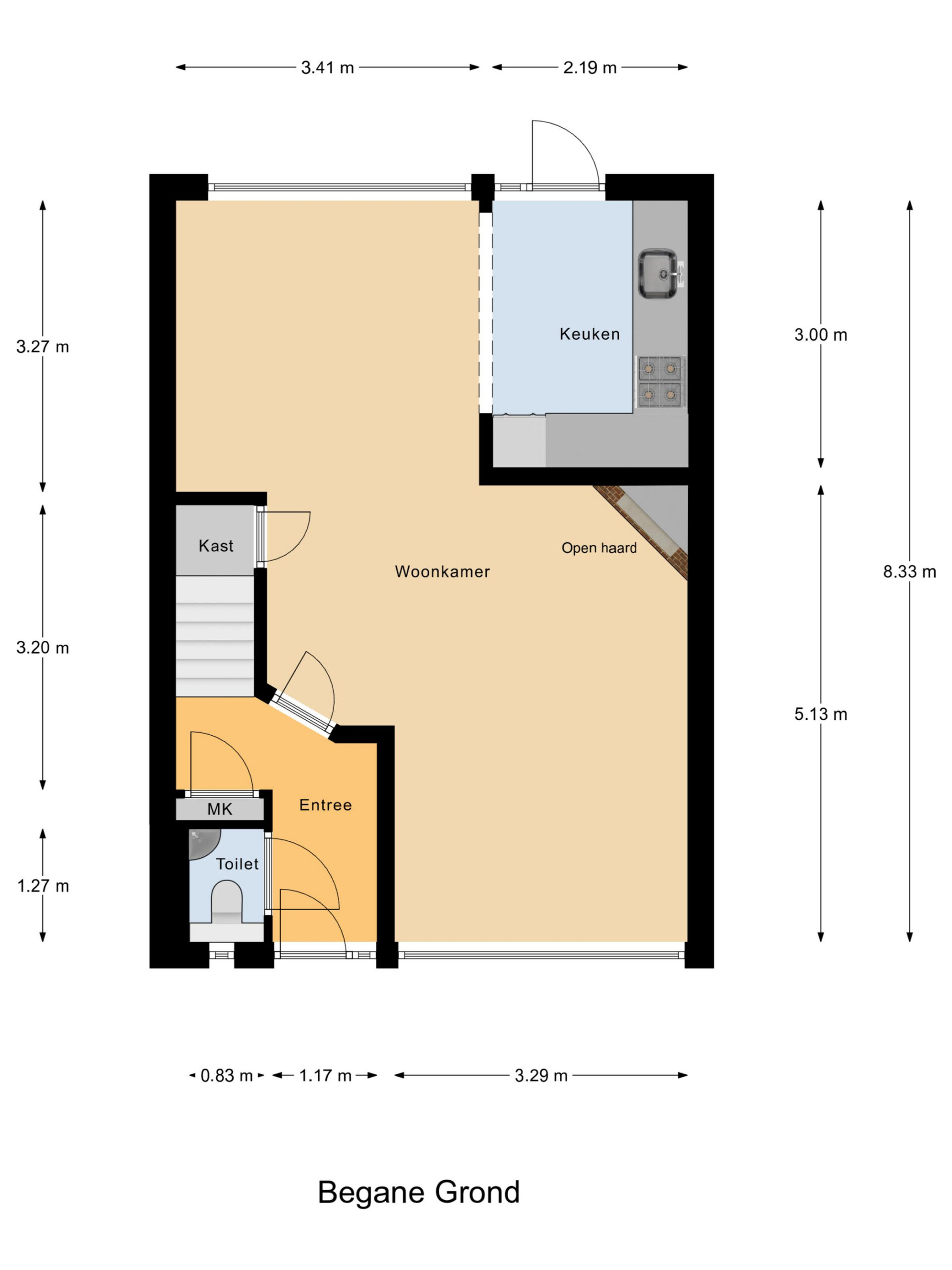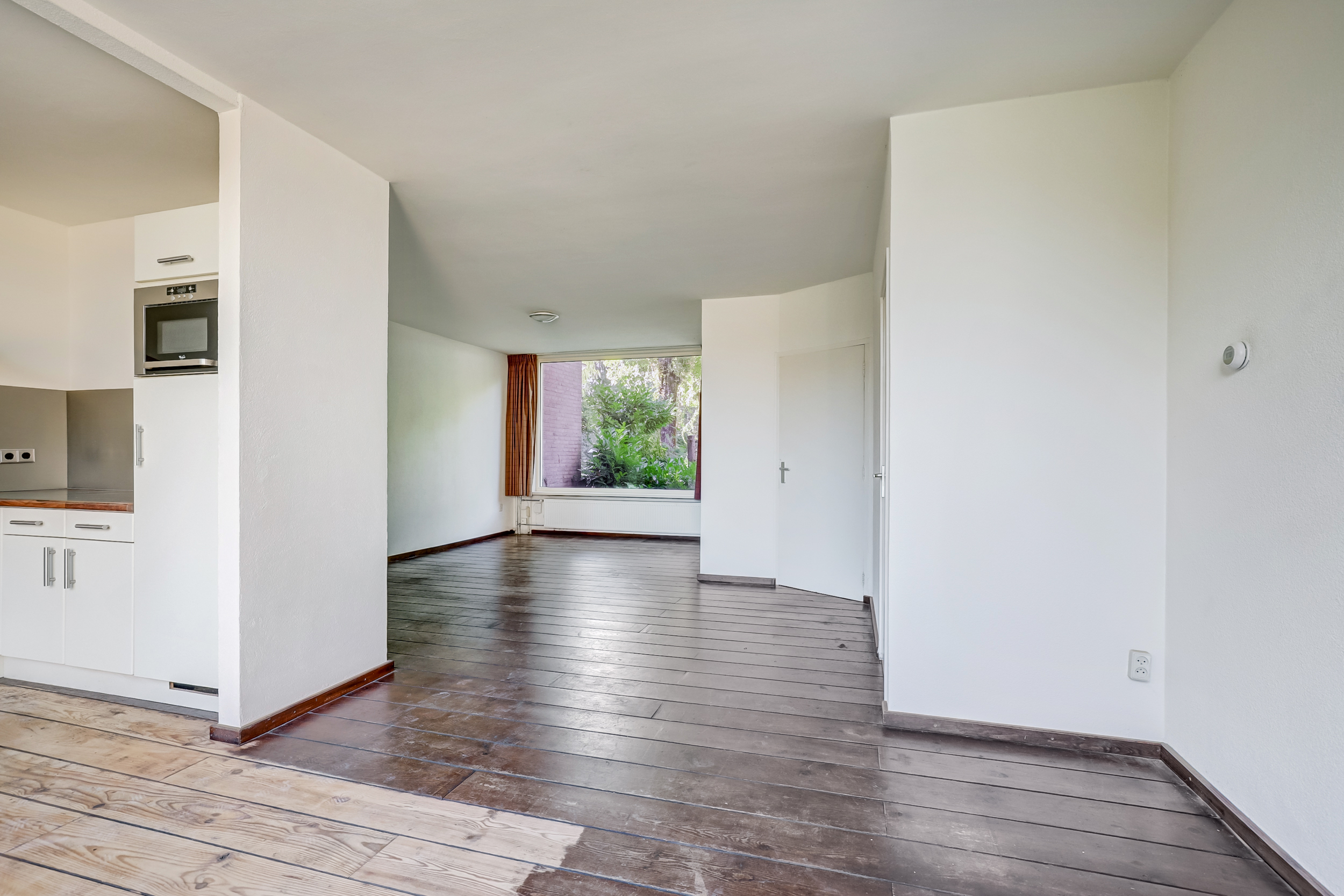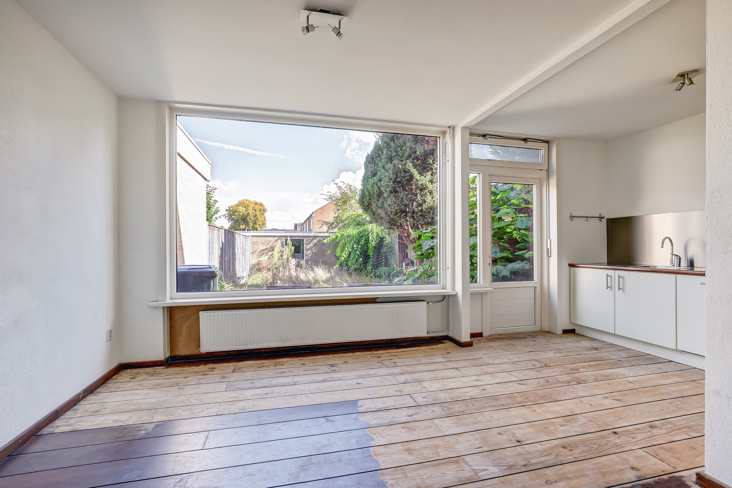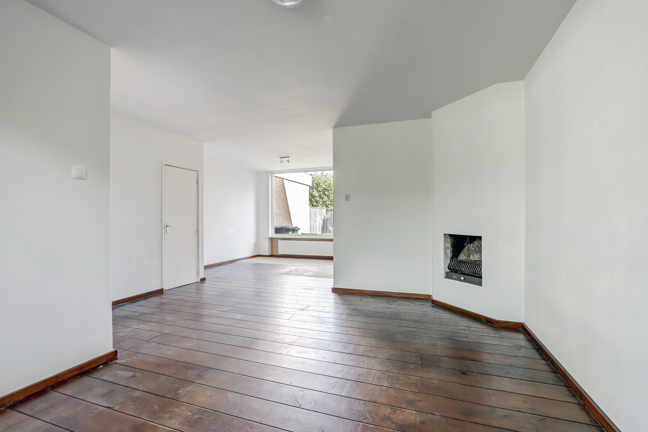 Je komt binnen in de hal, waar het toilet met fontein, de meterkast en de trap naar de eerste verdieping zich bevinden. Vanuit de hal betreed je de ruime, lichte woonkamer, gelegen aan de voorzijde van de woning. De woonkamer is voorzien van een open haard, die zorgt voor extra sfeer. Aan de achterzijde van de woning bevindt zich de halfopen keuken, uitgerust met een 4-pits gasfornuis, oven en koelkast. Vanuit de keuken is er tevens toegang tot de achtertuin.