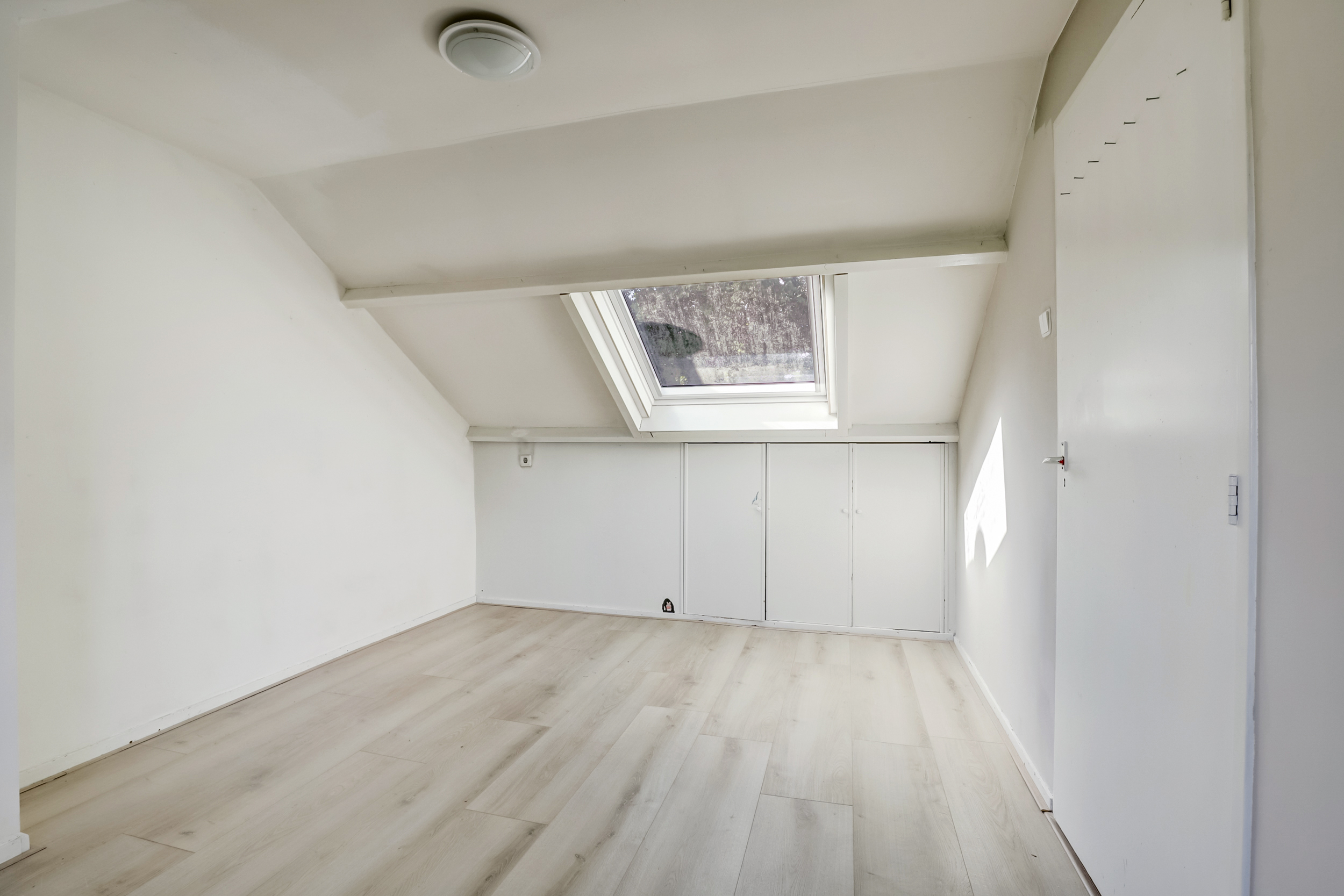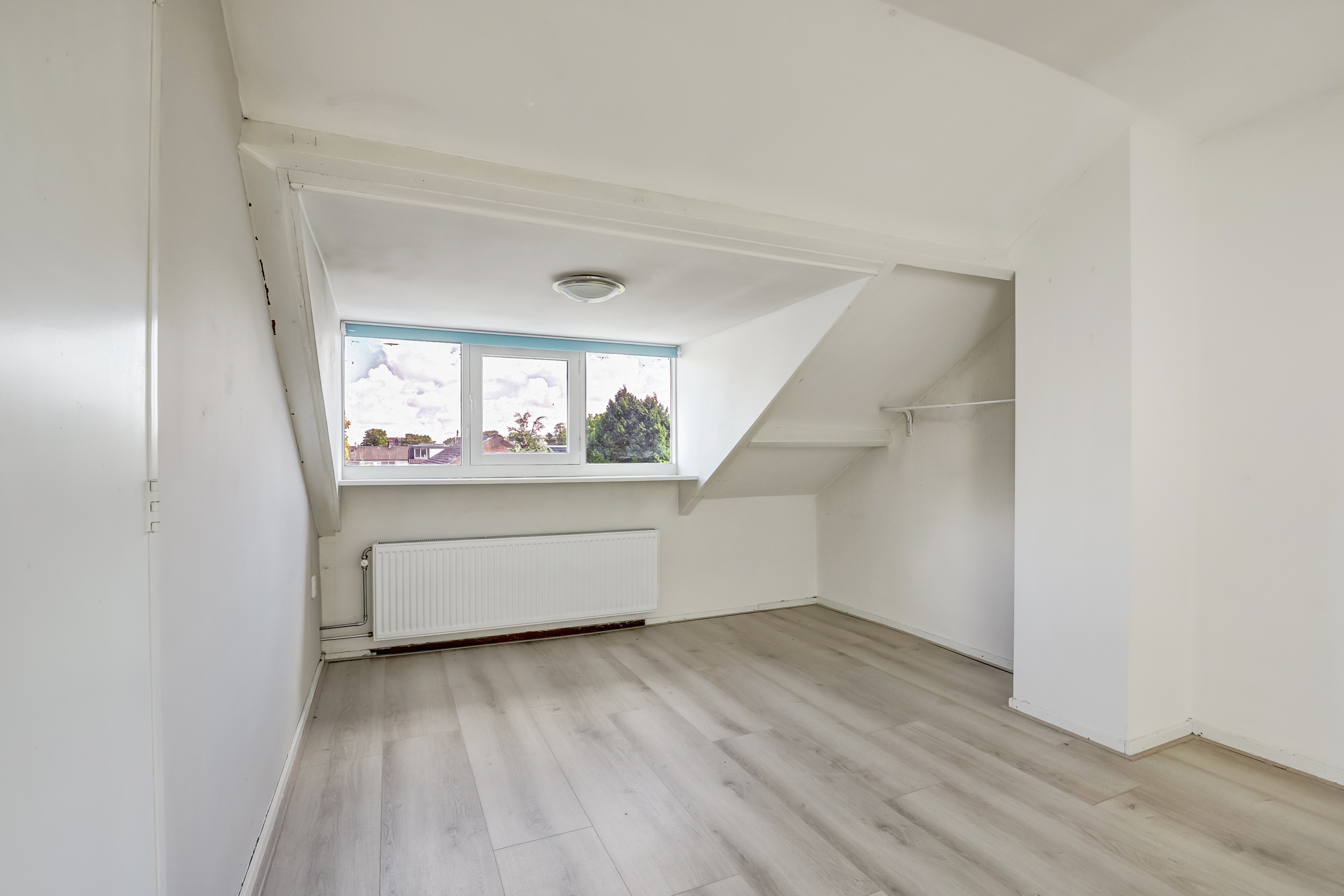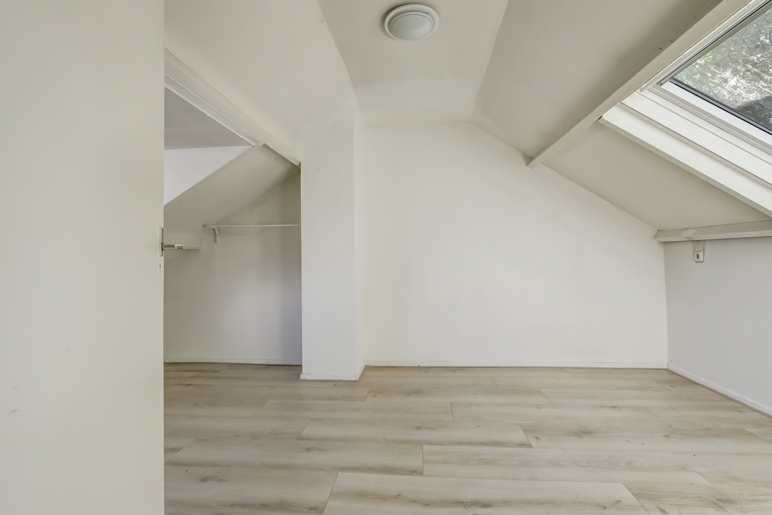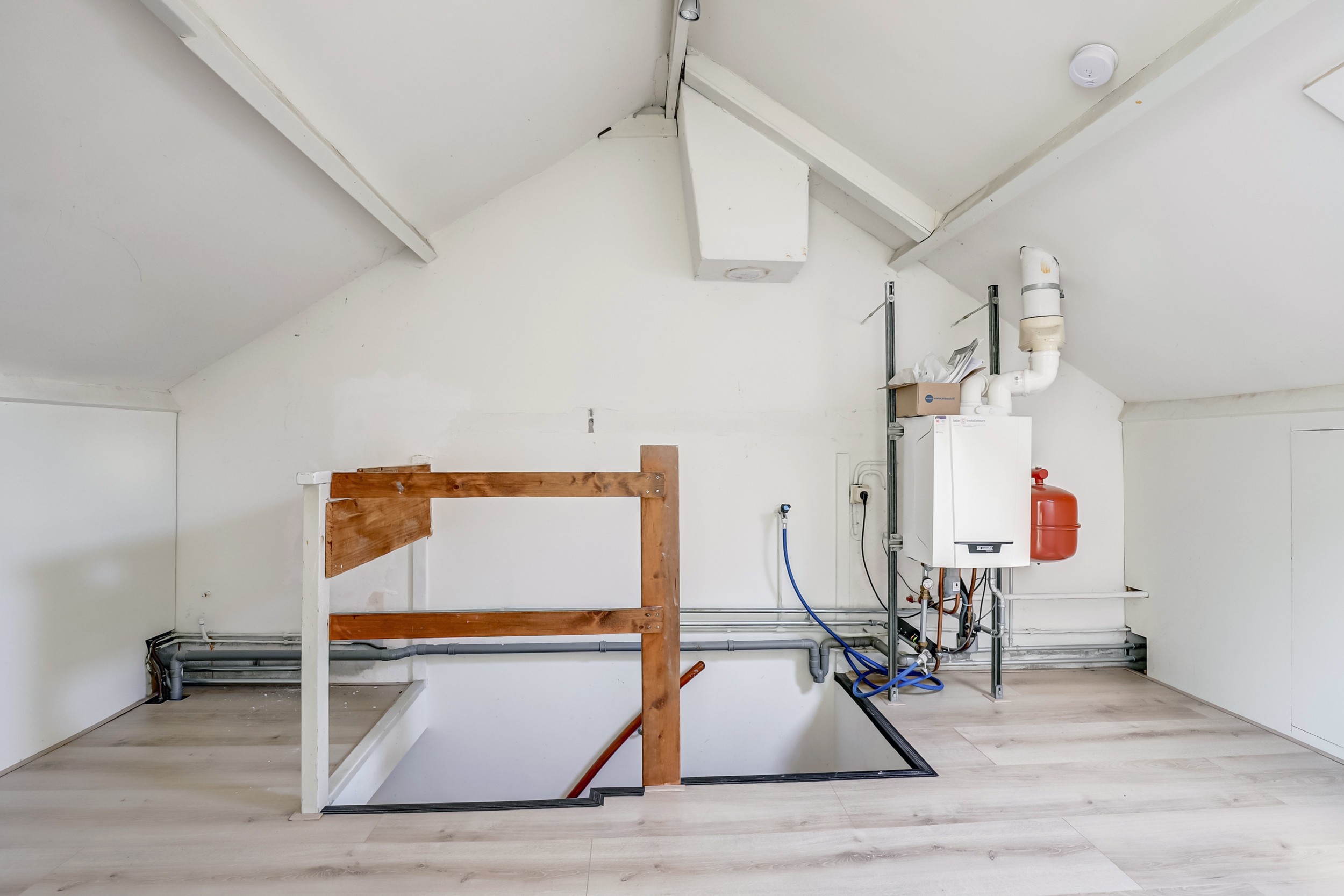 Via een vaste trap bereik je de zolder, waar de cv-installatie is geplaatst. Dankzij het dakkapel en de dakramen is hier een vierde royale slaapkamer ontstaan, met daarnaast extra opbergruimte achter de knieschotten.