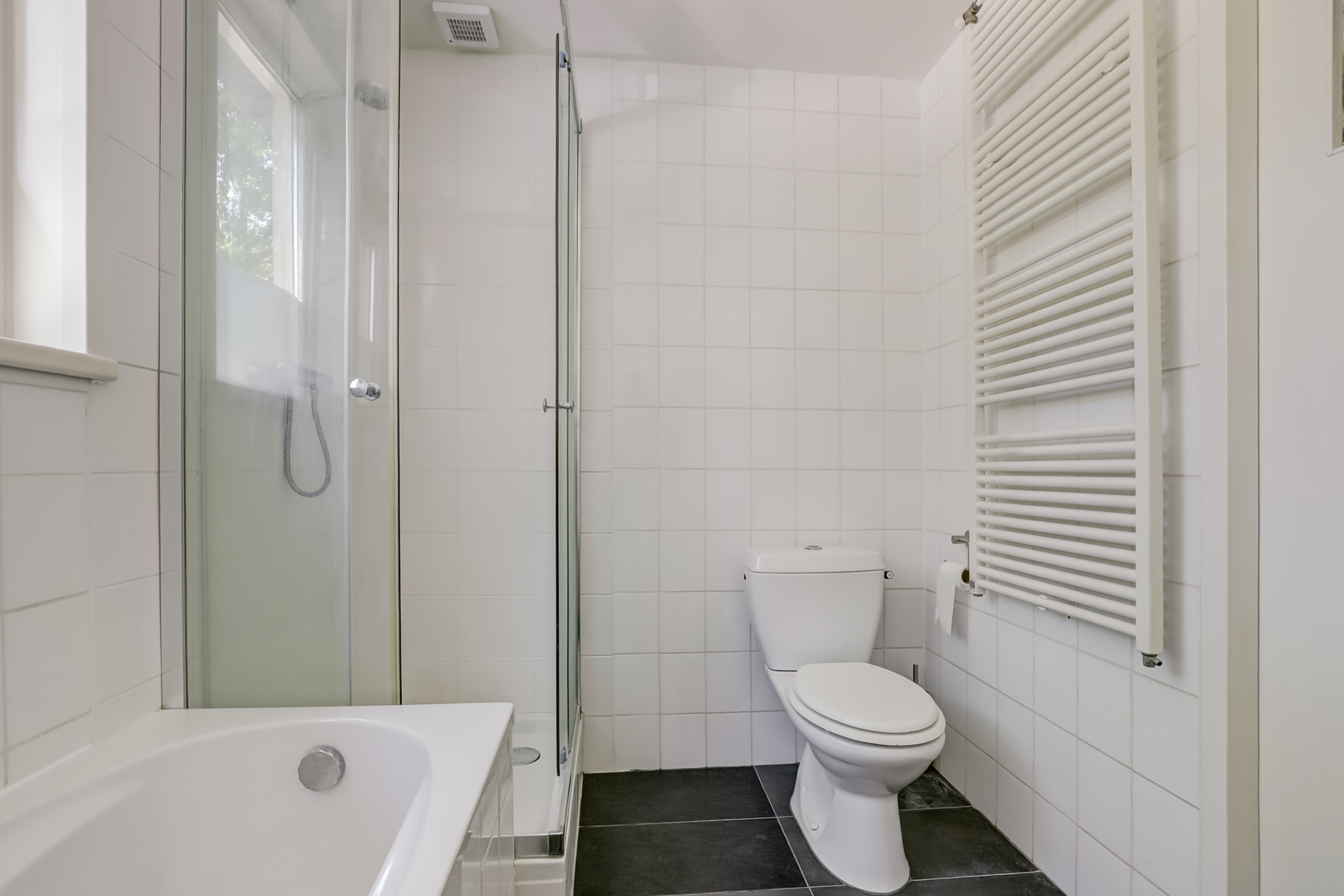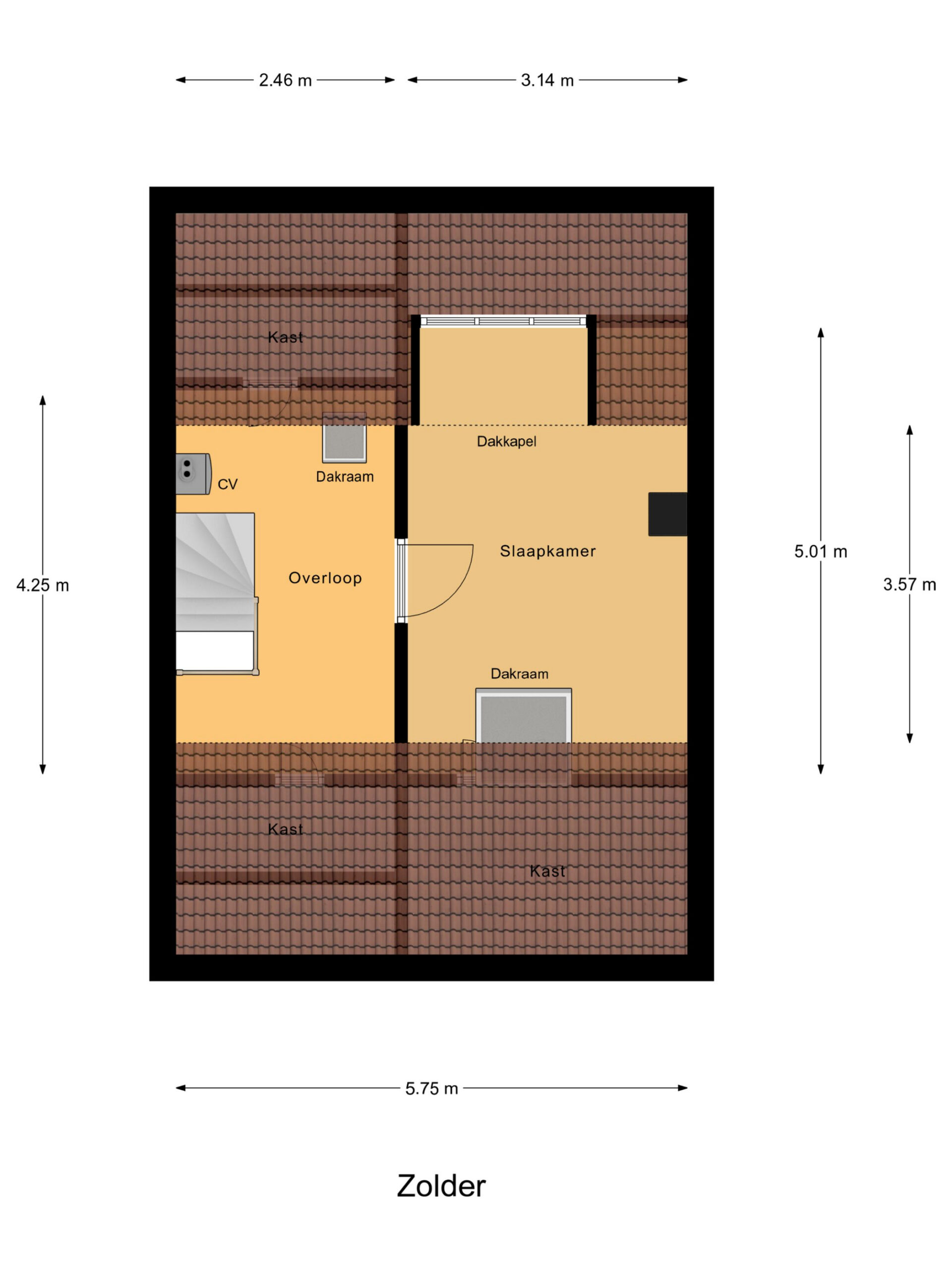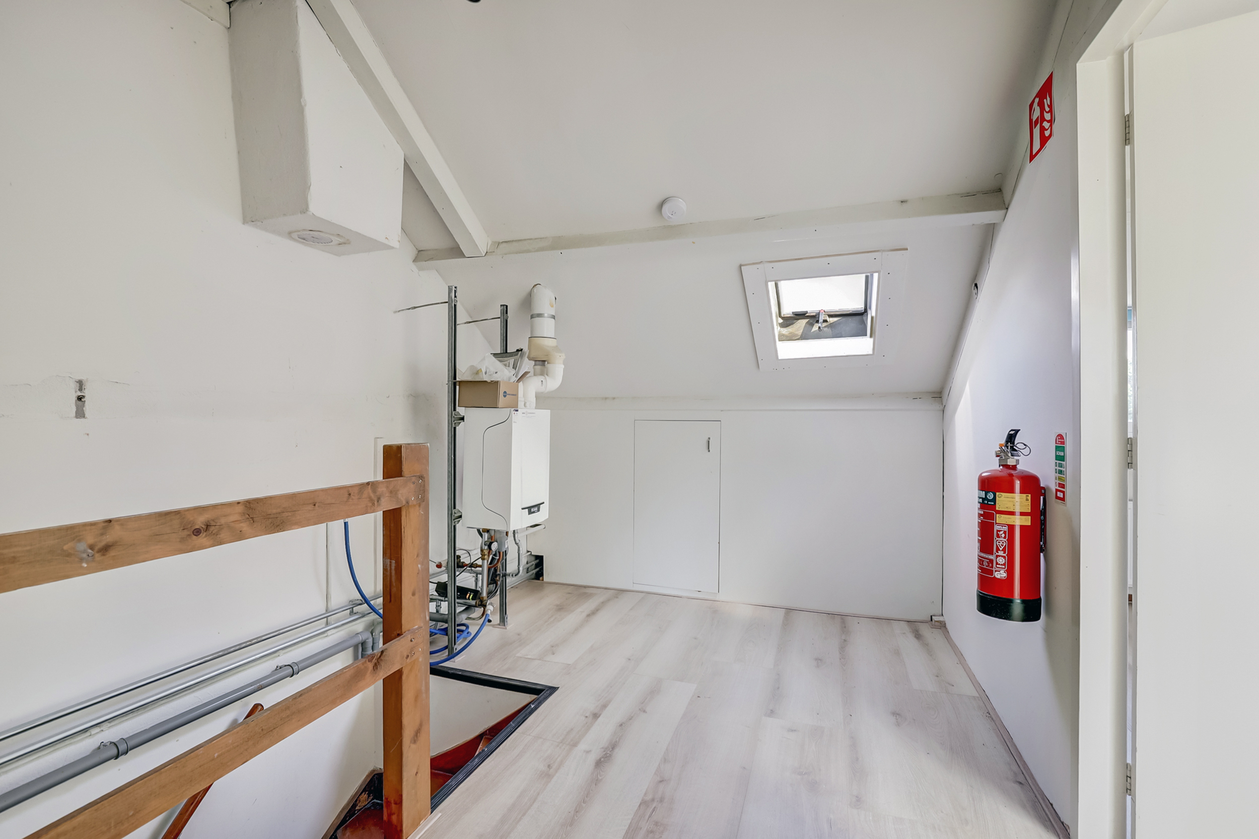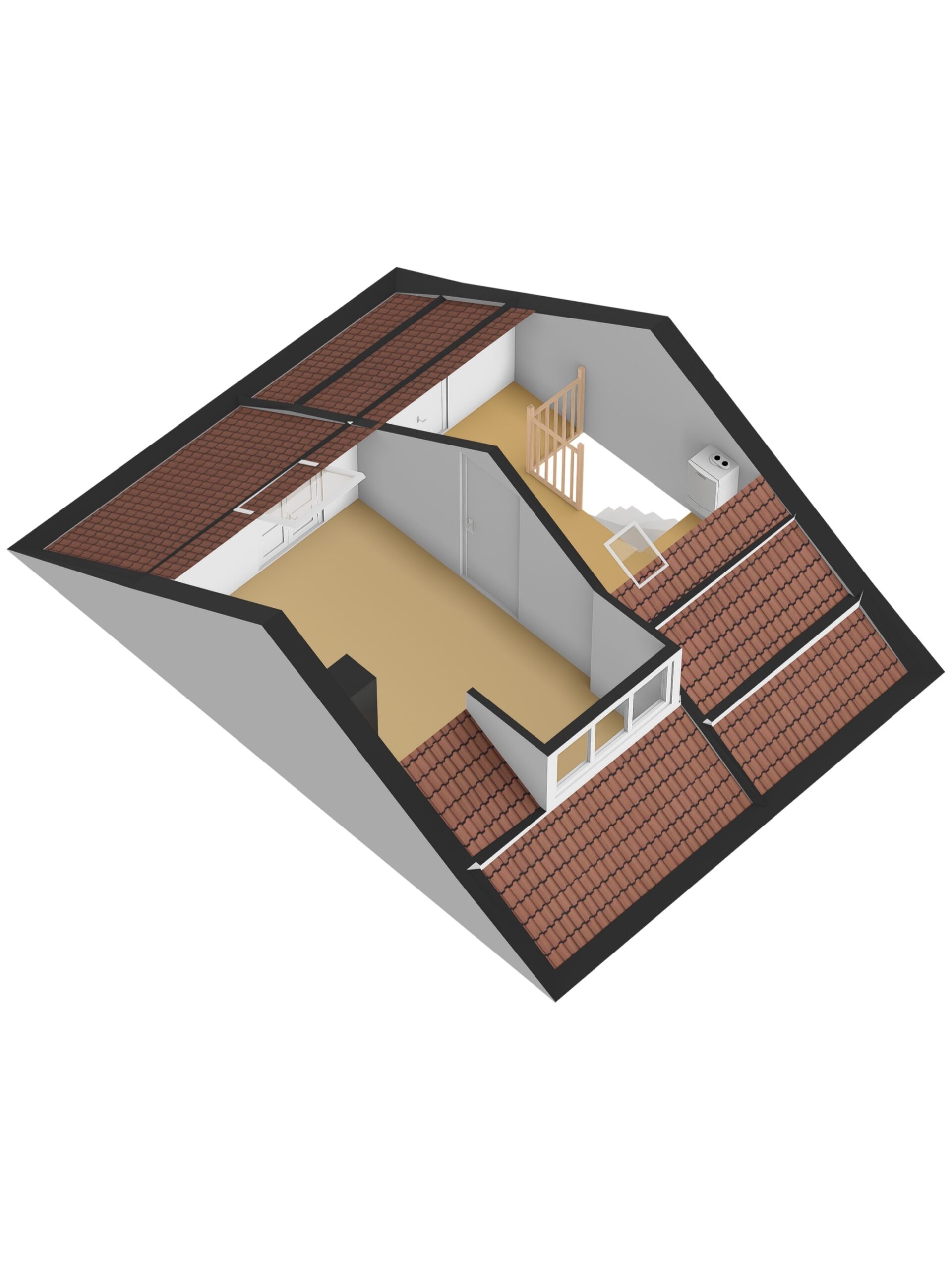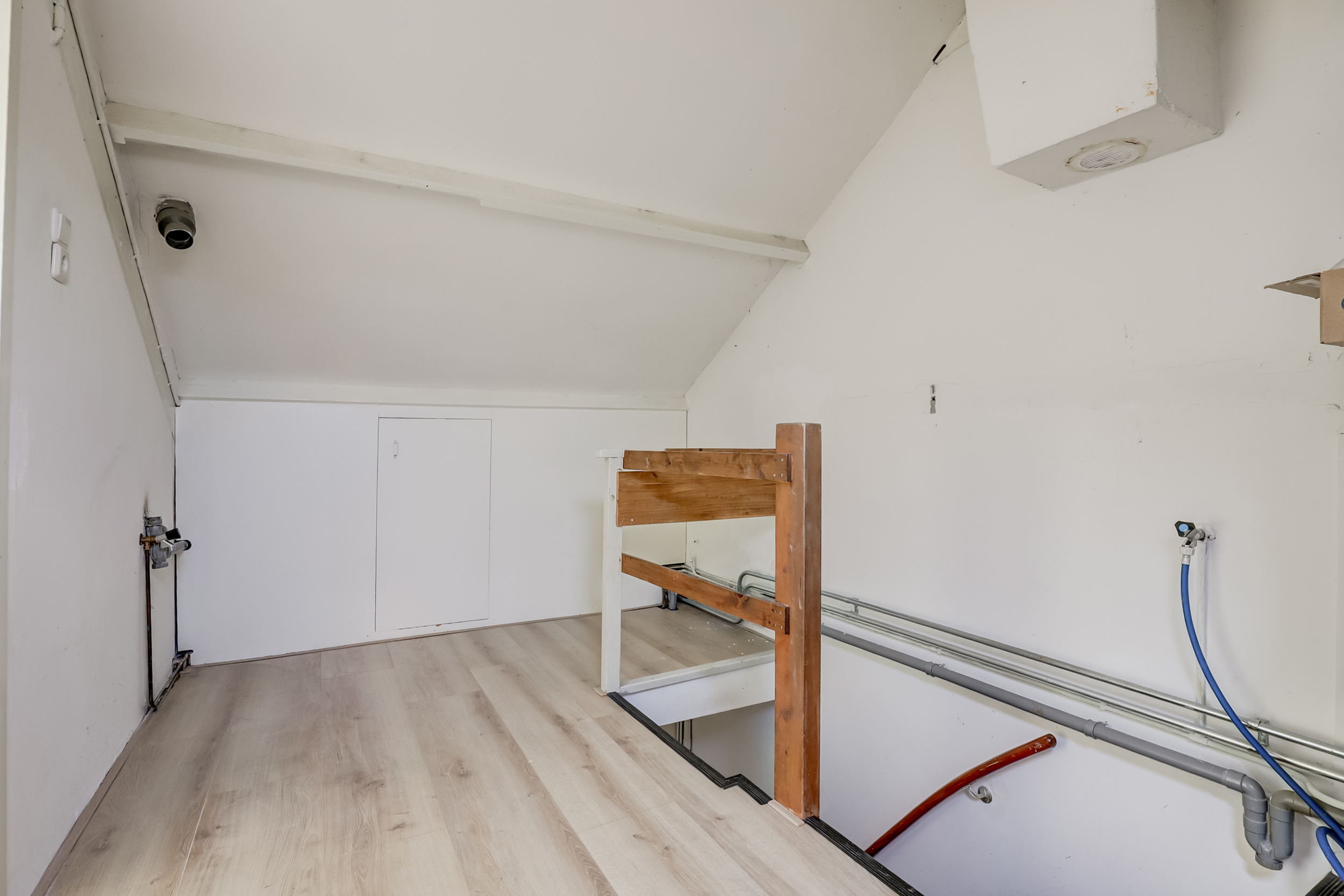 Via een vaste trap bereik je de zolder, waar de cv-installatie is geplaatst. Dankzij het dakkapel en de dakramen is hier een vierde royale slaapkamer ontstaan, met daarnaast extra opbergruimte achter de knieschotten.