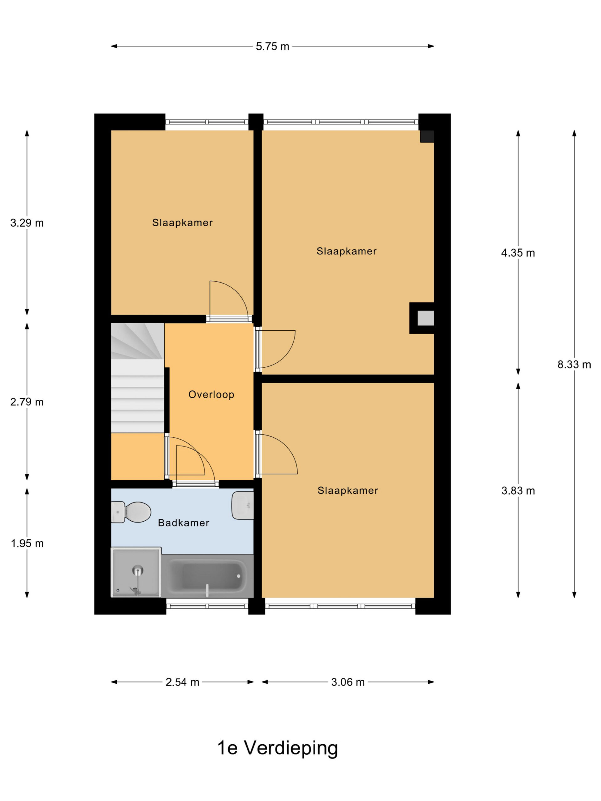 Op de eerste verdieping bevinden zich drie ruime slaapkamers en een complete badkamer, uitgerust met een ligbad, aparte douche, wastafel en toilet.
