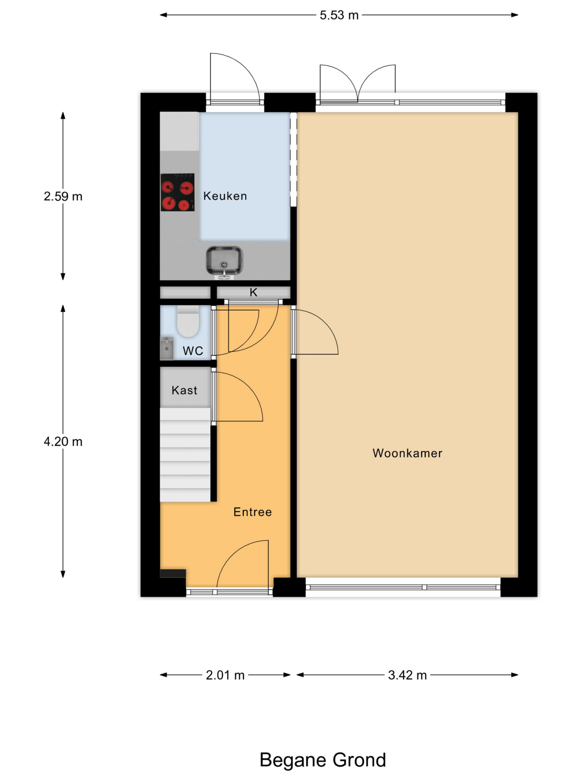 Entree met hal, toiletruimte en toegang tot de lichte doorzonwoonkamer. De woonkamer kent een prettige lichtinval en staat in directe verbinding met de keuken aan de achterzijde. De keukenopstelling uit 2022 is modern uitgevoerd en voorzien van diverse inbouwapparatuur. Vanuit de keuken is er toegang tot de achtertuin.