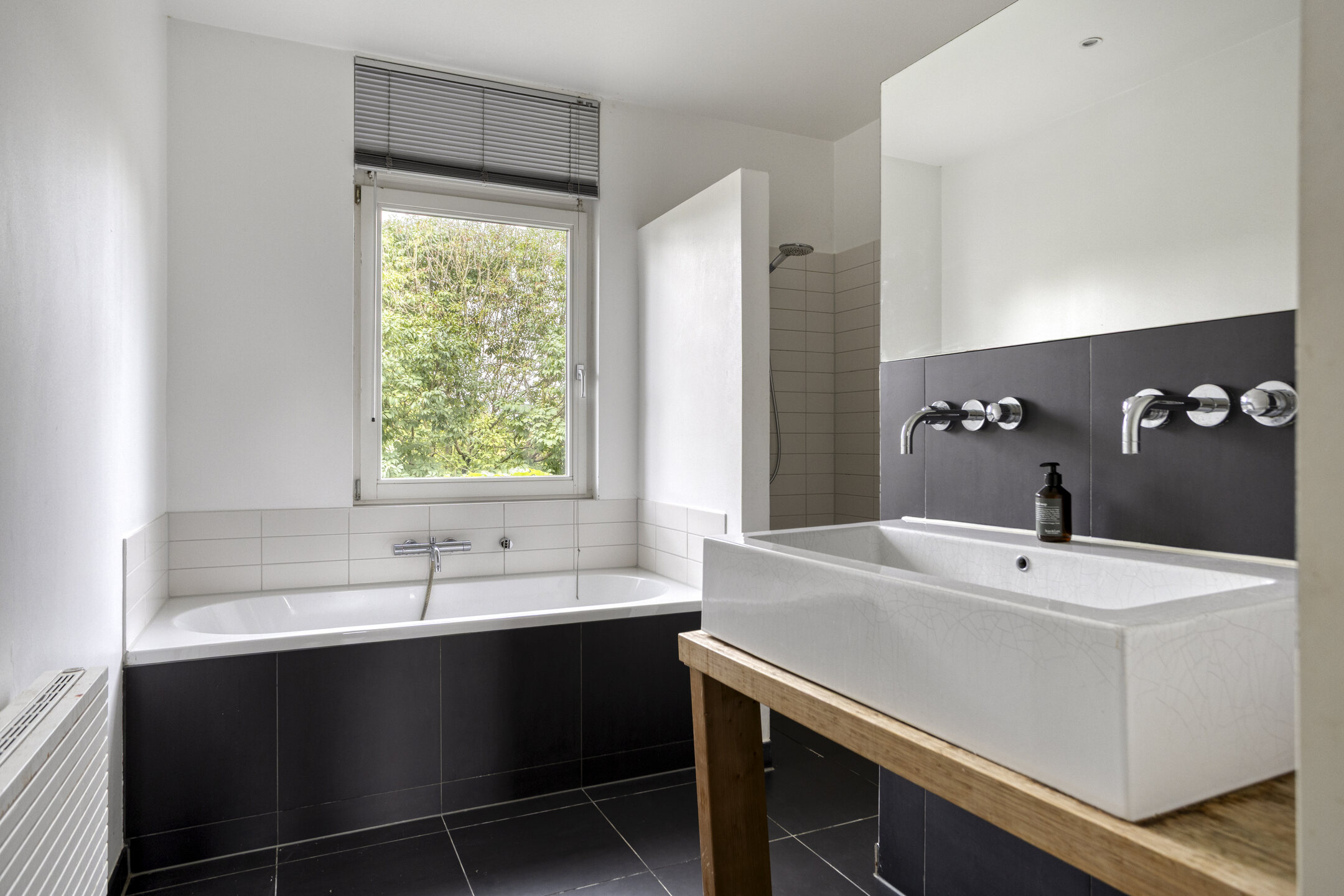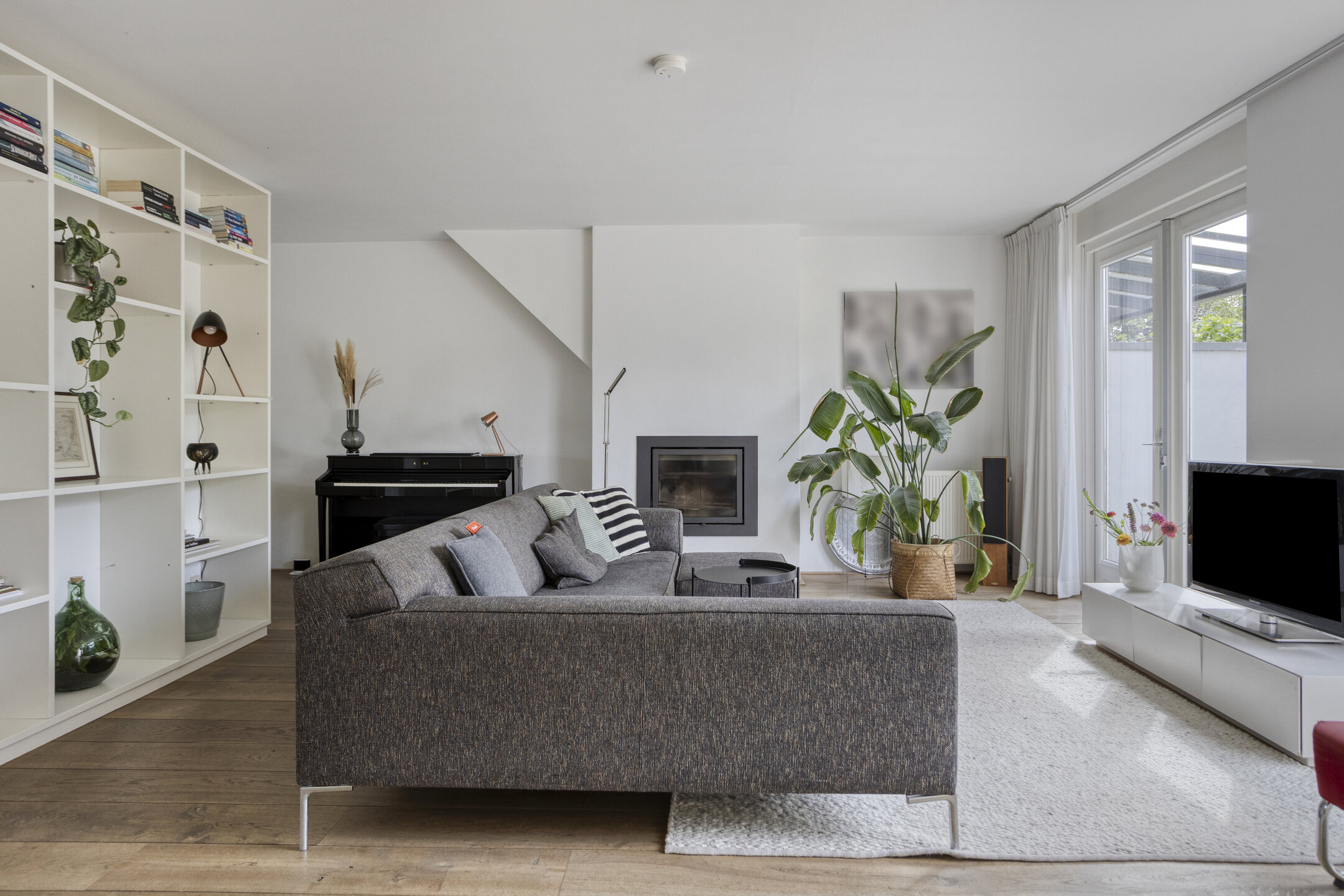 De royale living is licht en sfeervol, afgewerkt met een eiken vloer en voorzien van een strakke schouw met houtkachel. De eetkamer is door middel van schuifdeuren af te sluiten, wat zorgt voor flexibiliteit en rust. Zowel vanuit de living als vanuit de eetkamer openen openslaande deuren naar de fraai aangelegde achtertuin.