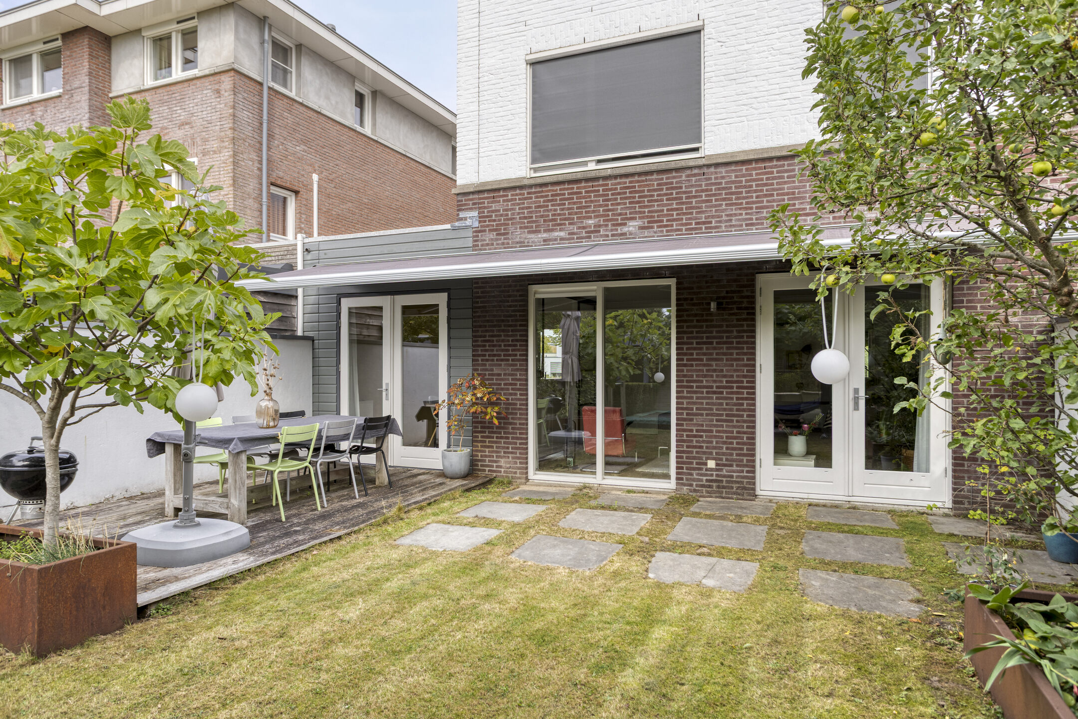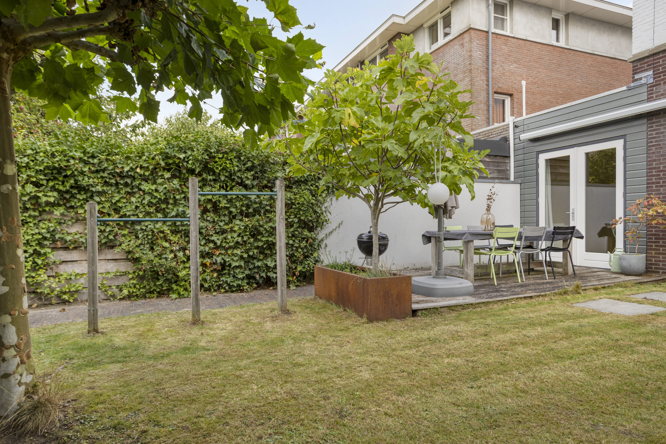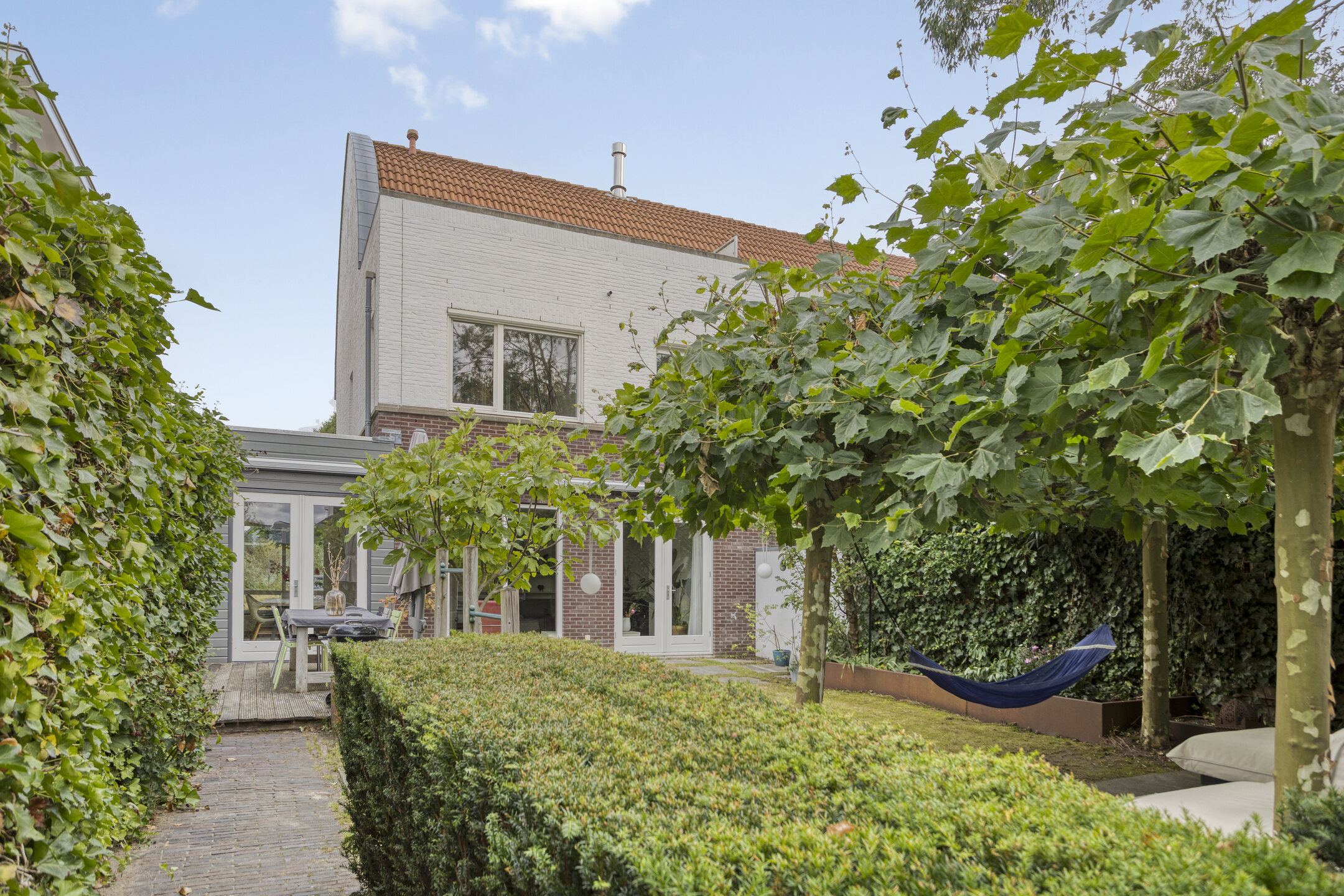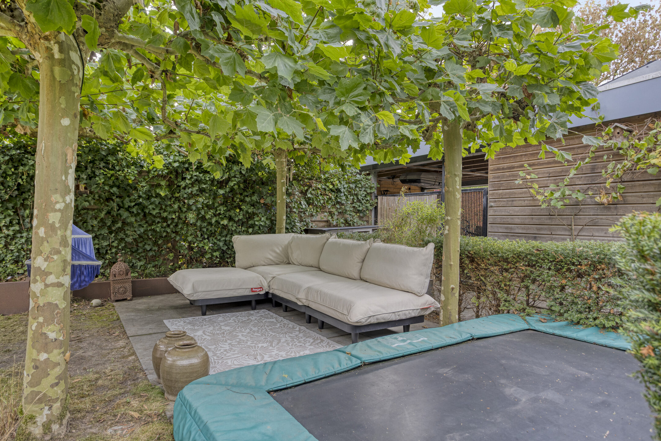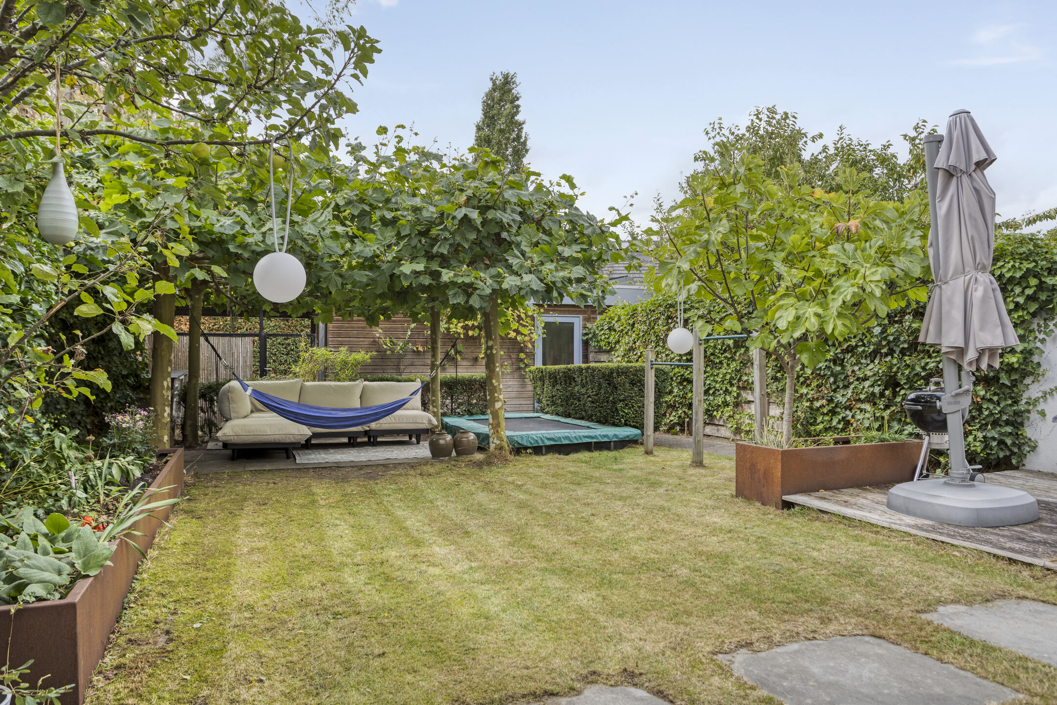 De tuin is zorgvuldig ontworpen en beschikt over een zonnescherm van ca. 9 meter en een natuurlijke terrasoverkapping dankzij volwassen platanen, waardoor je hier in alle seizoenen comfortabel buiten kunt verblijven.