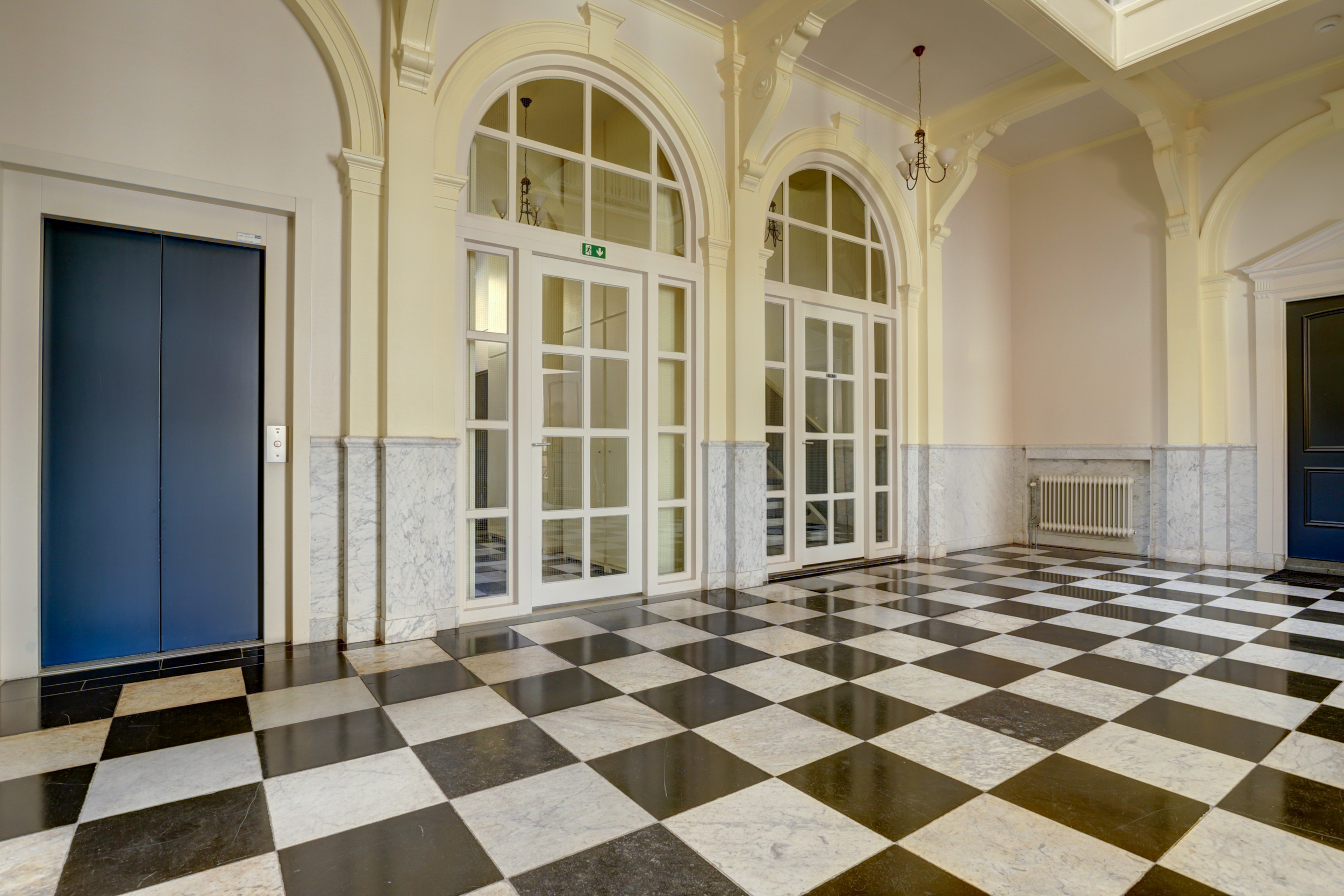 Bij binnenkomst word je geraakt door de prachtige stijlkenmerken van de villa. Er ligt een marmeren vloer, er is een mooi origineel trappenhuis en natuurlijk is er een lift ingebouwd die ons naar de eerste verdieping brengt. Hier bevindt zich de entree van het appartement. De galerij met versierde balustrade en prachtig glas in lood zorgt voor een fantastische sfeer.