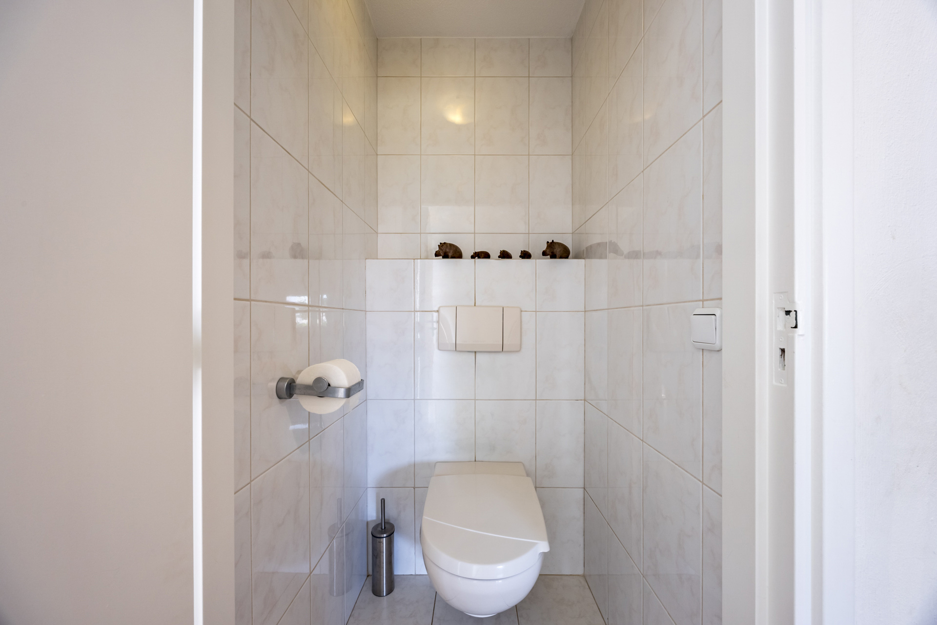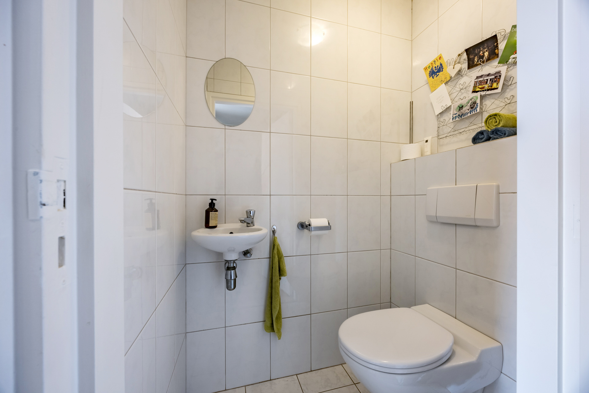 Ruime hal met toilet, meterkast en trapopgang. Vanuit hier enerzijds toegang tot de woonkamer, anderzijds tot de garage en de bijkeuken.