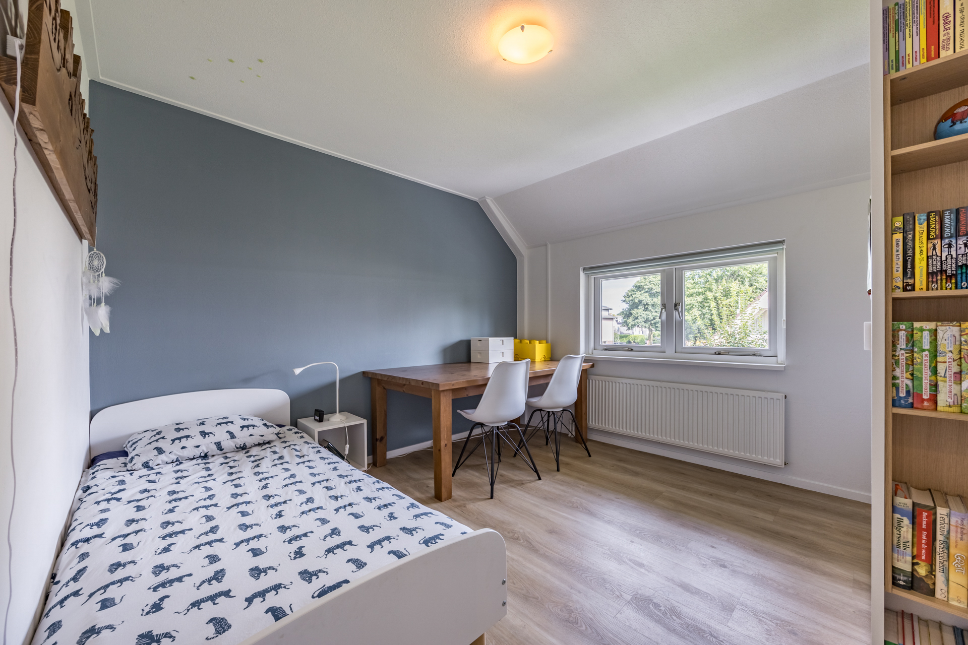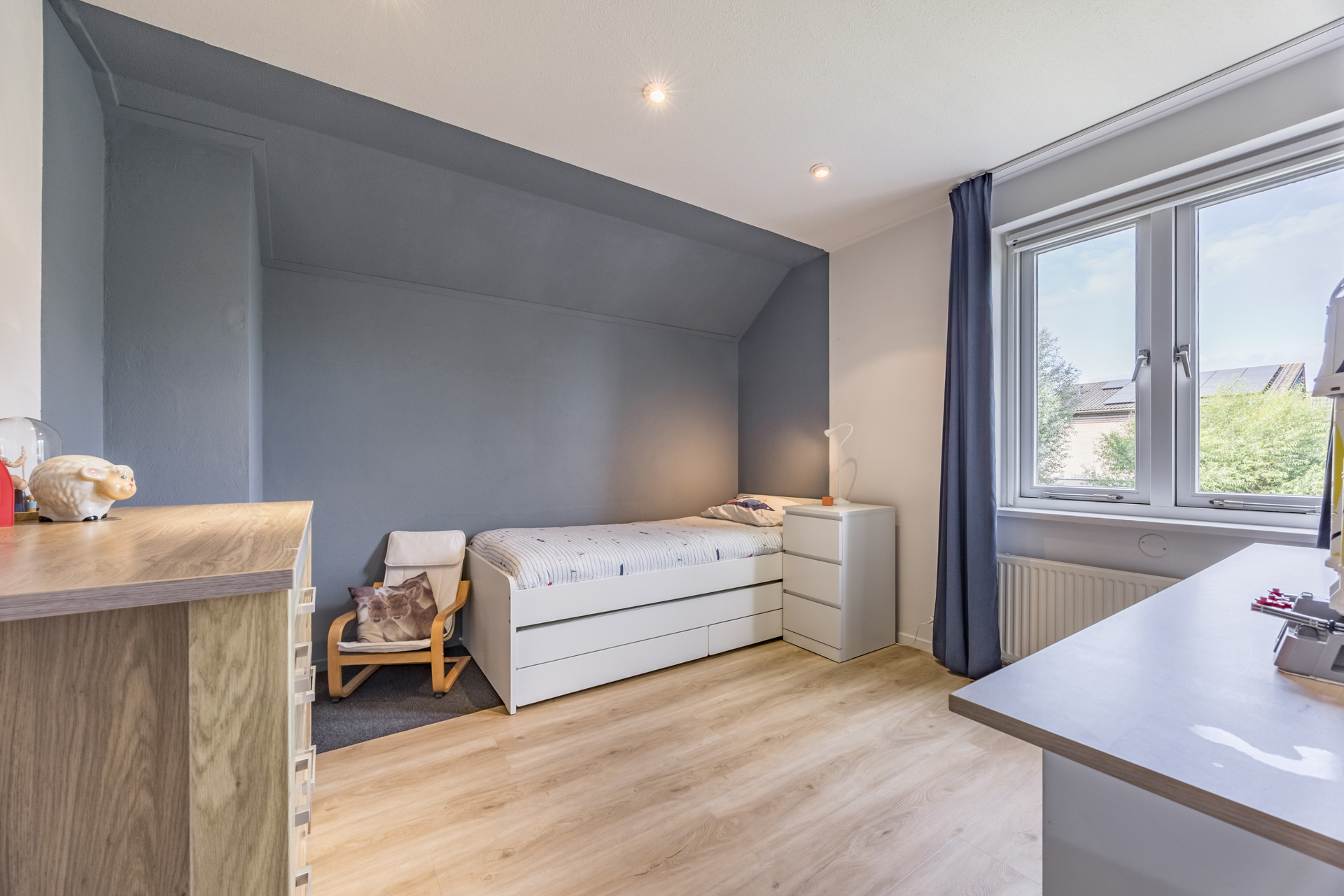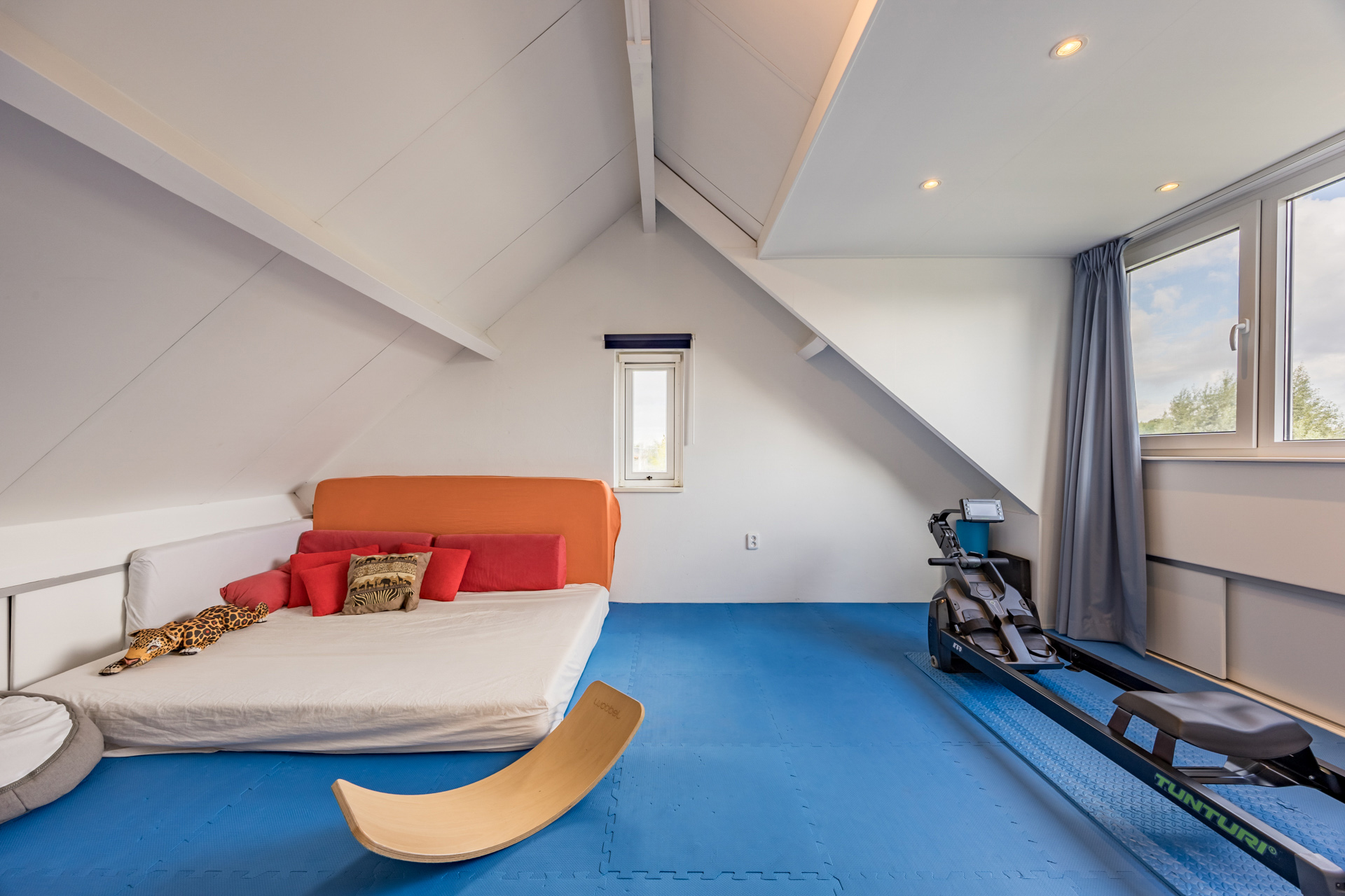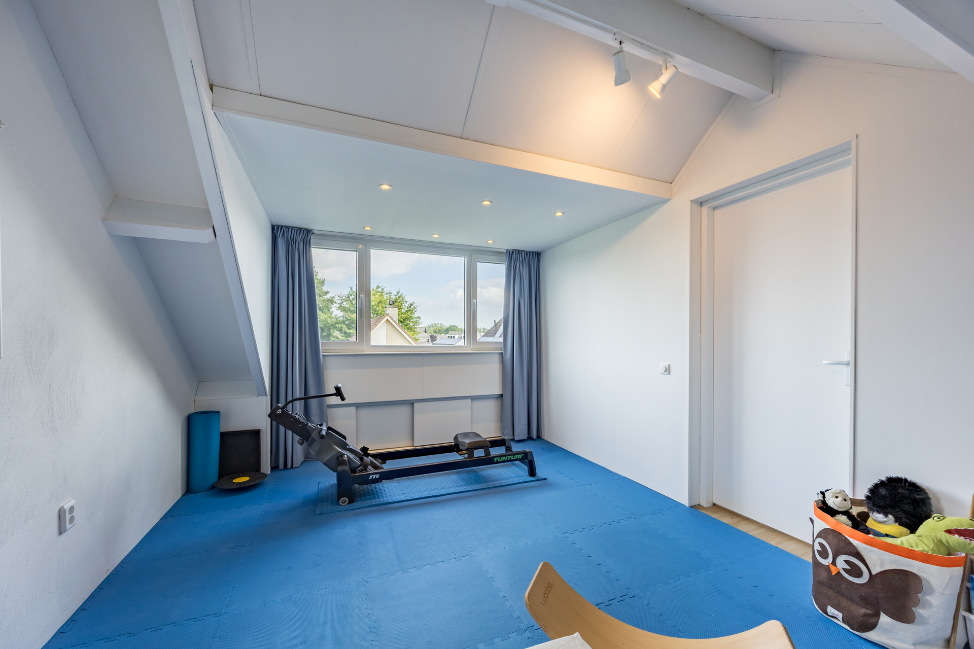 Er is een grote dakkapel geplaatst met kunststof ramen en kozijnen en er zijn 2 slaapkamers gerealiseerd die met elkaar verbonden zijn. De achterste kamer is nu speel- en sportkamer en heeft praktische foam-tegels op de vloer. Op de rest van de verdieping ligt pvc-laminaat.