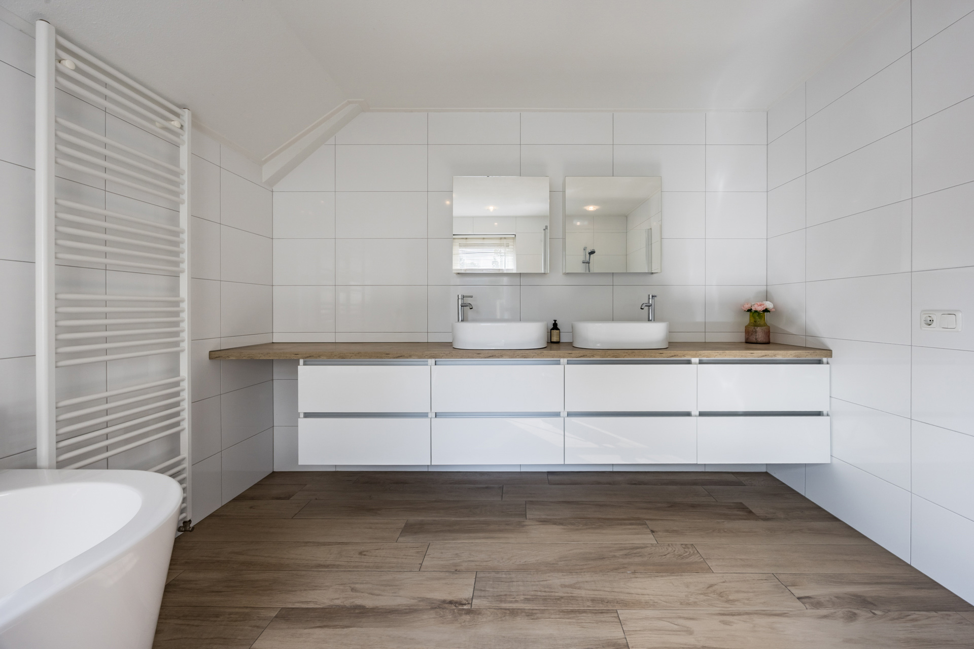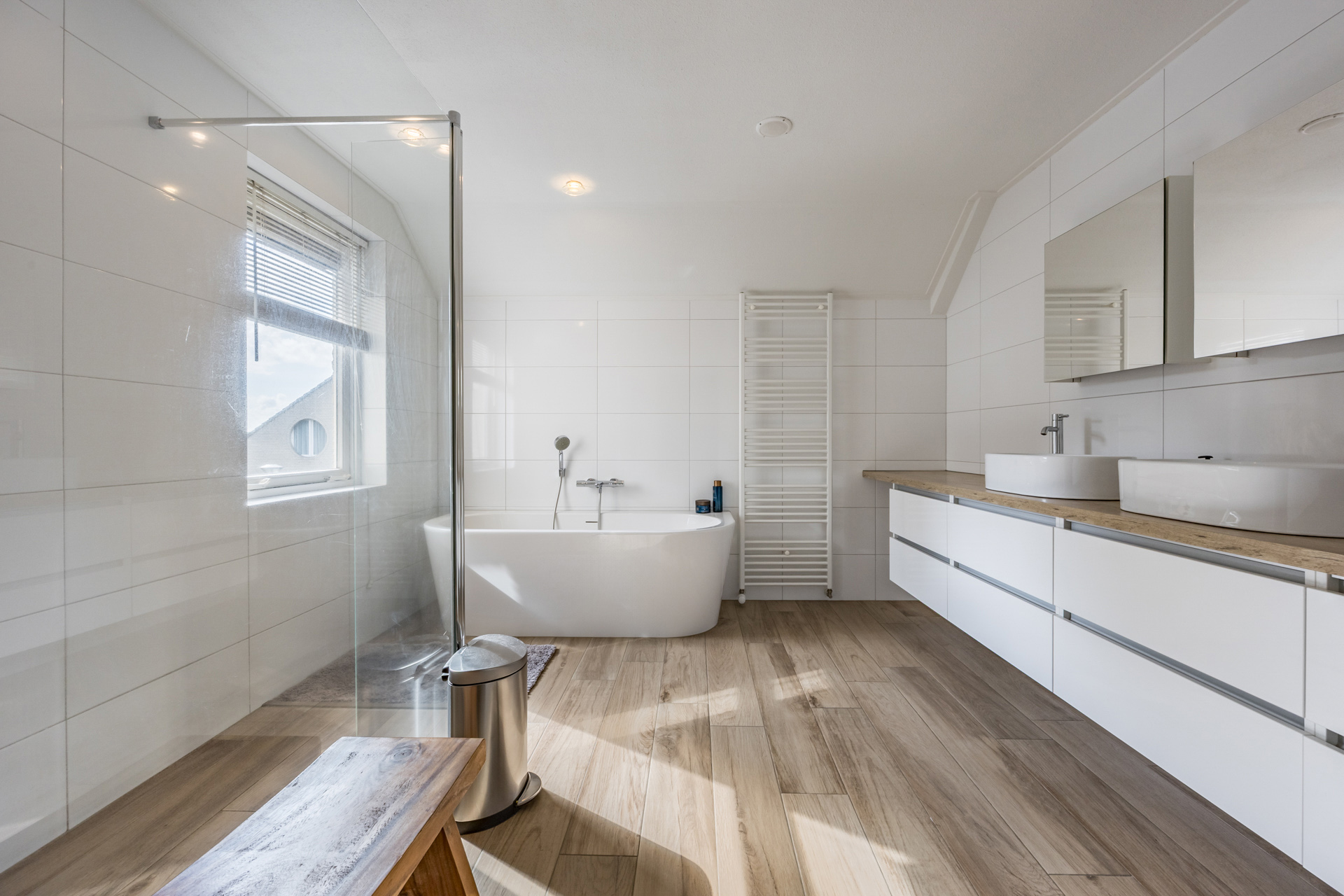 Overloop, 4 slaapkamers, grote badkamer met vloerverwarming, inloopdouche, ligbad en riant meubel met 2 opzetwastafels. Apart toilet. Airco op de overloop. Ook op deze verdieping een pvc-laminaatvloer.