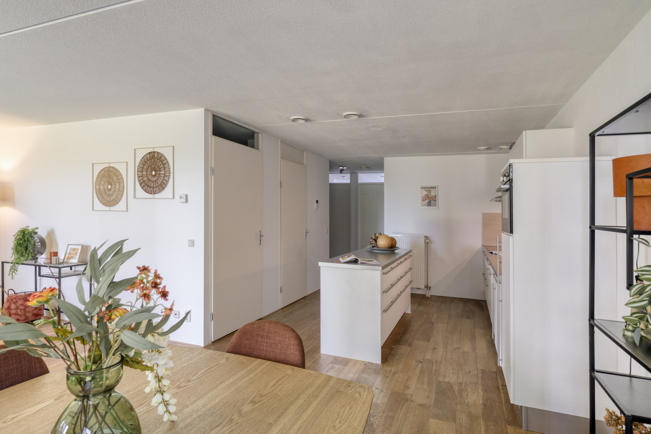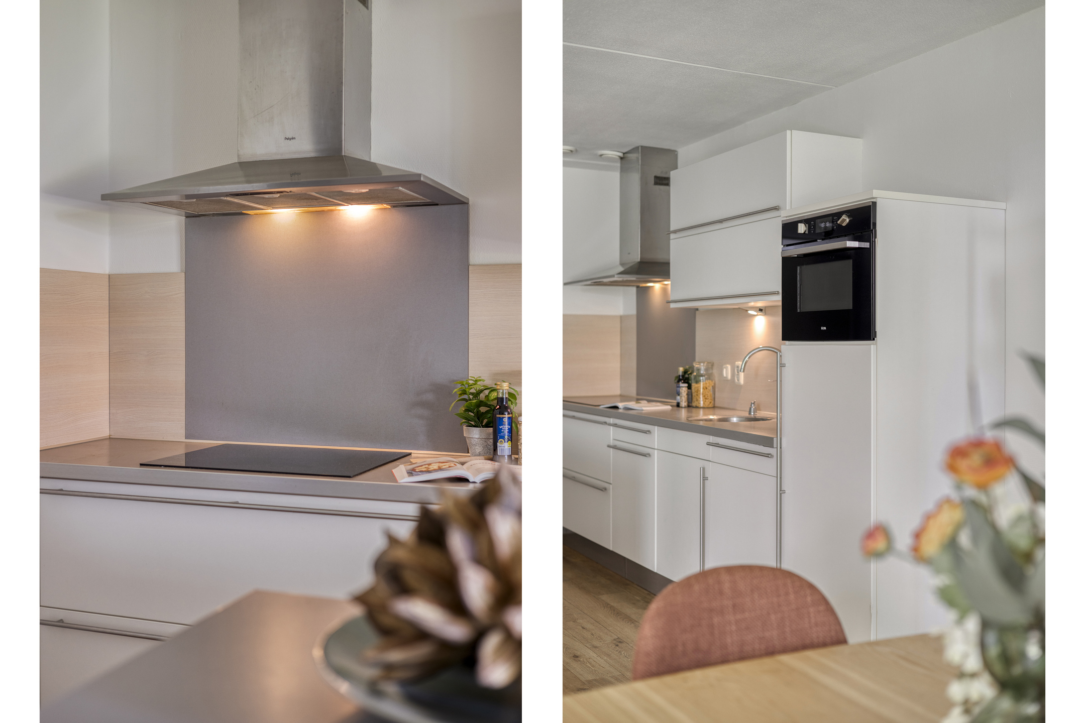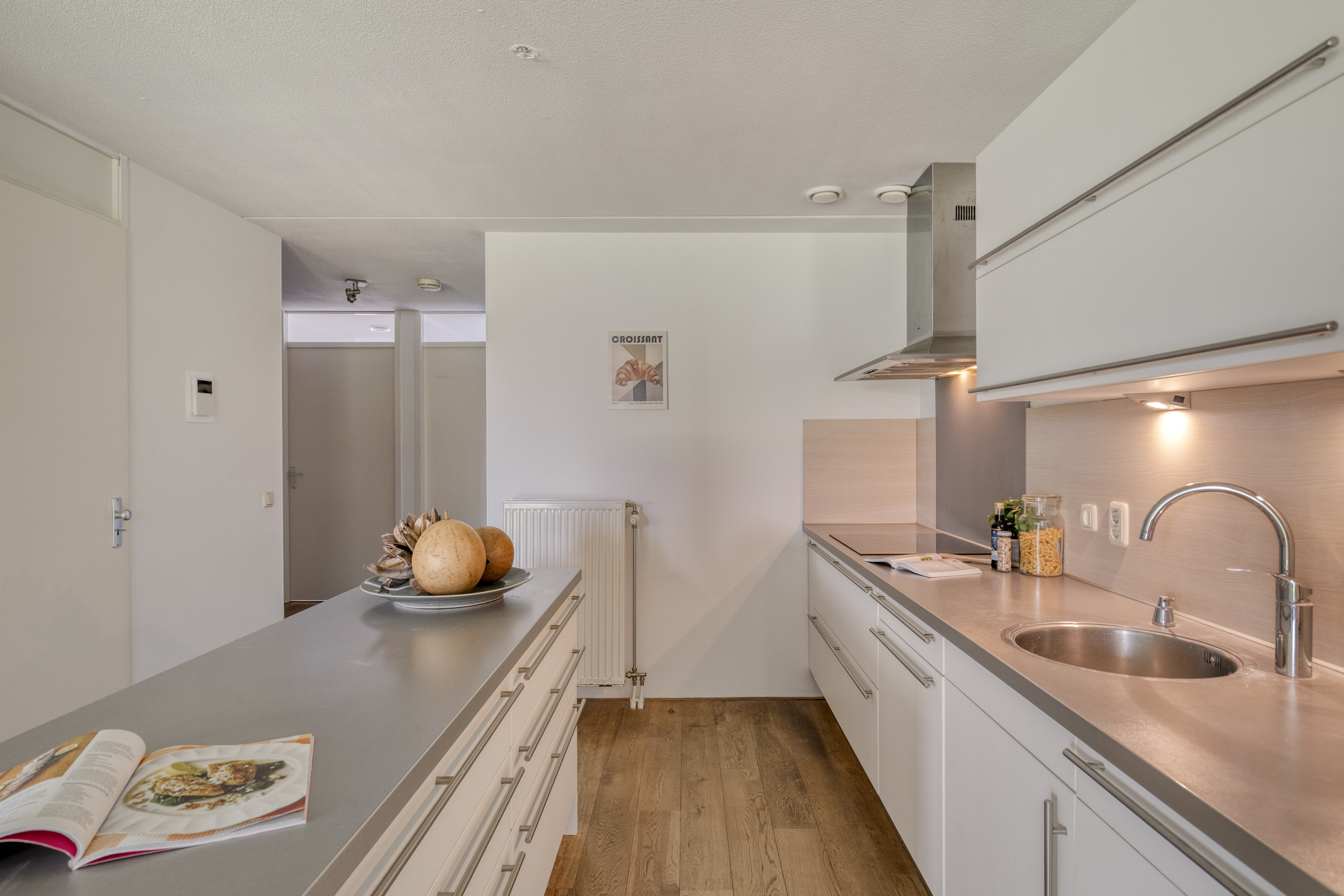 De open keuken vormt het hart van het appartement. Het kookeiland nodigt uit tot lange avonden tafelen en koken, terwijl de inbouwapparatuur zorgt voor comfort en gemak. Alles is strak afgewerkt, met een moderne uitstraling die direct aanspreekt.