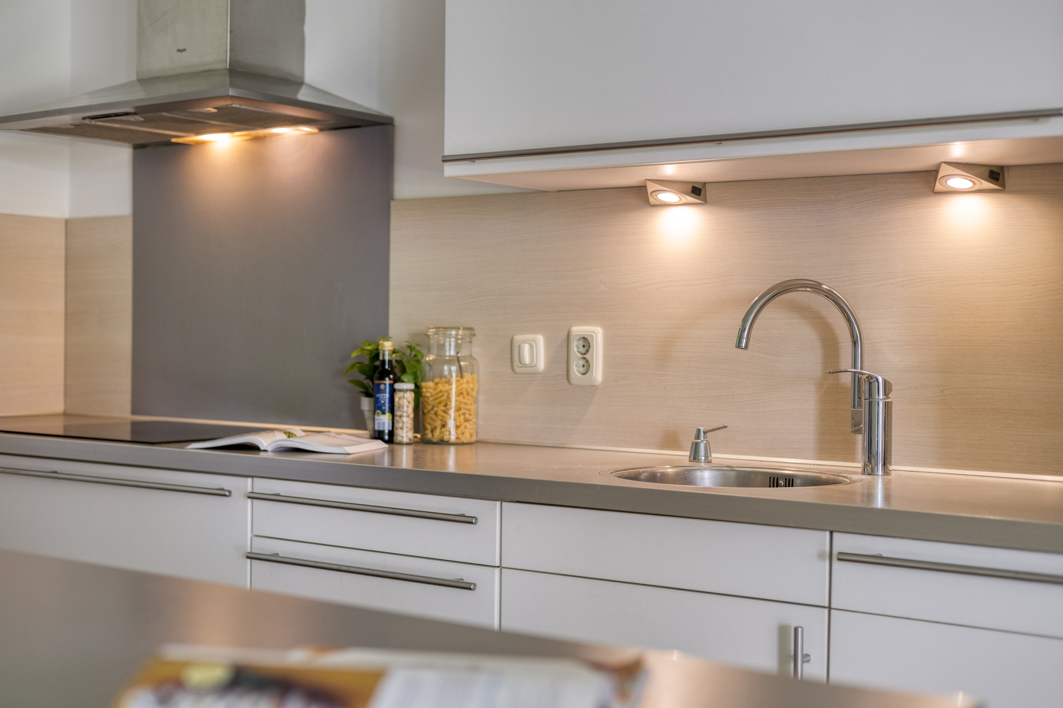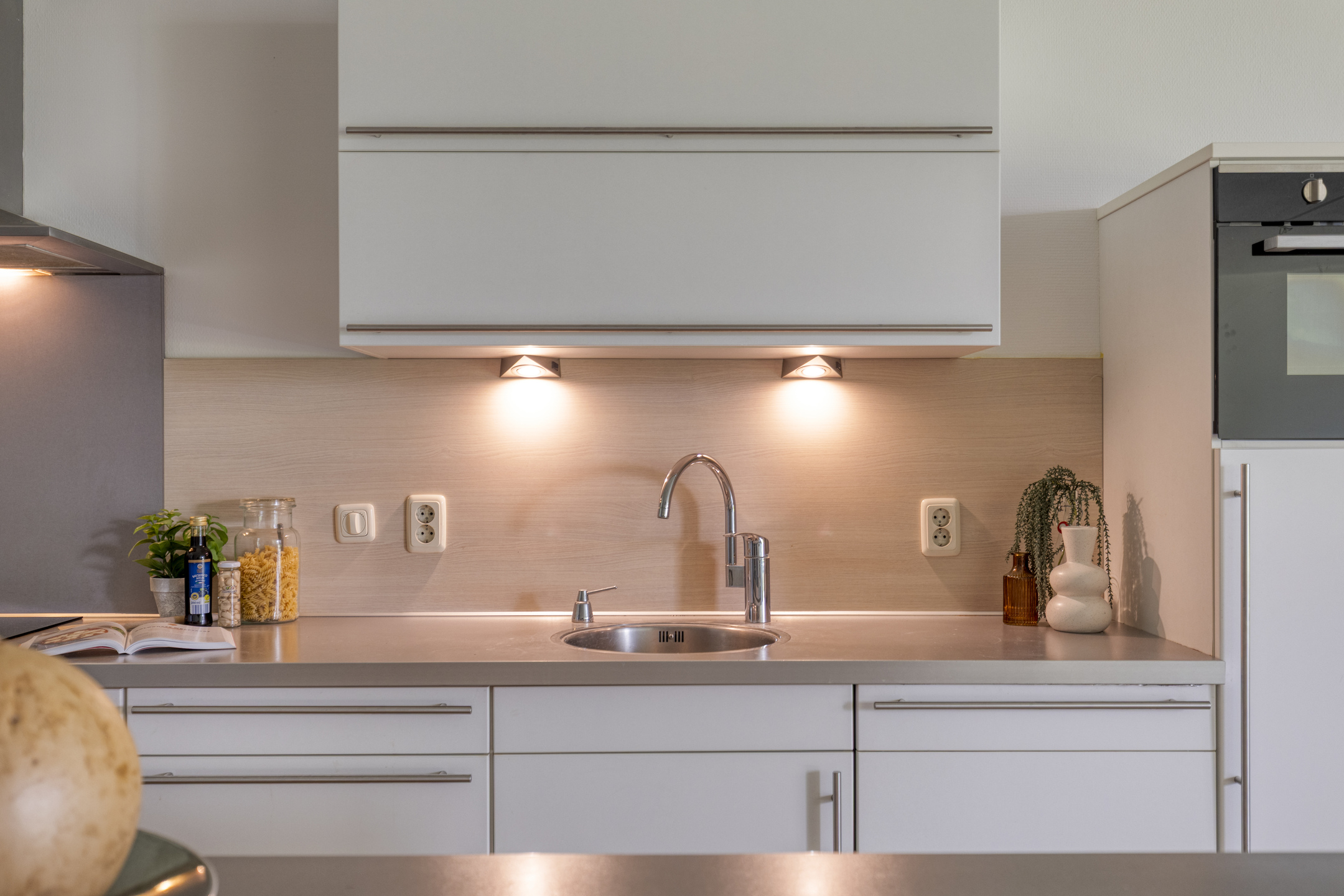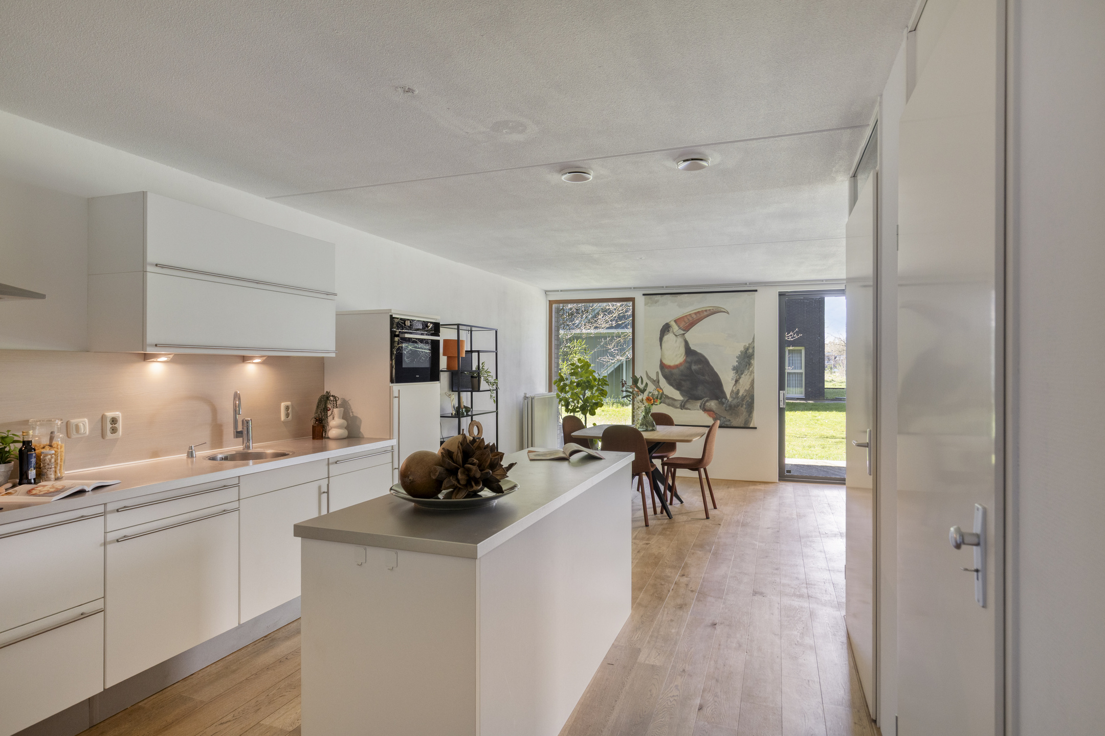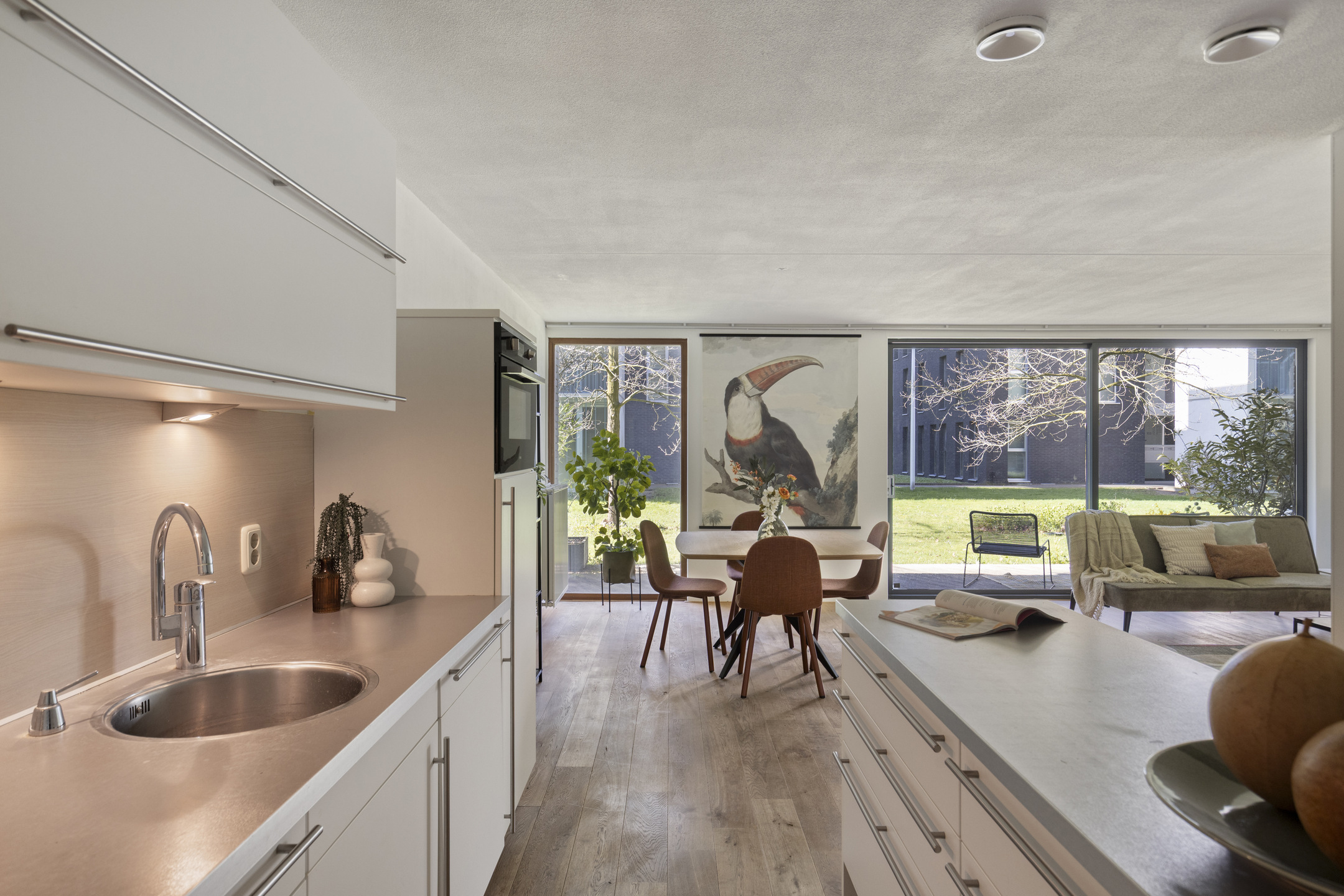 De open keuken vormt het hart van het appartement. Het kookeiland nodigt uit tot lange avonden tafelen en koken, terwijl de inbouwapparatuur zorgt voor comfort en gemak. Alles is strak afgewerkt, met een moderne uitstraling die direct aanspreekt.