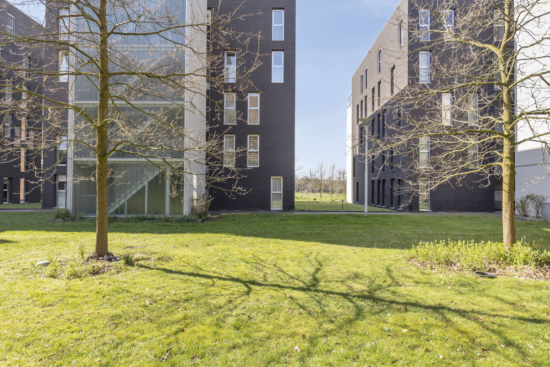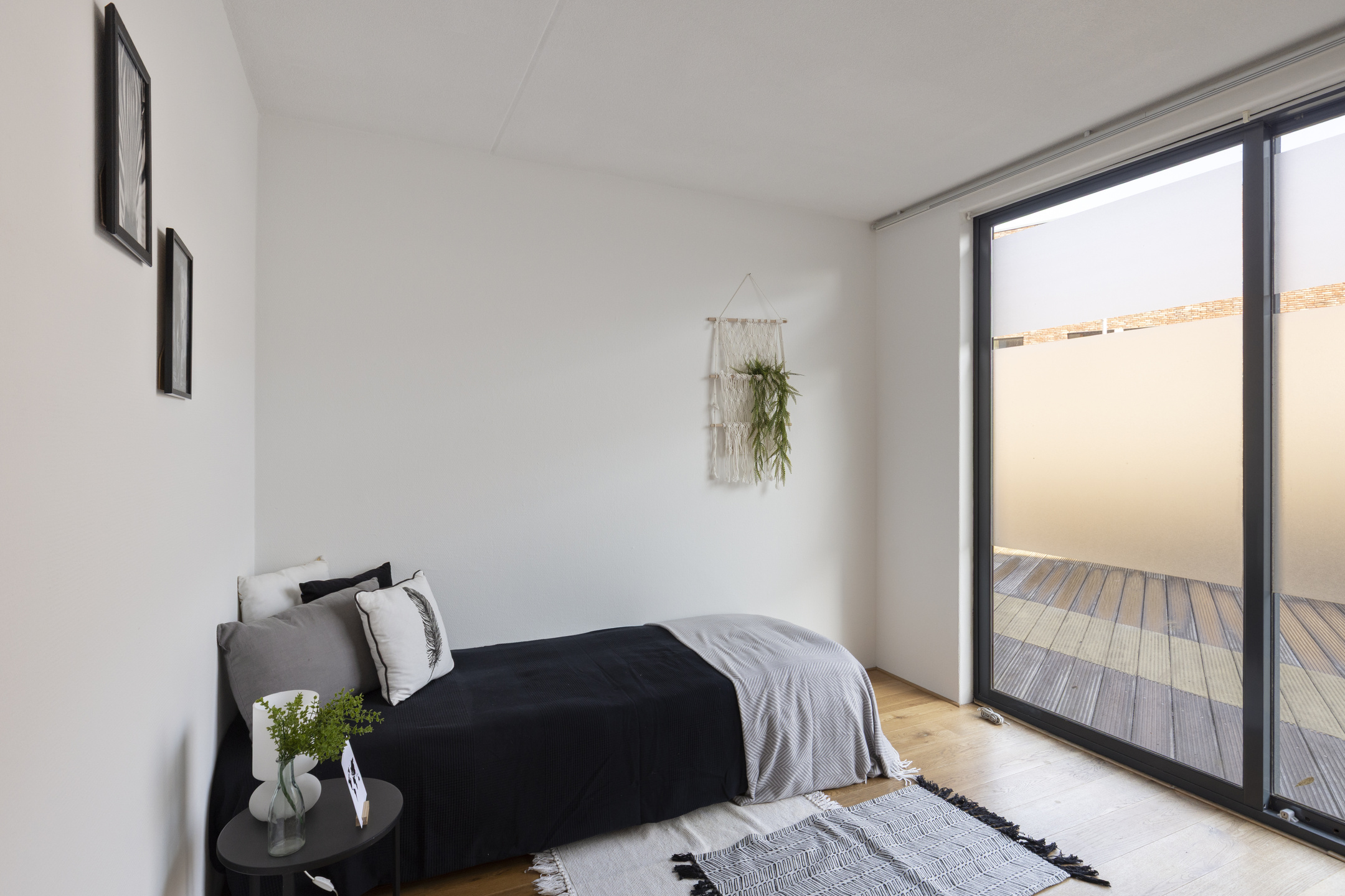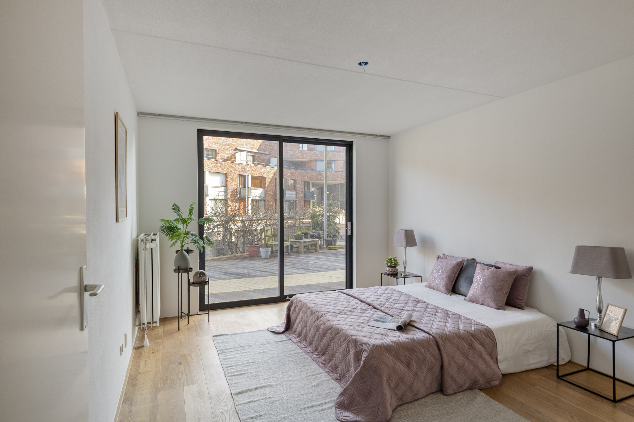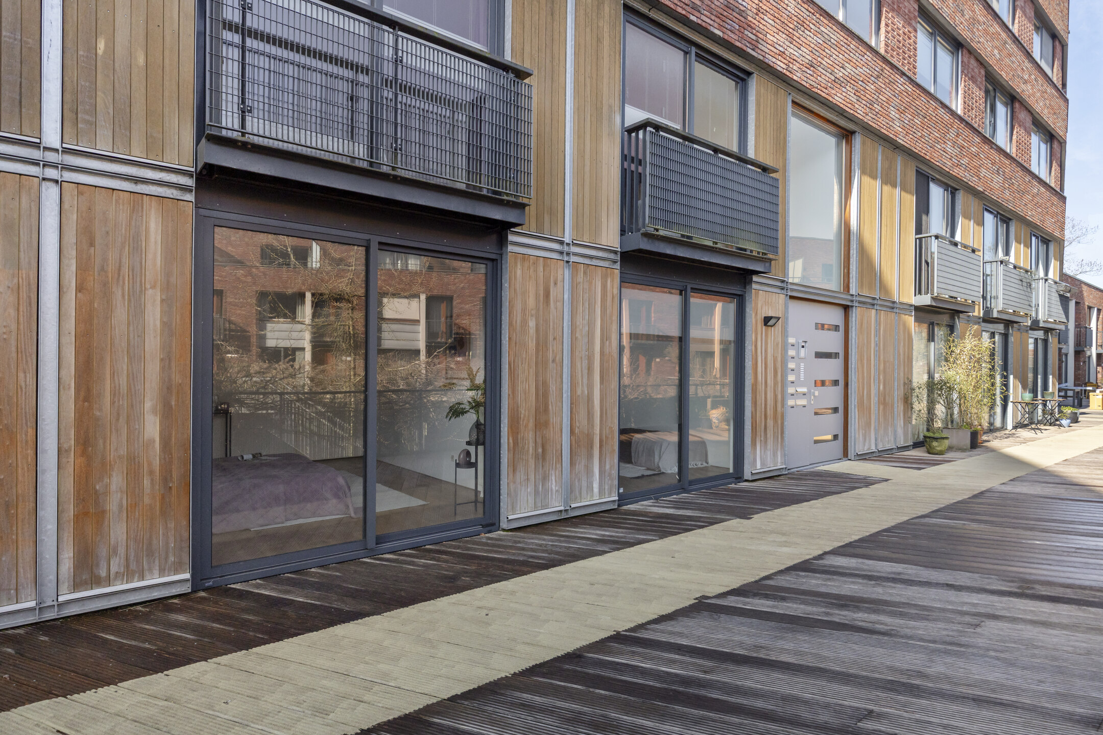 Aan de voorzijde van de woning bevinden zich twee slaapkamers, beide met een eigen schuifpui. Dit zorgt voor veel lichtinval en een prettig ruimtelijk gevoel. Via de schuifpuien is er toegang tot het binnenterrein van het appartementencomplex. De badkamer is netjes en compleet uitgevoerd, en de inpandige berging biedt ruimte voor de wasmachine, opslag en de WTW-installatie.