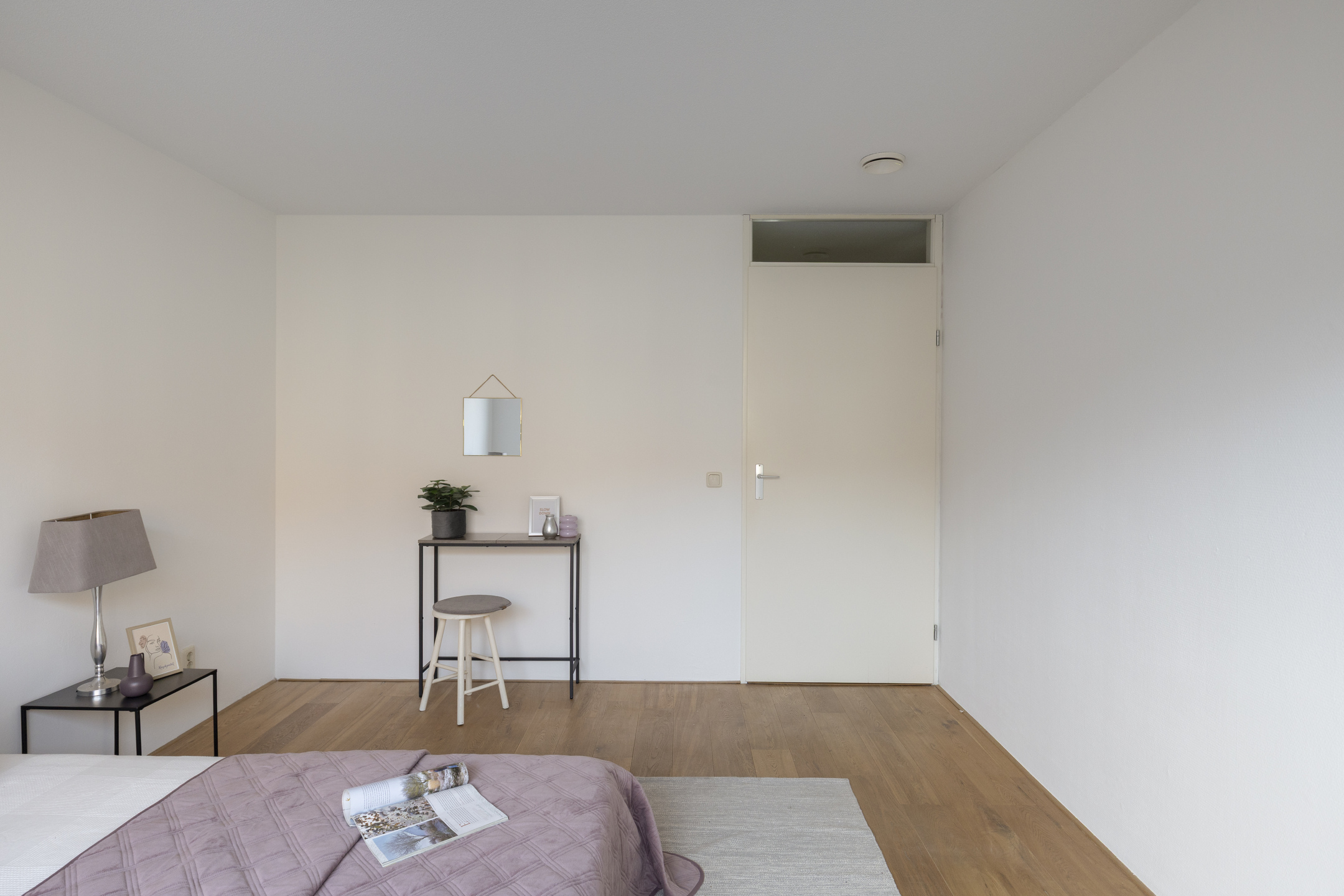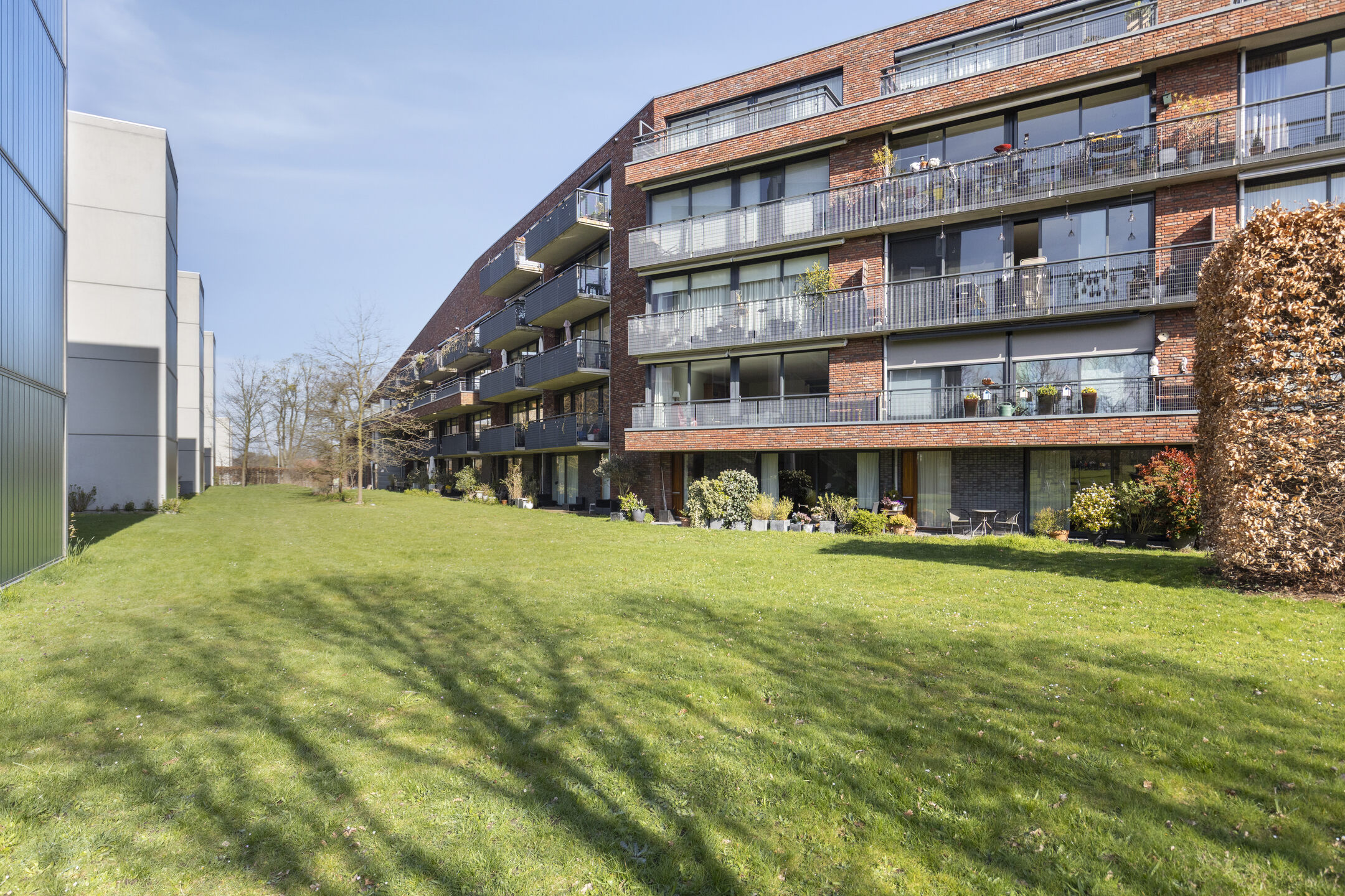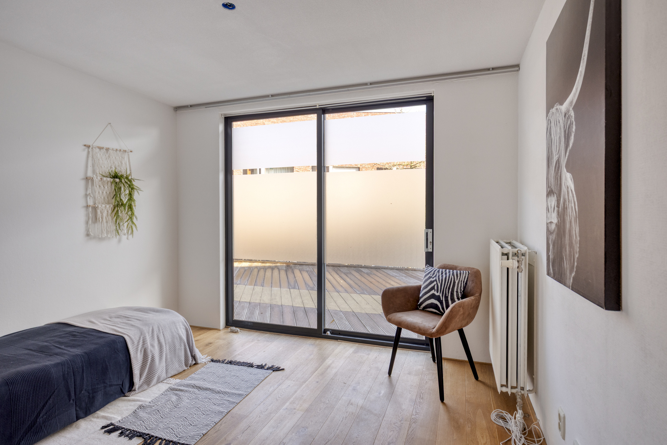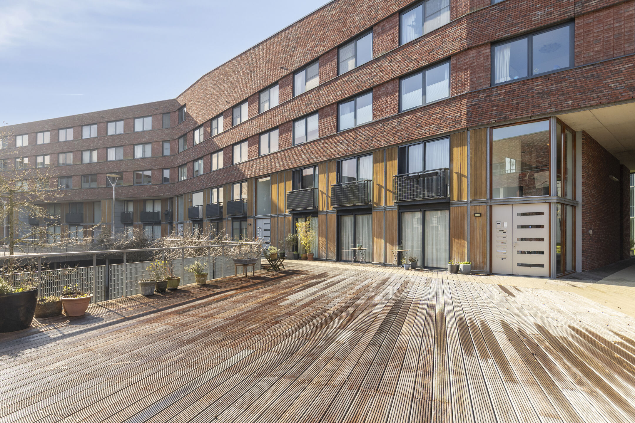Aan de voorzijde van de woning bevinden zich twee slaapkamers, beide met een eigen schuifpui. Dit zorgt voor veel lichtinval en een prettig ruimtelijk gevoel. Via de schuifpuien is er toegang tot het binnenterrein van het appartementencomplex. De badkamer is netjes en compleet uitgevoerd, en de inpandige berging biedt ruimte voor de wasmachine, opslag en de WTW-installatie.