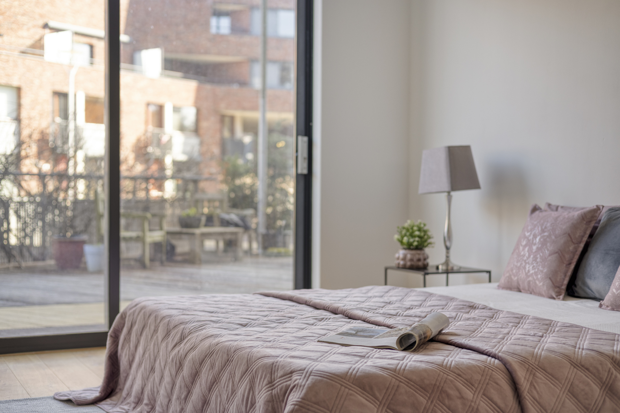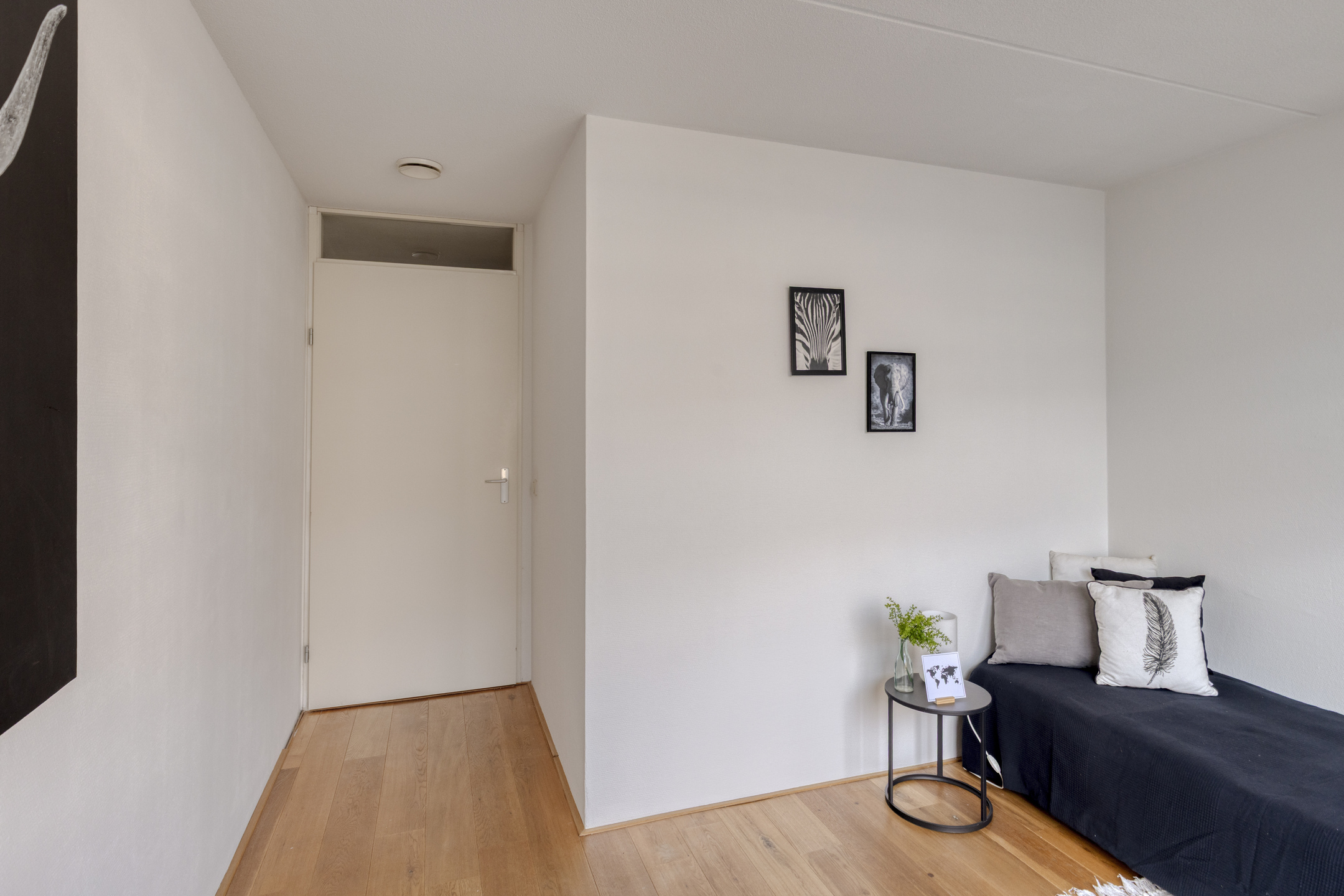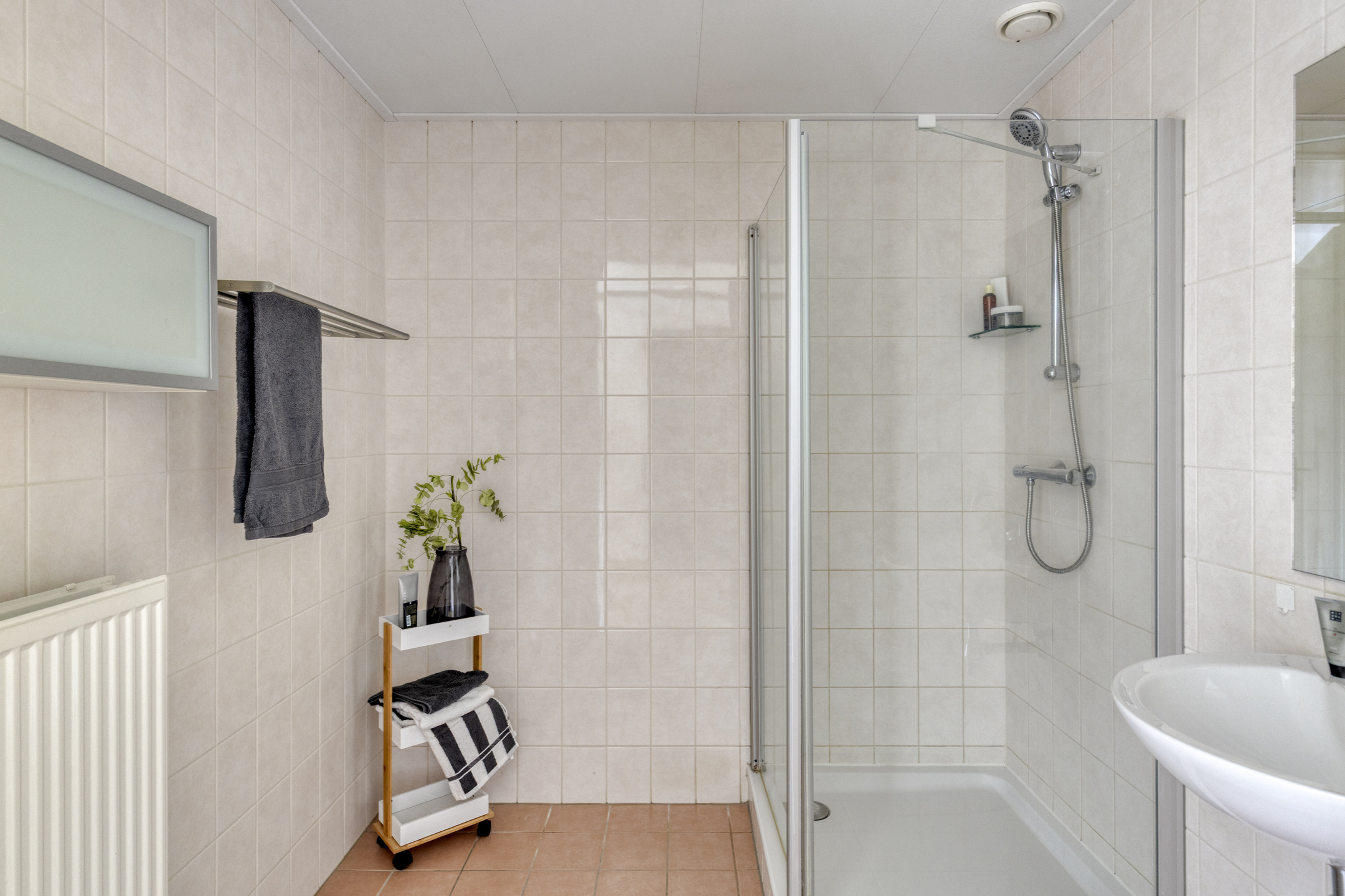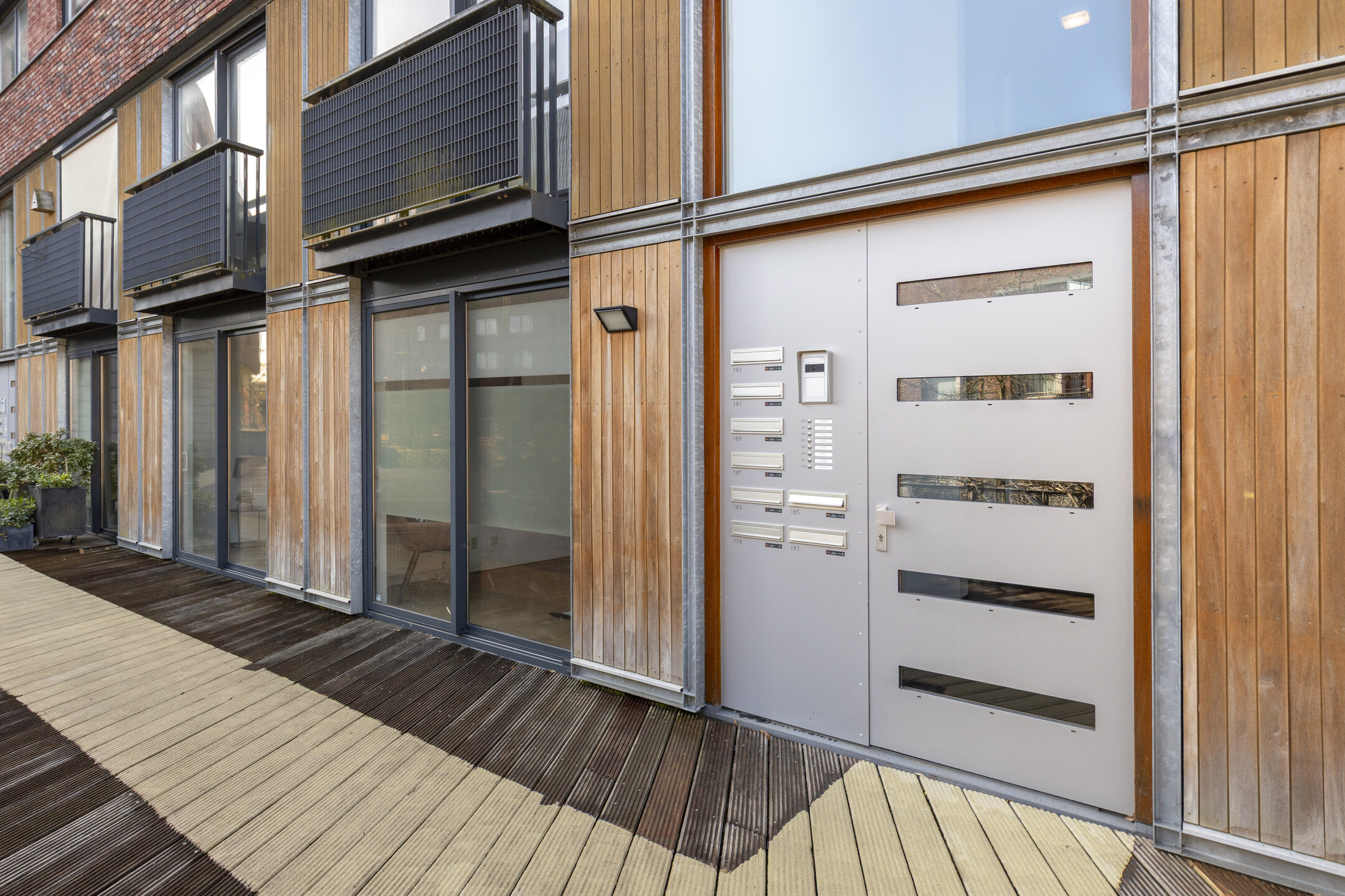 Aan de voorzijde van de woning bevinden zich twee slaapkamers, beide met een eigen schuifpui. Dit zorgt voor veel lichtinval en een prettig ruimtelijk gevoel. Via de schuifpuien is er toegang tot het binnenterrein van het appartementencomplex. De badkamer is netjes en compleet uitgevoerd, en de inpandige berging biedt ruimte voor de wasmachine, opslag en de WTW-installatie.