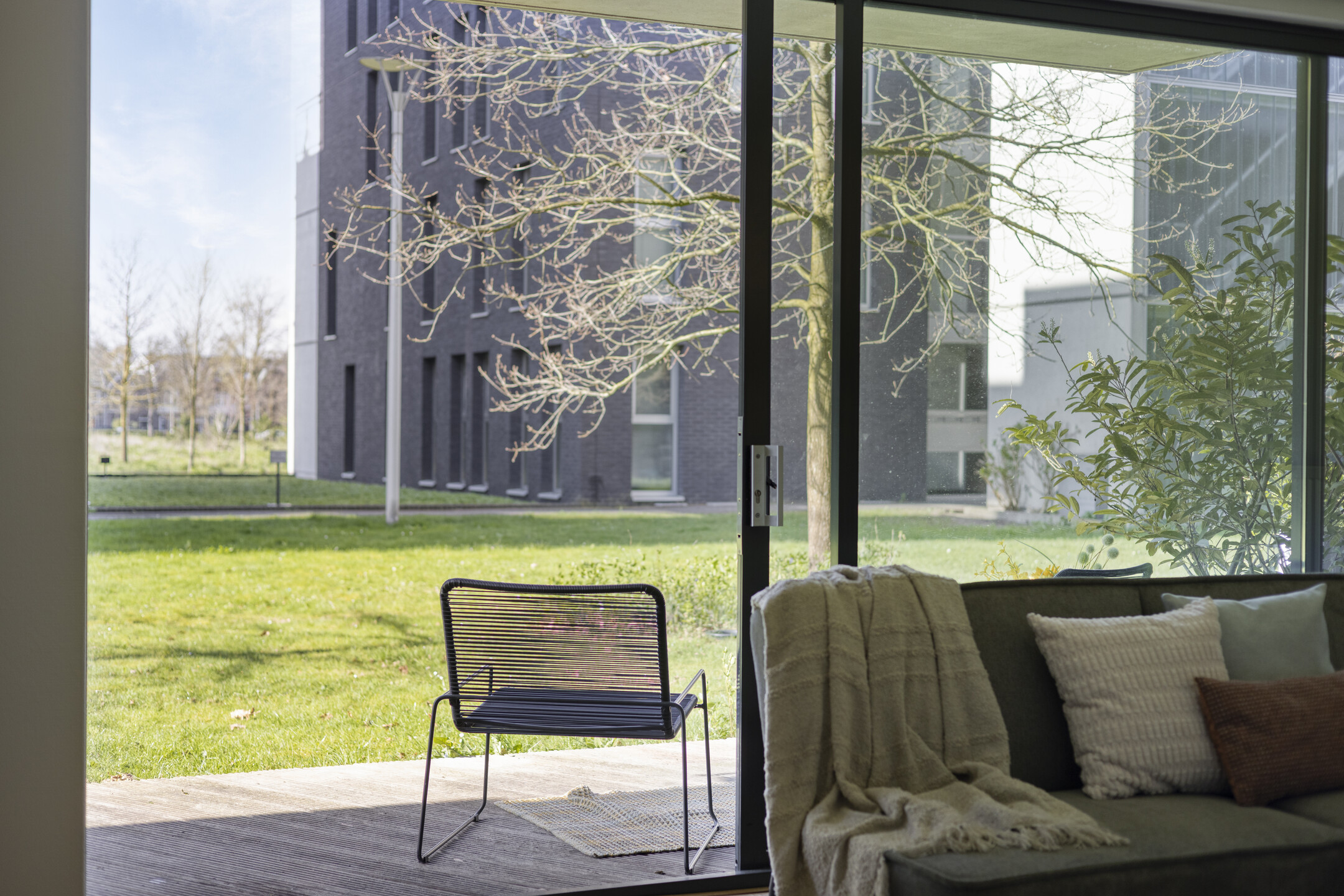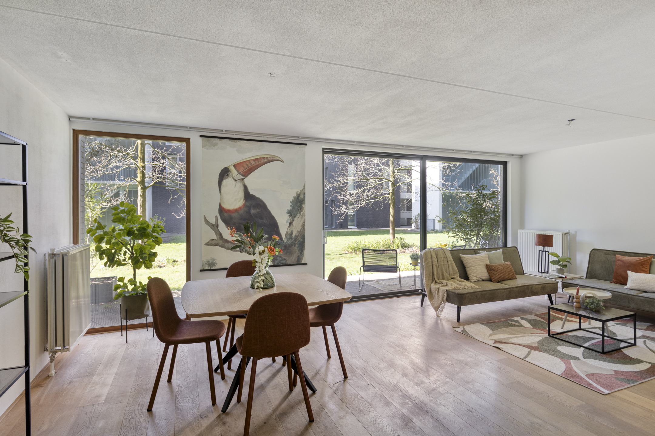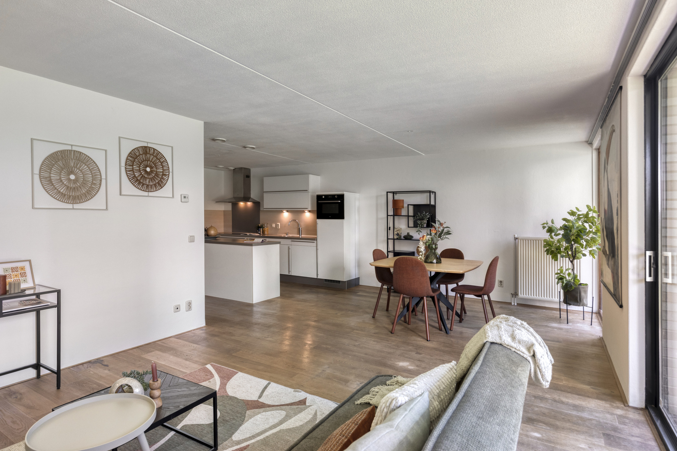 Bij binnenkomst valt meteen het prettige licht op. De woonkamer is ruim opgezet en dankzij de grote raampartijen komt er veel daglicht naar binnen. De schuifpui zorgt voor een fijne verbinding met buiten, waardoor het overdekte terras echt als een verlengstuk van de leefruimte voelt. Hier kun je comfortabel zitten, beschut en met een vrij uitzicht op het groen.
