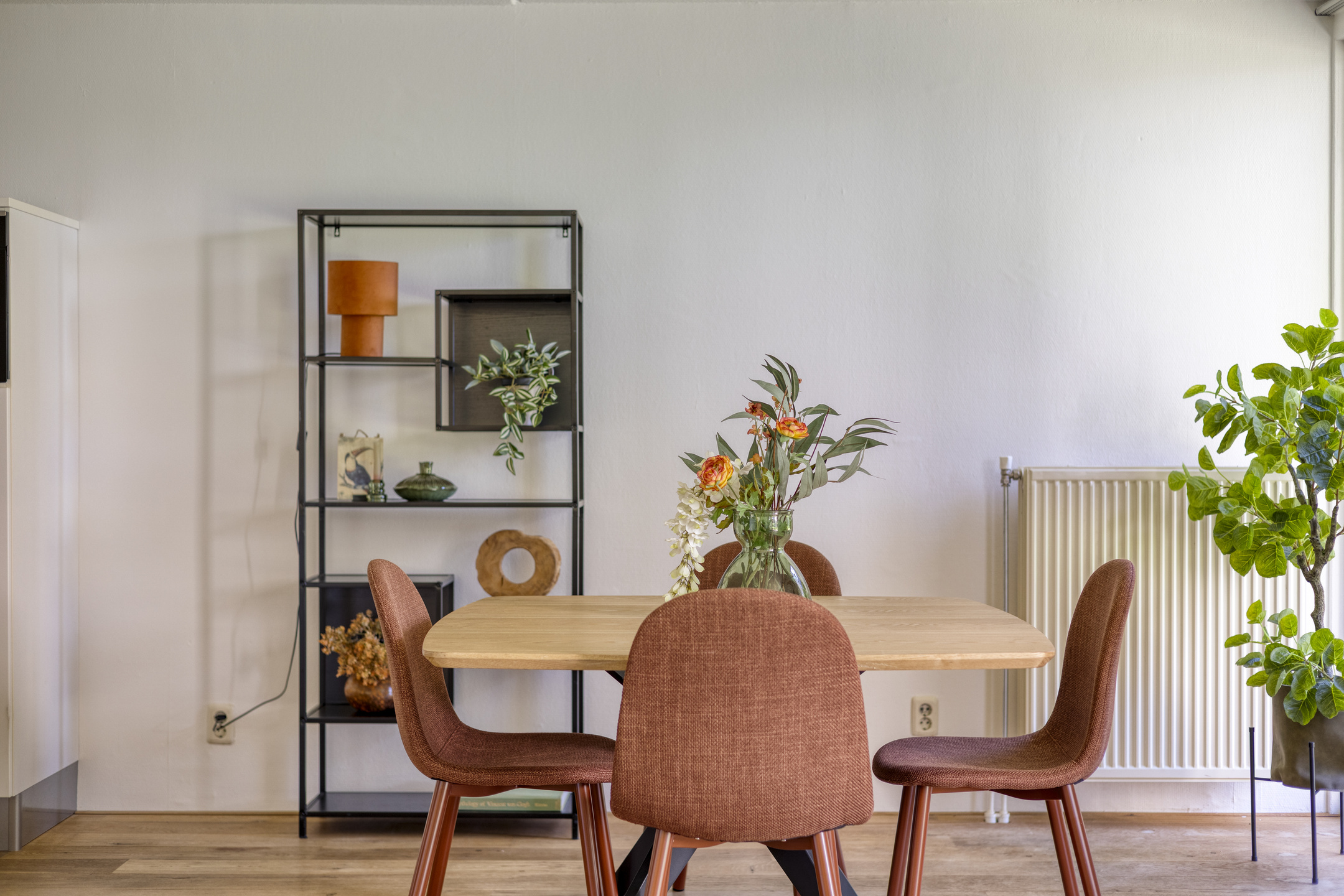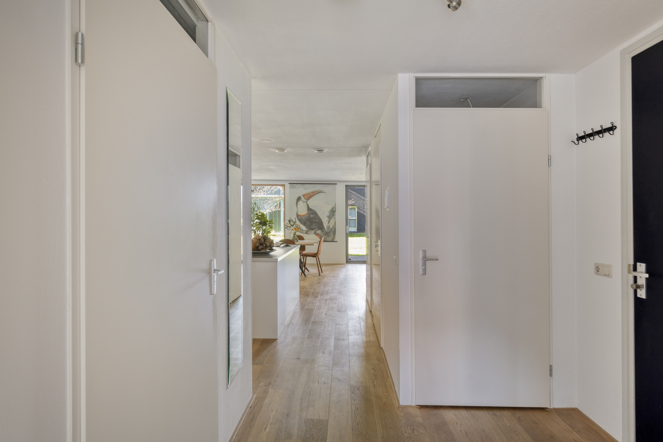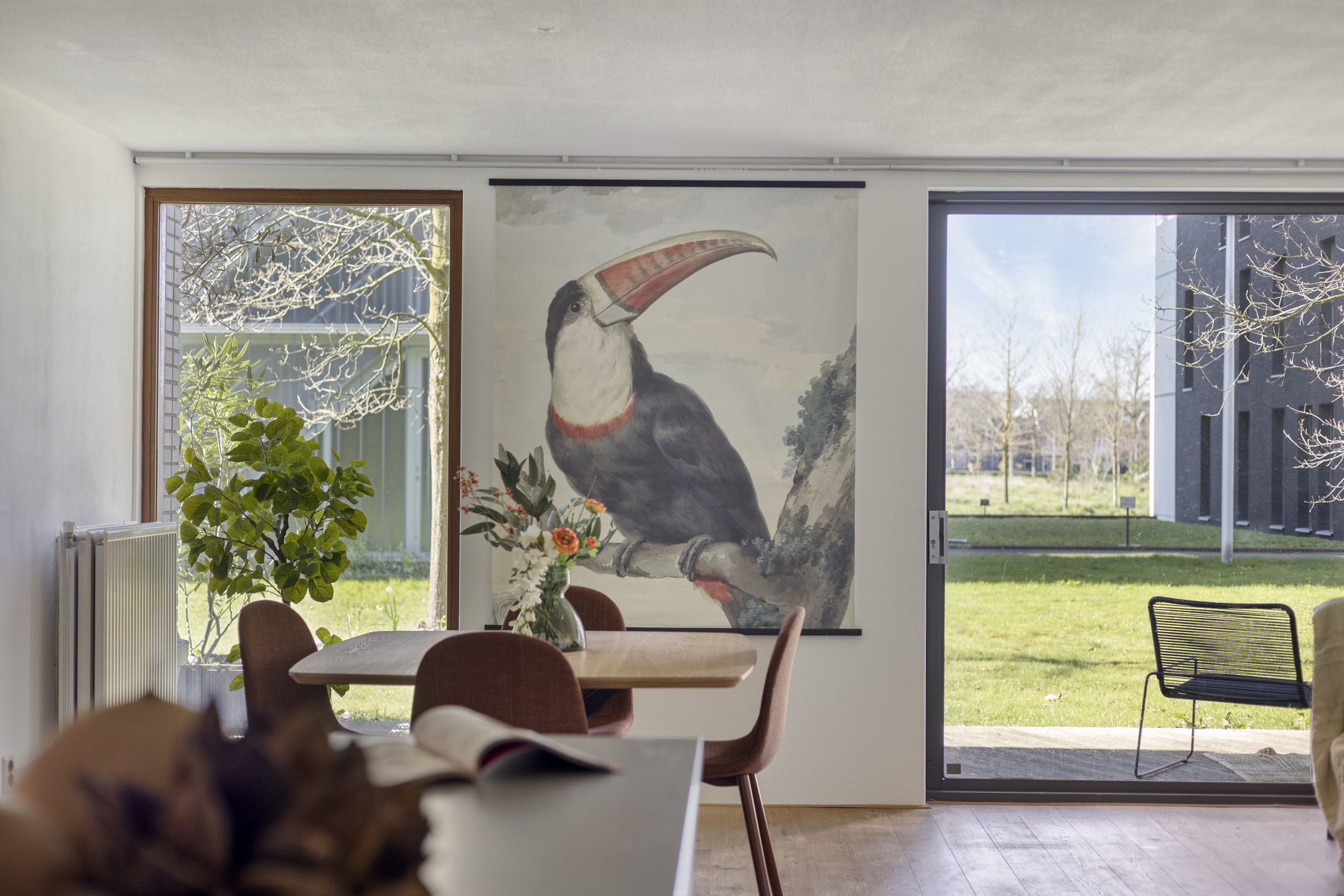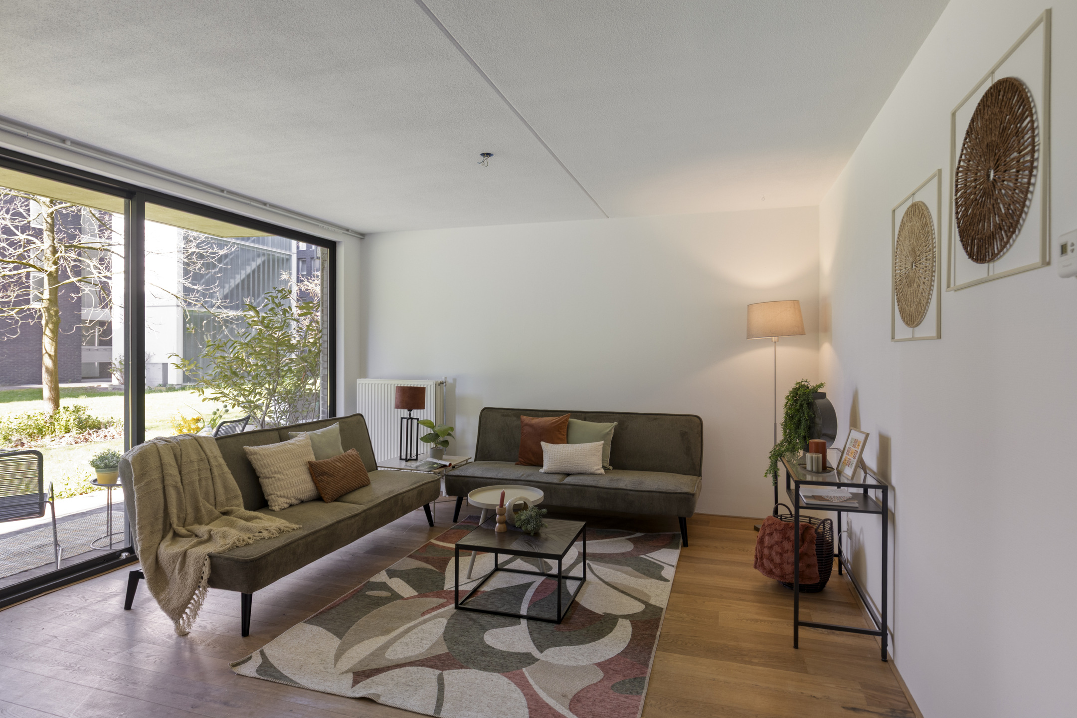 Bij binnenkomst valt meteen het prettige licht op. De woonkamer is ruim opgezet en dankzij de grote raampartijen komt er veel daglicht naar binnen. De schuifpui zorgt voor een fijne verbinding met buiten, waardoor het overdekte terras echt als een verlengstuk van de leefruimte voelt. Hier kun je comfortabel zitten, beschut en met een vrij uitzicht op het groen.