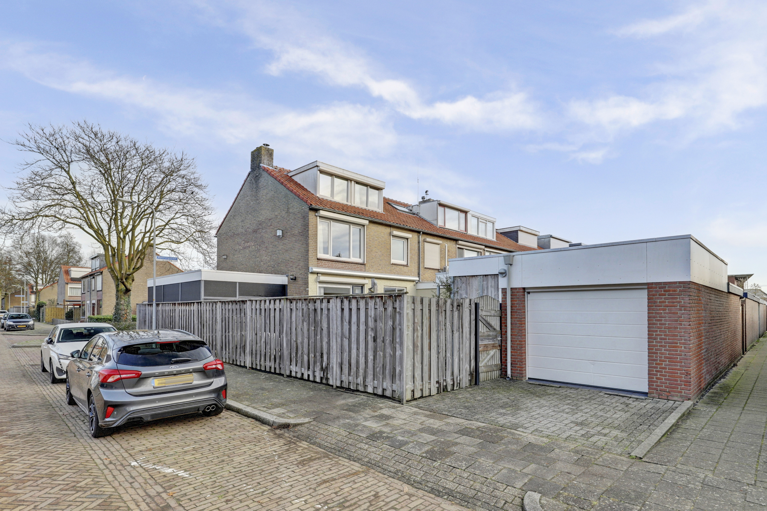 De zonnige en sfeervolle achtertuin is gelegen op het zuiden en voorzien van terras met elektrisch zonnescherm, achterom via een poort, buitenkraan en elektrapunt. Achterin de tuin staat een garage van ca. 20 m2 met overkapping van ca. 17 m2. De garage is in 2018 verhoogd (ca. 2,50 m hoog) en geïsoleerd en voorzien van elektrische segmentdeur naar de oprit, lichtkoepel, verwarming en wasbak. Daarnaast is er in de zijtuin nog een overkapping van ca. 17 m2 met elektra en buitenkraan. Op de oprit kan er geparkeerd worden.