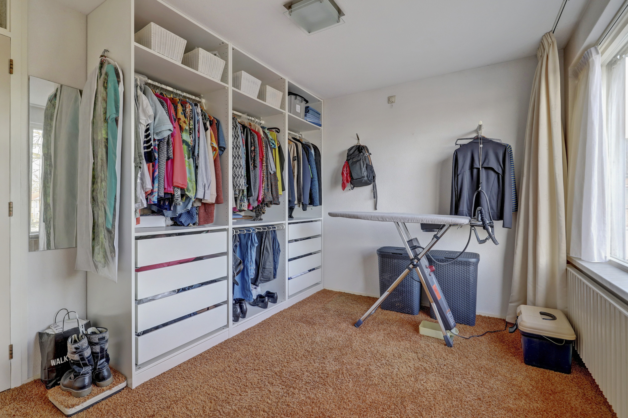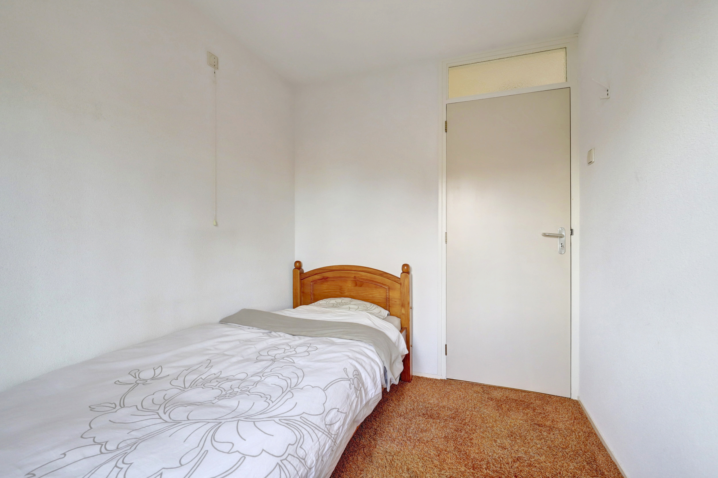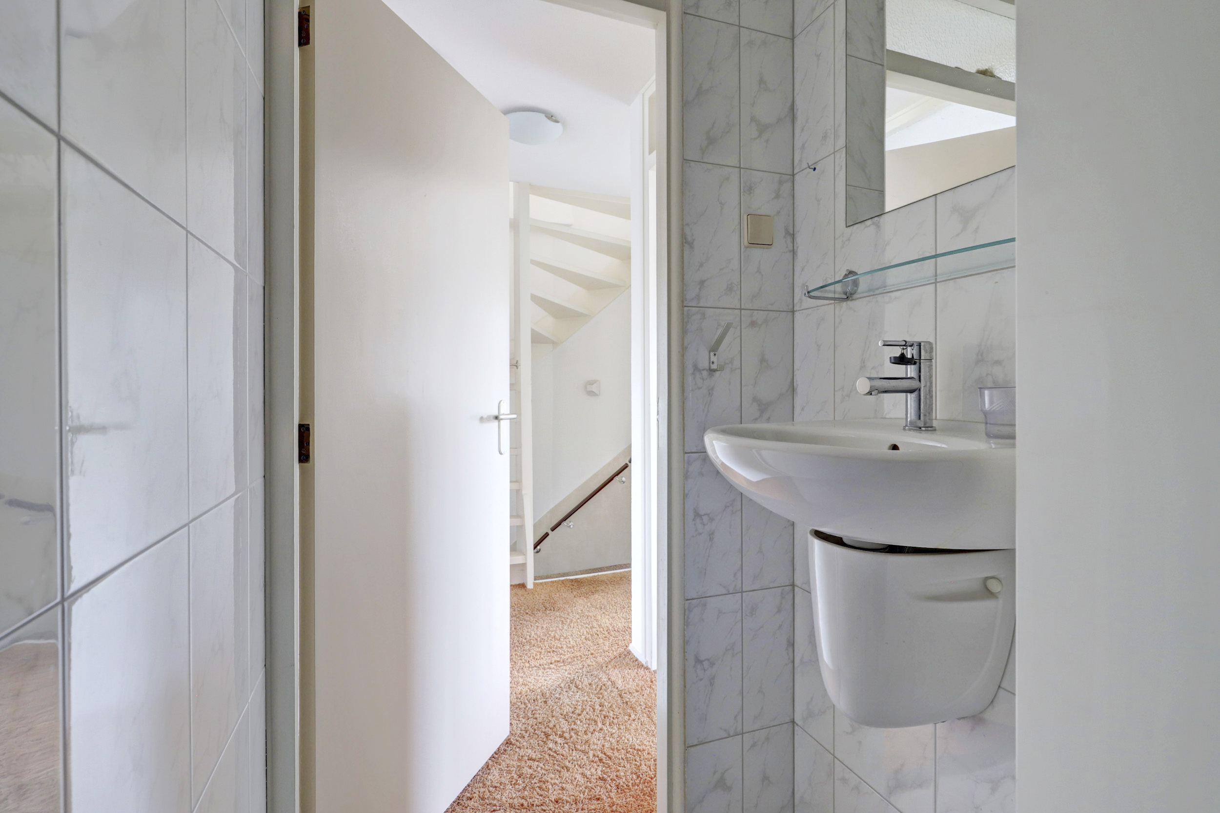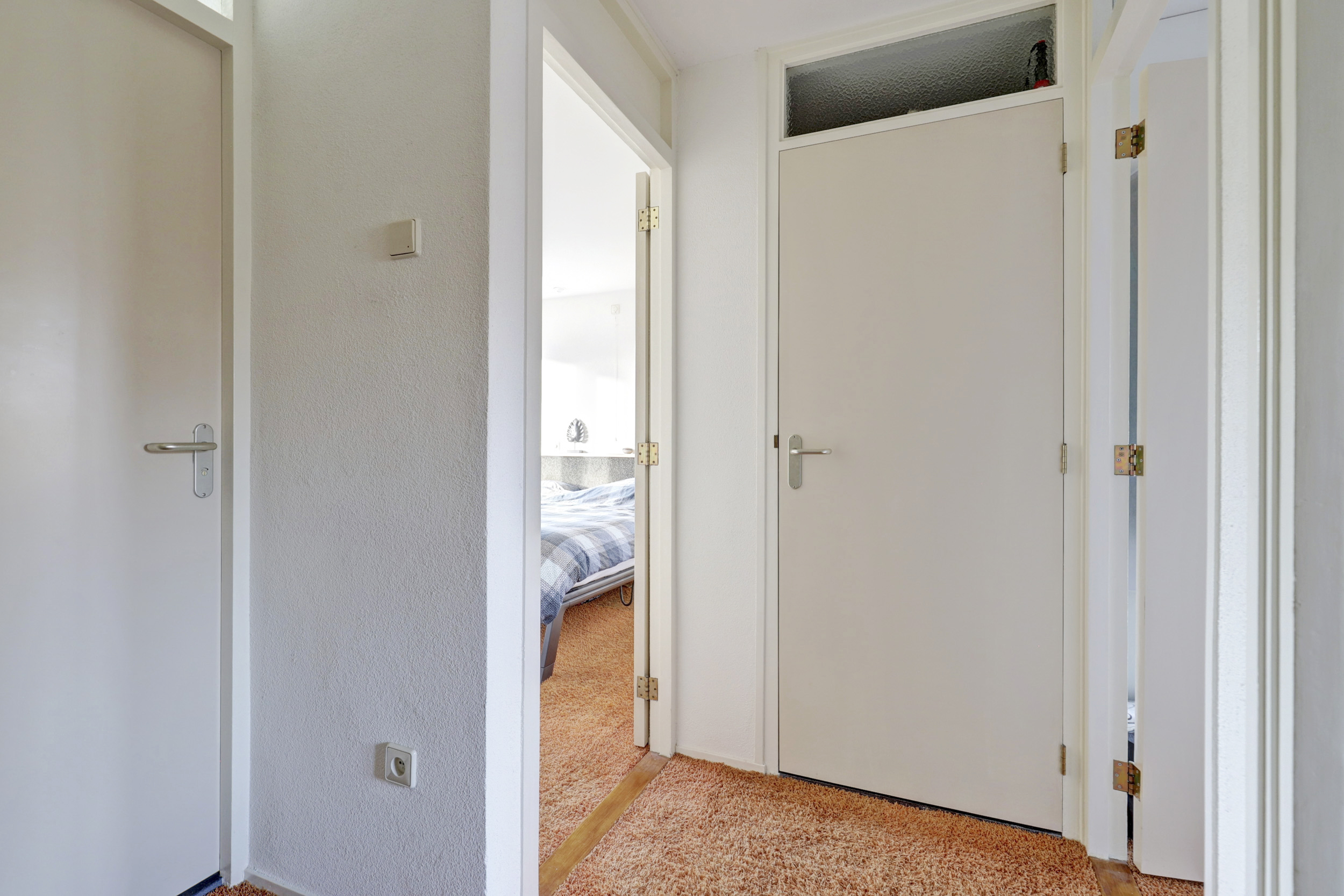 Overloop met vloerbedekking, toegang tot de 3 slaapkamers, de wasruimte, de badkamer en de vaste trapopgang naar de 2de verdieping. De 3 slaapkamers zijn voorzien van vloerbedekking en elektrische rolluiken. De grootste slaapkamer is tevens voorzien van kunststof draaikiepramen, schuifkastenwand en spotjes. De badkamer is voorzien van douchecabine met hand- en regendouche, wastafel, wandcloset, kast, elektrische vloerverwarming, geheel betegeld in lichte kleur en kunststof draaikiepraam met elektrisch rolluik. Praktische separate wasruimte met aansluitingen voor de wasmachine en droger, wasbak (koud- en warmwater) en geheel betegeld.