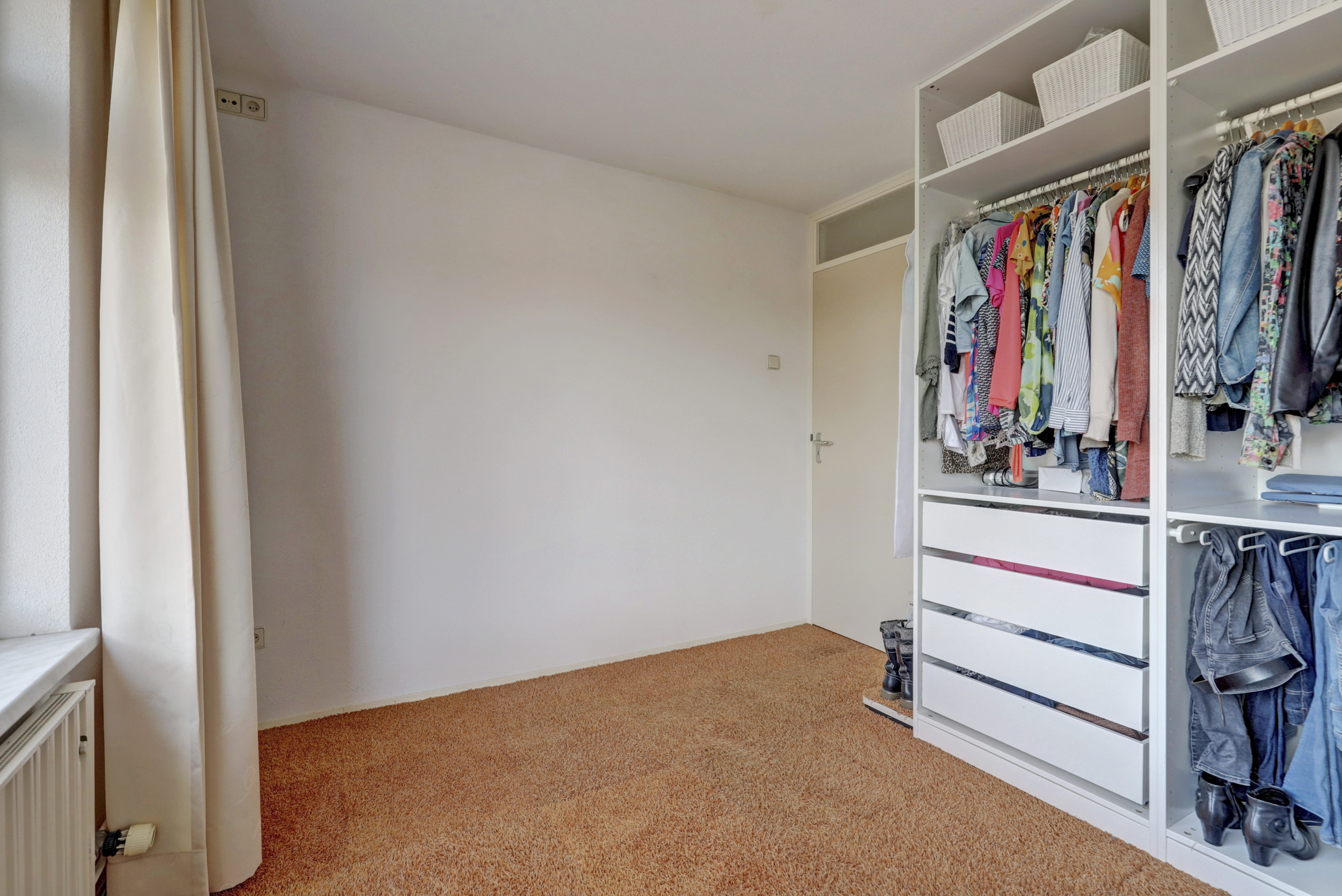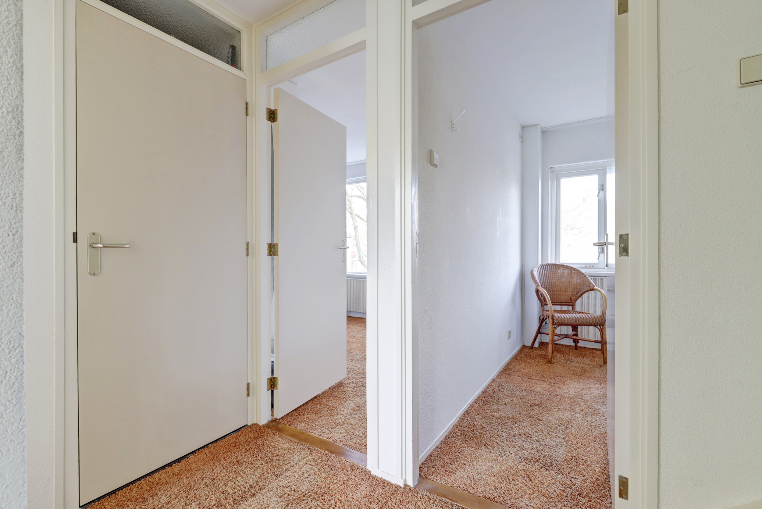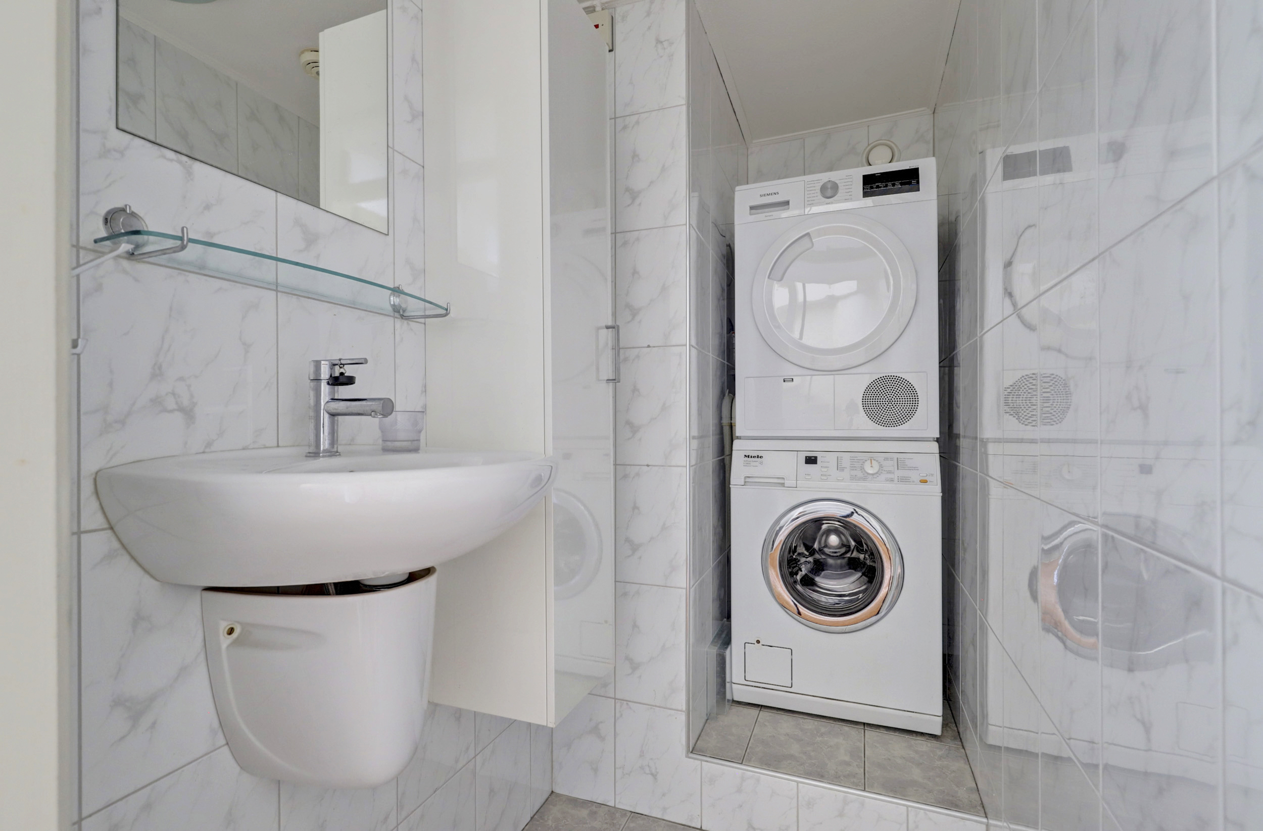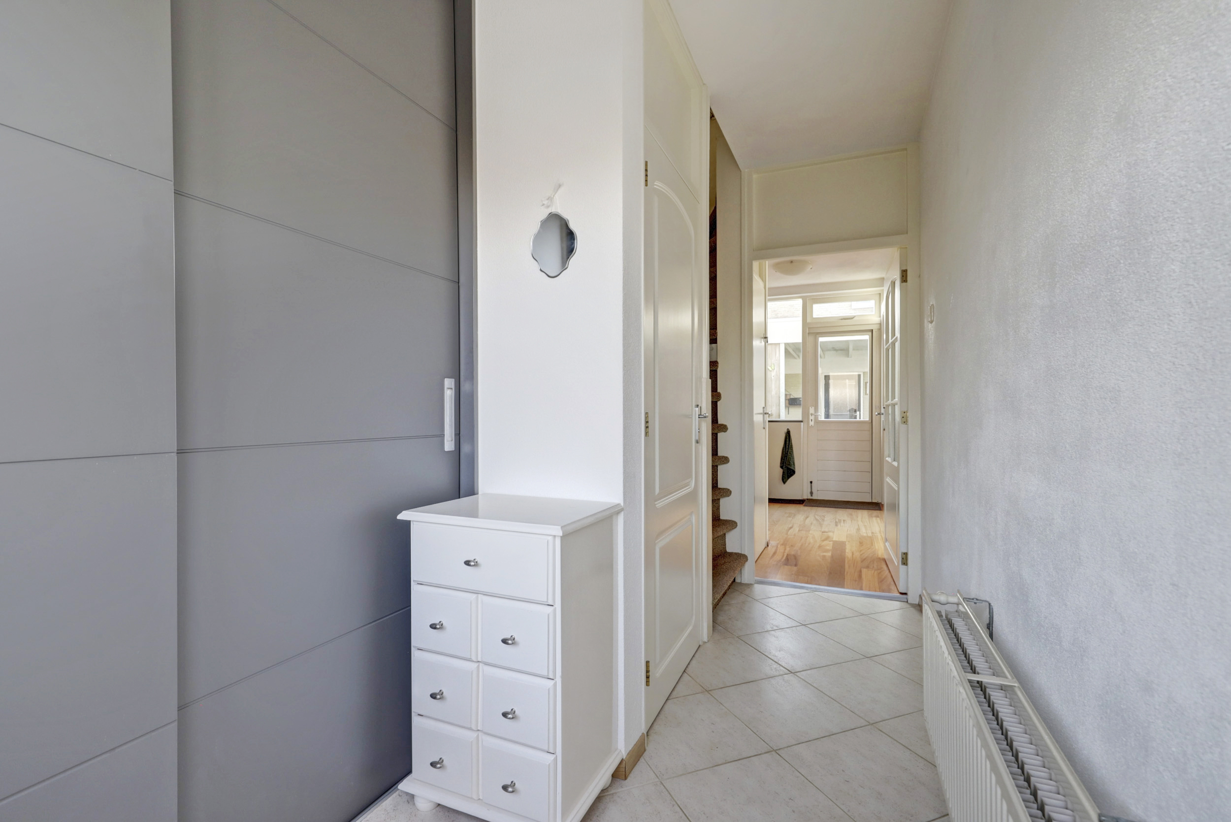 Overloop met vloerbedekking, toegang tot de 3 slaapkamers, de wasruimte, de badkamer en de vaste trapopgang naar de 2de verdieping. De 3 slaapkamers zijn voorzien van vloerbedekking en elektrische rolluiken. De grootste slaapkamer is tevens voorzien van kunststof draaikiepramen, schuifkastenwand en spotjes. De badkamer is voorzien van douchecabine met hand- en regendouche, wastafel, wandcloset, kast, elektrische vloerverwarming, geheel betegeld in lichte kleur en kunststof draaikiepraam met elektrisch rolluik. Praktische separate wasruimte met aansluitingen voor de wasmachine en droger, wasbak (koud- en warmwater) en geheel betegeld.