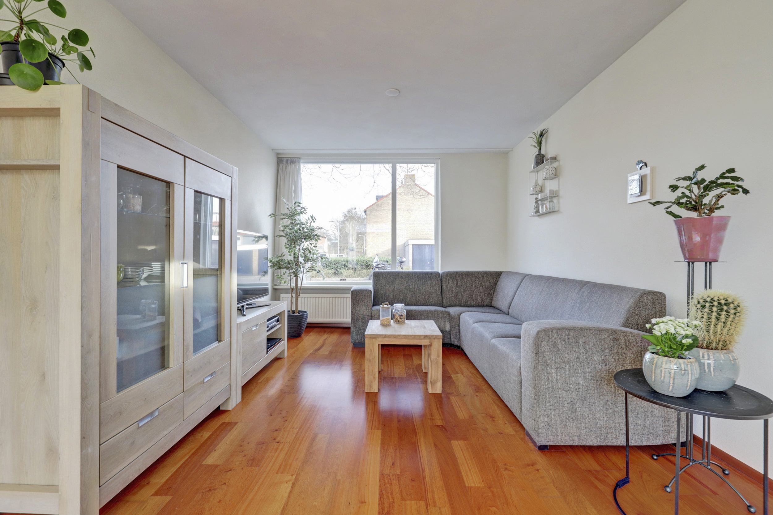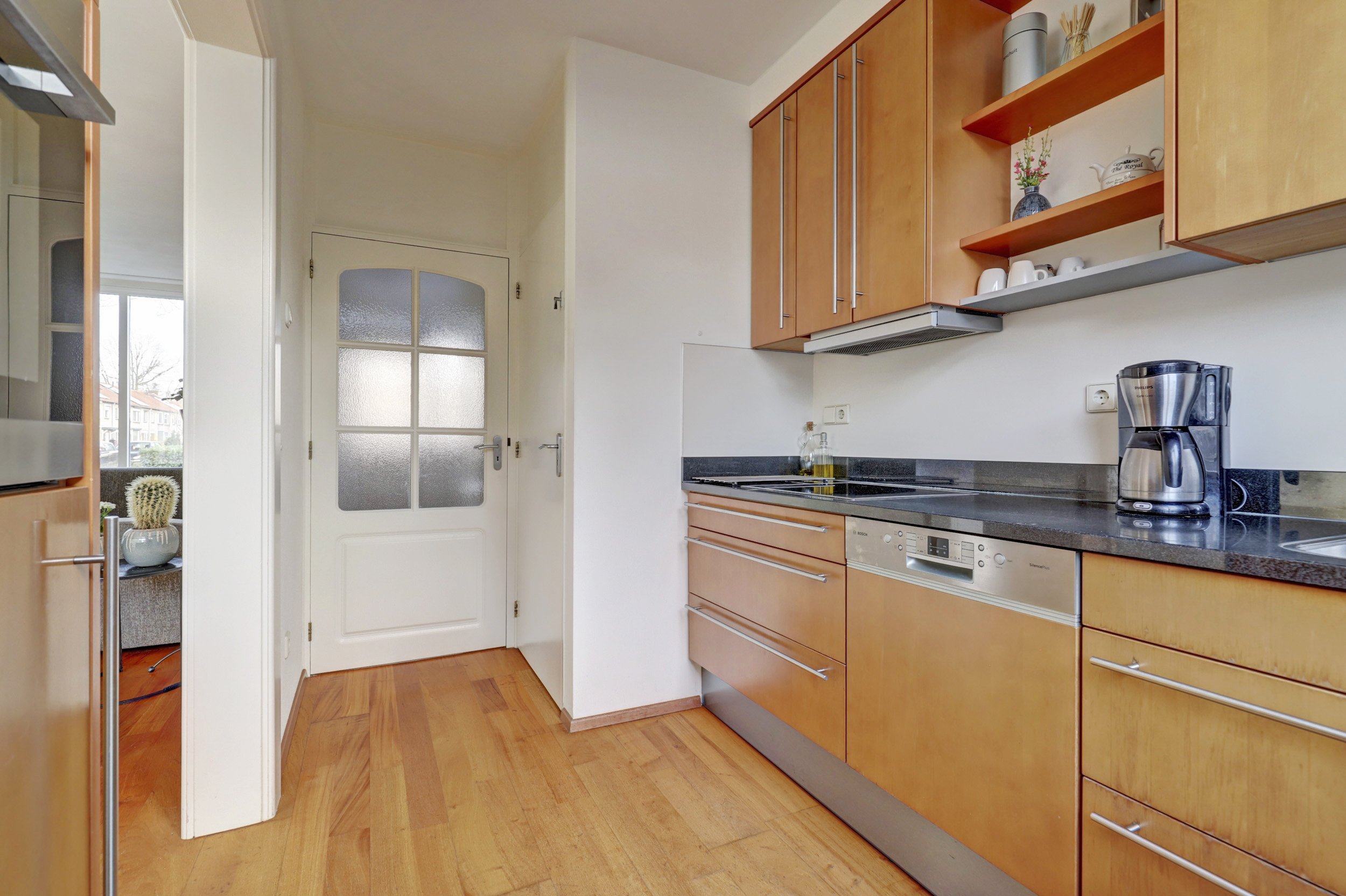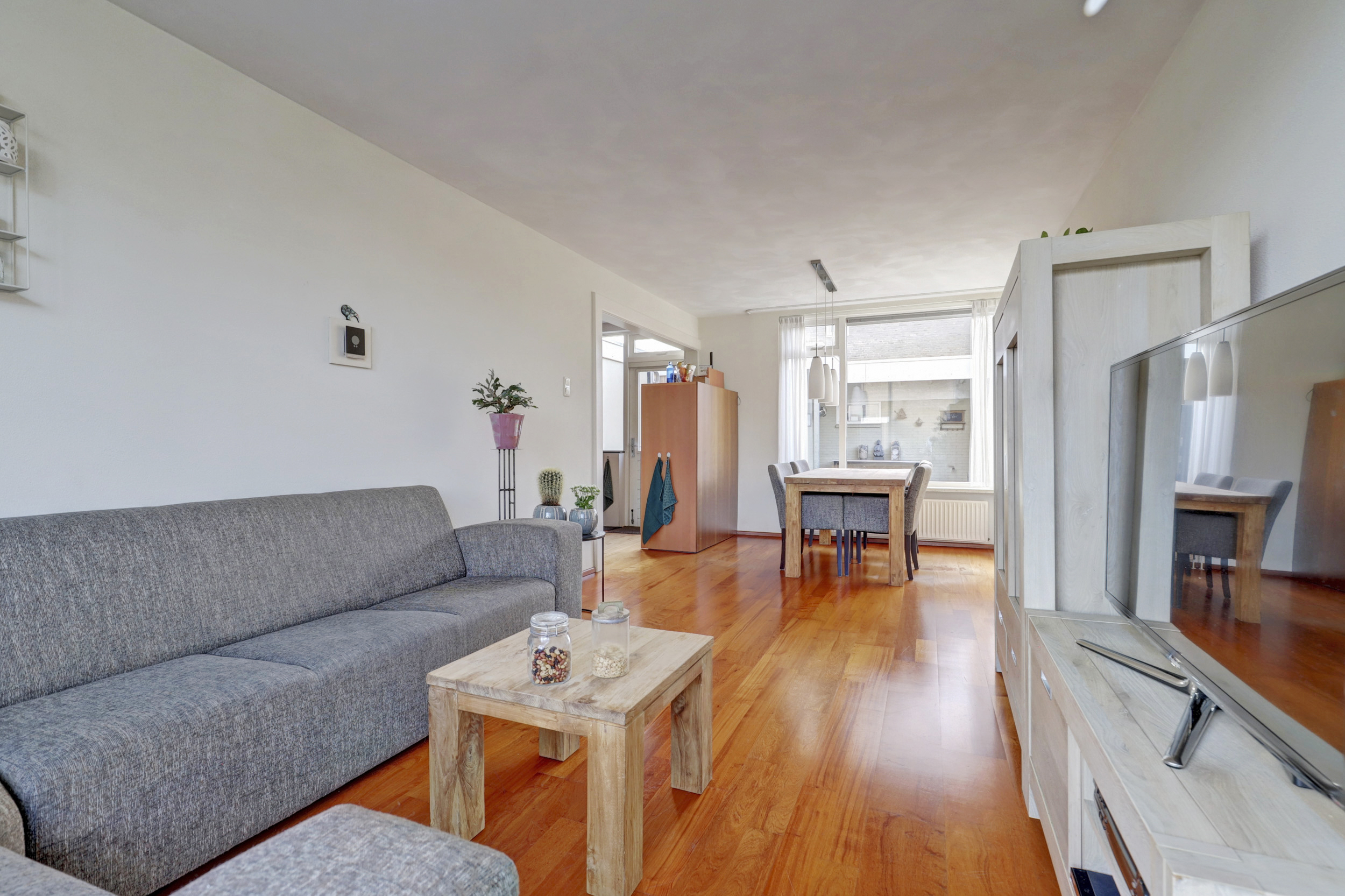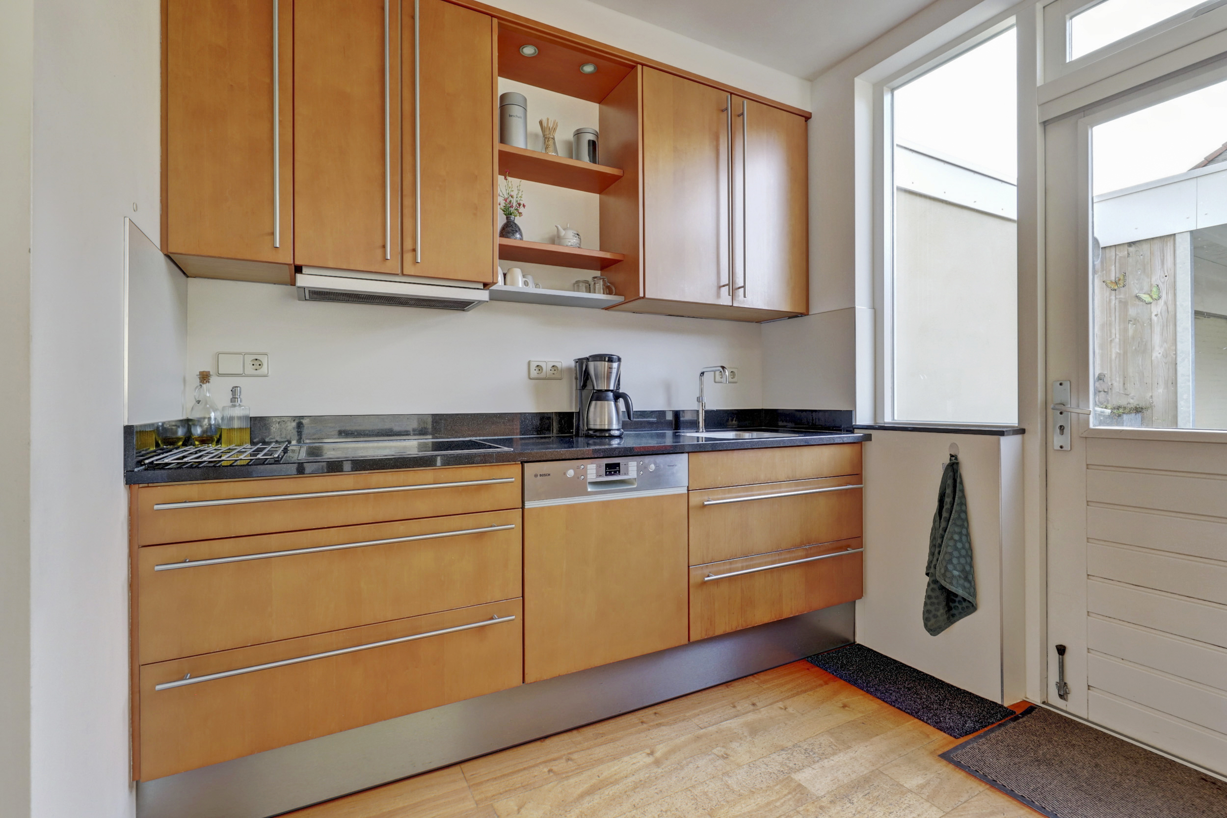 Entree/hal met trapopgang naar de 1ste verdieping, tegelvloer, schuifkastenwand, meterkast met klikgroepen en glasvezelaansluiting en toiletruimte met wandcloset en in lichte kleur betegeld. Sfeervolle woonkamer, welke is voorzien van parketvloer, spuitwerk wandafwerking, schuurplafonds en elektrische rolluiken aan voor- en achterzijde. Halfopen keuken met praktische verdiepte trapkast, deur met rolluik en hor naar de achtertuin en voorzien van diverse inbouwapparatuur, o.a. koelkast, 4-pits inductiekookplaat, vaatwasser, oven, afzuigkap en Quooker.