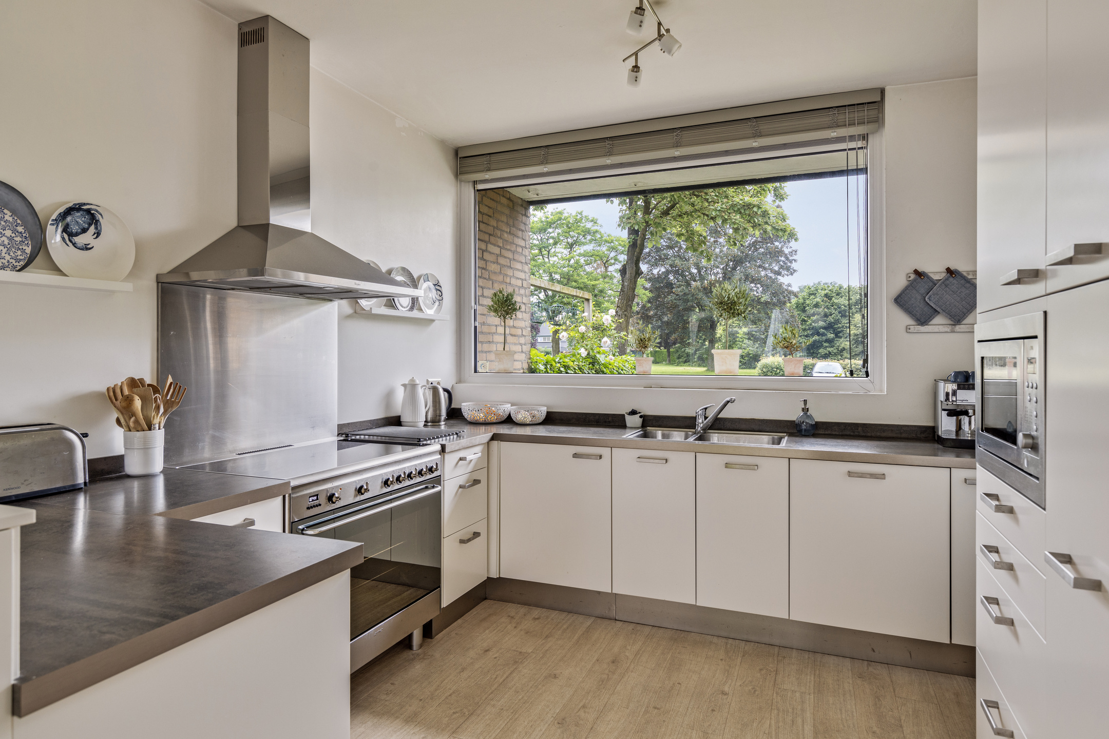 Bij binnenkomst stap je in de vierkante hal met toegang tot het toilet, de trapopgang naar de 1e verdieping en de inpandige berging met witgoedopstelling. De lichte en speels ingedeelde woonkamer is tuingericht en biedt via grote raampartijen een prettige verbinding met buiten. De ruime open keuken (2009) heeft veel kastruimte, is voorzien van (deels) vernieuwde inbouwapparatuur en staat in een gezellige open verbinding met de eethoek, met zicht op beide tuinen.