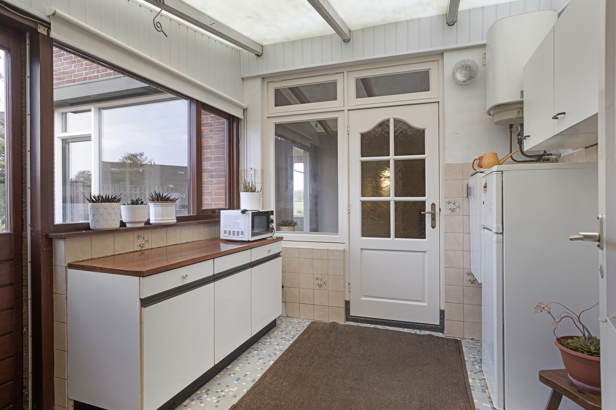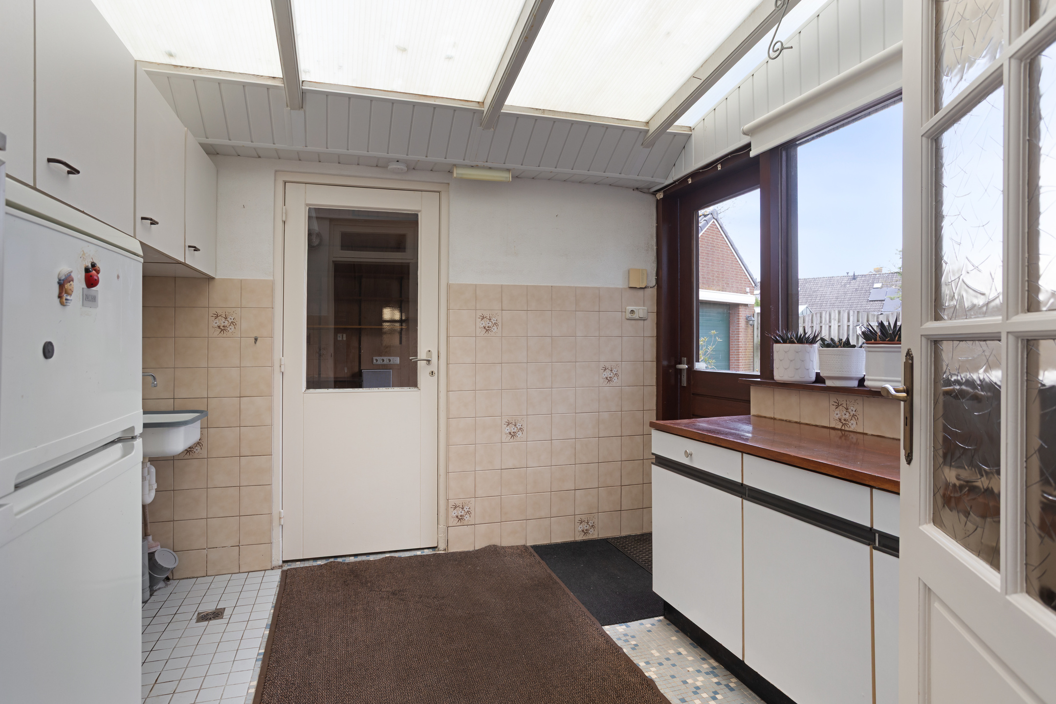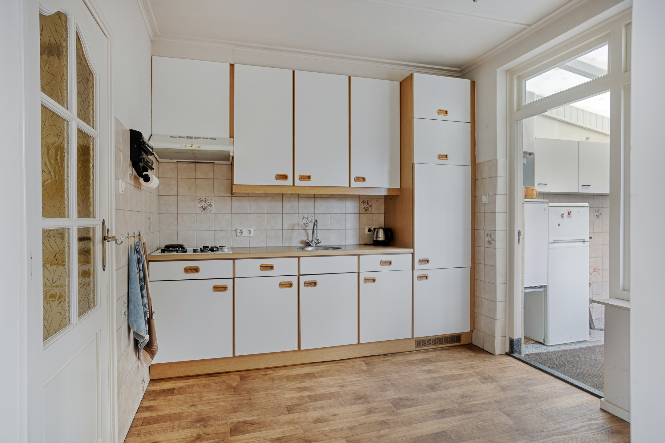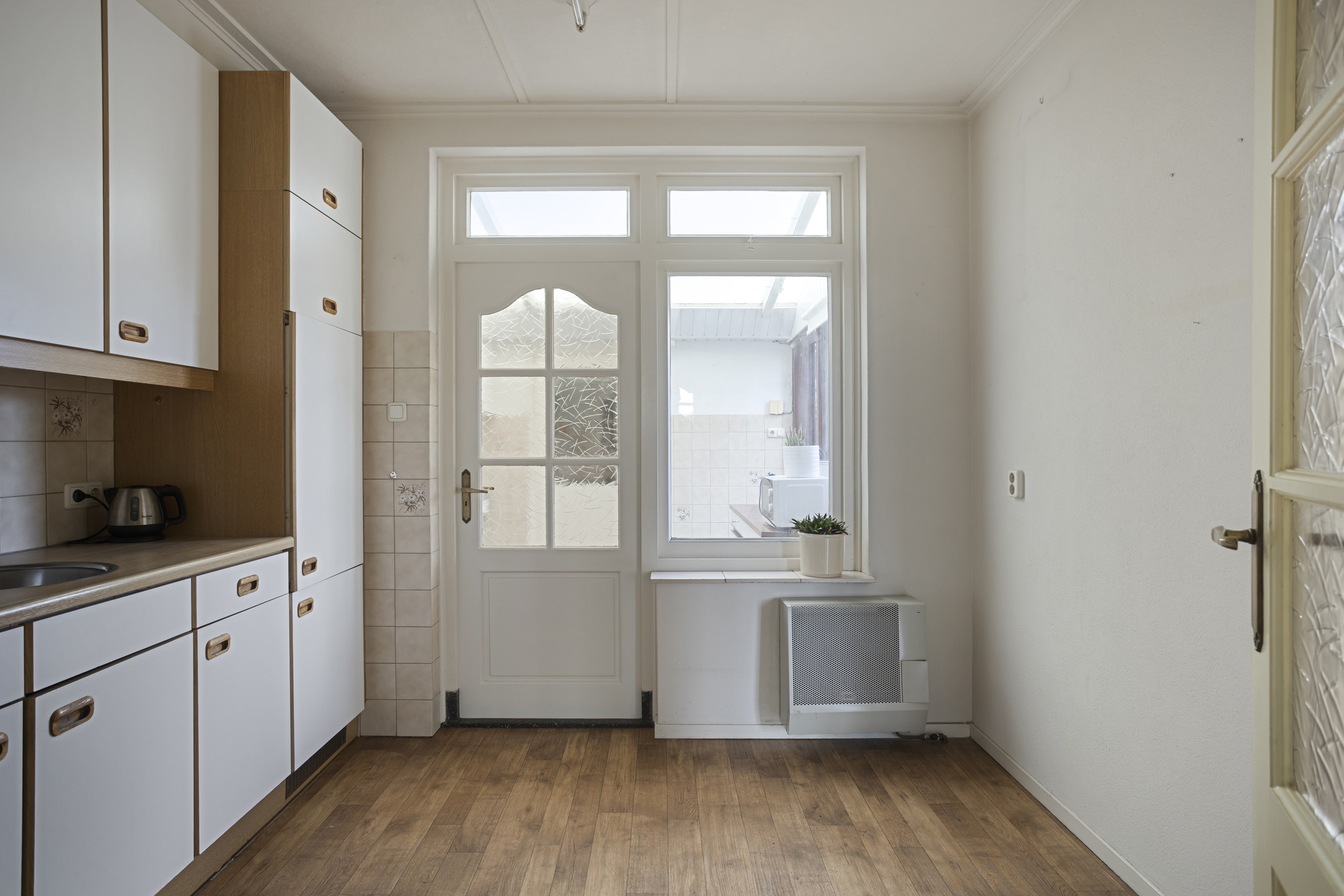 Entree met meterkast, toiletruimte met fontein en raampje, praktische verdiepte trap/kelderkast, toegang tot de keuken en trapopgang naar de eerste verdieping. De lichte woonkamer beschikt over grote raampartijen aan voor- en achterzijde, rolluiken, kunststof kozijnen met draai-kiepramen en HR++ glas. Verwarming via gaskachel en gashaard. Wandafwerking met spachtelputz en een strak spanplafond. De keuken is aan de achterzijde gesitueerd en voorzien van een keukenblok met 4-pits gasfornuis, afzuigkap en koelkast. Vanuit de keuken toegang tot de praktische bijkeuken met aansluitingen voor wasmachine en droger, elektrische boiler en wasbak met koud water. Vanuit hier bereik je zowel de achtertuin als de berging/hobbyruimte met raam, rolluik en kleine bergvliering.