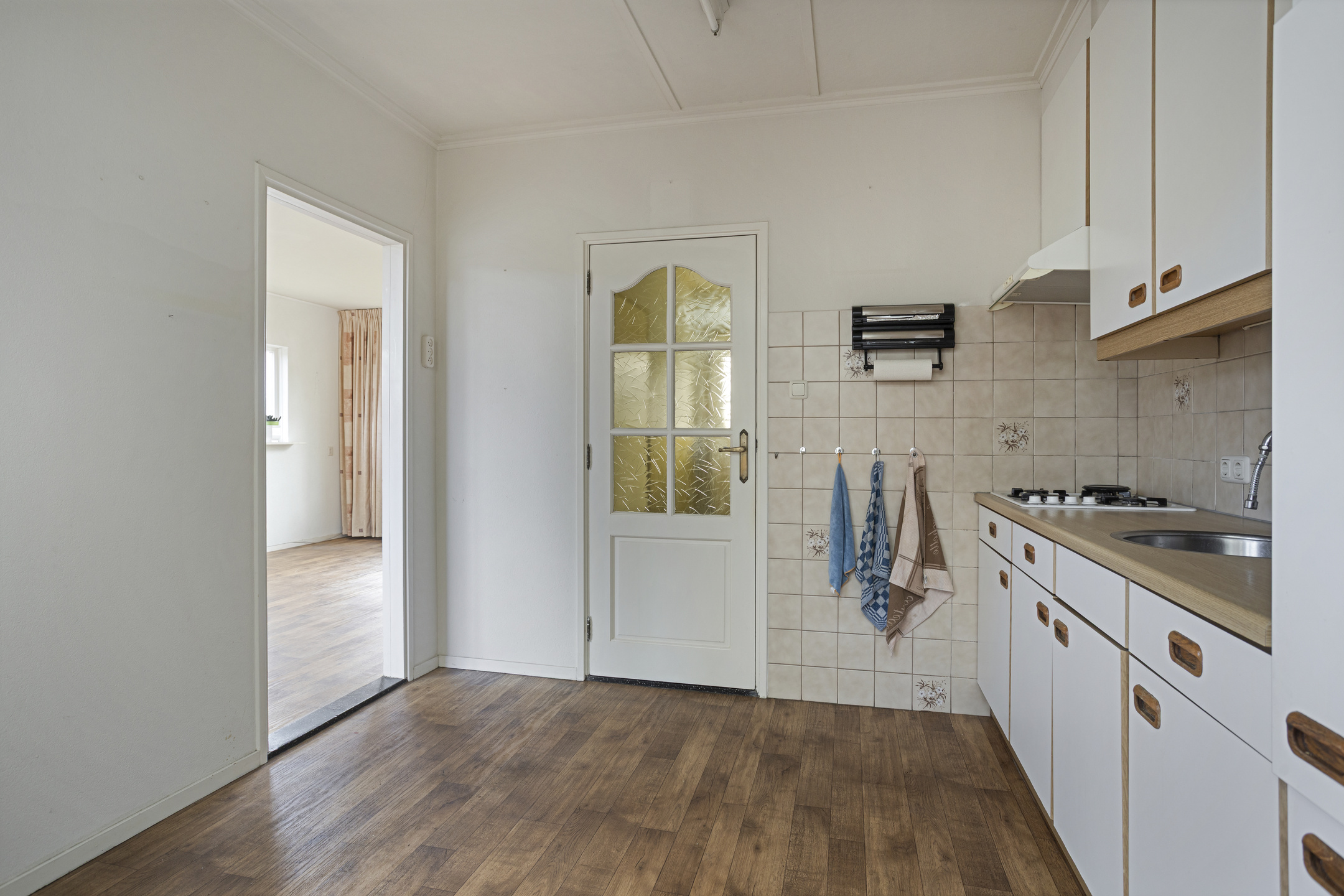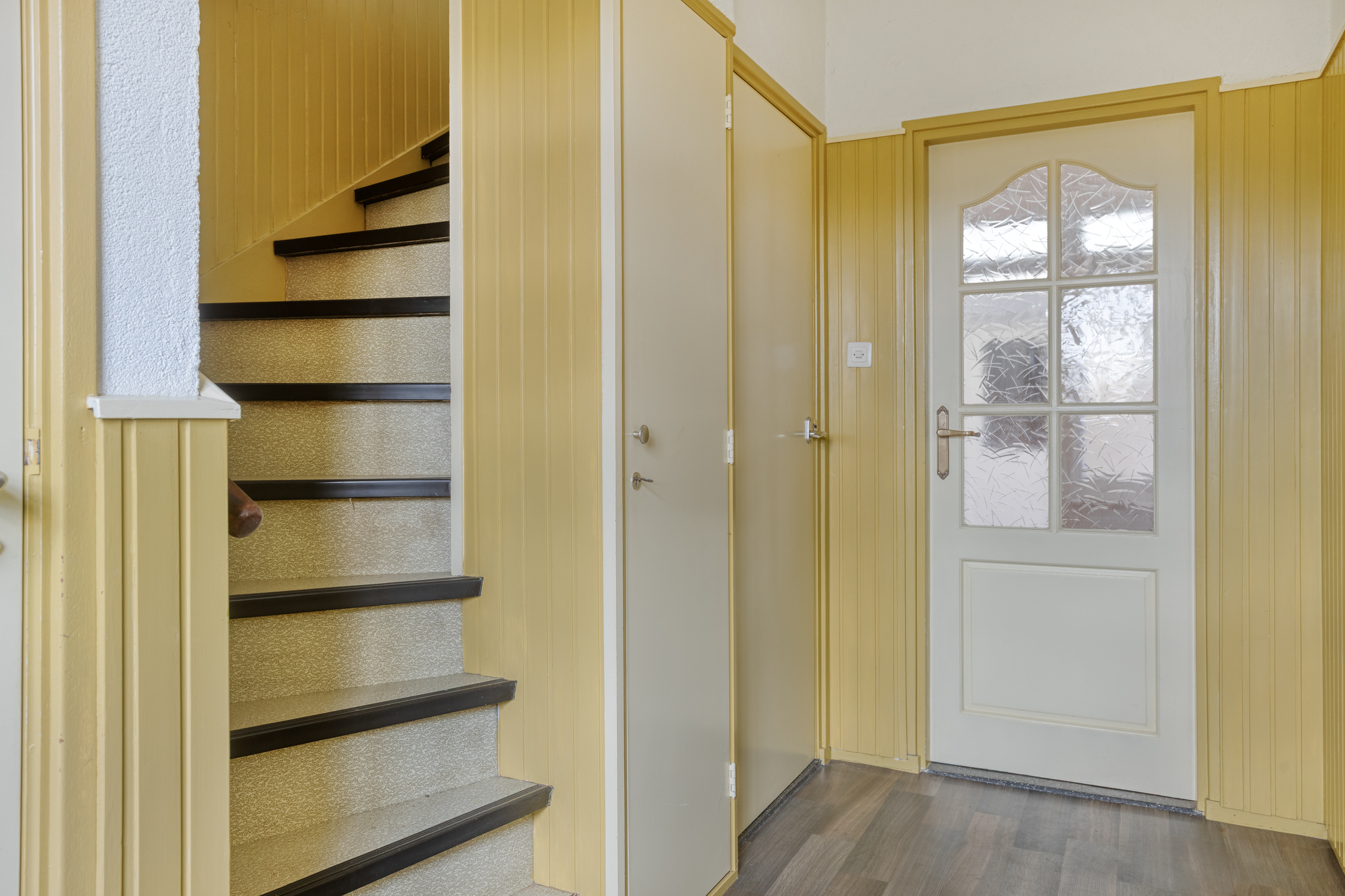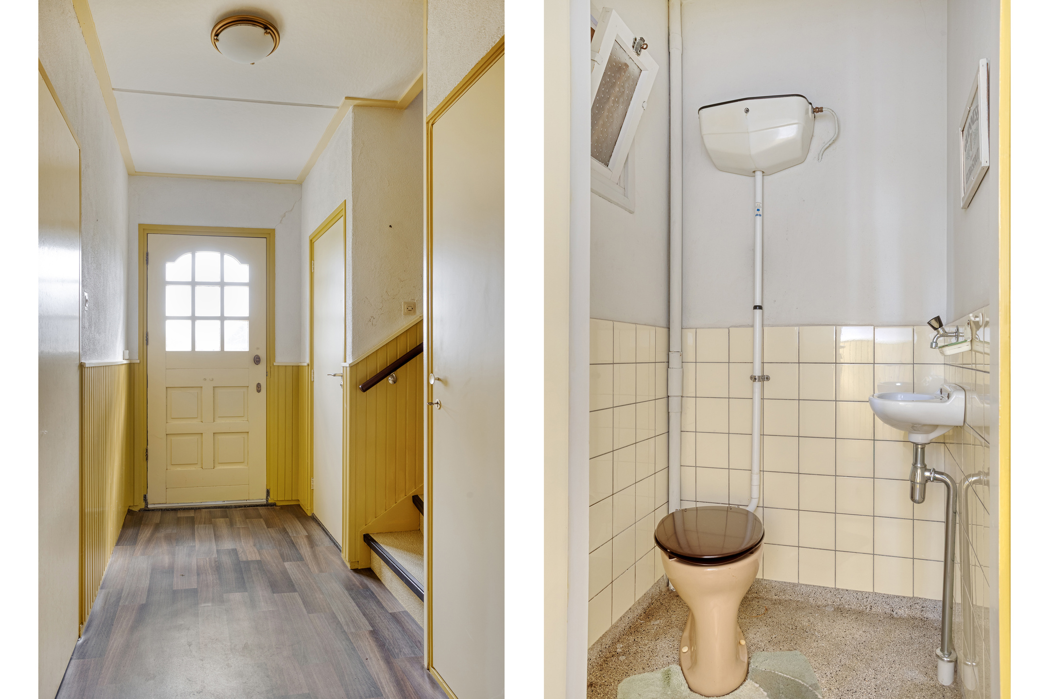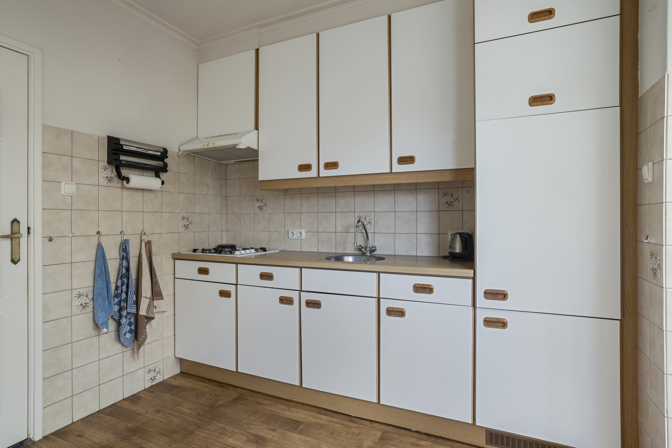 Entree met meterkast, toiletruimte met fontein en raampje, praktische verdiepte trap/kelderkast, toegang tot de keuken en trapopgang naar de eerste verdieping. De lichte woonkamer beschikt over grote raampartijen aan voor- en achterzijde, rolluiken, kunststof kozijnen met draai-kiepramen en HR++ glas. Verwarming via gaskachel en gashaard. Wandafwerking met spachtelputz en een strak spanplafond. De keuken is aan de achterzijde gesitueerd en voorzien van een keukenblok met 4-pits gasfornuis, afzuigkap en koelkast. Vanuit de keuken toegang tot de praktische bijkeuken met aansluitingen voor wasmachine en droger, elektrische boiler en wasbak met koud water. Vanuit hier bereik je zowel de achtertuin als de berging/hobbyruimte met raam, rolluik en kleine bergvliering.