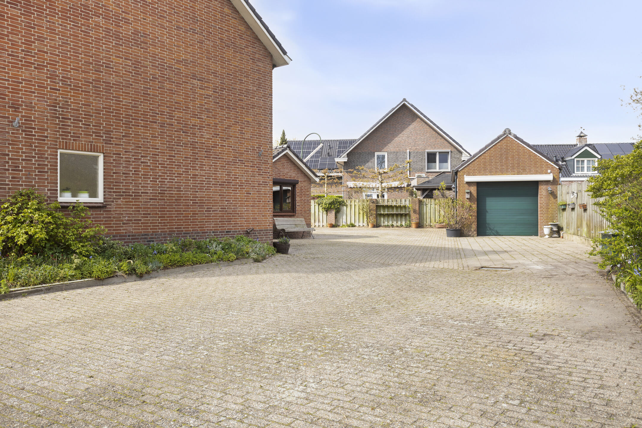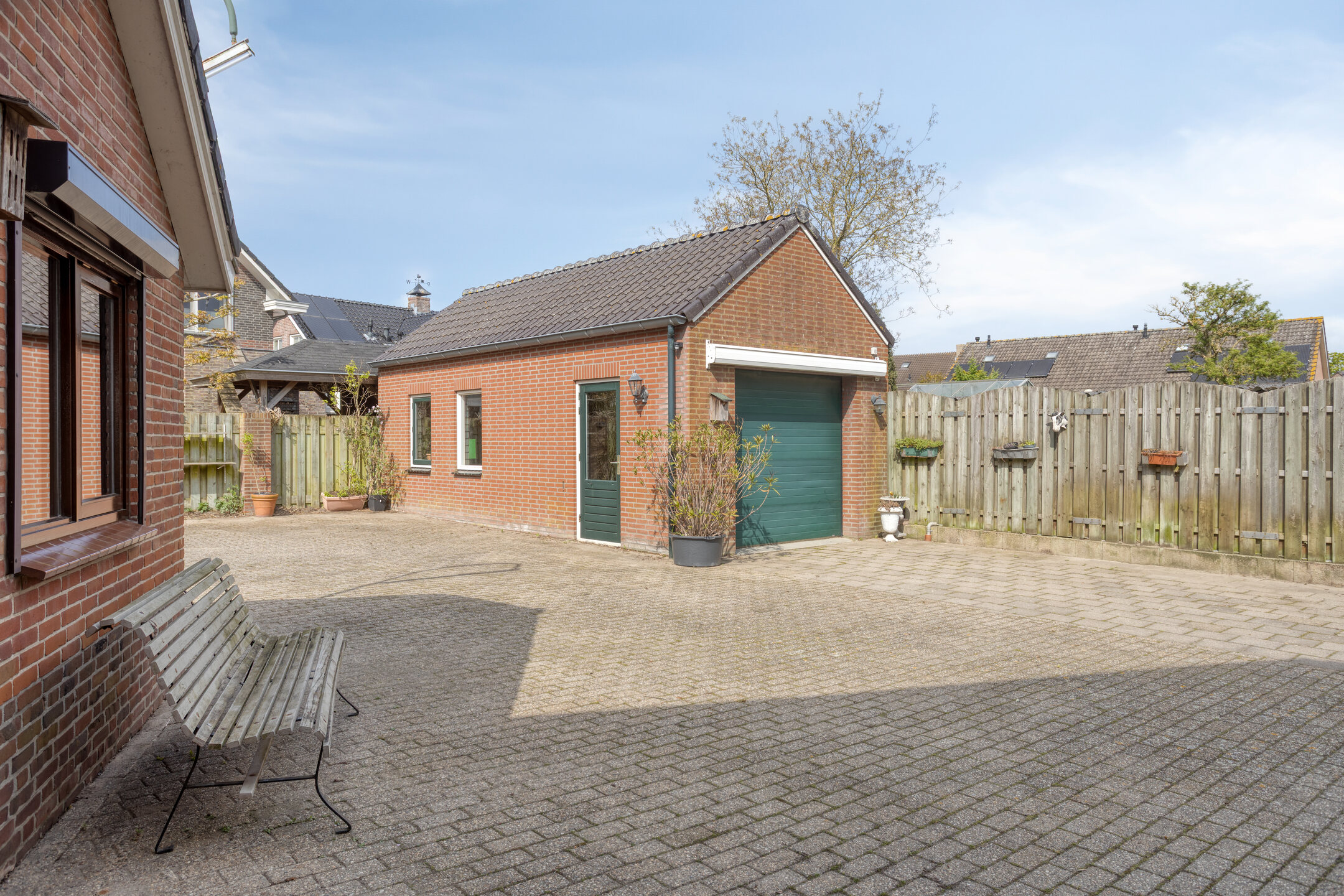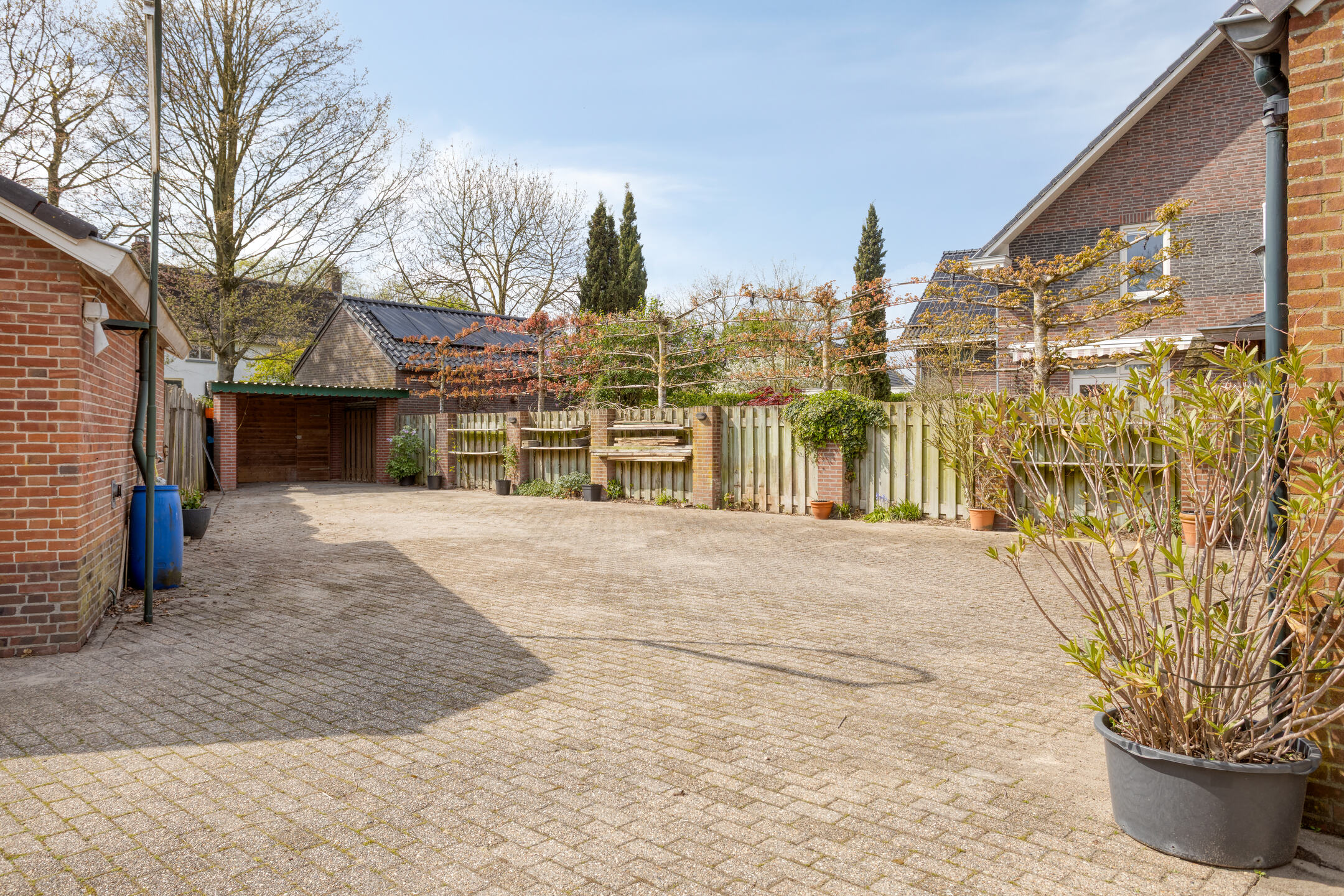 Aan de voorzijde van de garage is een elektrisch zonnescherm geplaatst, zodat je ook op warme dagen comfortabel buiten kunt zitten. Het perceel is grotendeels bestraat, waardoor er ruimte is voor meerdere auto’s op eigen terrein.