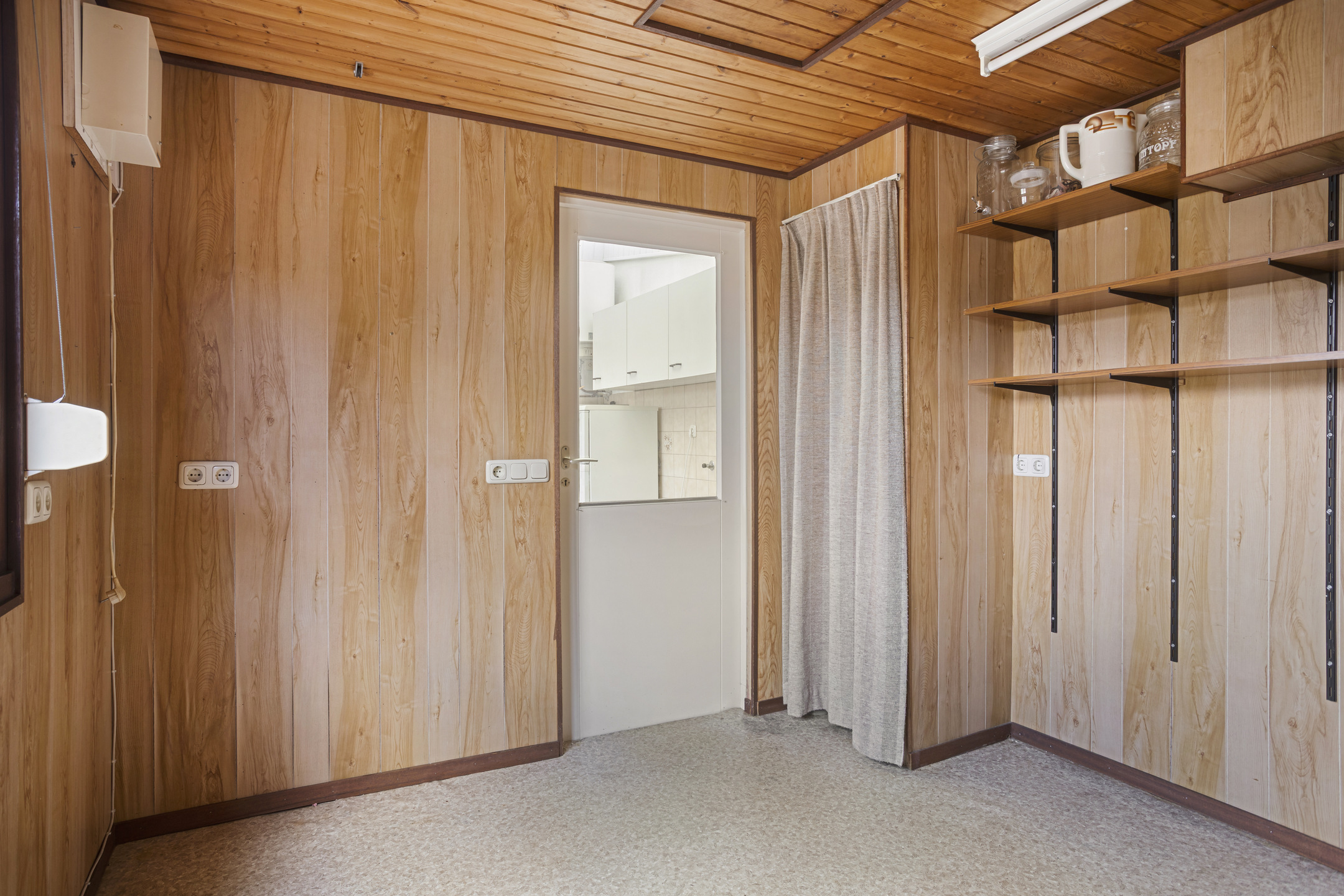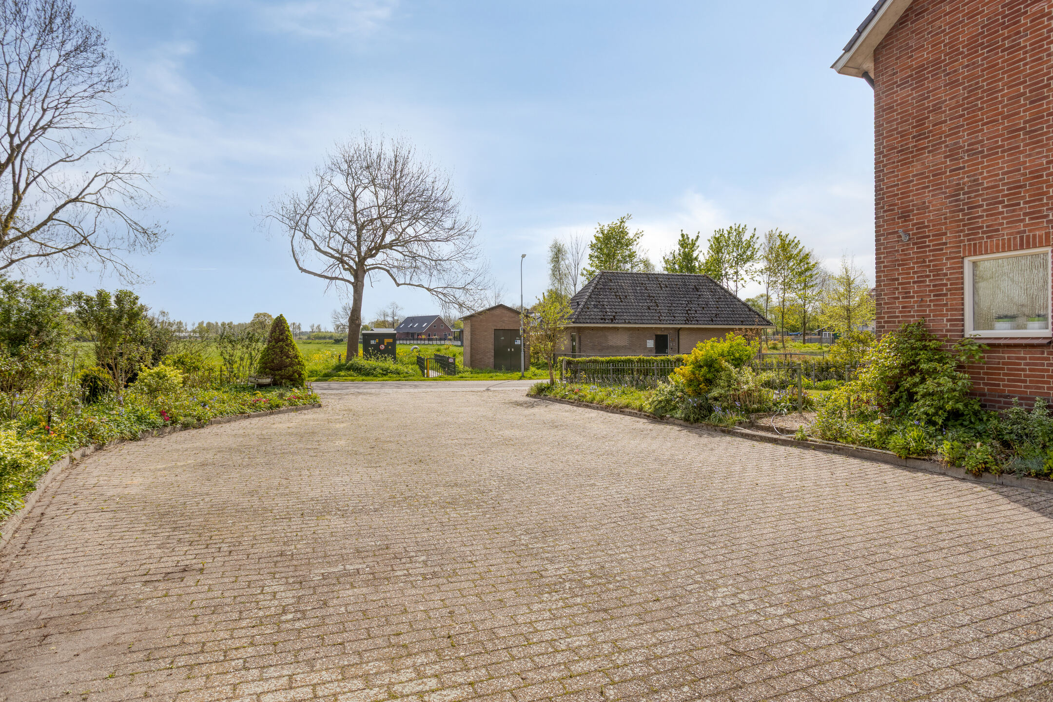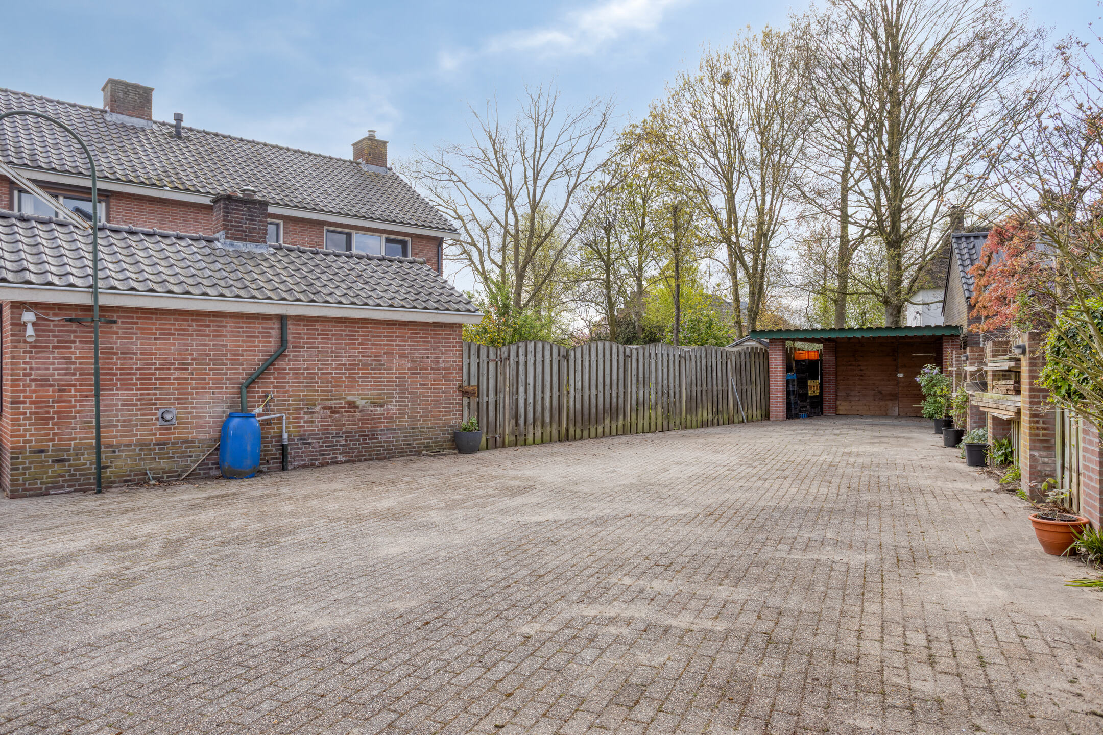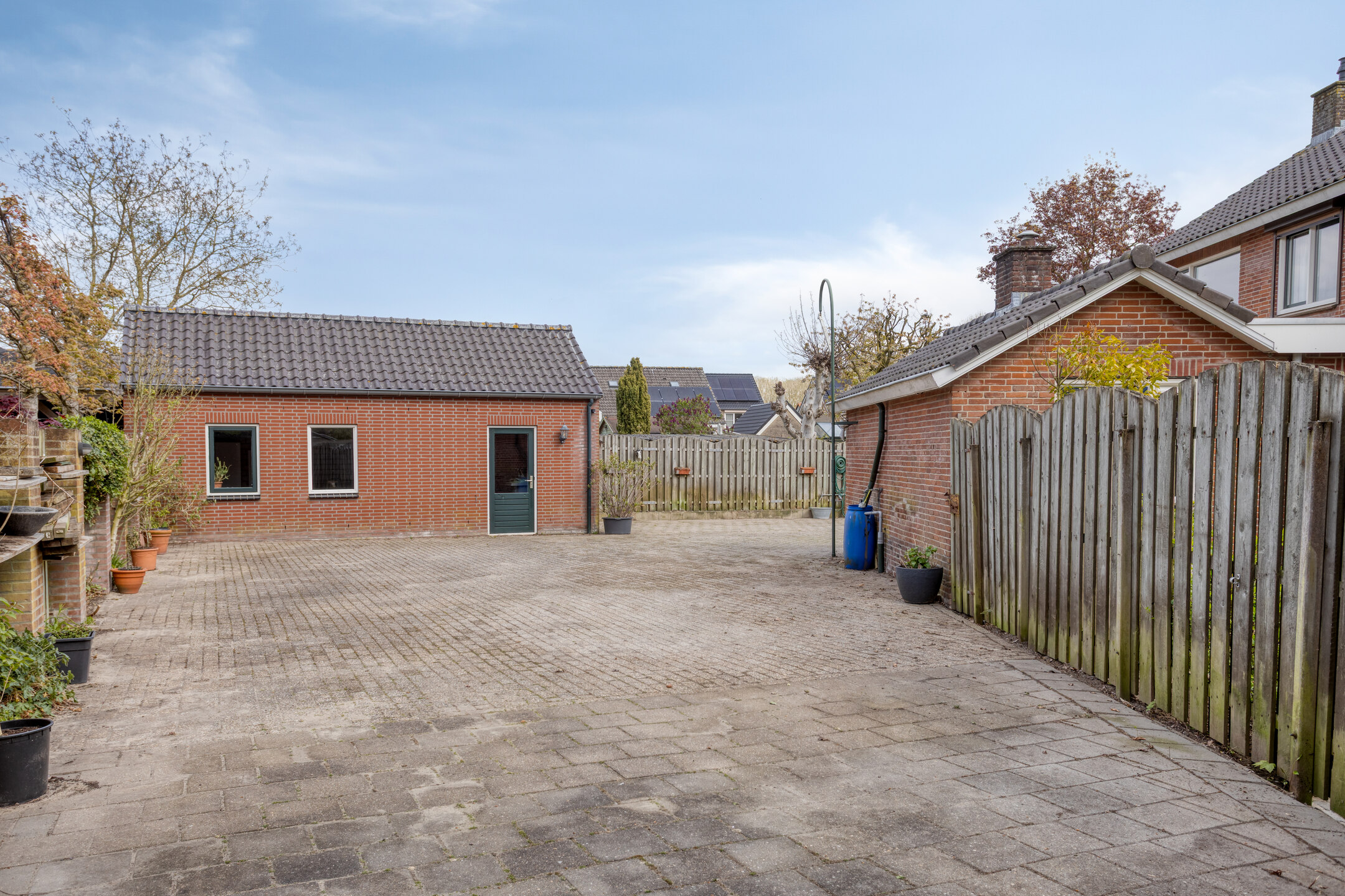 Aan de voorzijde van de garage is een elektrisch zonnescherm geplaatst, zodat je ook op warme dagen comfortabel buiten kunt zitten. Het perceel is grotendeels bestraat, waardoor er ruimte is voor meerdere auto’s op eigen terrein.