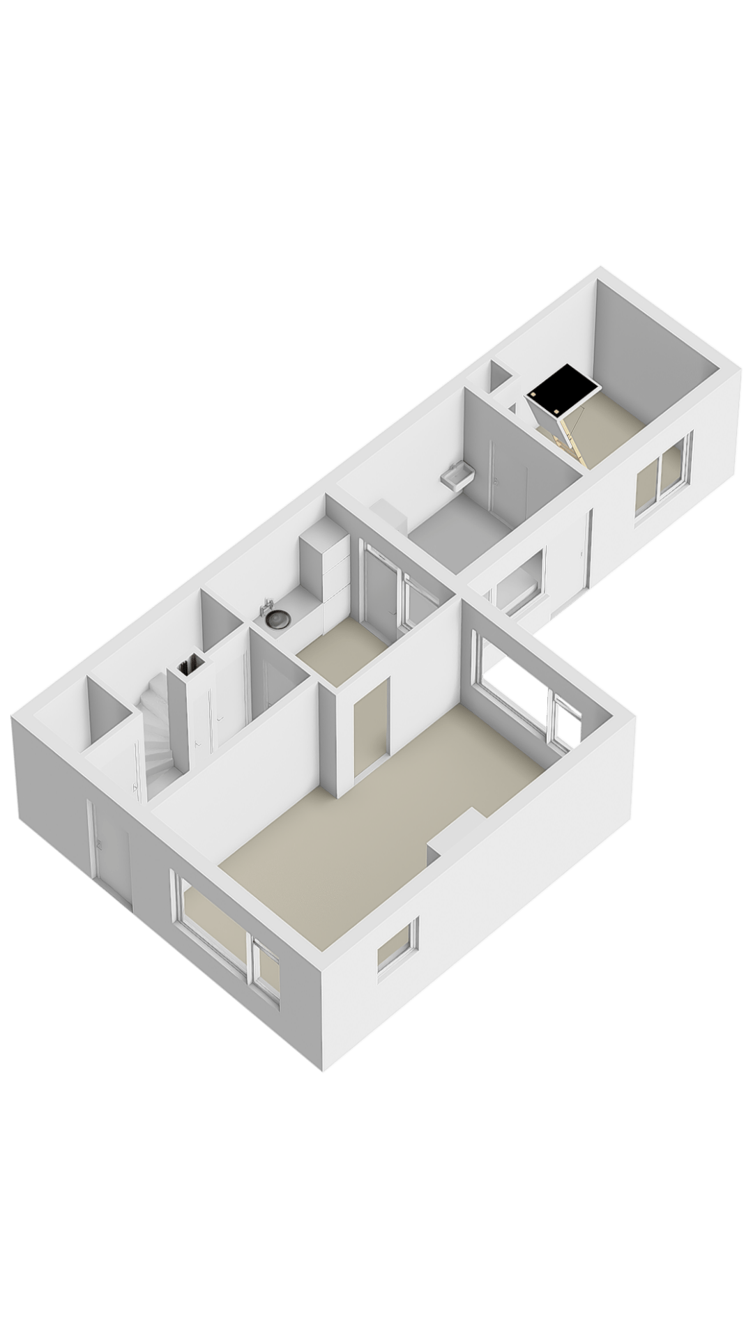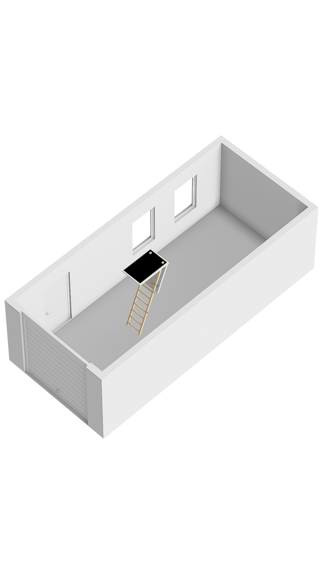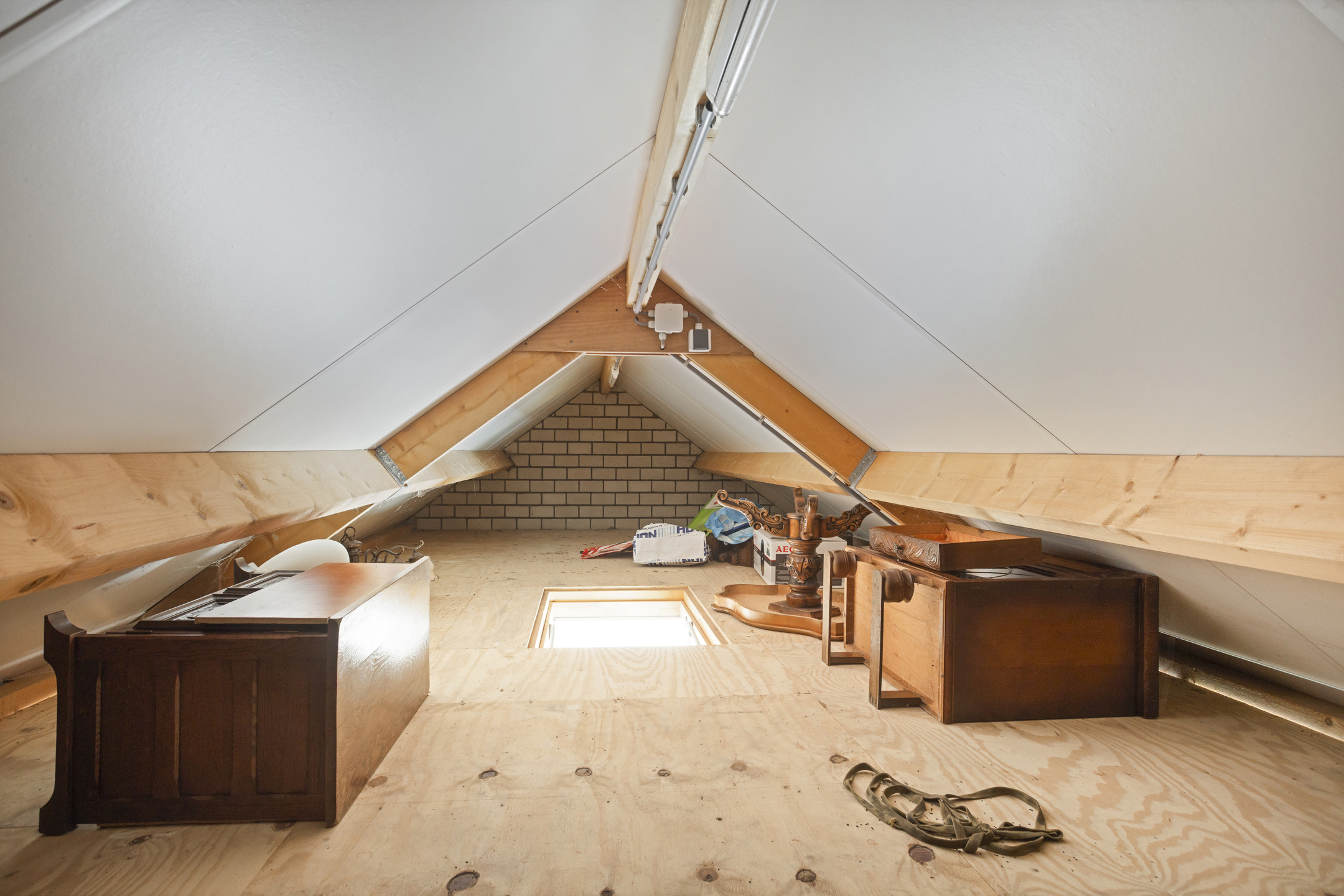 De zolder is bereikbaar via een luik op de overloop en heeft een nokhoogte ca. 2,10 m. De ruimte is niet afgewerkt en de balkenconstructie is zichtbaar.