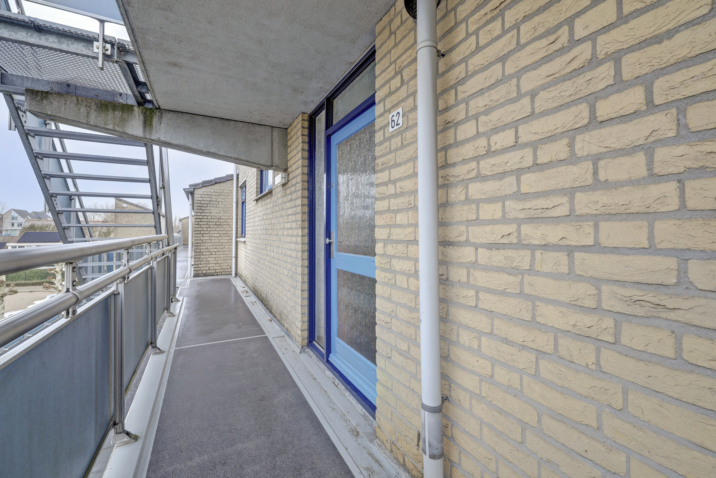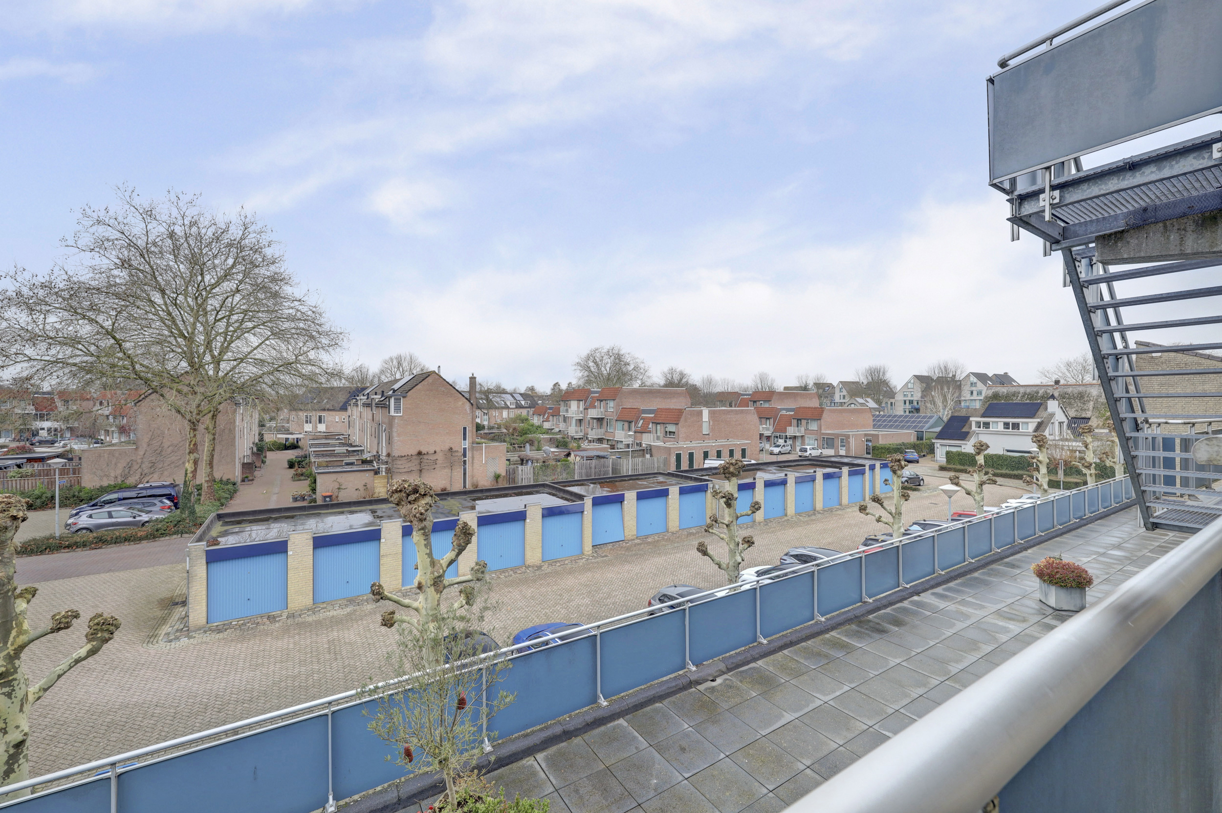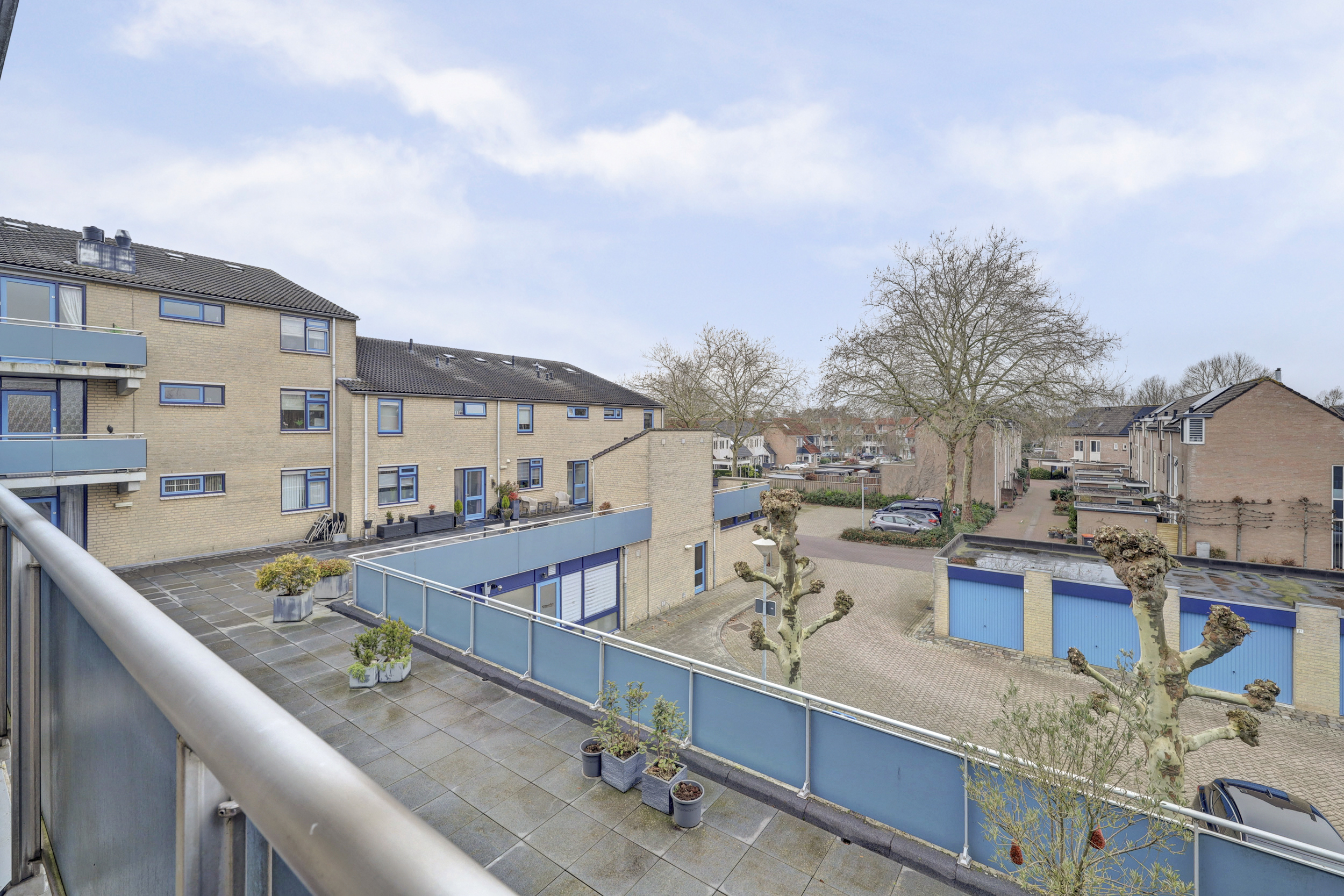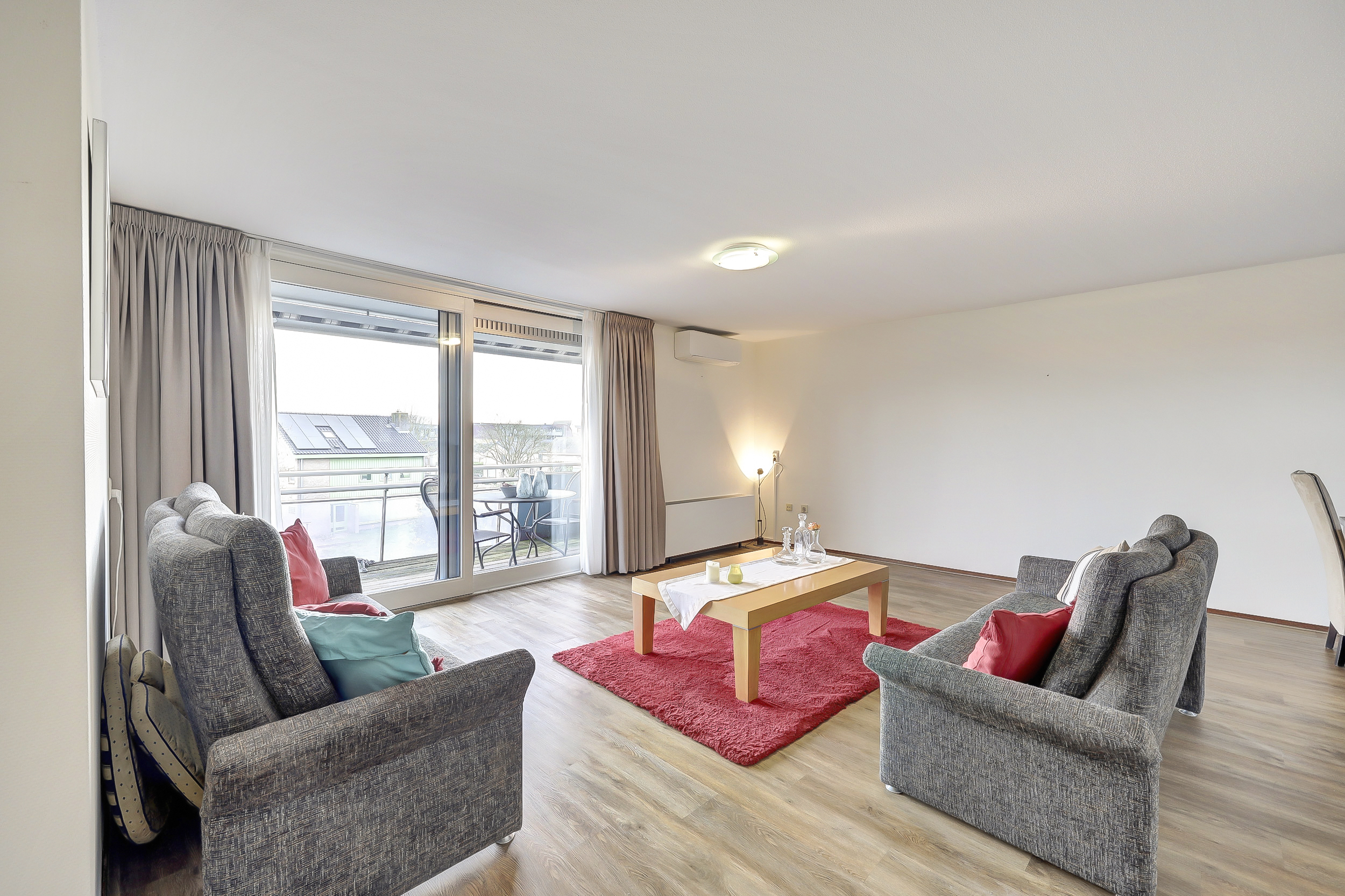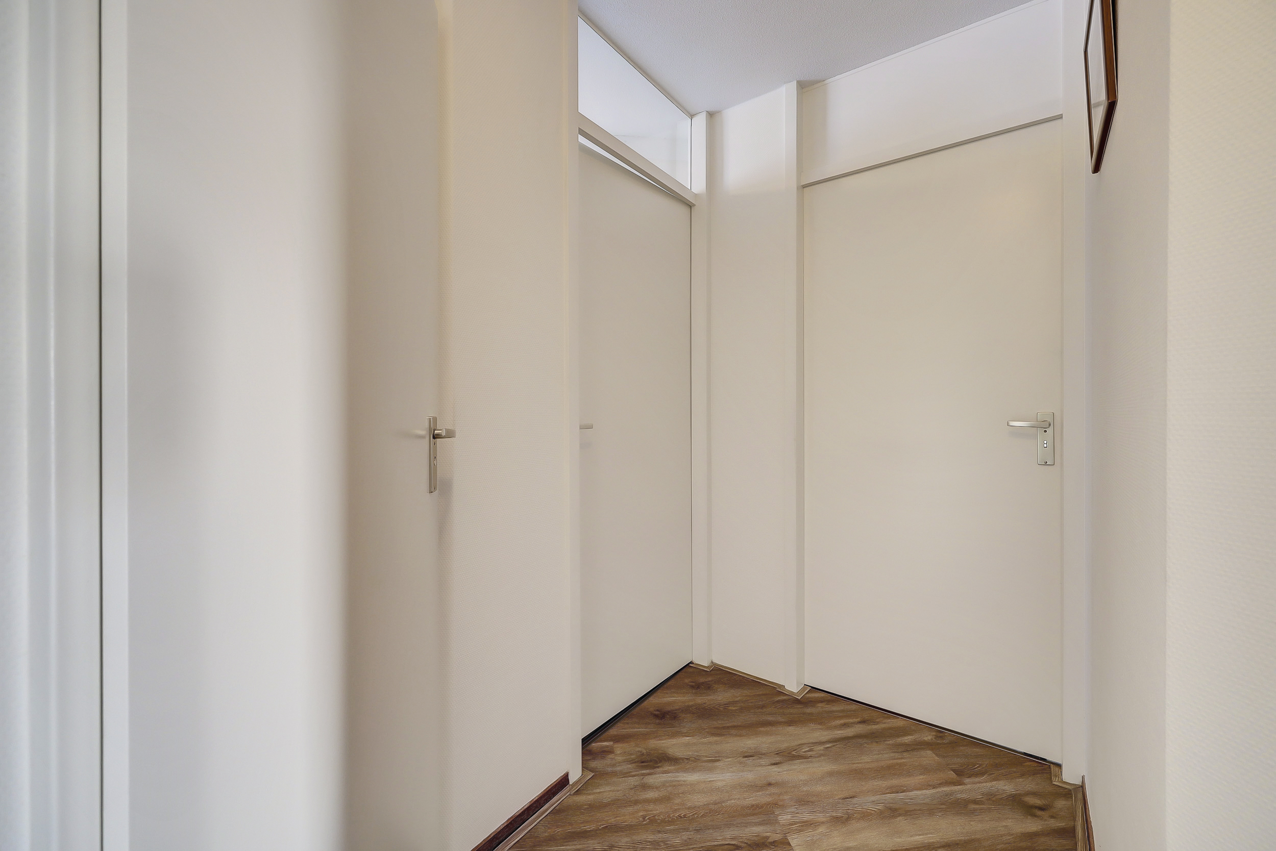 Je komt binnen in een ruime hal met meterkast en garderobe. Aansluitend een praktische provisieruimte met de cv-opstelling (Intergas HRE, 2023, eigendom). De woonkamer is licht en ruim en staat in directe verbinding met het balkon via een grote schuifpui. Het balkon ligt op het oosten, is over de volle breedte van het appartement uitgevoerd en voorzien van twee zonneschermen: een fijne plek om al vroeg van de zon te genieten.
