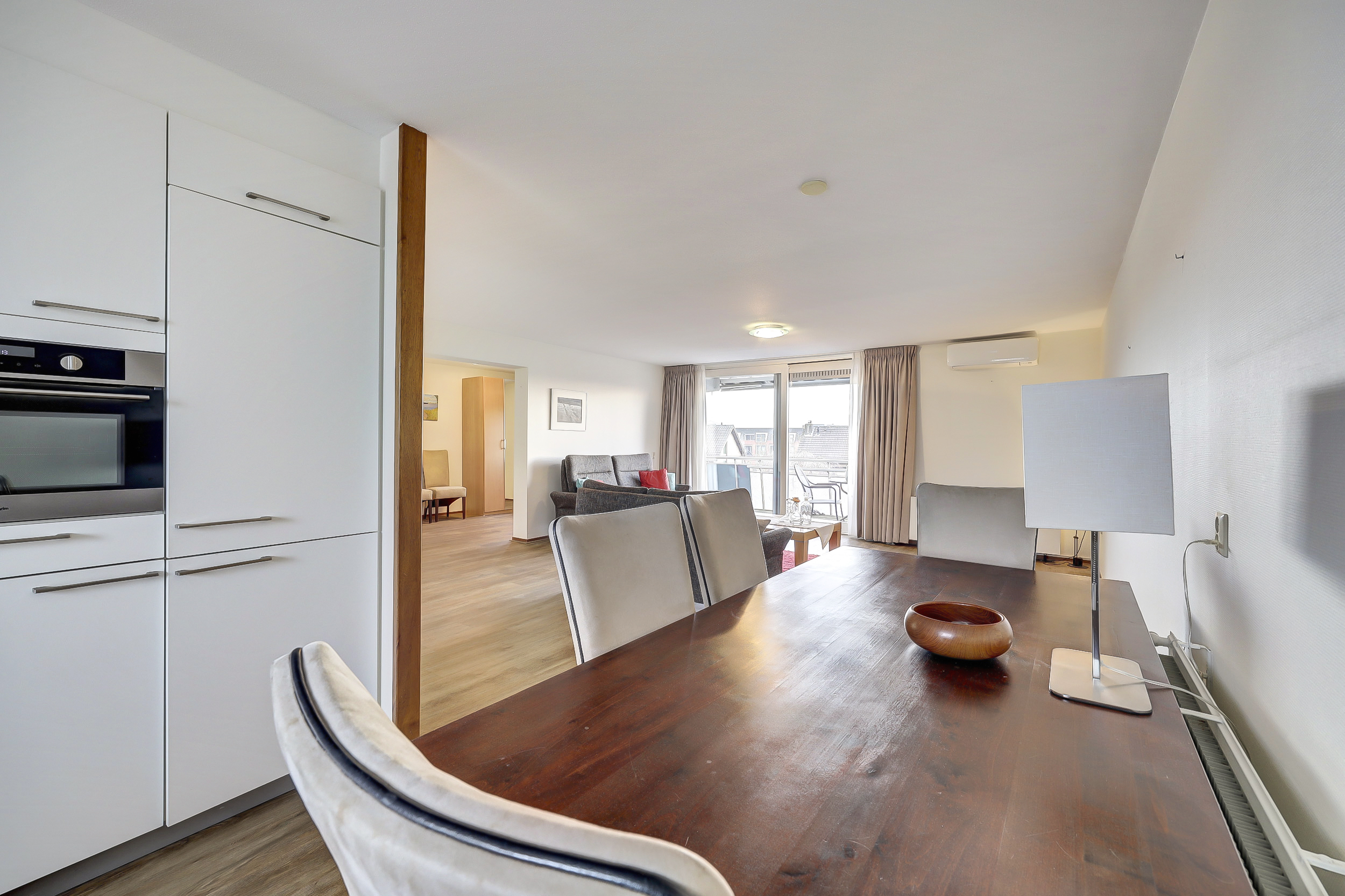 De open, moderne keuken (2015) bevindt zich aan de voorzijde van het appartement en is compleet uitgerust met een 4-pits gaskookplaat, afzuigkap, combimagnetron, koelkast, vriezer, vaatwasser en voldoende kastruimte. Direct grenzend aan de woonkamer is een aparte eetkamer gesitueerd, waardoor wonen en eten prettig van elkaar zijn gescheiden.