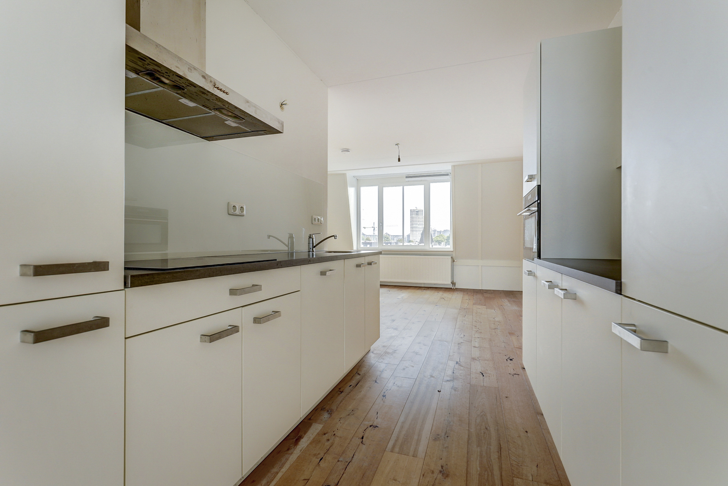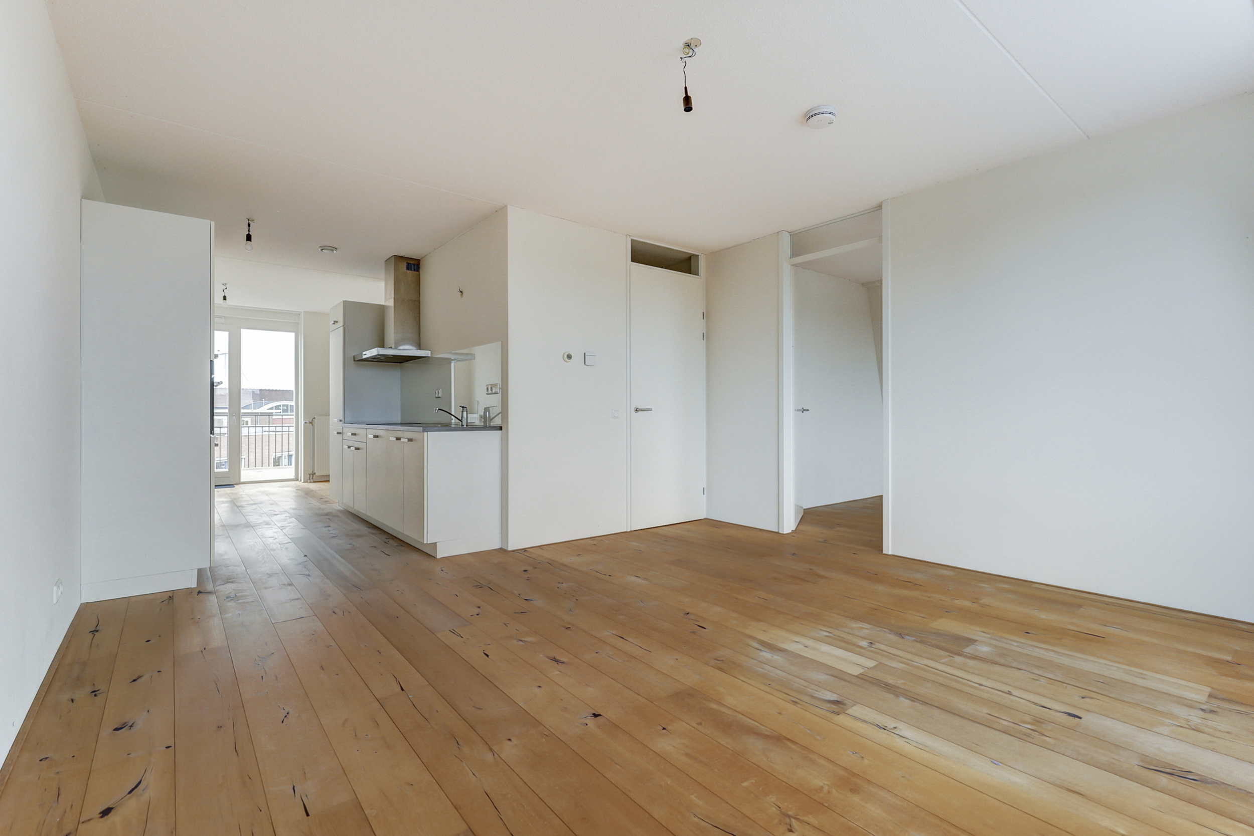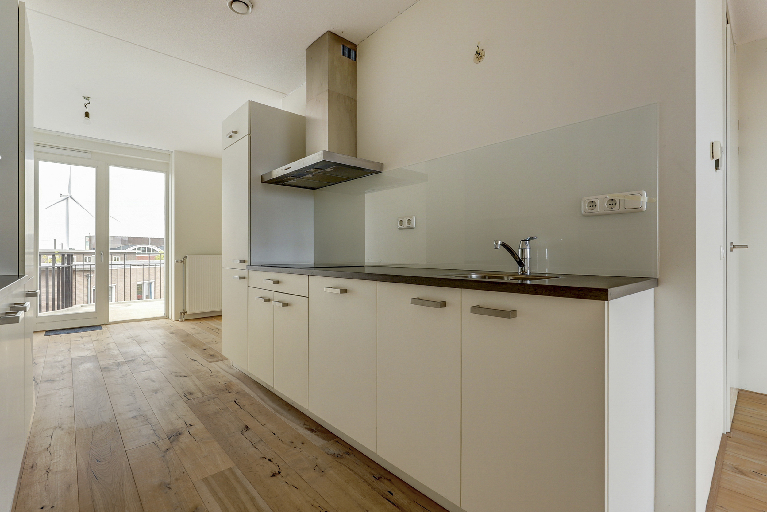 De indeling is verrassend praktisch: de woonkamer ligt aan de achterzijde, de eetkamer aan de voorzijde en daartussen bevindt zich de complete keuken. De woonkamer heeft een groot raam, strakke wanden en een lamelparketvloer. De eetkamer beschikt over een royale pui met draaikiepdeur naar het balkon. Dit balkon van ca. 11 m² heeft een elektrapunt en biedt een weids uitzicht over de wijk – een fijne plek om te genieten.