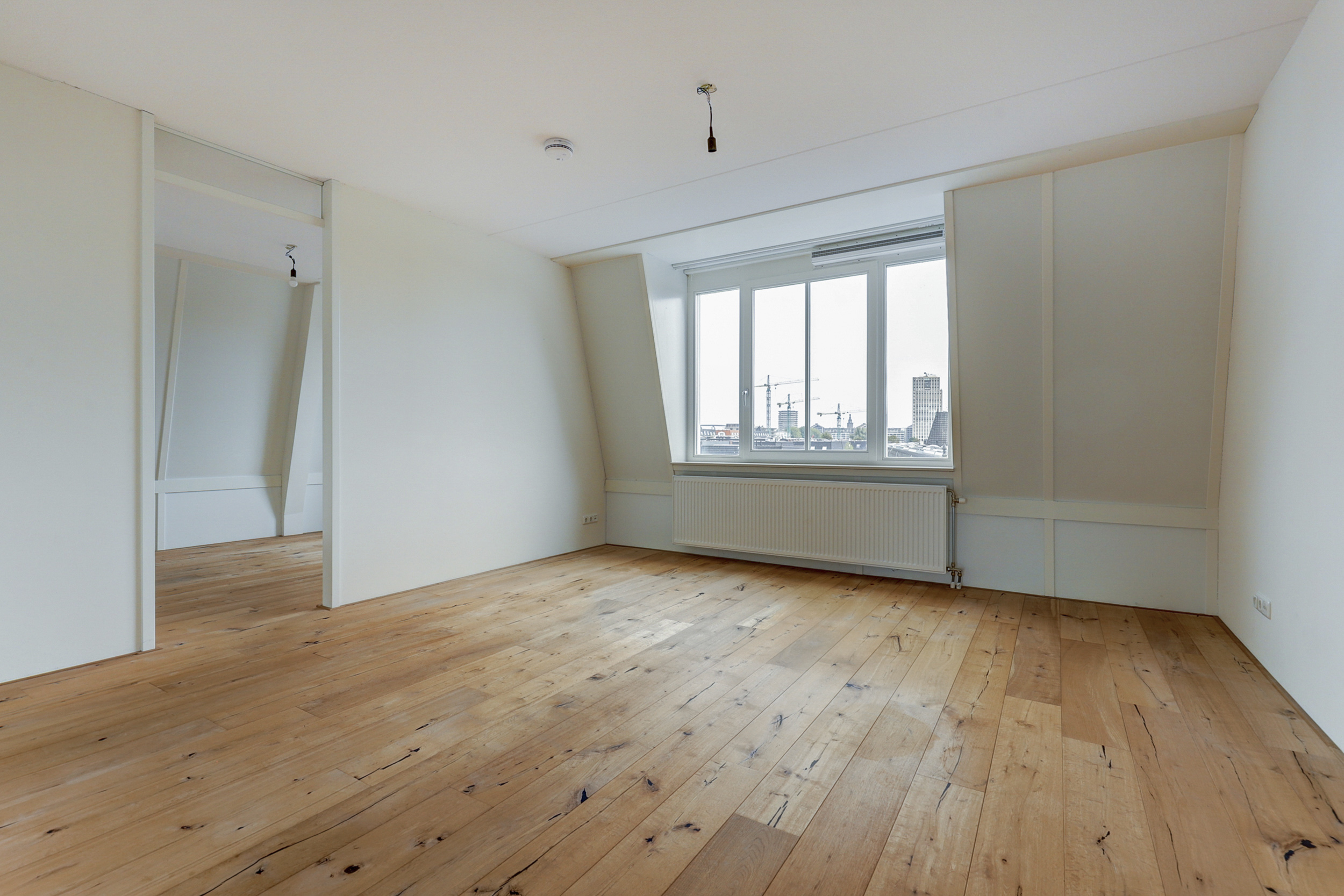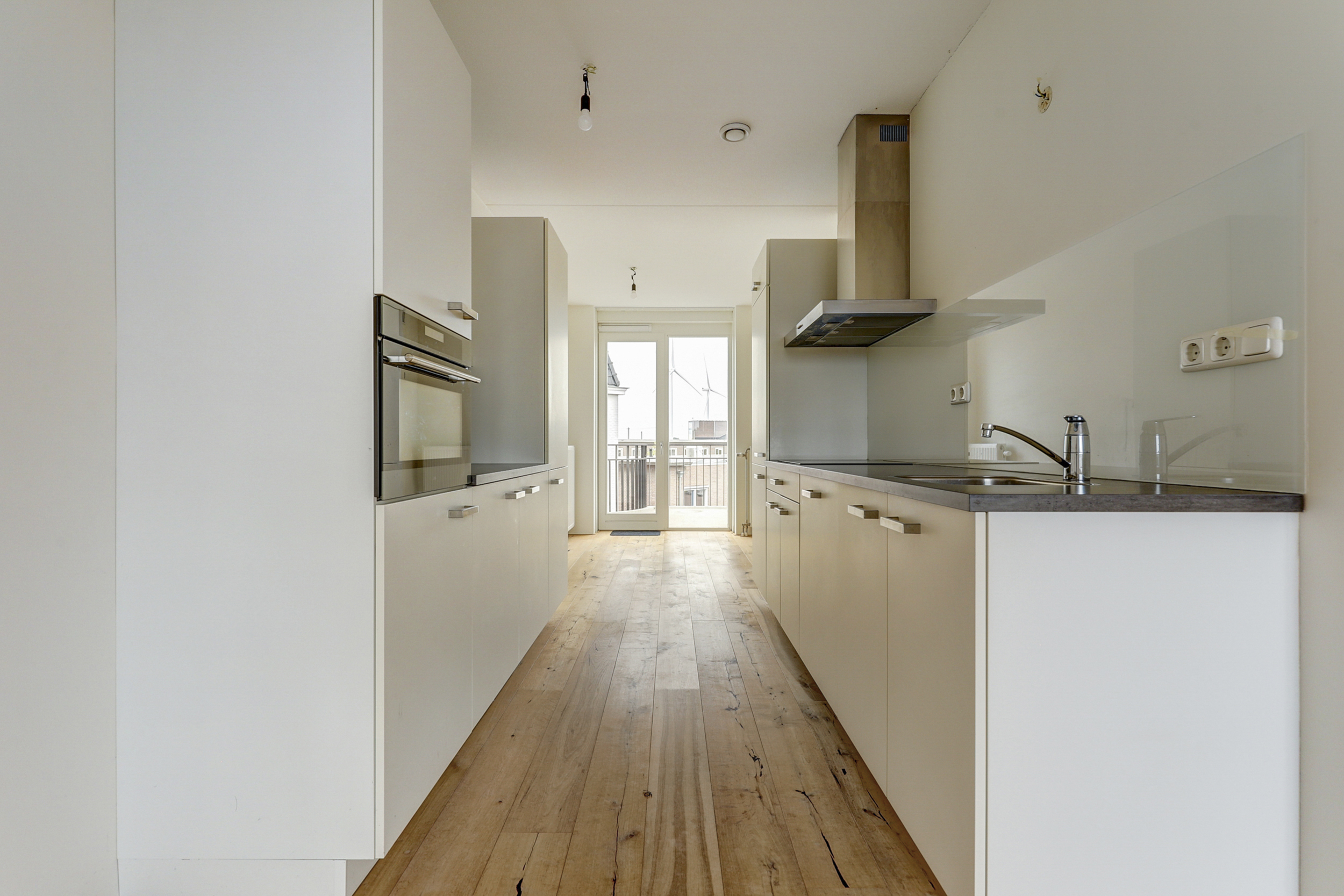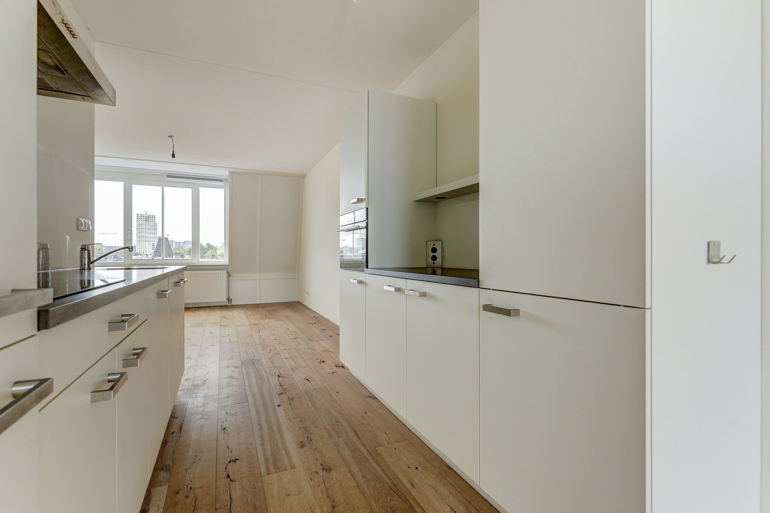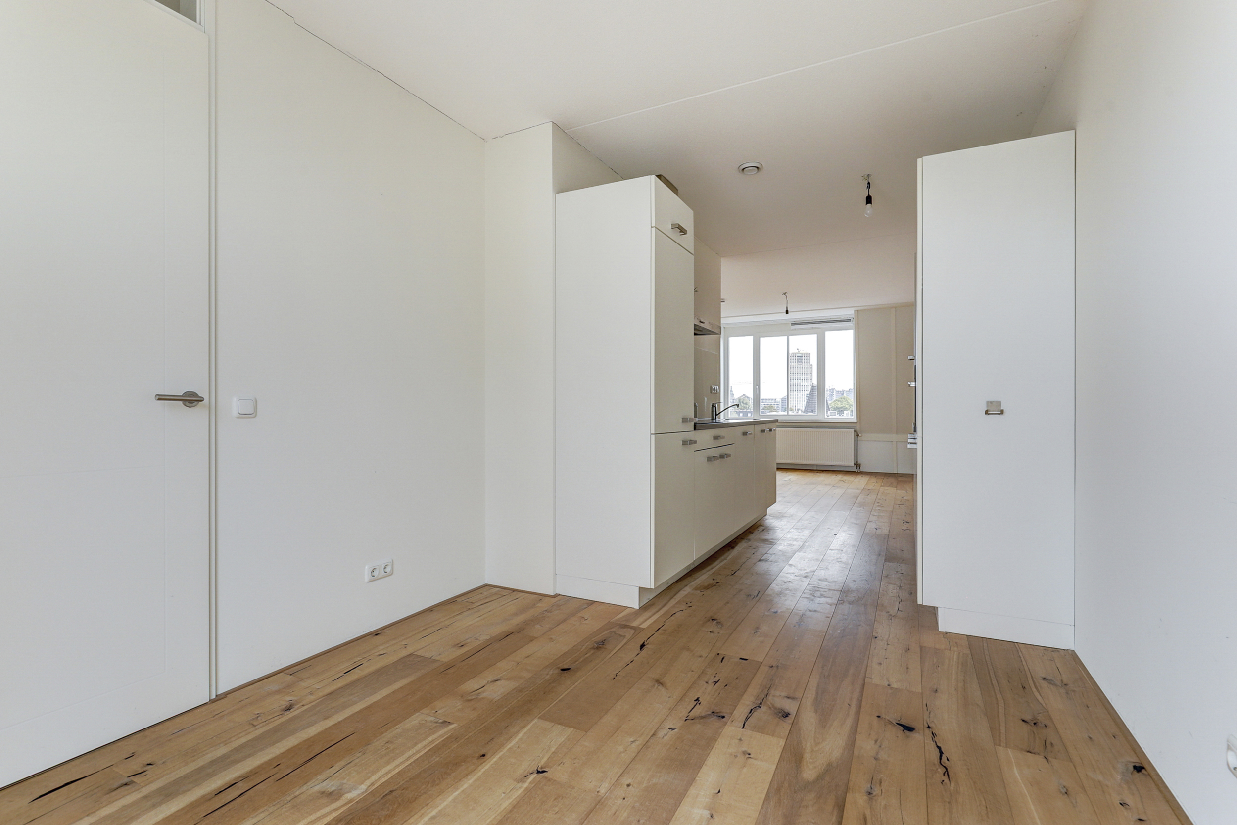 De indeling is verrassend praktisch: de woonkamer ligt aan de achterzijde, de eetkamer aan de voorzijde en daartussen bevindt zich de complete keuken. De woonkamer heeft een groot raam, strakke wanden en een lamelparketvloer. De eetkamer beschikt over een royale pui met draaikiepdeur naar het balkon. Dit balkon van ca. 11 m² heeft een elektrapunt en biedt een weids uitzicht over de wijk – een fijne plek om te genieten.