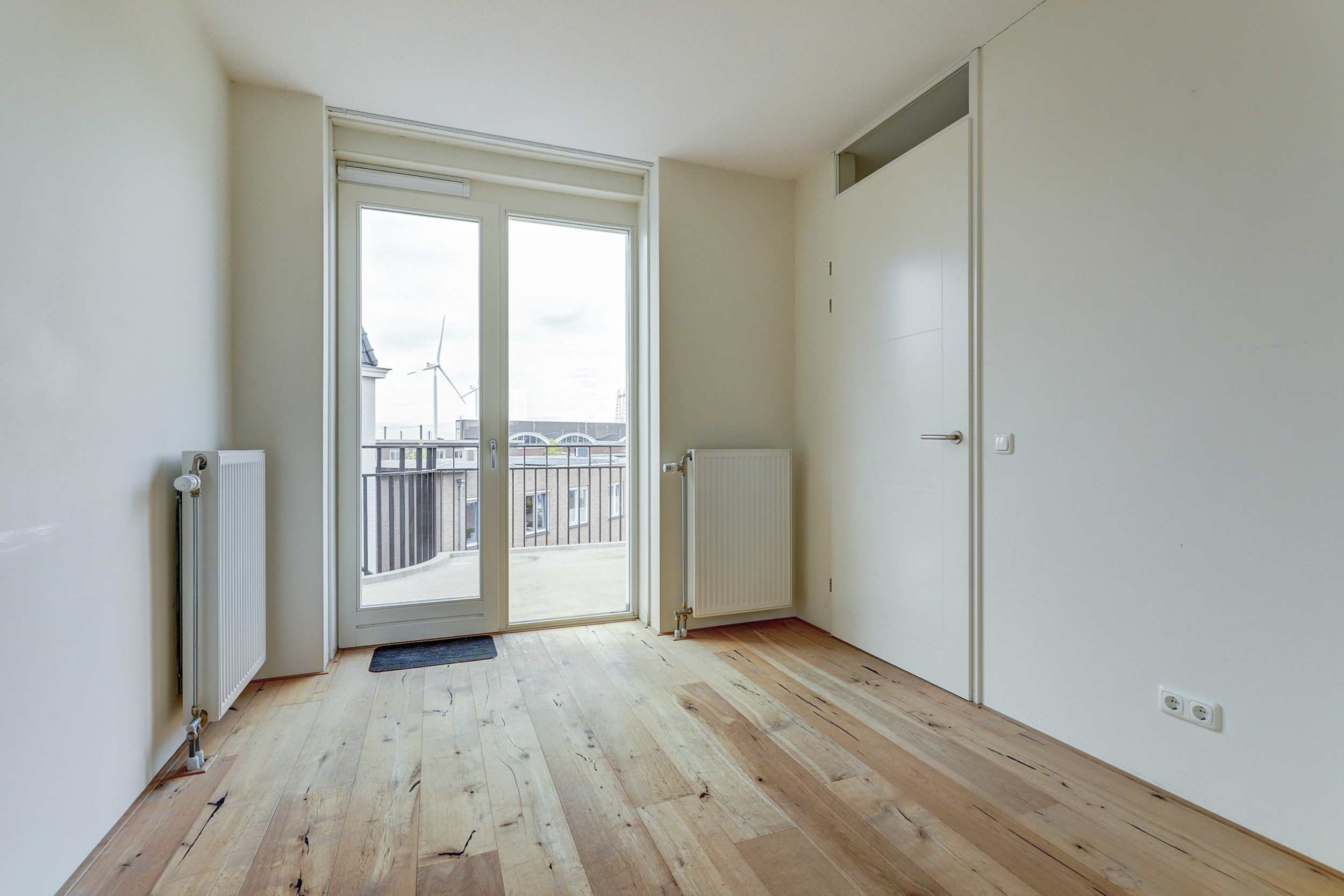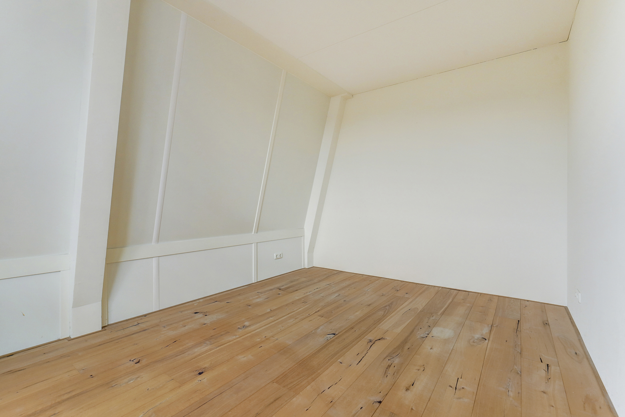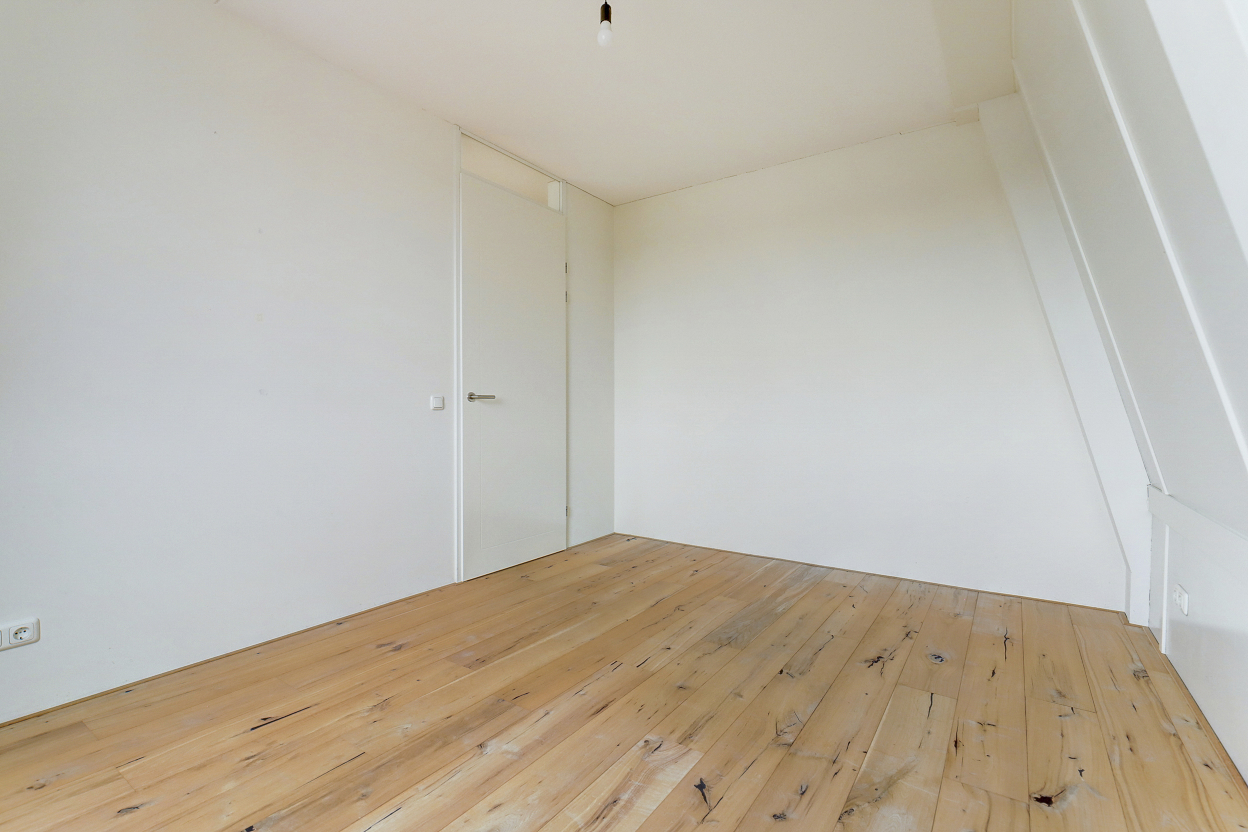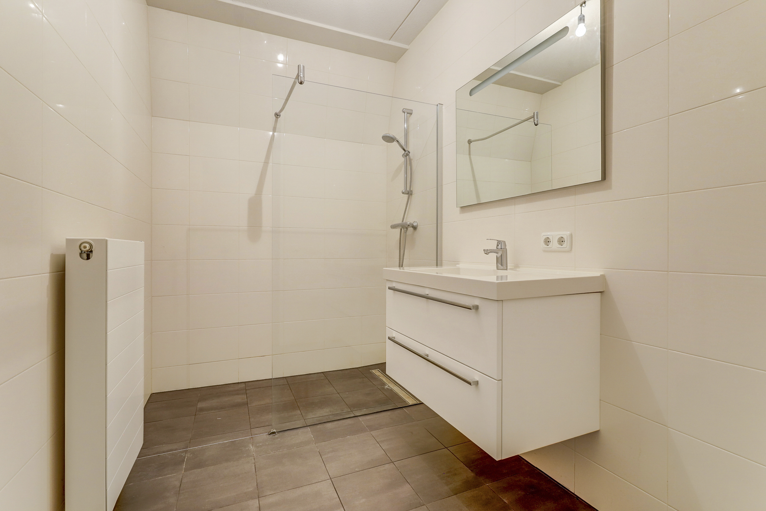 Beide slaapkamers zijn ruim van formaat en voorzien van een groot raam, strakke wanden en dezelfde lamelparketvloer. De badkamer is modern afgewerkt met een inloopdouche, wastafelmeubel, grote spiegel en verwarming, en is geheel betegeld in een lichte kleurstelling.