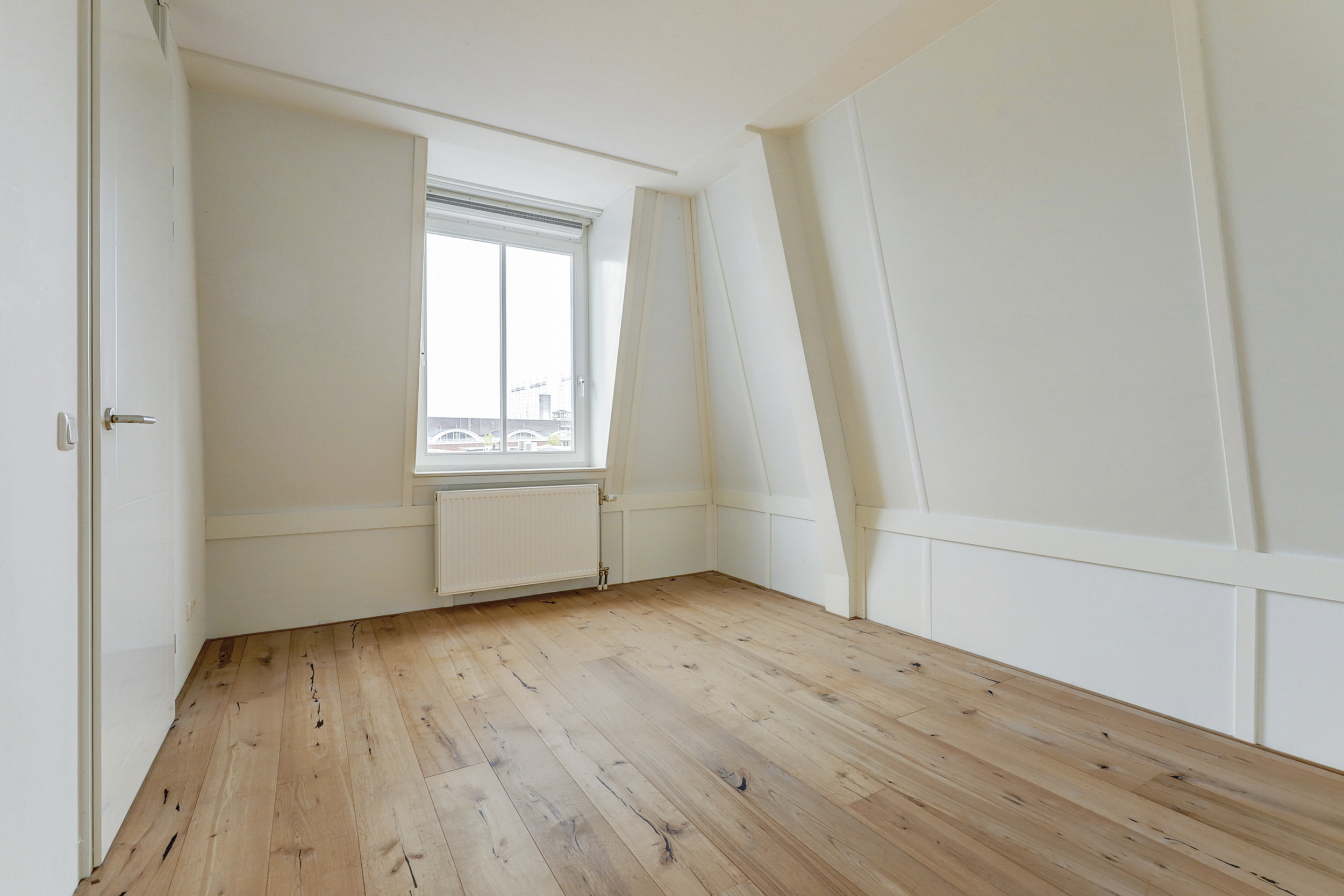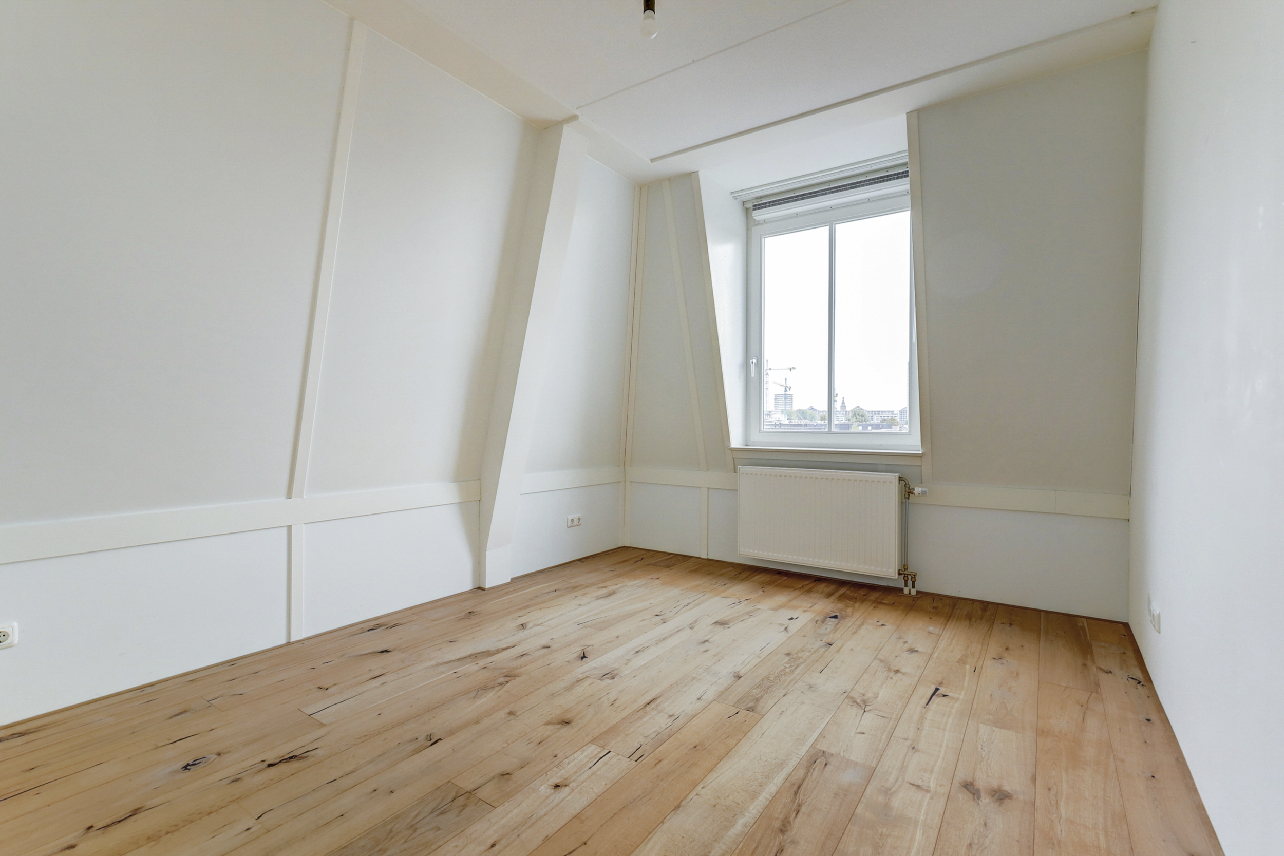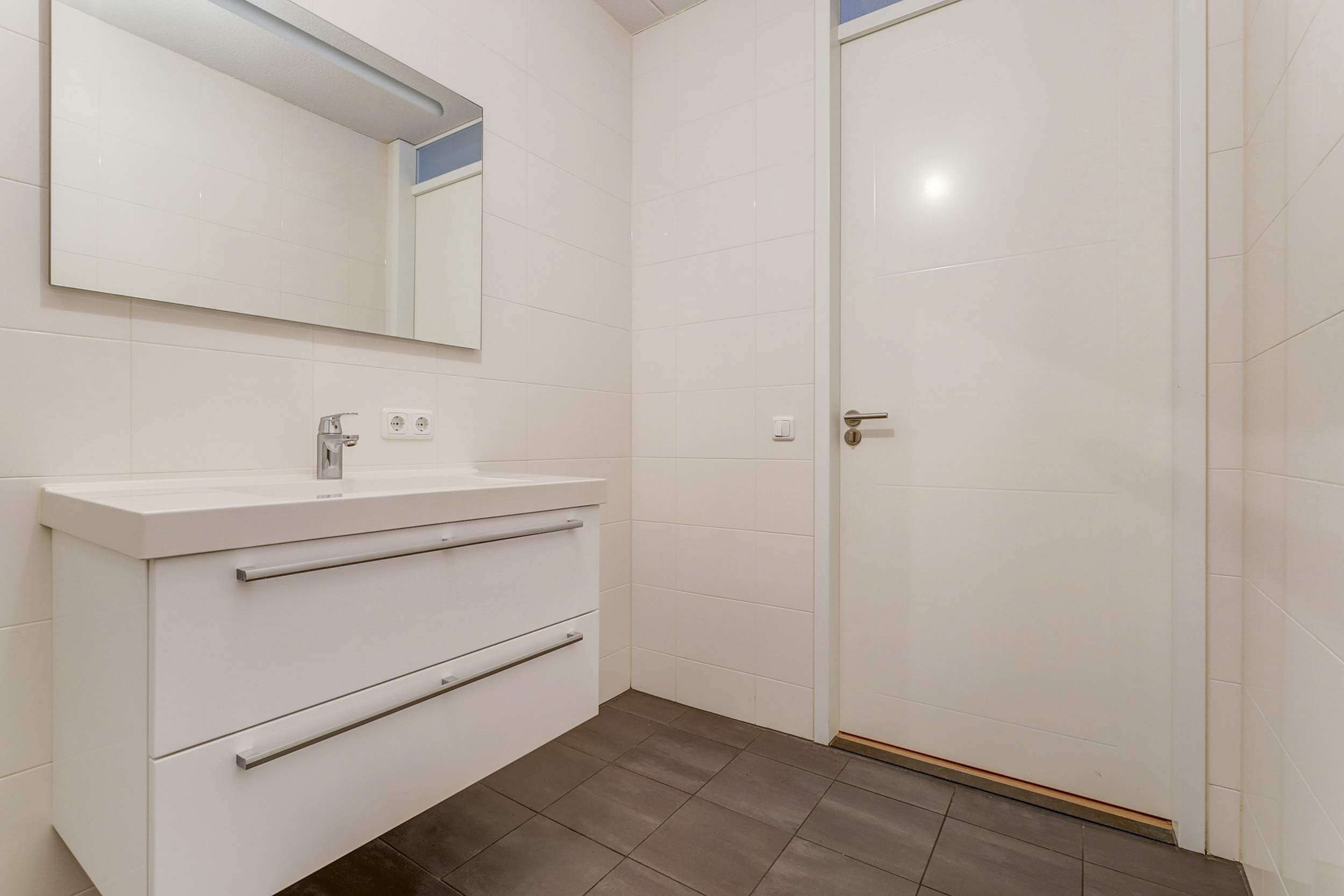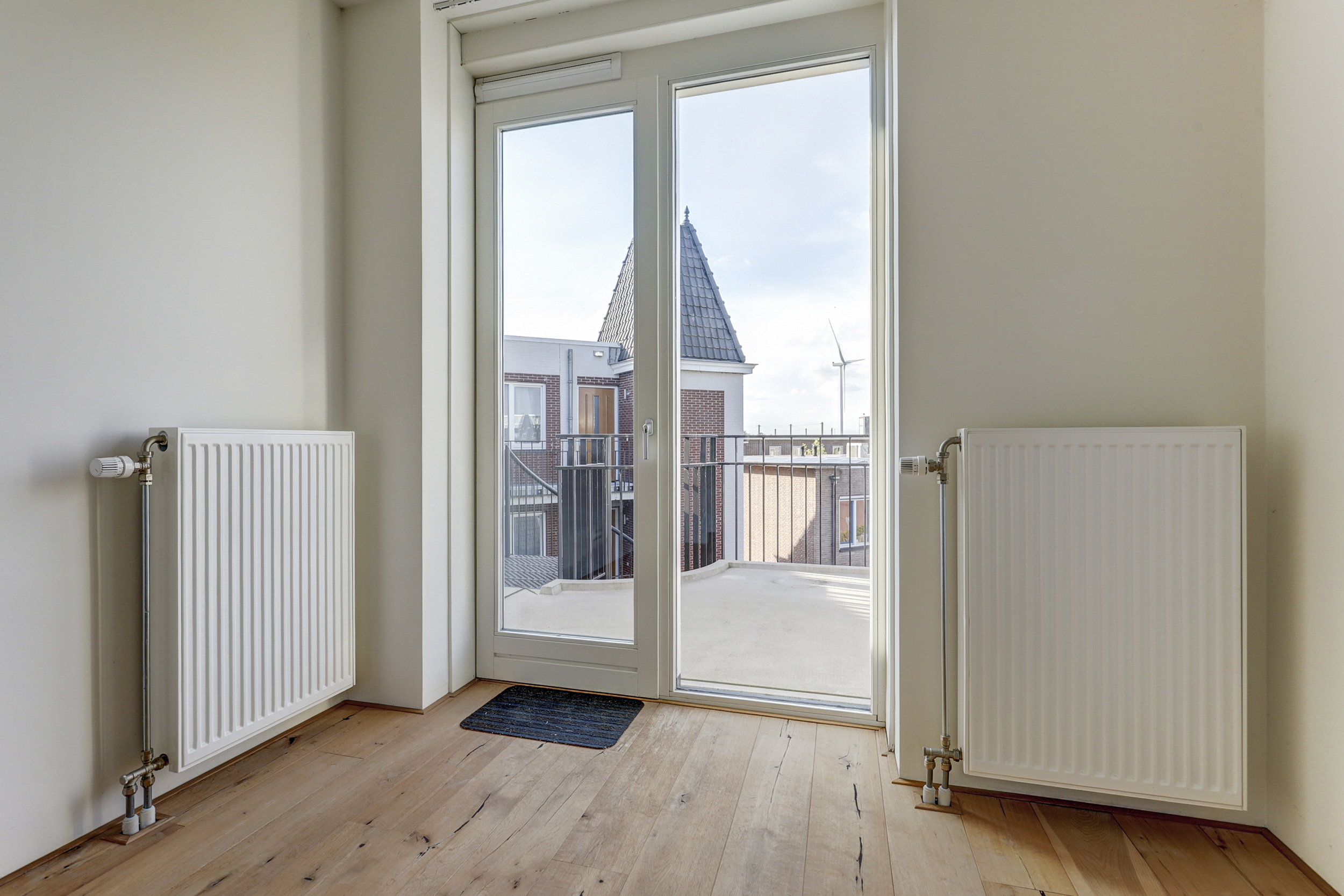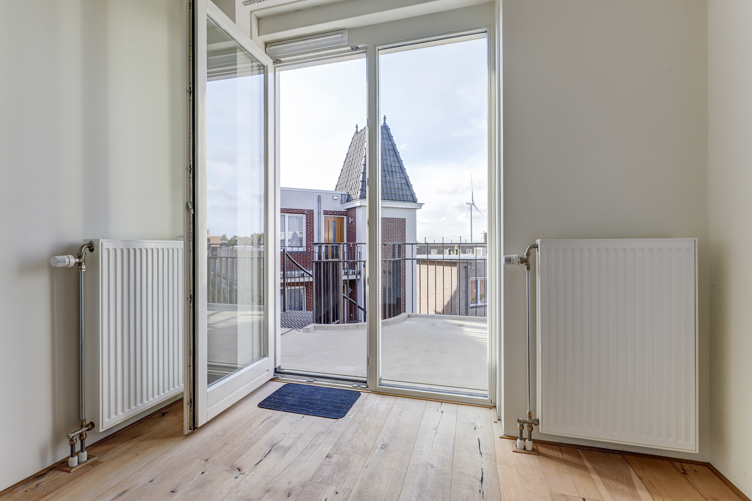 Beide slaapkamers zijn ruim van formaat en voorzien van een groot raam, strakke wanden en dezelfde lamelparketvloer. De badkamer is modern afgewerkt met een inloopdouche, wastafelmeubel, grote spiegel en verwarming, en is geheel betegeld in een lichte kleurstelling.