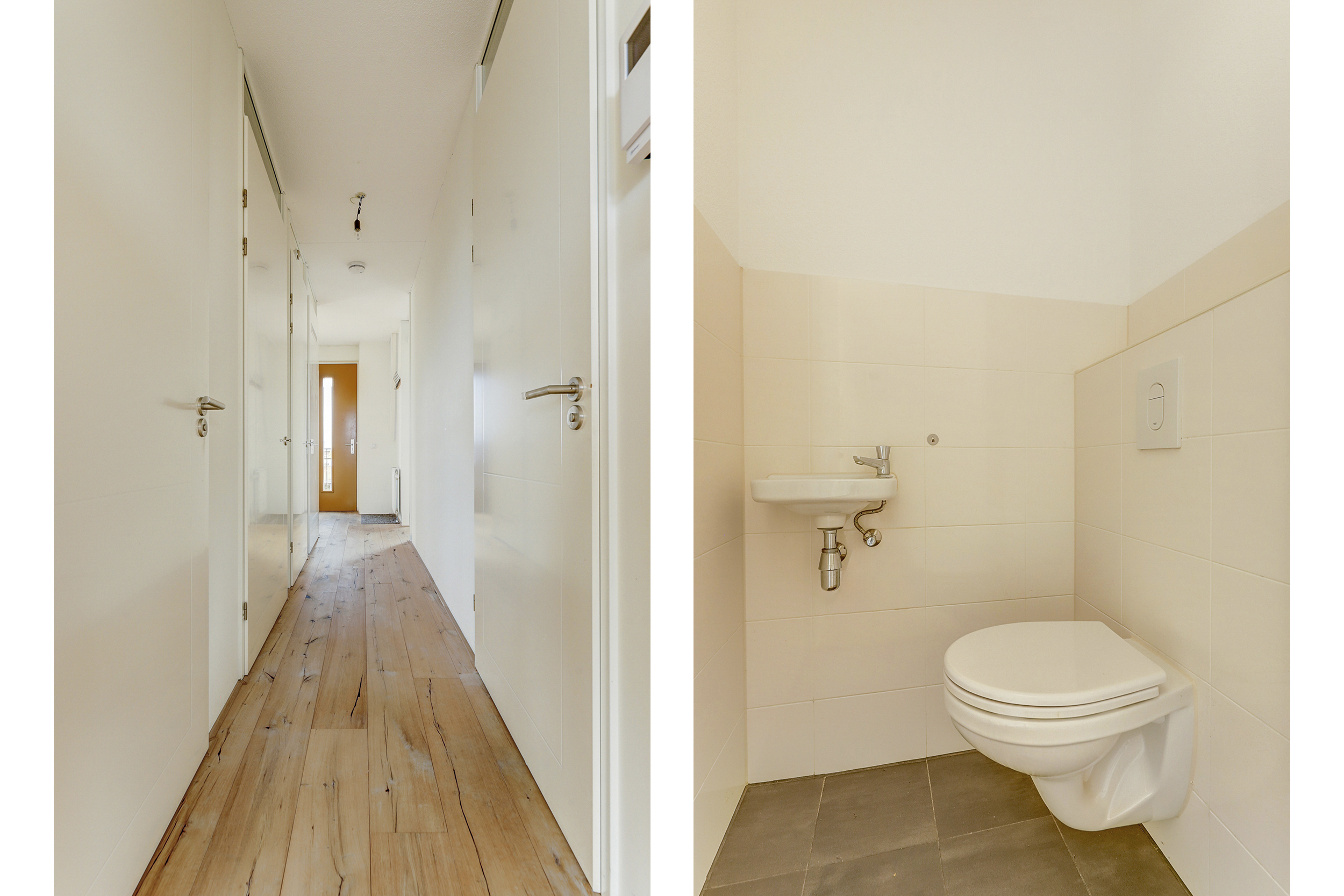 Je komt binnen in de hal, die toegang geeft tot de lichte woonkamer, de eetkamer, één van de twee slaapkamers en de badkamer. In de hal bevinden zich een vaste kast voor de stadsverwarming, de meterkast met glasvezelaansluiting, een praktisch betegelde ruimte voor wasmachine, droger en mechanische ventilatie box, en een toiletruimte met wandcloset en fontein in lichte kleurstelling.