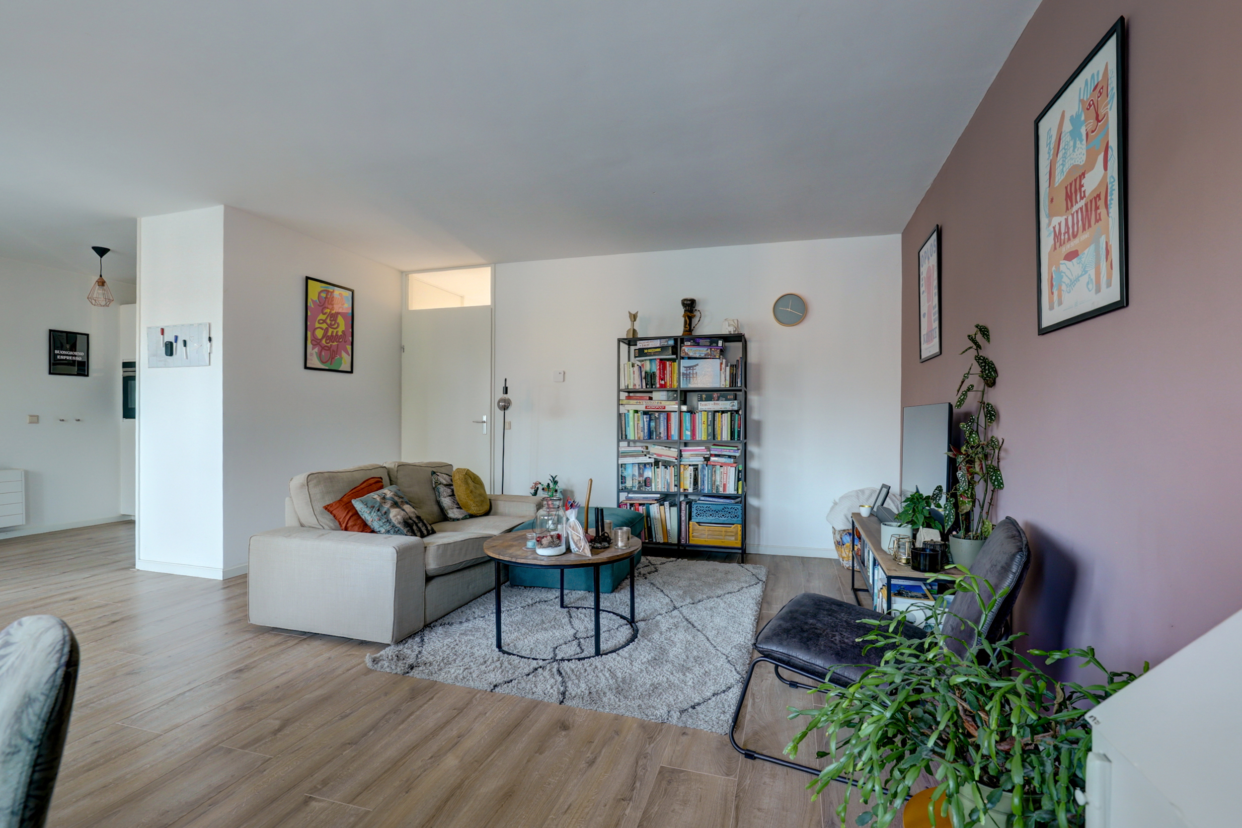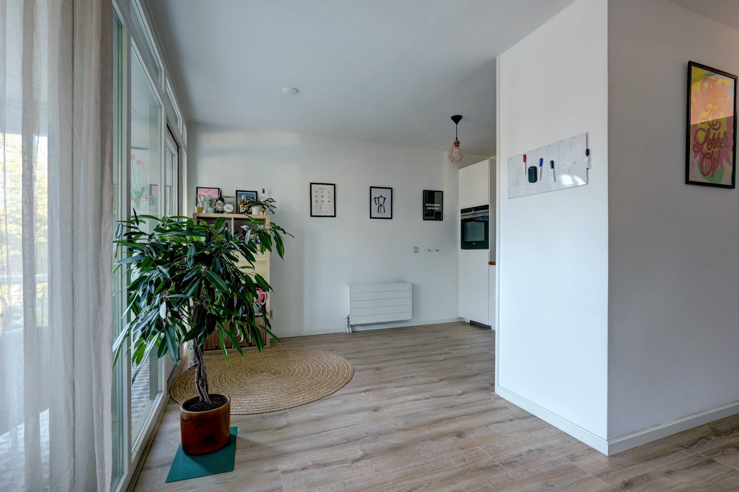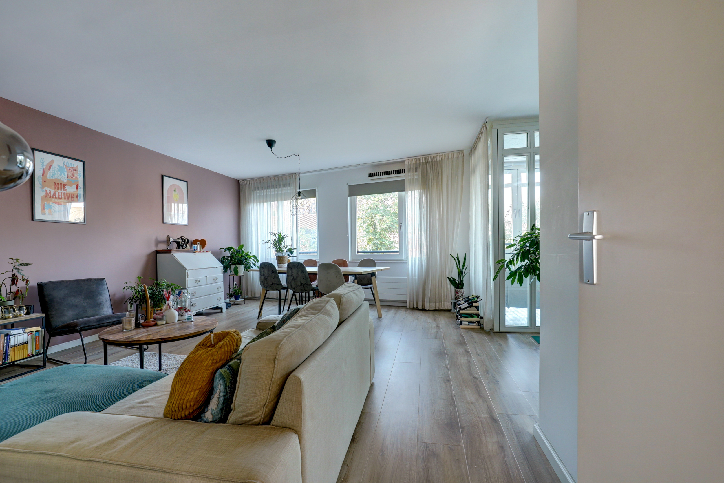 De ruime woonkamer (ca. 50 m²) is een fijne, lichte leefruimte met een moderne laminaatvloer (2017) voorzien van hoge plinten en strak stucwerk.