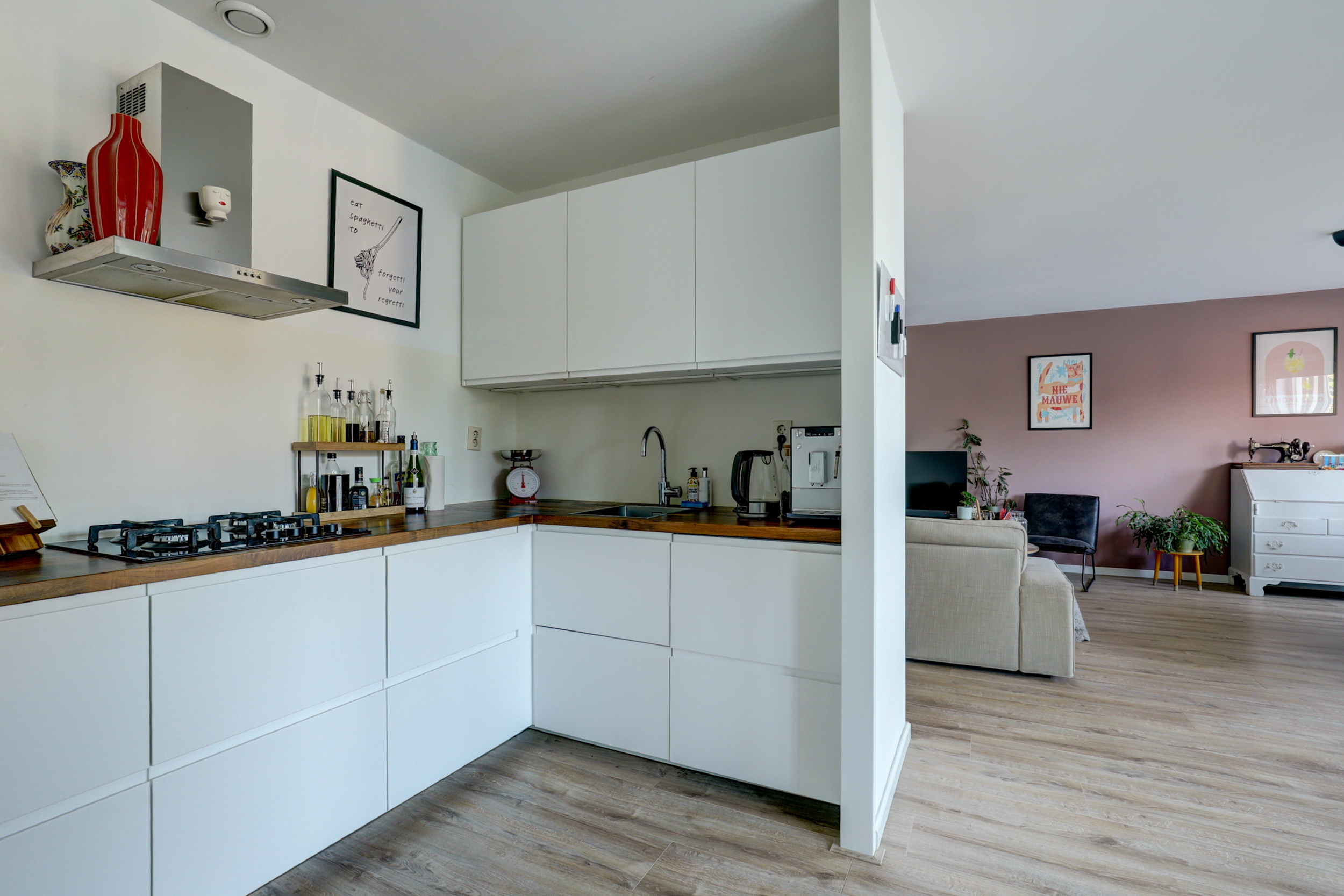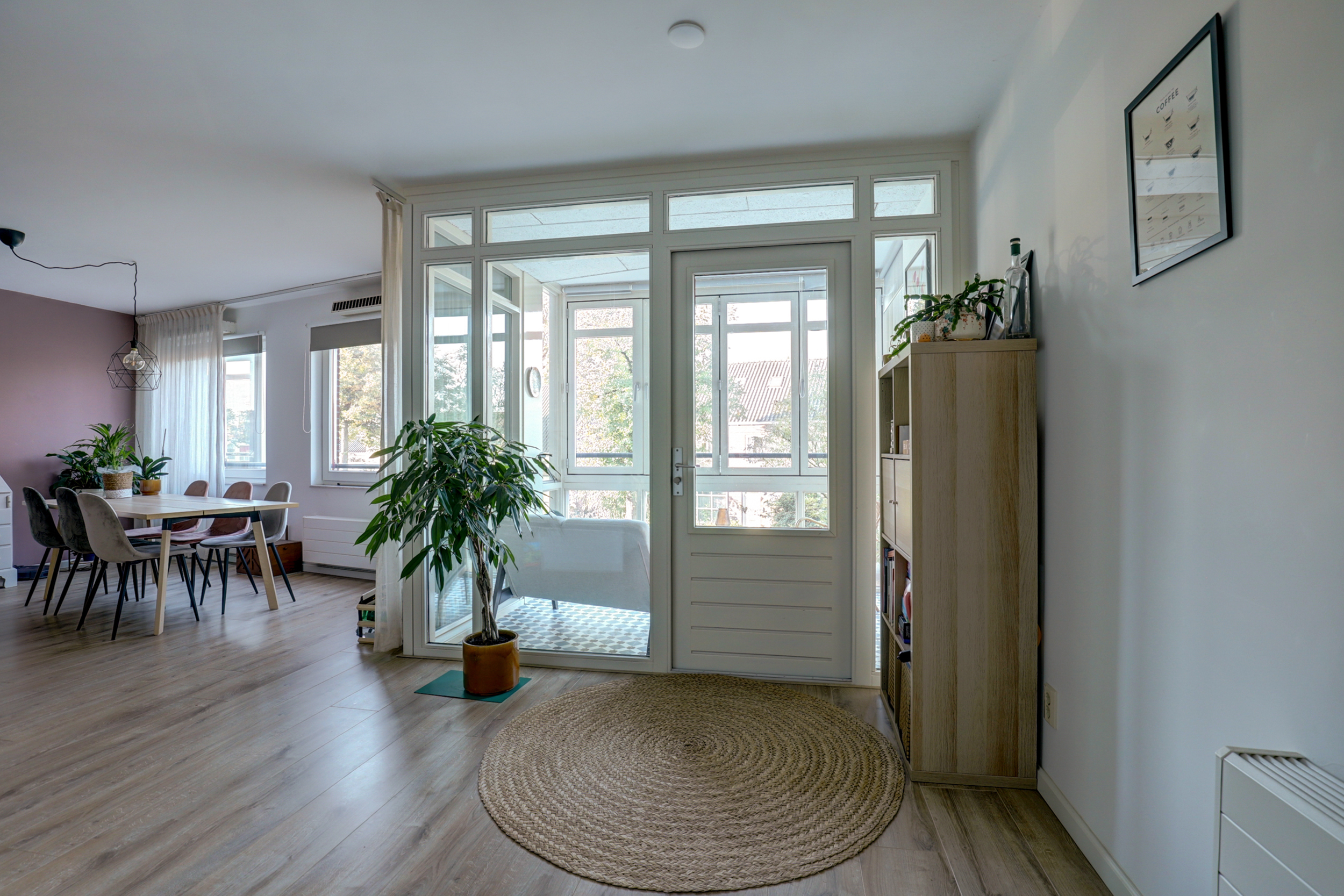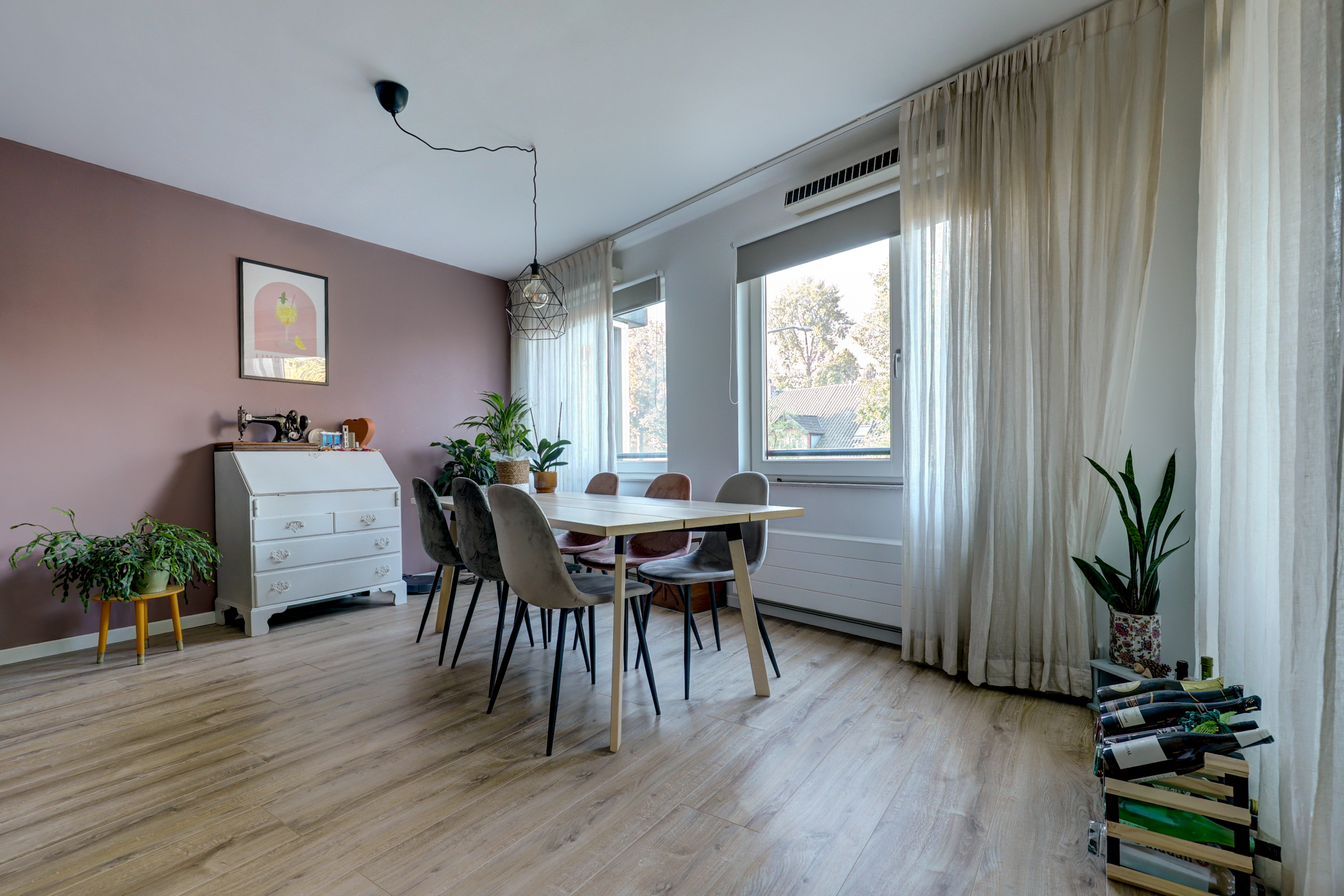 De ruime woonkamer (ca. 50 m²) is een fijne, lichte leefruimte met een moderne laminaatvloer (2017) voorzien van hoge plinten en strak stucwerk.