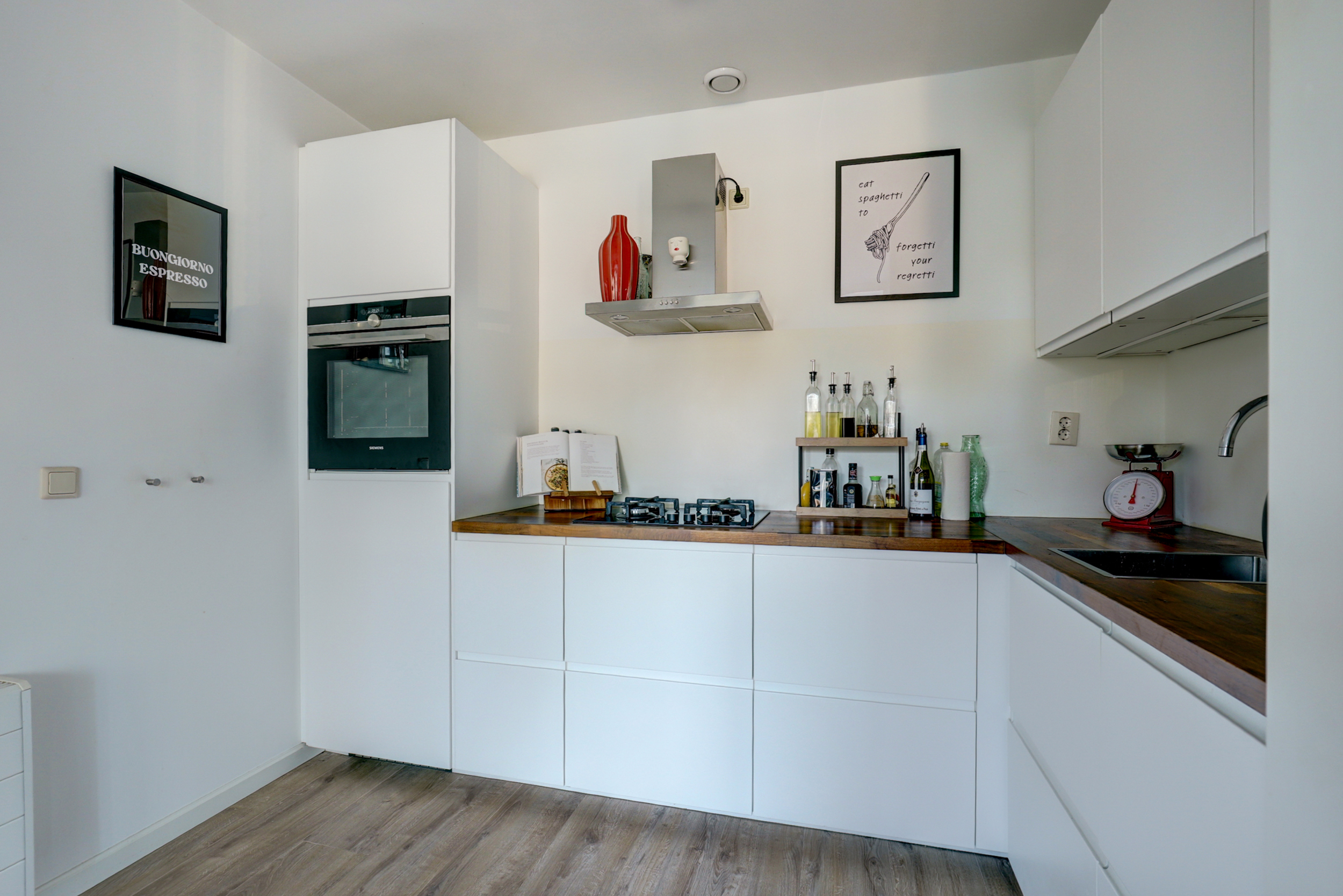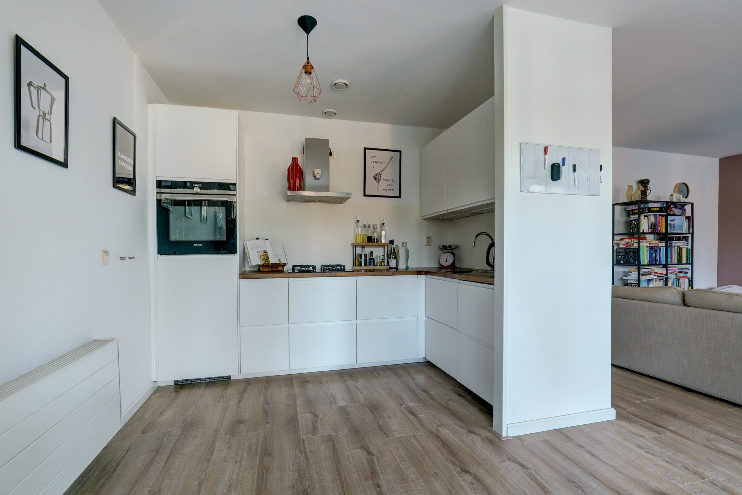 De keuken (vernieuwd in 2017) is uitgevoerd in een lichte kleurstelling en voorzien van hoogwaardige inbouwapparatuur: Siemens oven, Bosch vaatwasser, koelkast en een 4-pits gasfornuis met afzuigkap.