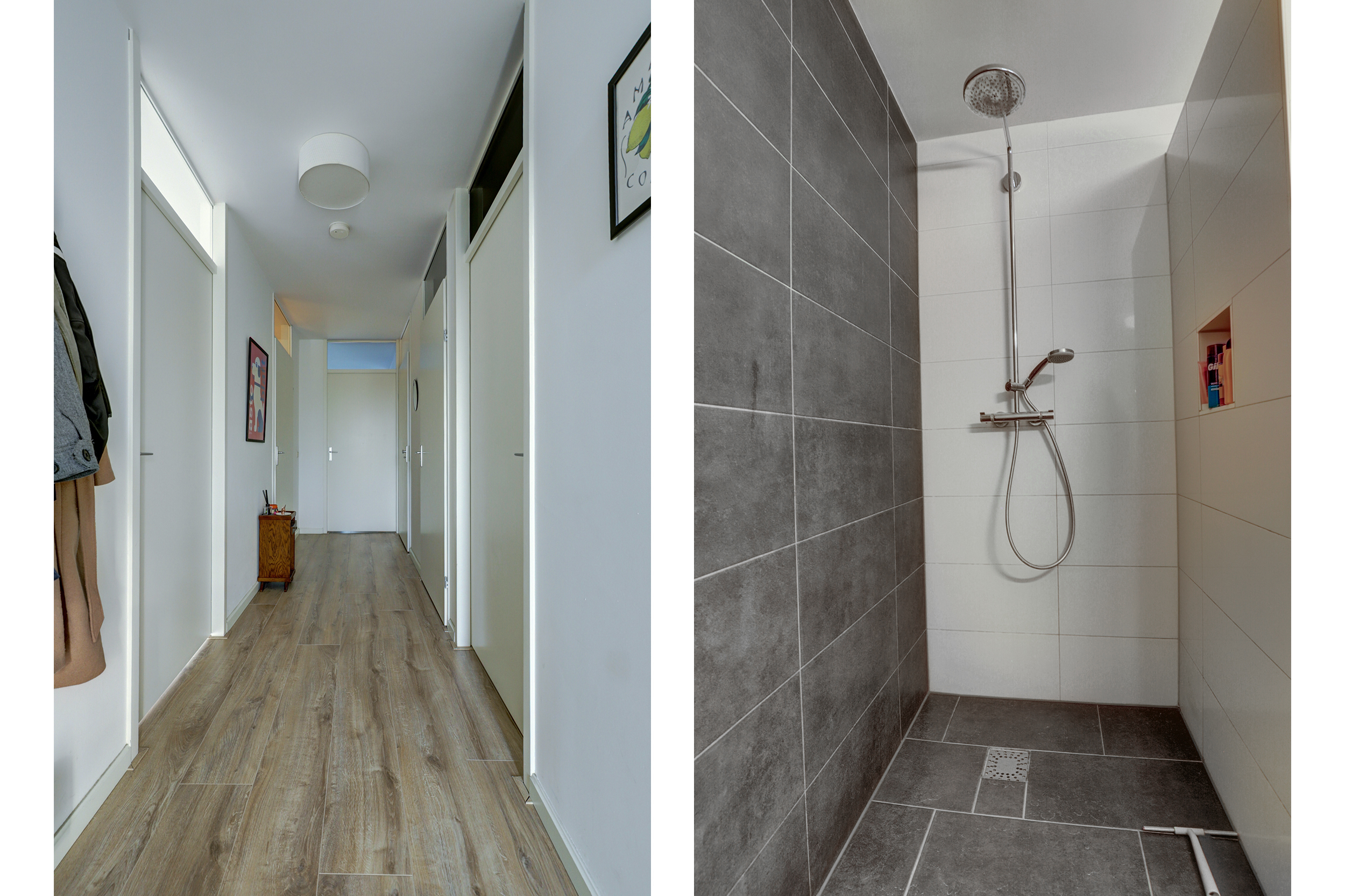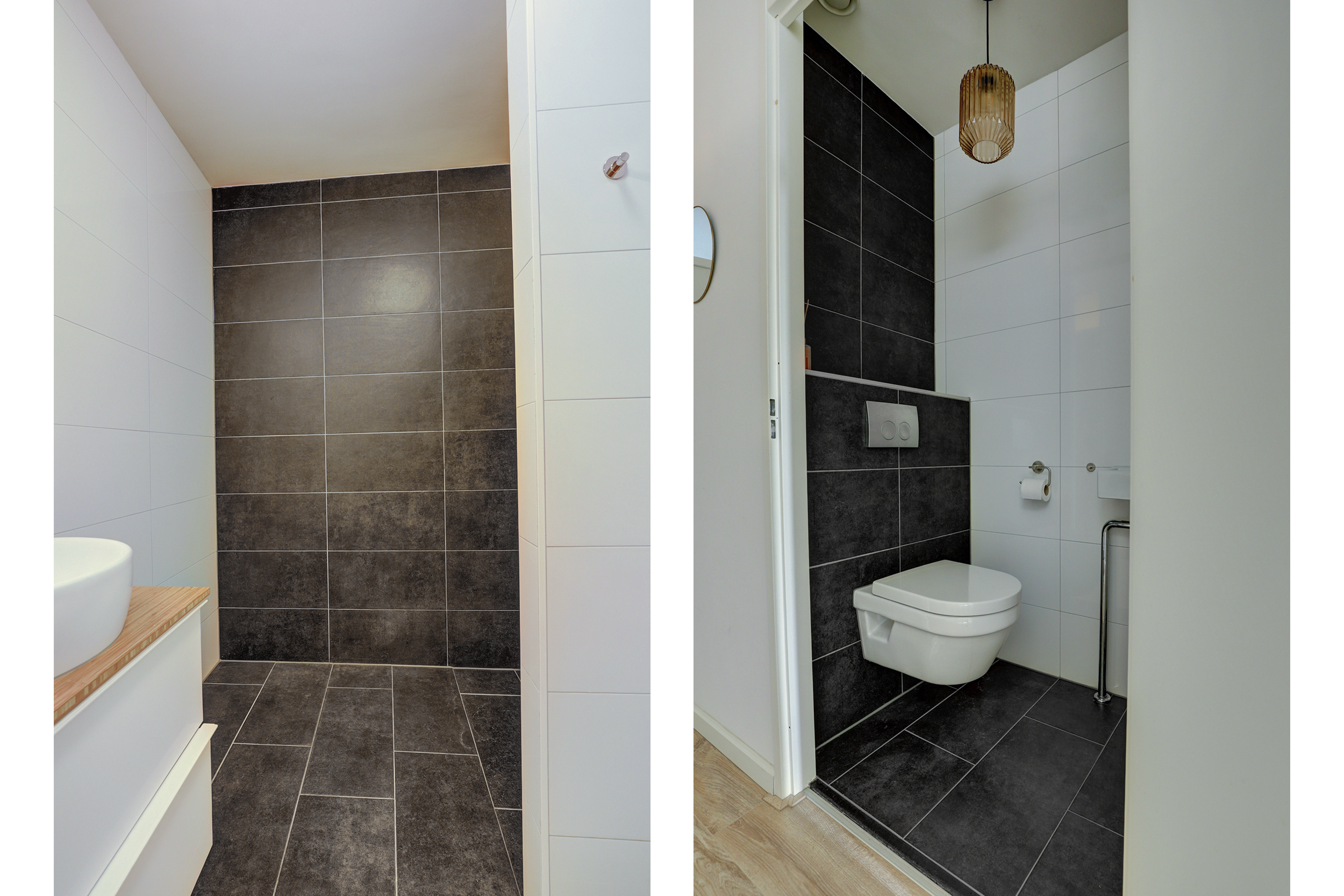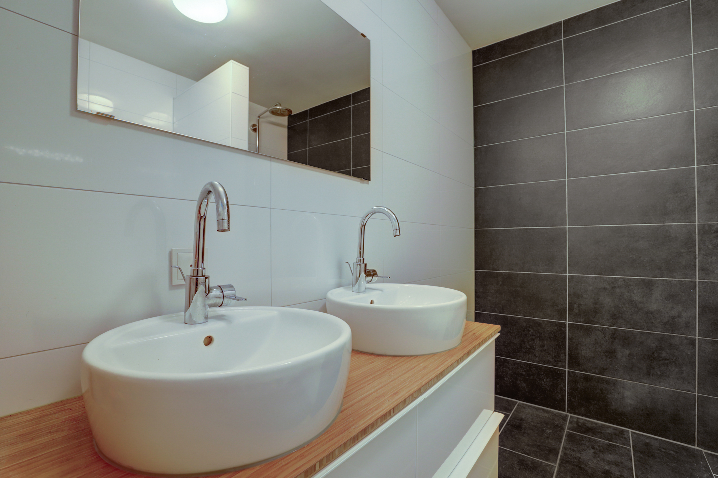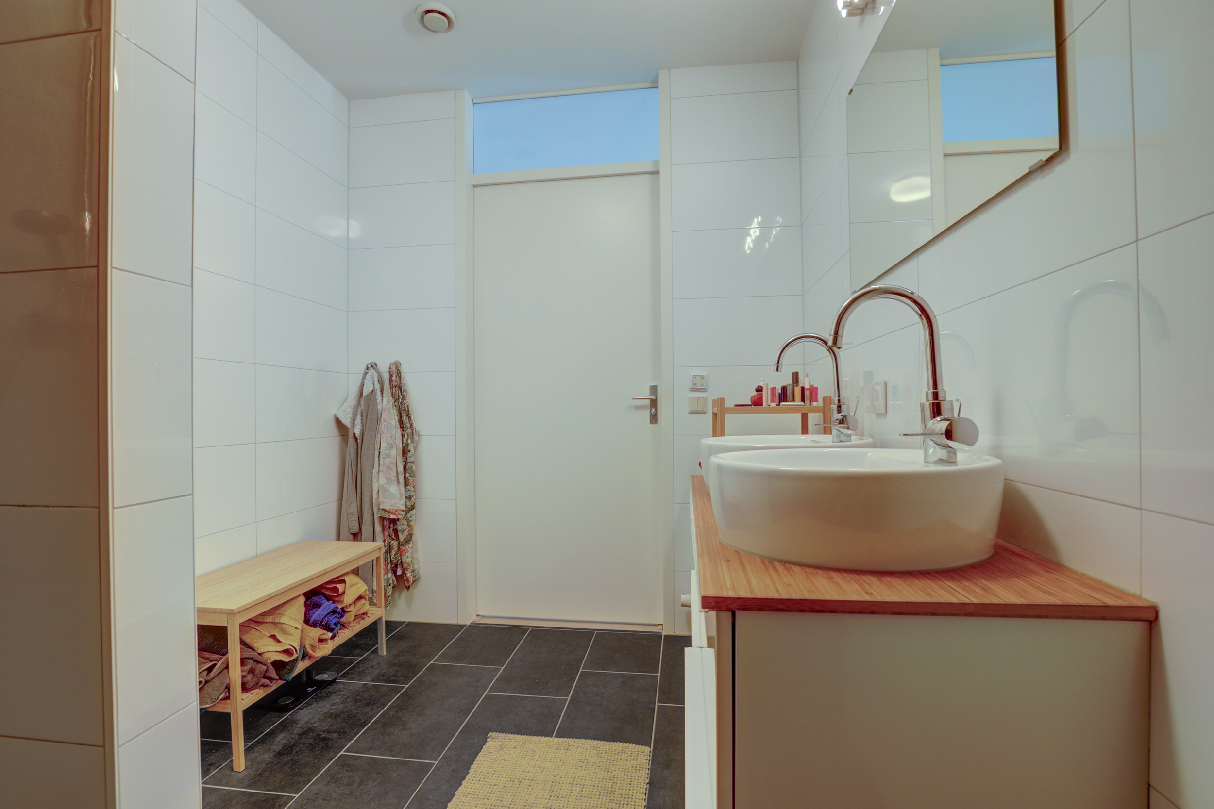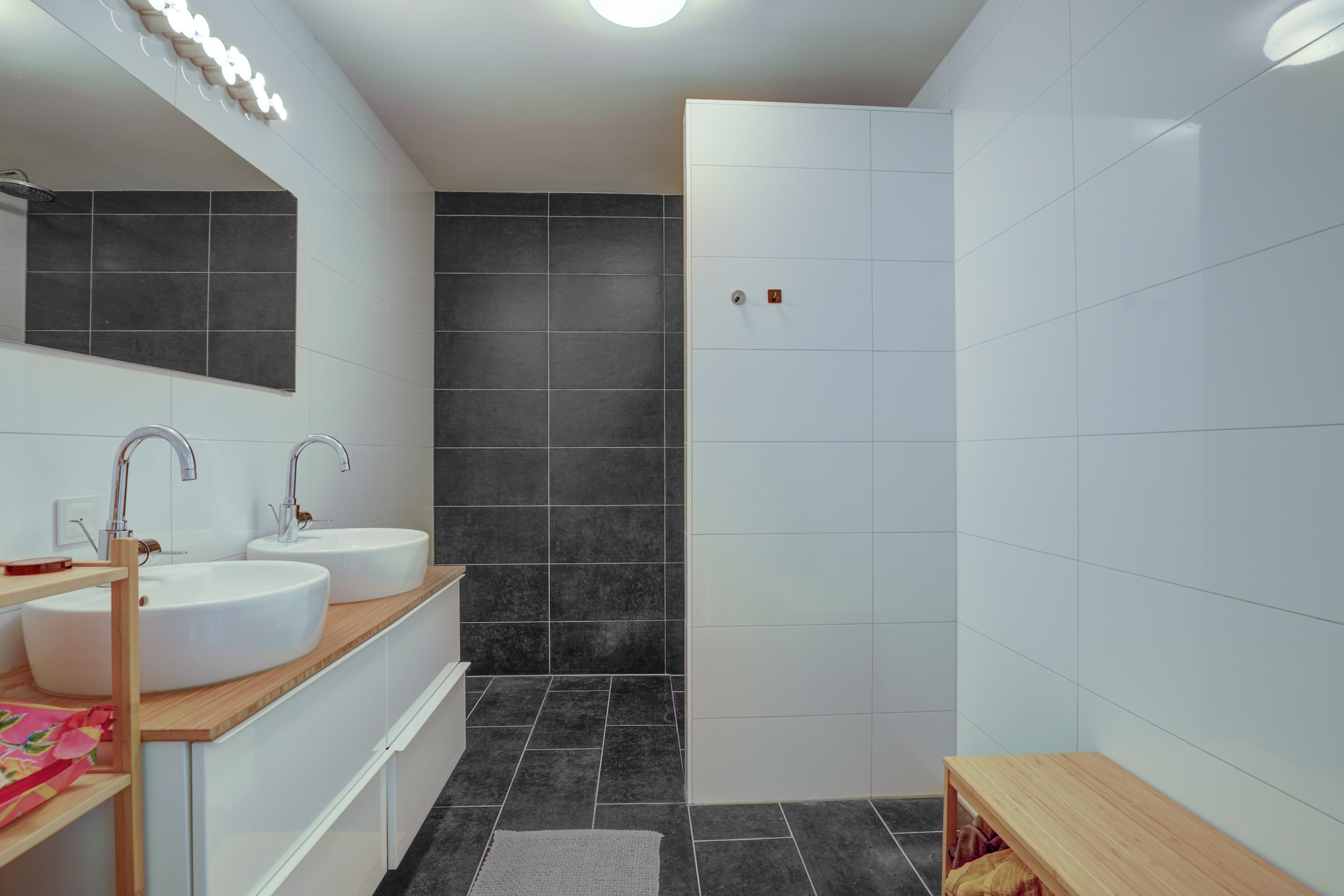 De badkamer (2017) is stijlvol uitgevoerd met een inloopdouche met regendouche en nisje voor verzorgingsproducten, dubbele wastafel en een modern meubel.