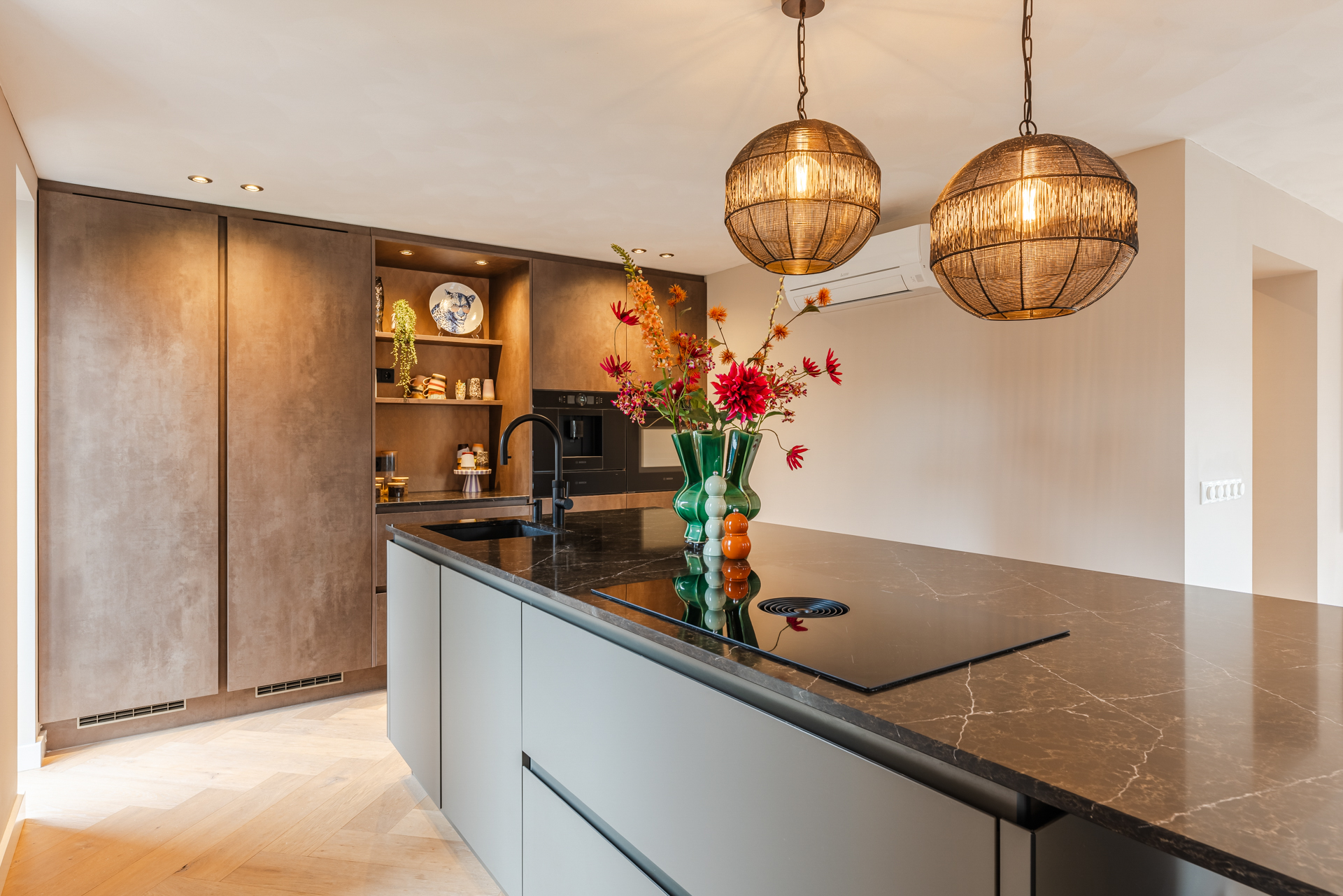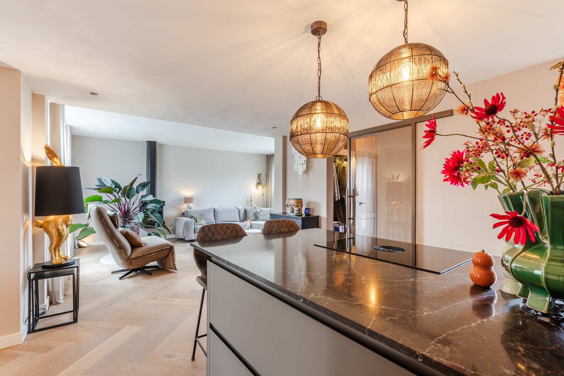 Via de prachtige messing schuifdeur met bronsglas loop je de sfeervolle woonkamer in met gashaard en schuifpui naar het terras. De luxe open keuken in de aanbouw (2020) is een ware eyecatcher: voorzien van een kookeiland met barkrukken en topapparatuur zoals een inductiekookplaat met geïntegreerde afzuiging, quooker, combi-oven, koelkast, vriezer, vaatwasser en inbouw koffieapparaat.