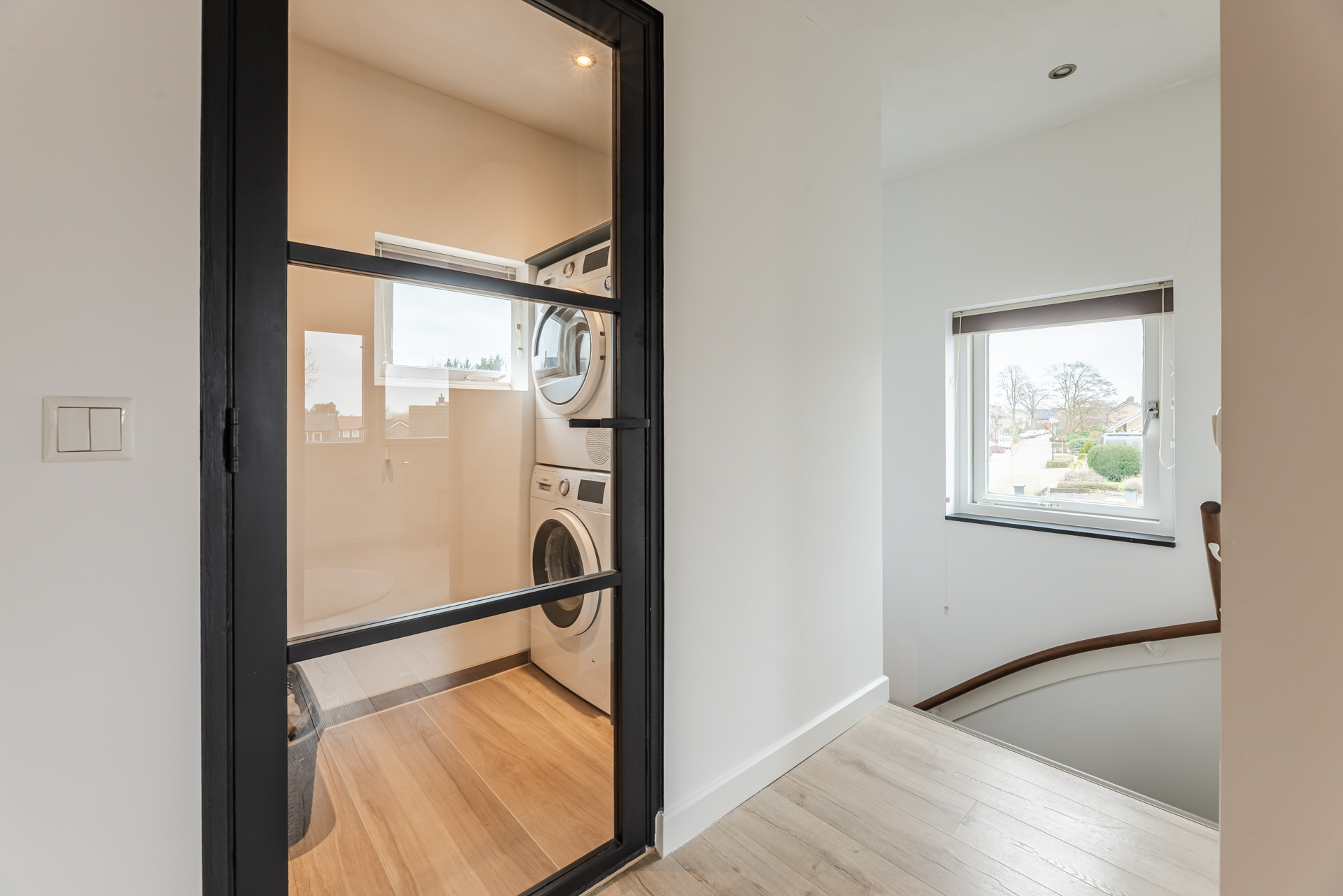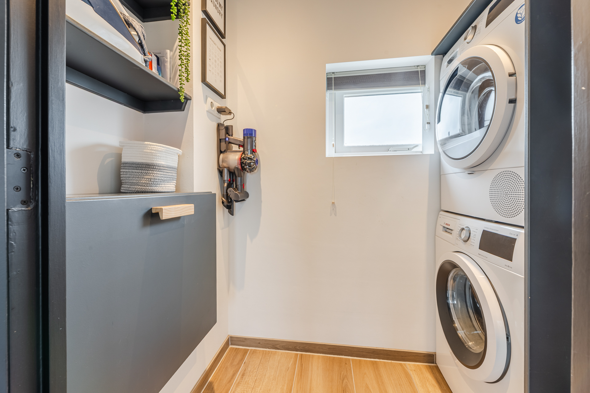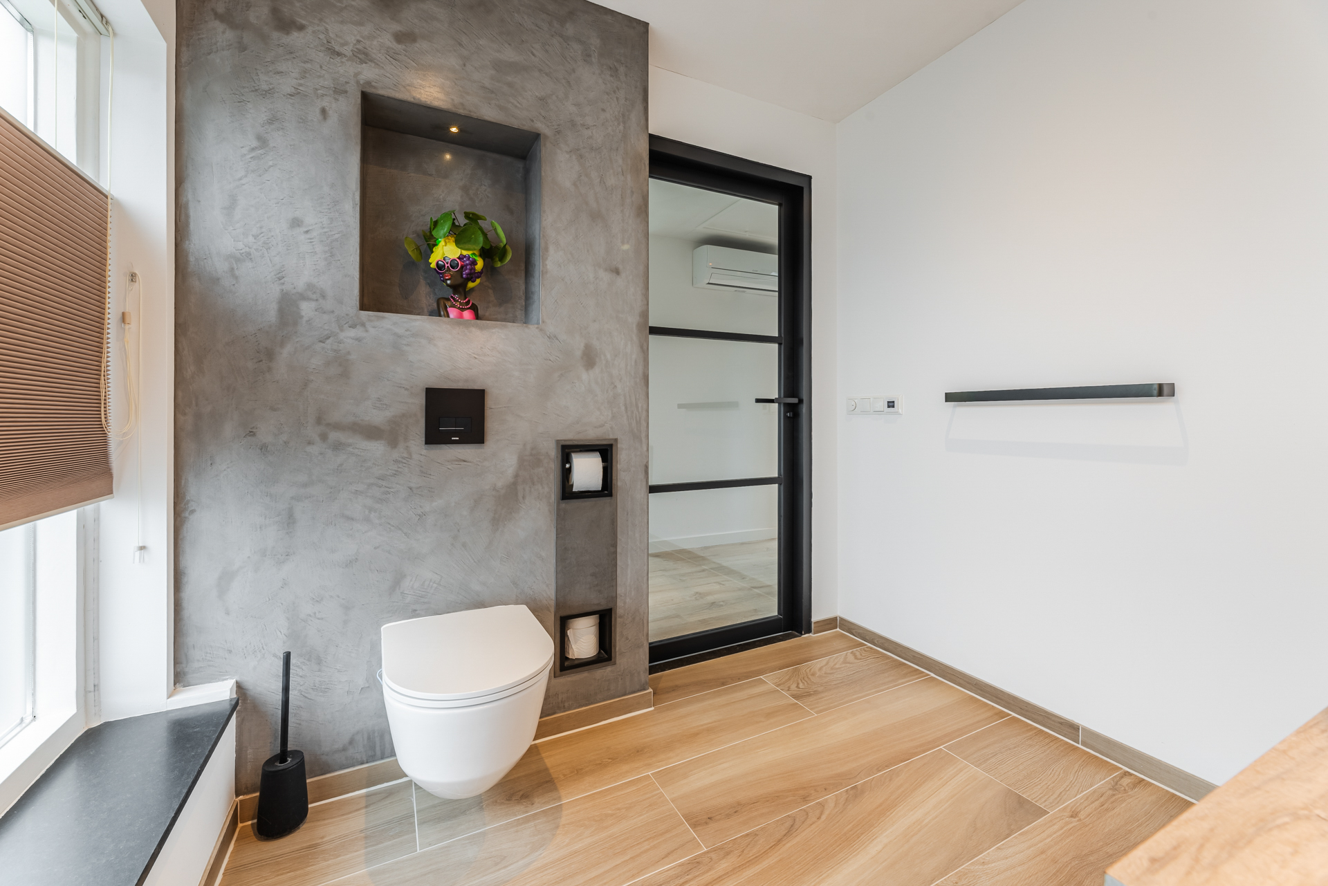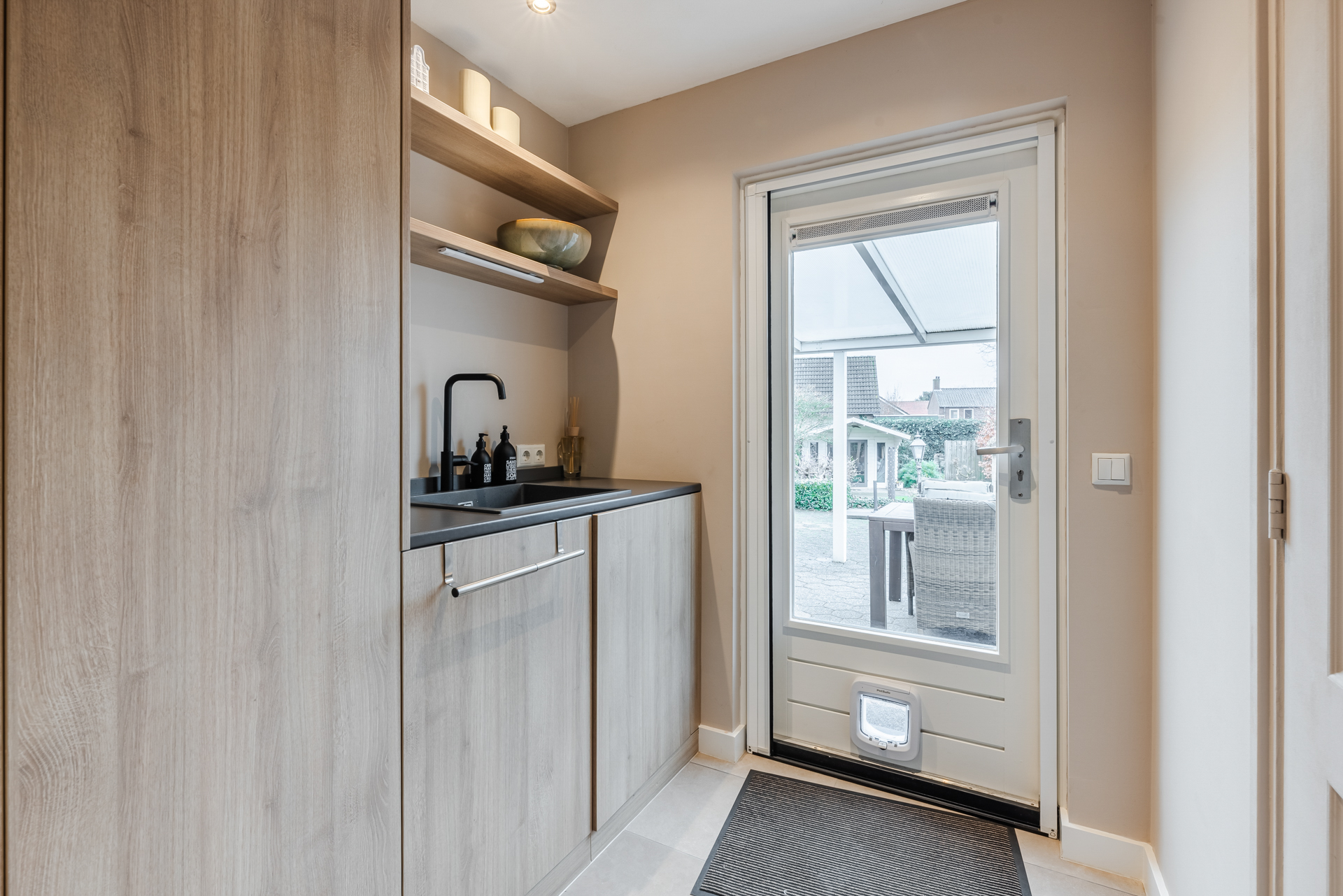 Aansluitend vind je de praktische bijkeuken met maatwerk-inbouwkasten, een werkblad met gootsteen, warmwaterboiler, witgoedaansluitingen en extra bergruimte. Ook bevindt zich hier het ruime en moderne toilet. Vanuit de bijkeuken loop je zo de tuin in.