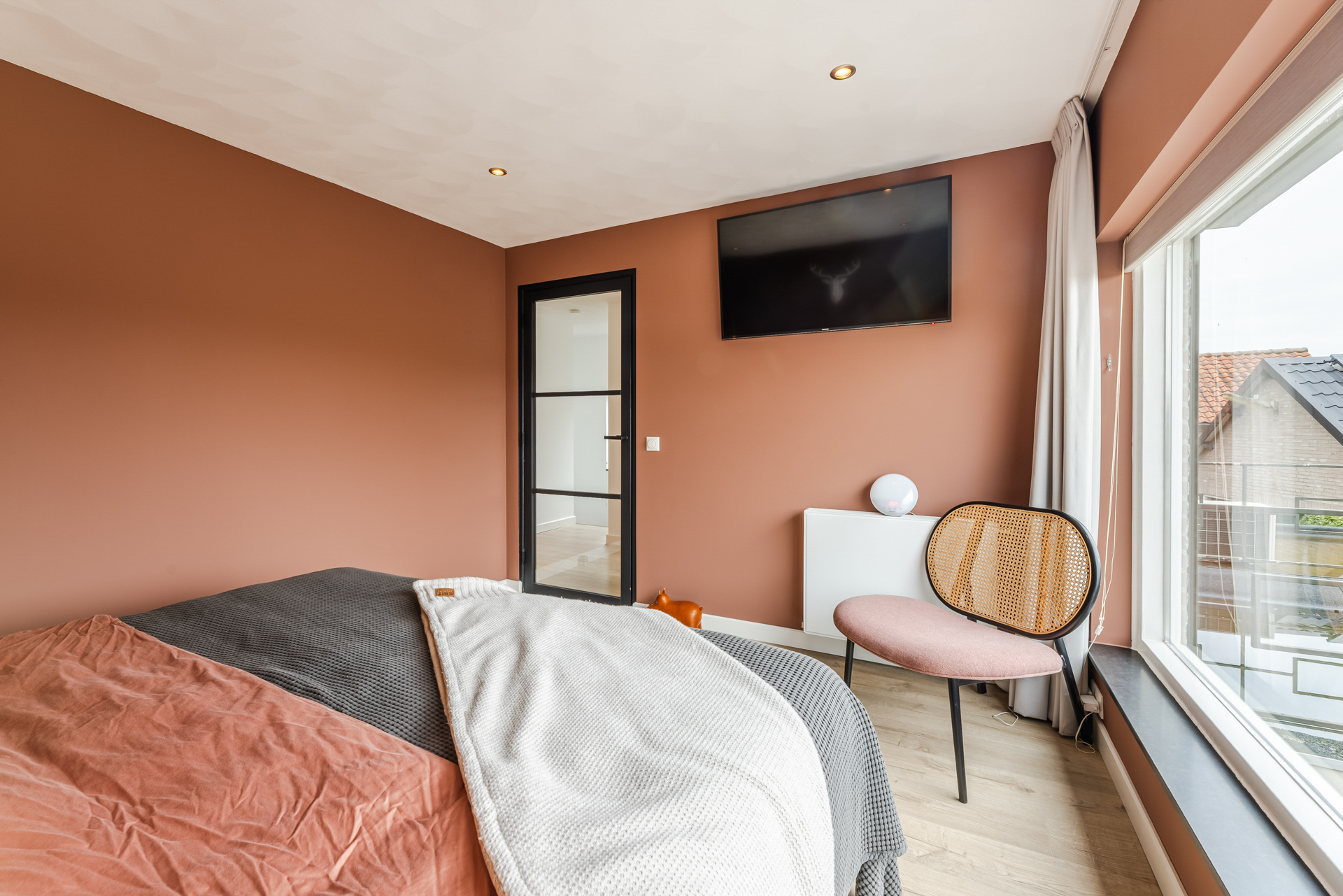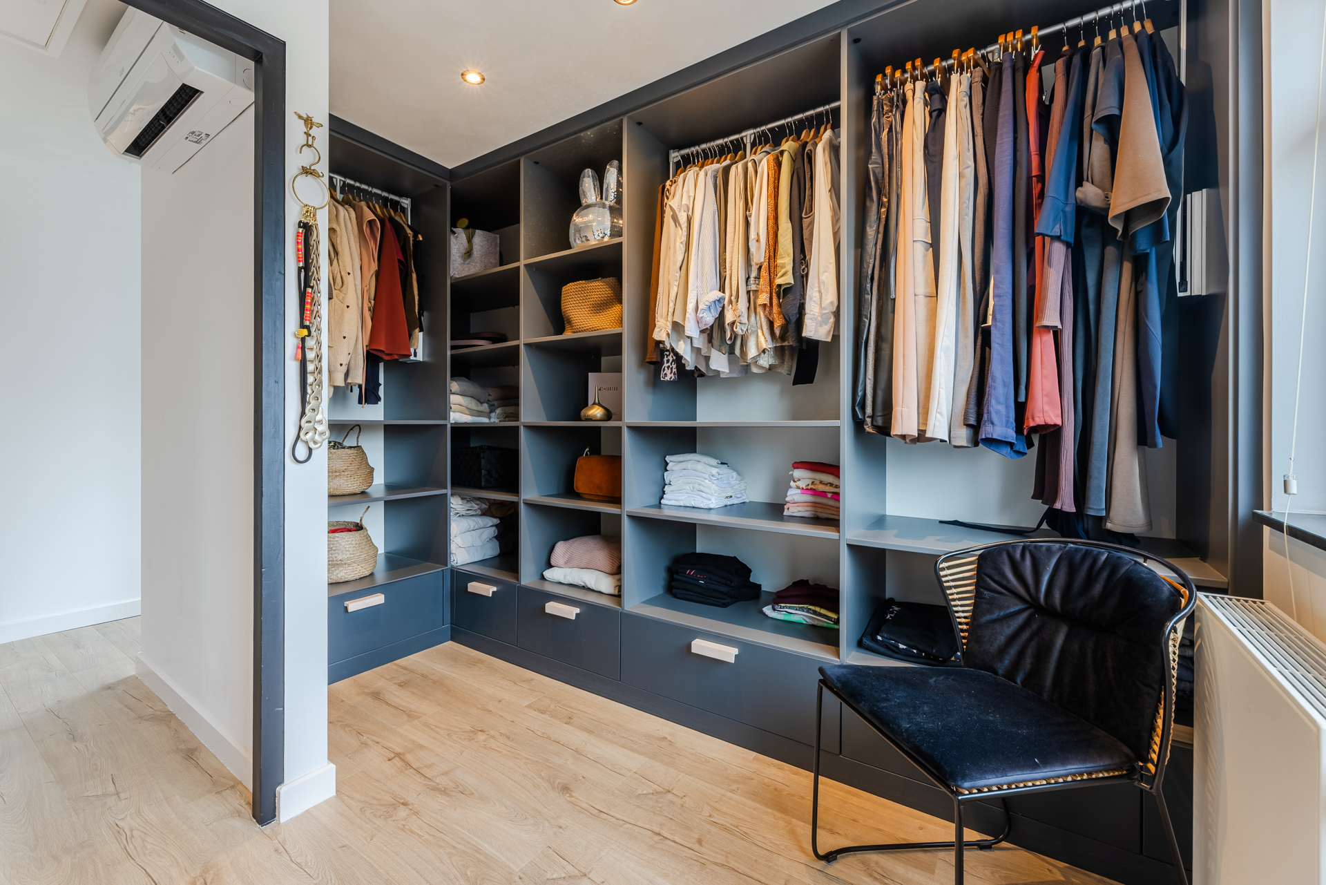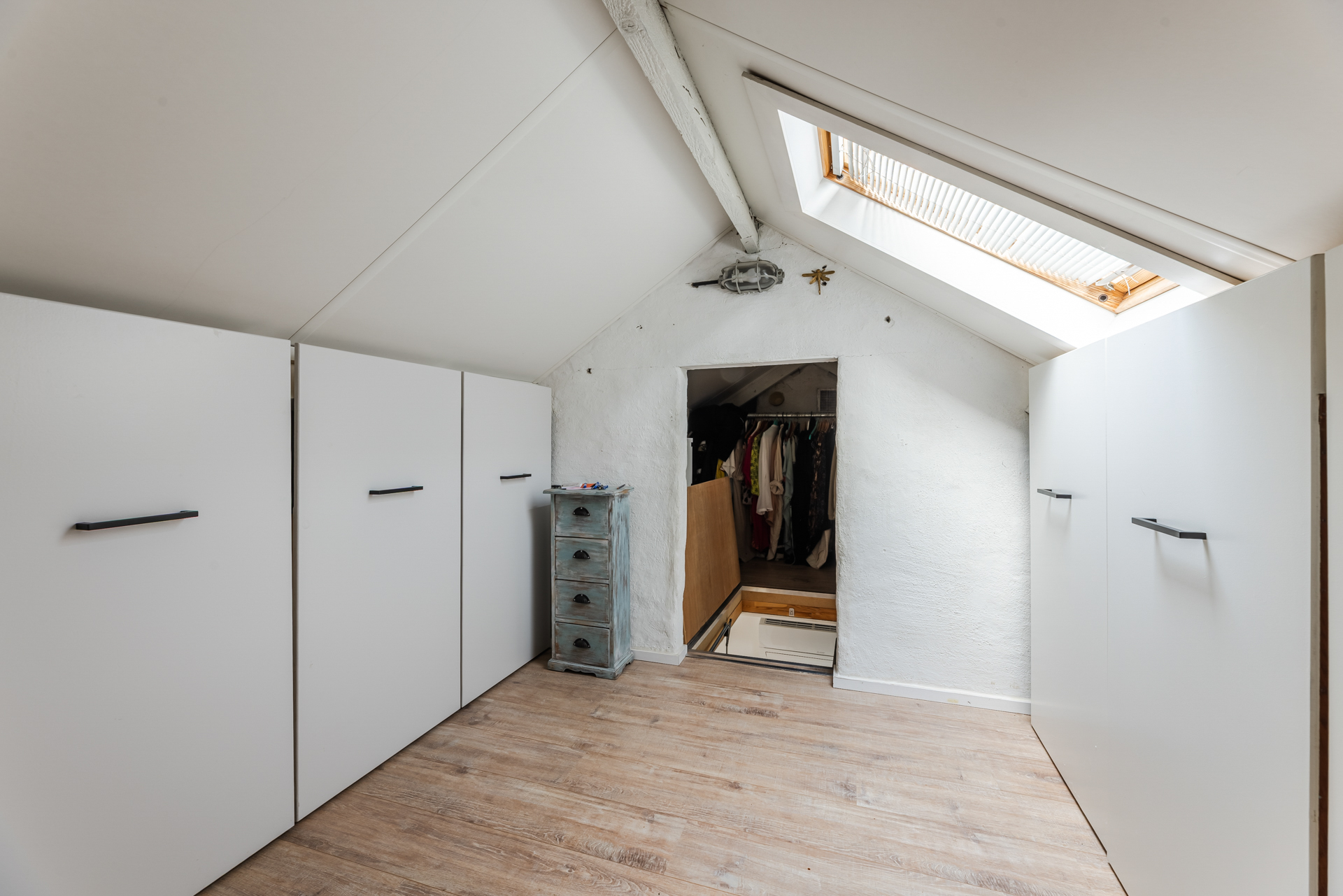 Overloop met airco. Twee slaapkamers, waarvan één momenteel is ingericht als luxe kleedkamer met maatwerkkasten. Vanuit deze kamer heb je toegang tot het platte dak van de bijkeuken, waar je – indien gewenst – met houtskeletbouw extra woonruimte kunt creëren.