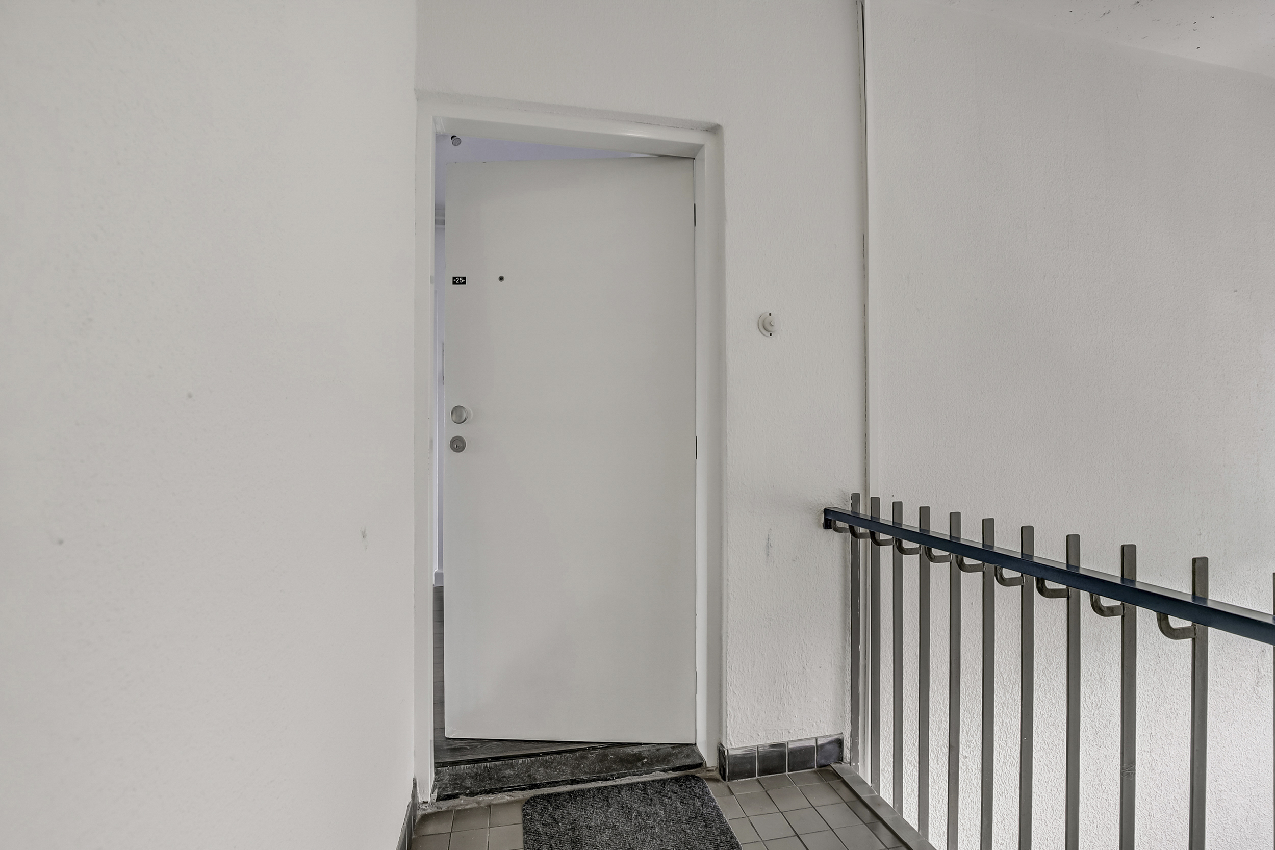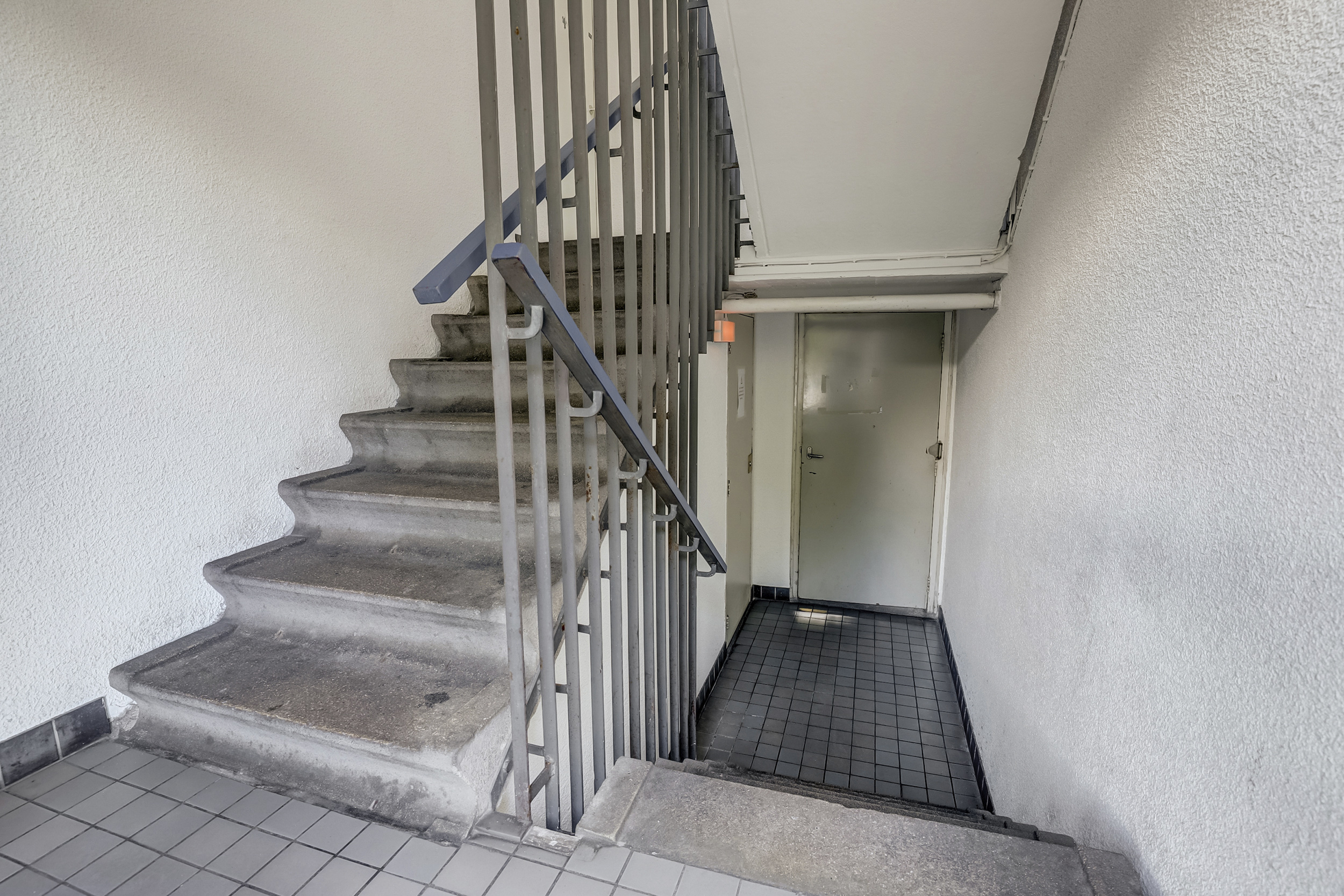 Binnenkomst in de centrale entree van het complex en het trappenhuis naar het appartement op de vierde verdieping.