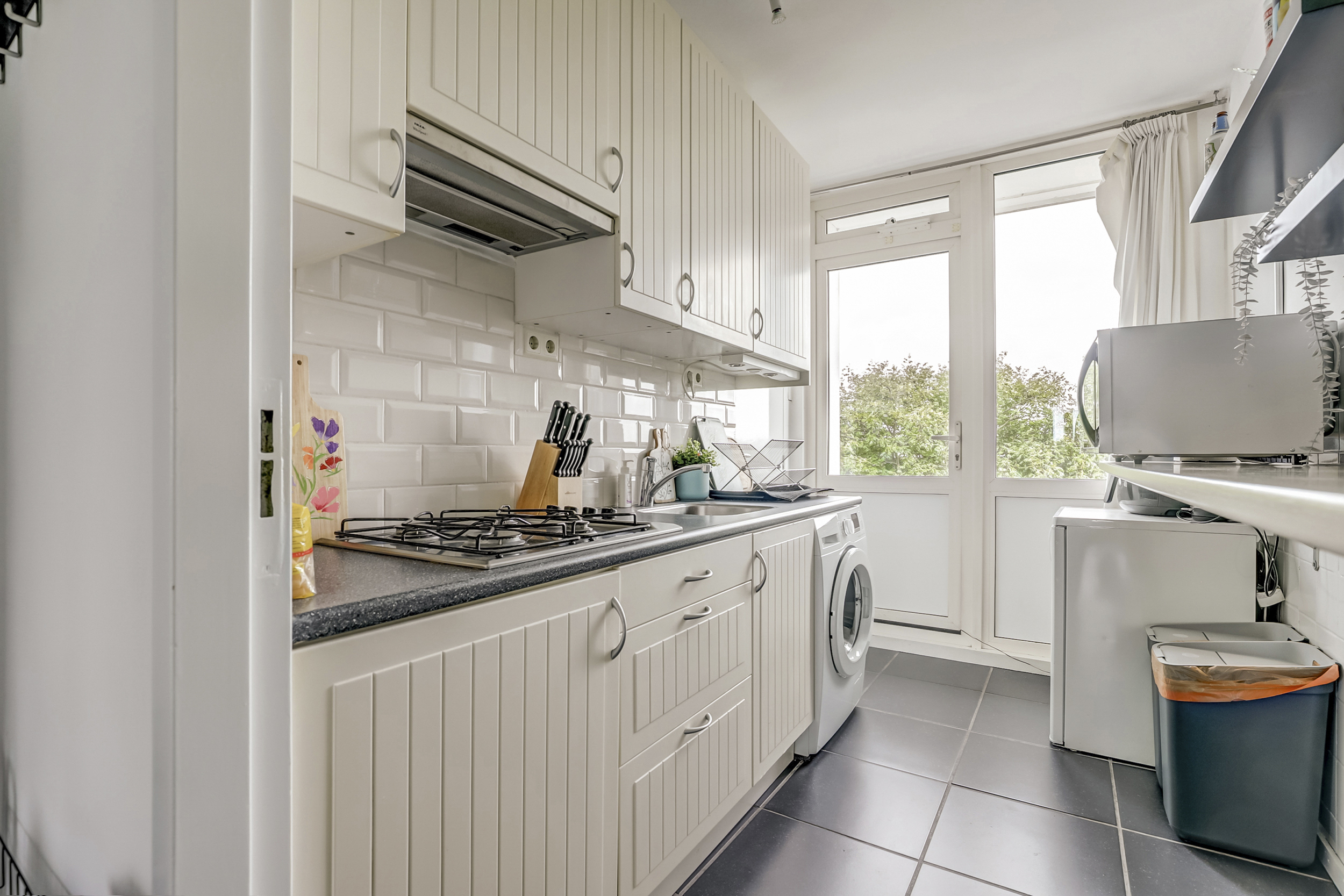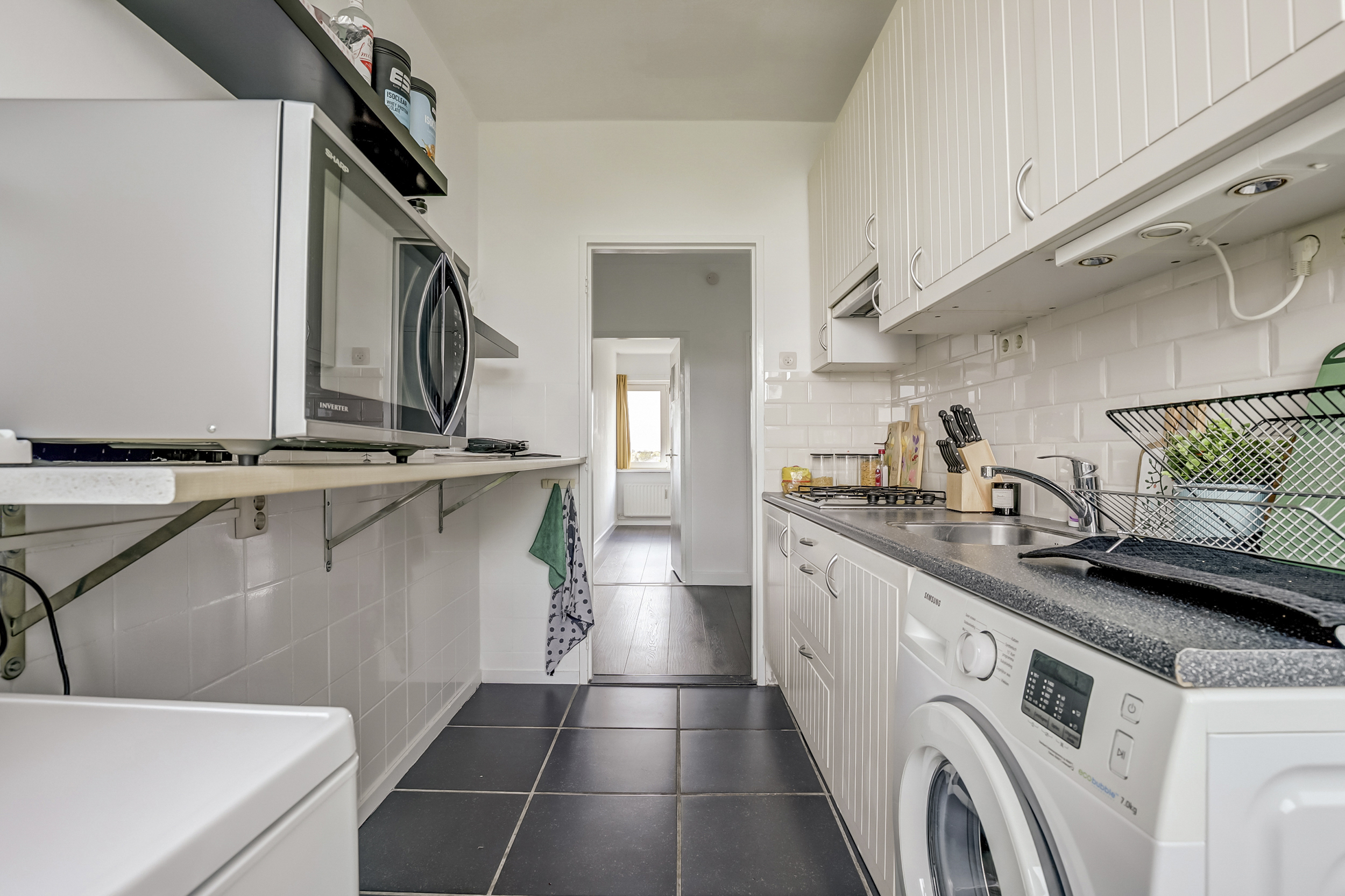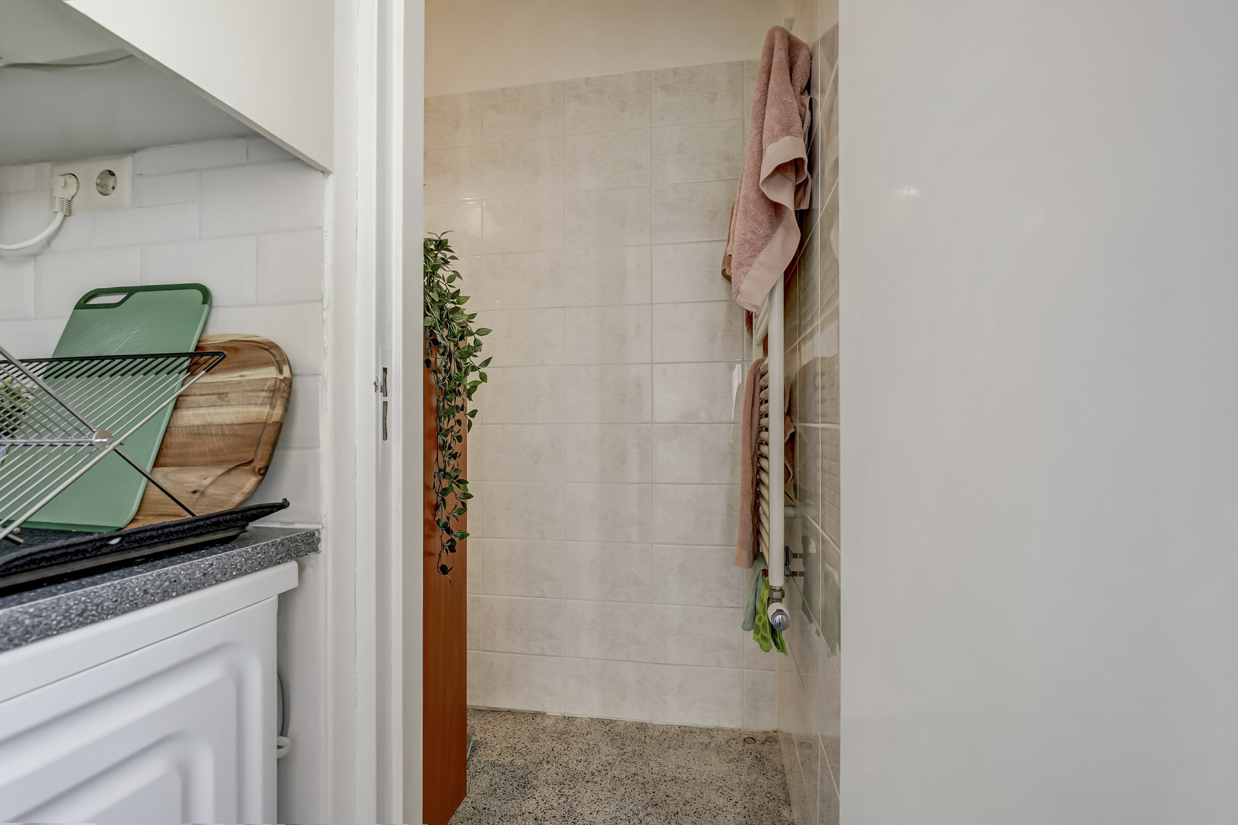Ook de keuken is toegankelijk via de hal. Deze biedt door de parallelopstelling veel werk- en opbergruimte en is voorzien van een gaskookplaat, afzuigkap en koelkast. Daarnaast zijn in de keuken de aansluitpunten voor de wasmachine aanwezig. Je kunt op een mooie dag lekker de deur van het balkon openzetten tijdens het koken. Met een ligging op het noordoosten is dit ook een fijne plek om de dag op te starten met een kop koffie.