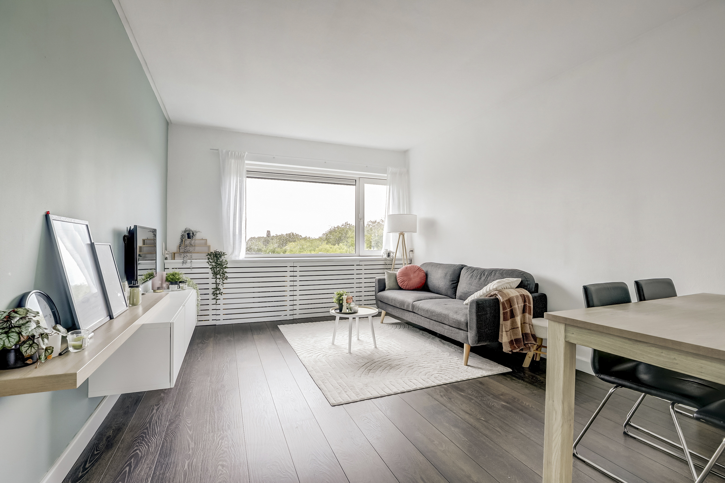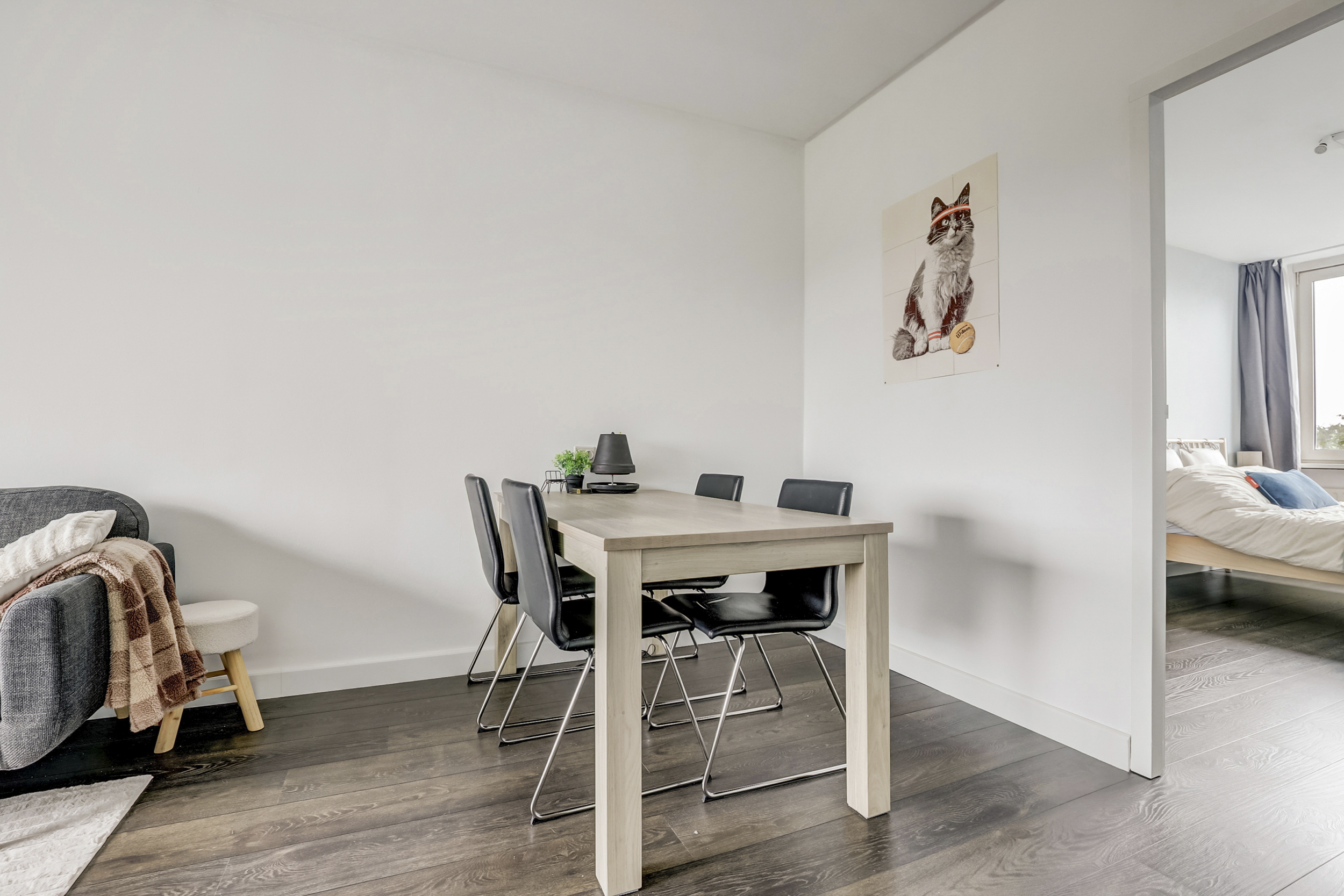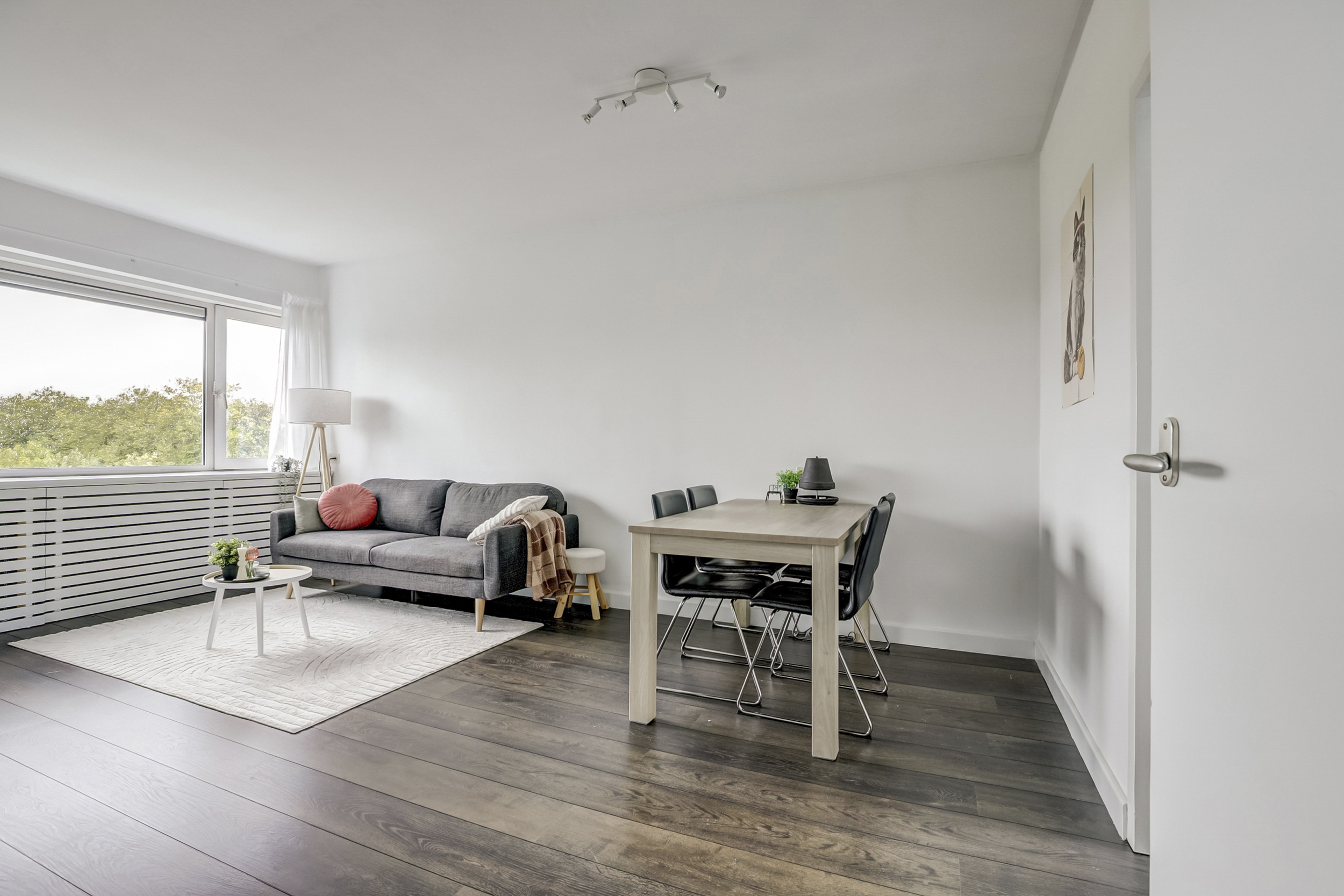 In de woonkamer valt direct de grote raampartij op aan de achtergevel die voor veel daglicht zorgt. Doordat je hoog in het gebouw woont, kijk je prettig van je weg op de bomen en het achterliggende Danielsplein. De woonkamer biedt voldoende plek voor zowel een grote (hoek)bank en de aansluitende, thans aparte eetkamer voorziet in volop ruimte voor een grote eetkameropstelling. De aparte eetkamer kan desgewenst bij de woonkamer getrokken worden (was oorspronkelijk zo) of als 3e slaapkamer worden gebruikt.