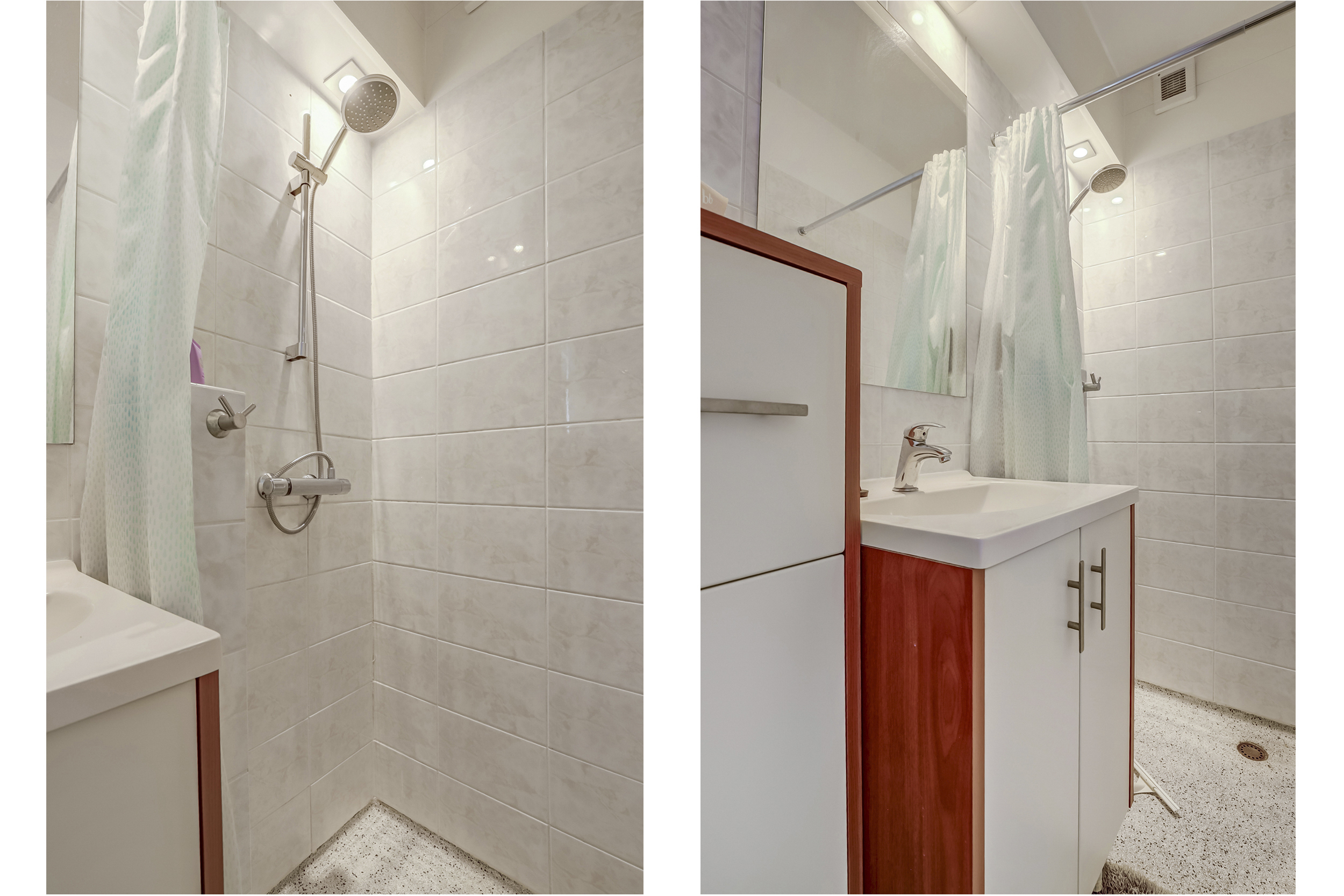 De badkamer met granito vloer is toegankelijk via de keuken. Deze is voorzien van een douche en een wastafelmeubel. Het toilet is apart van de badkamer. Wel zo prettig met bezoek.