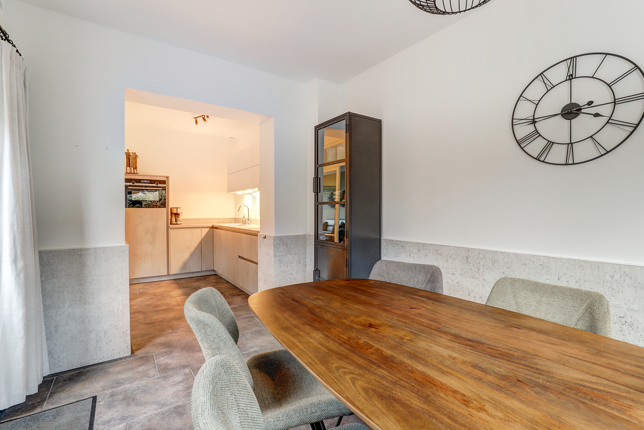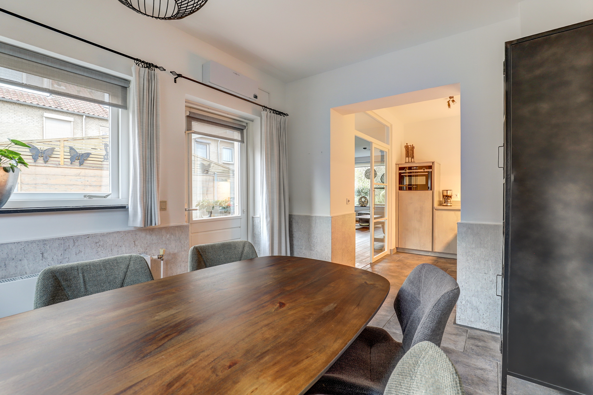 Entree/hal met trapopgang (bekleed met PVC in houtlook) naar de 1ste verdieping, tegelvloer, garderobe nis, meterkast met klikgroepen (2020), voordeur met rolluik, praktische verdiepte trapkast en toiletruimte (2020) met wandcloset, fontein en in lichte kleur betegeld. Sfeervolle woonkamer, welke is voorzien van eiken plankenvloer, strakke wand- en plafondafwerking, airco-unit (2022) en openslaande deuren naar de woonkeuken. Ruime uitgebouwde woonkeuken, met tegelvloer, ruimte voor een 6-persoons eettafel, deur naar de achtertuin en L-vormig opgestelde keuken uit 2020. De moderne keuken is voorzien van diverse inbouwapparatuur, o.a. koelkast, 4-pits inductiekookplaat, vaatwasser, combioven (2025), afzuigkap en kokend water kraan.