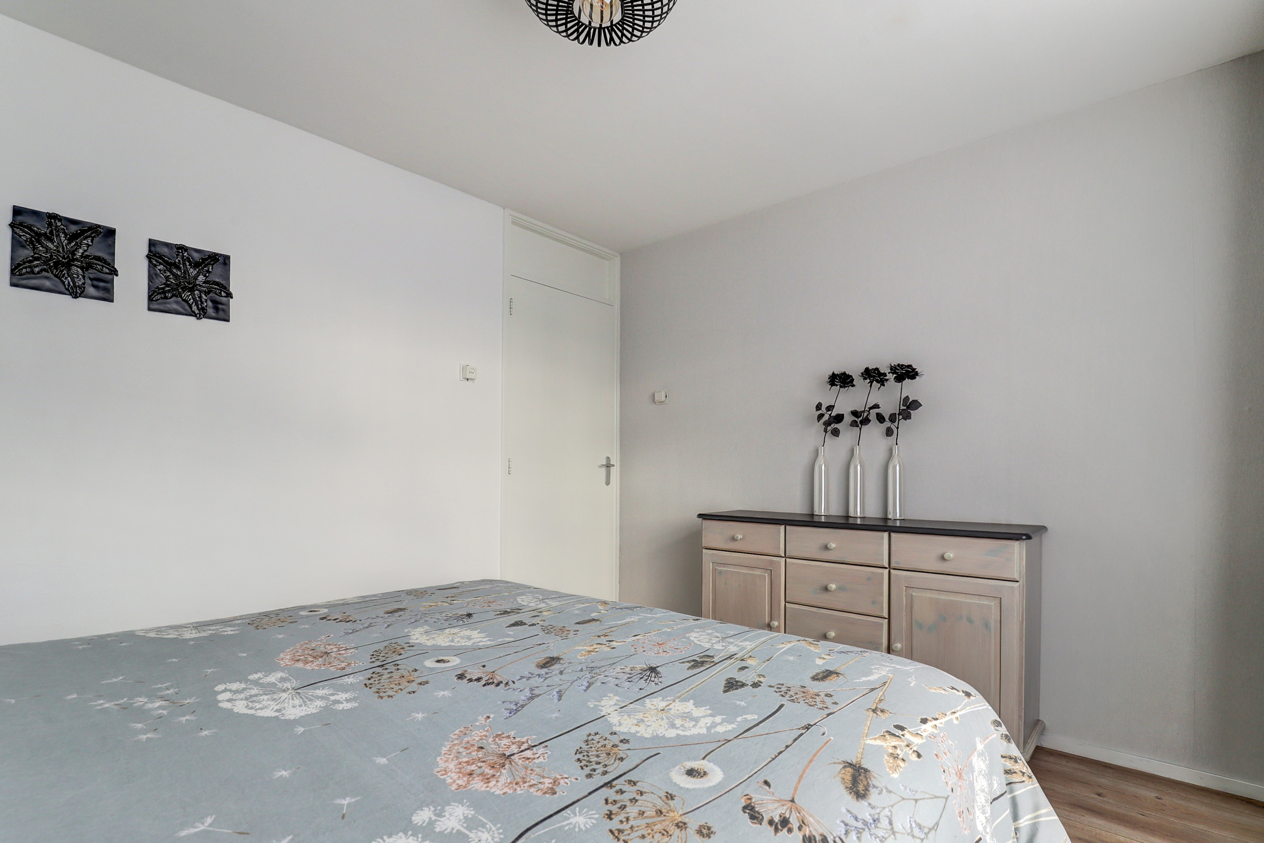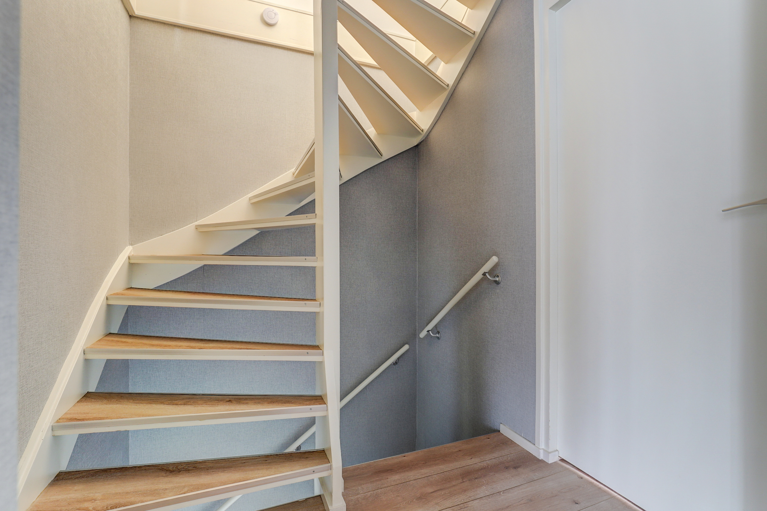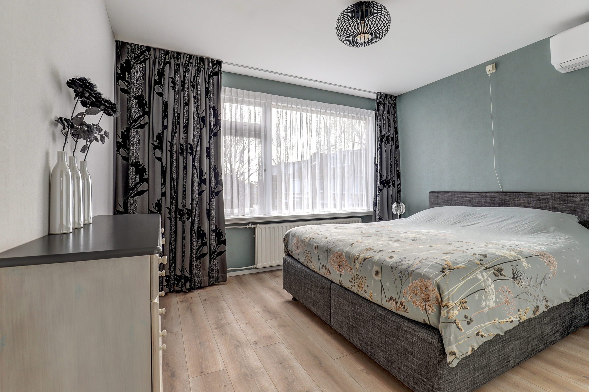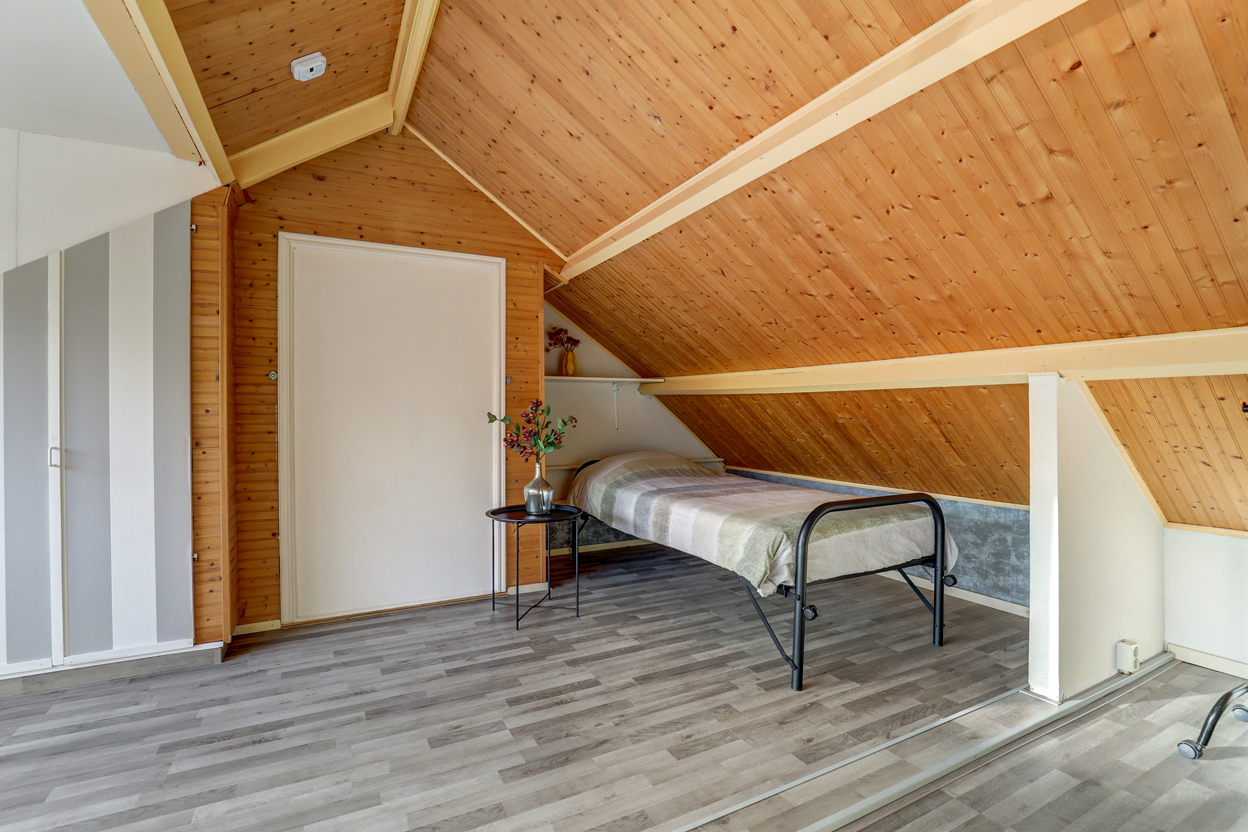 Overloop met laminaatvloer, toegang tot de 3 slaapkamers, de wasruimte, de badkamer en de vaste trapopgang (bekleed met PVC in houtlook) naar de 2de verdieping. De 3 slaapkamers zijn voorzien van laminaatvloer of tegelvloer en rolluiken. De grootste slaapkamer is tevens voorzien van airco-unit (2022). De keurige badkamer is in 2017 geplaatst en voorzien van inloopdouche met hand- en regendouche, wastafelmeubel, wandcloset, strak gestuukte wanden en plafonds, spotjes en raam met rolluik. Praktische separate wasruimte met wasbak (koud- en warmwater) en geheel betegeld.