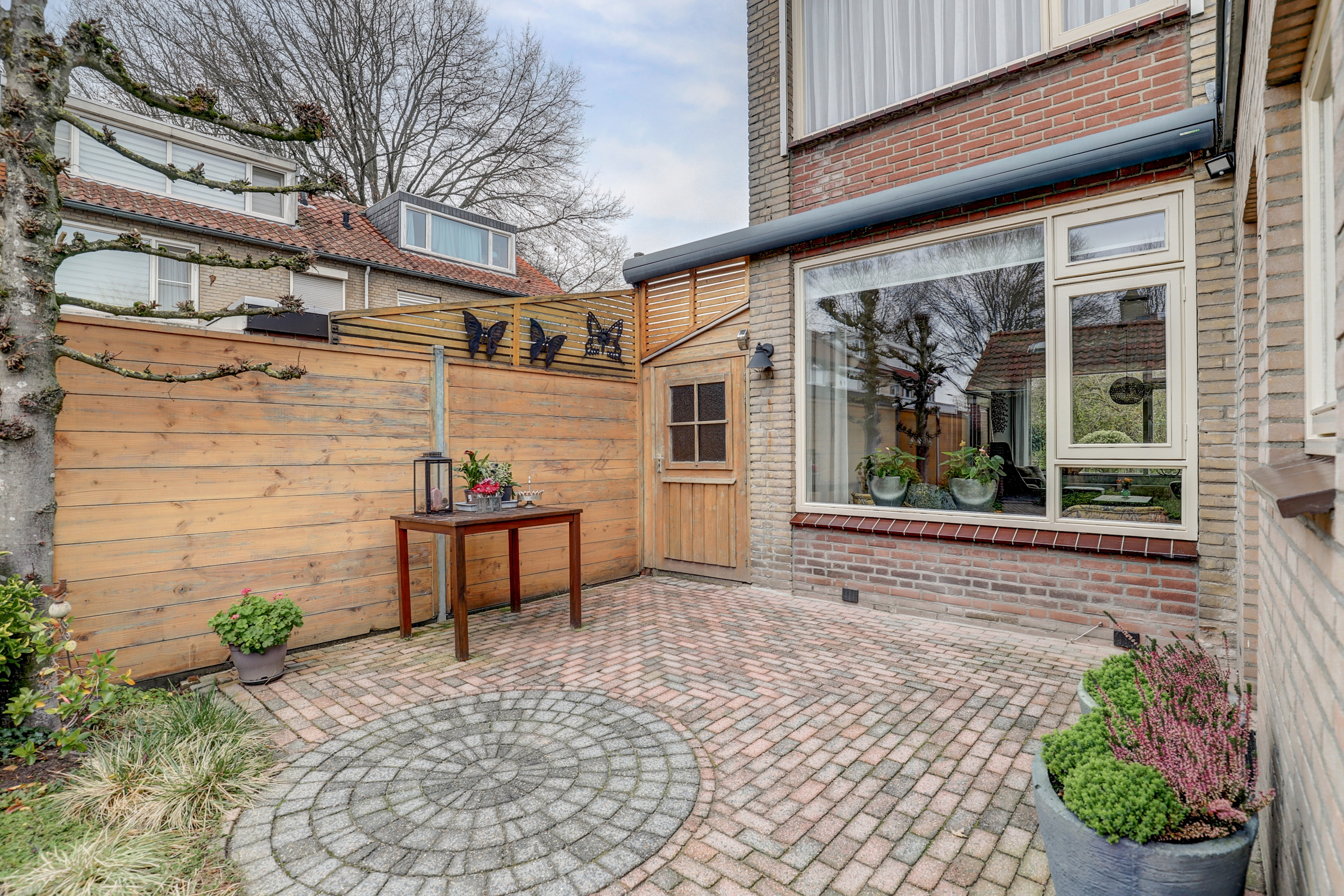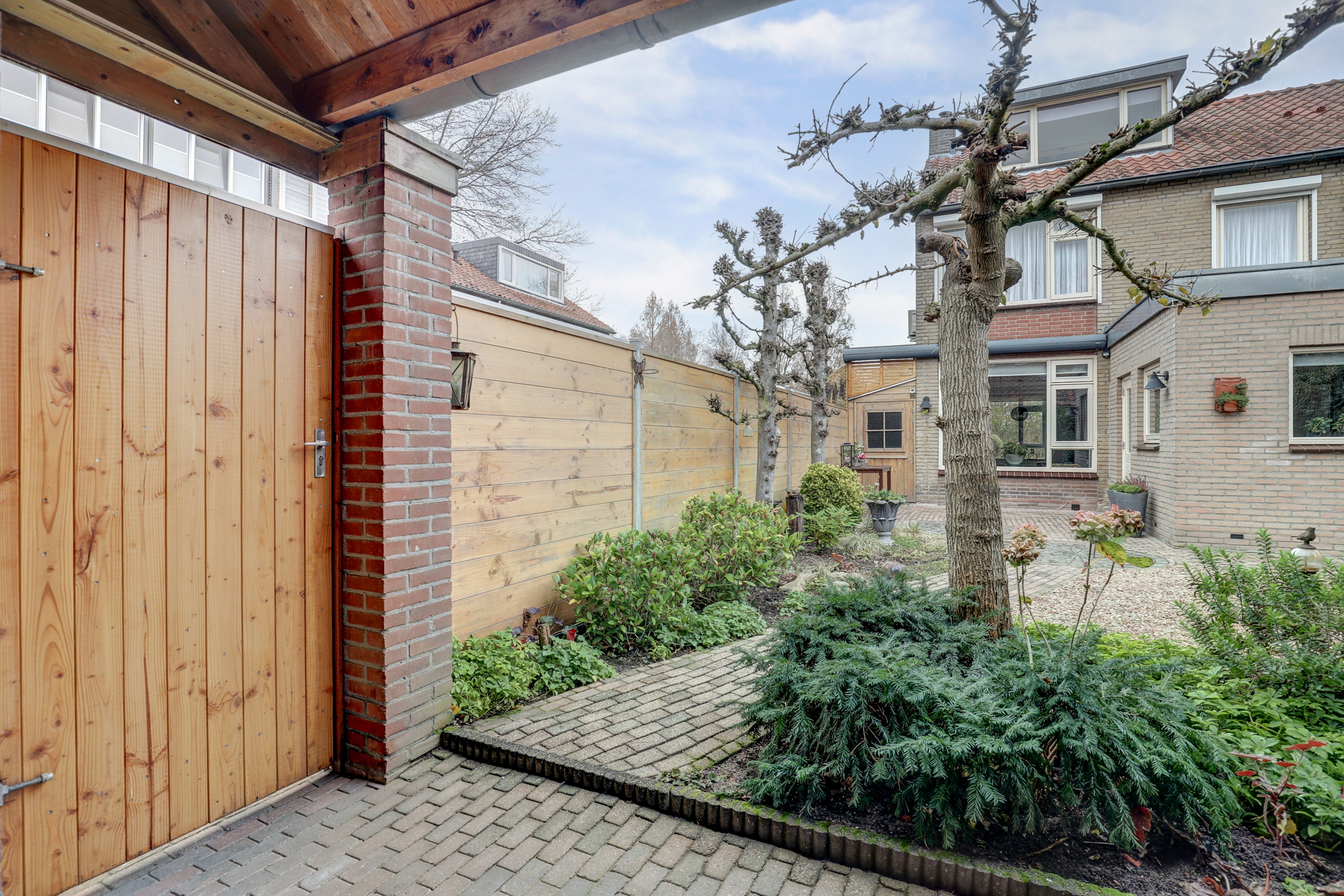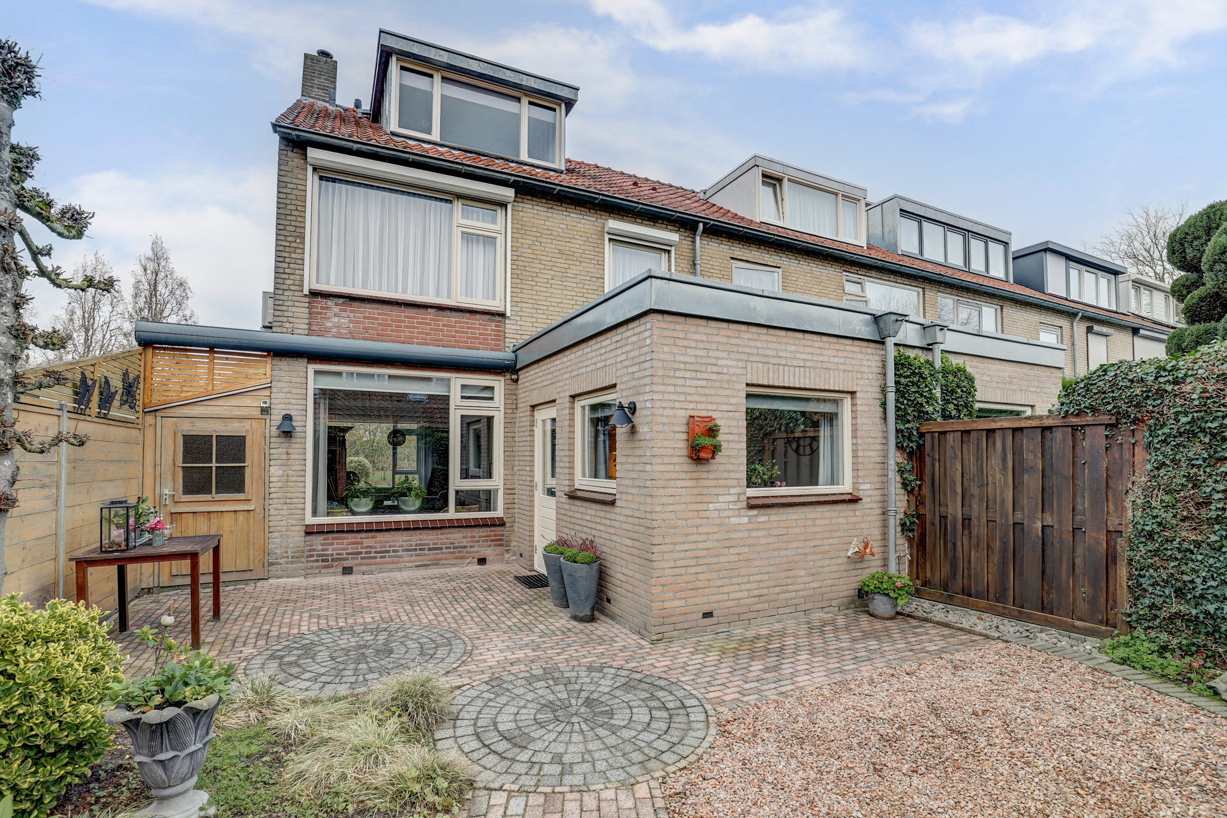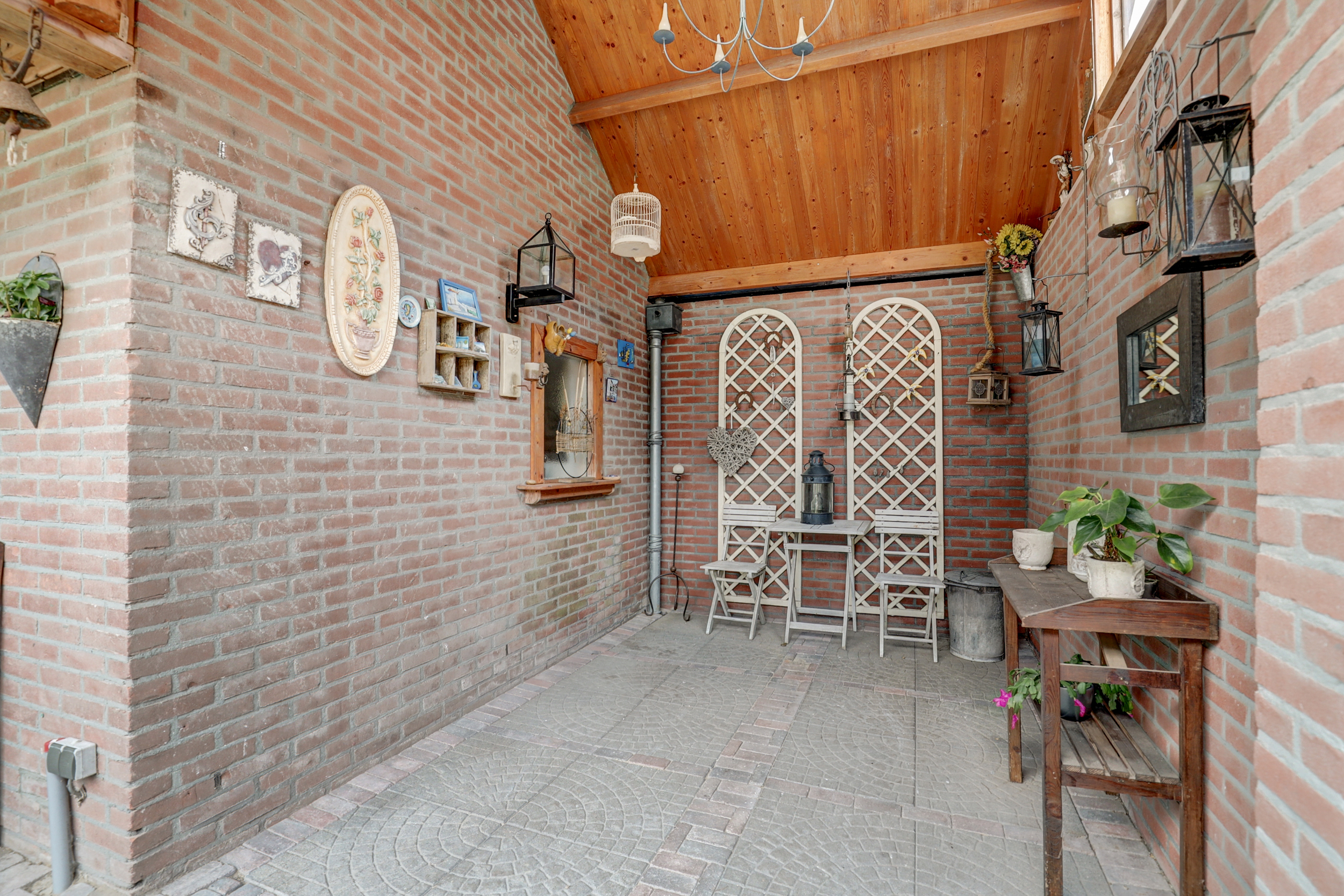 De zonnige en sfeervolle achtertuin is gelegen op het zuiden en voorzien van terras met elektrisch zonnescherm, achterom via een poort, buitenkraan, elektrapunt, kleine berging (ca. 3,5 m2) naast het huis en ruime stenen berging van ca. 13,5 m2 met elektra en bergvliering. Daarnaast is er in de achtertuin nog een sfeervolle overkapping van ca. 11 m2 met hoogte tot in de nok en een dakraam.