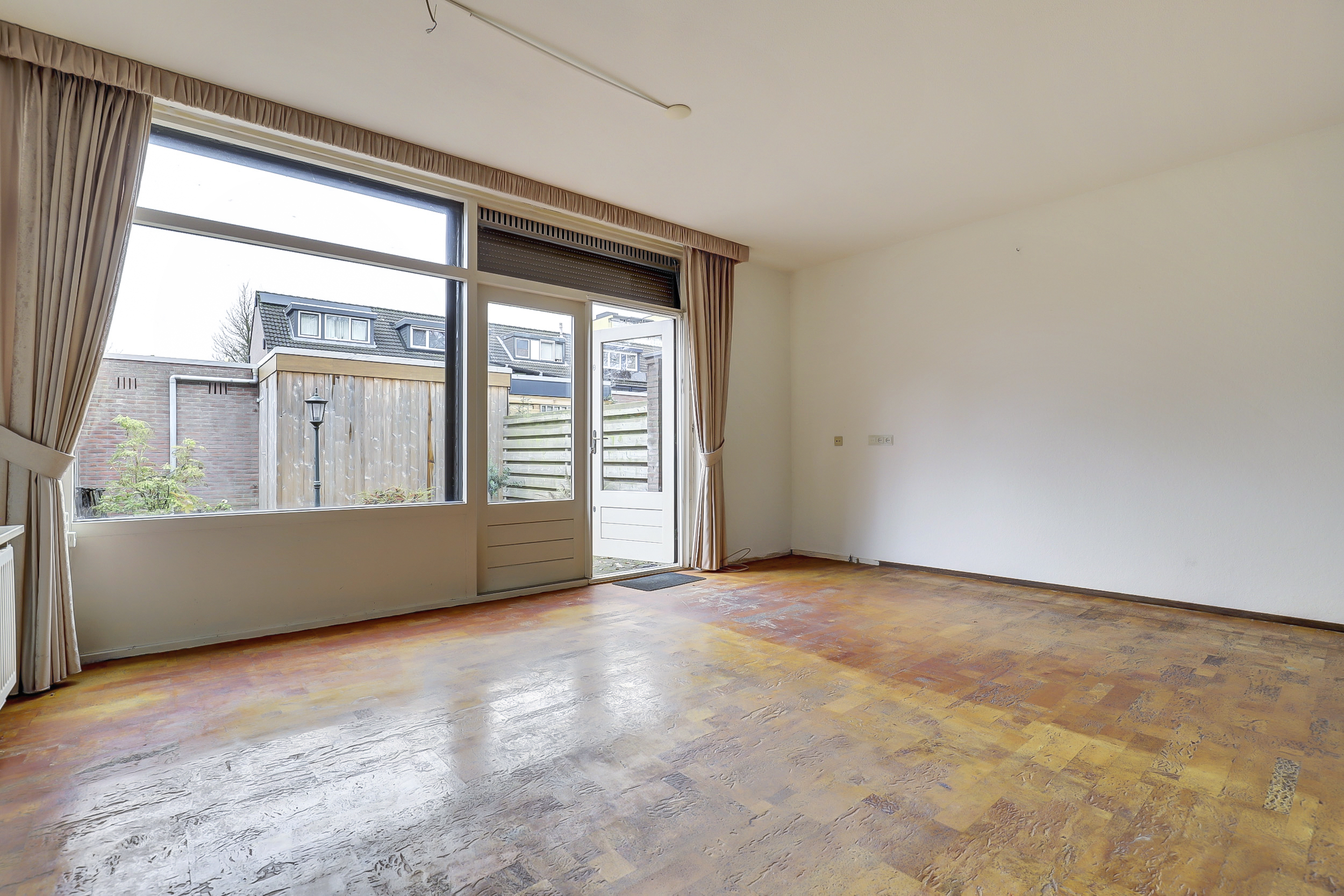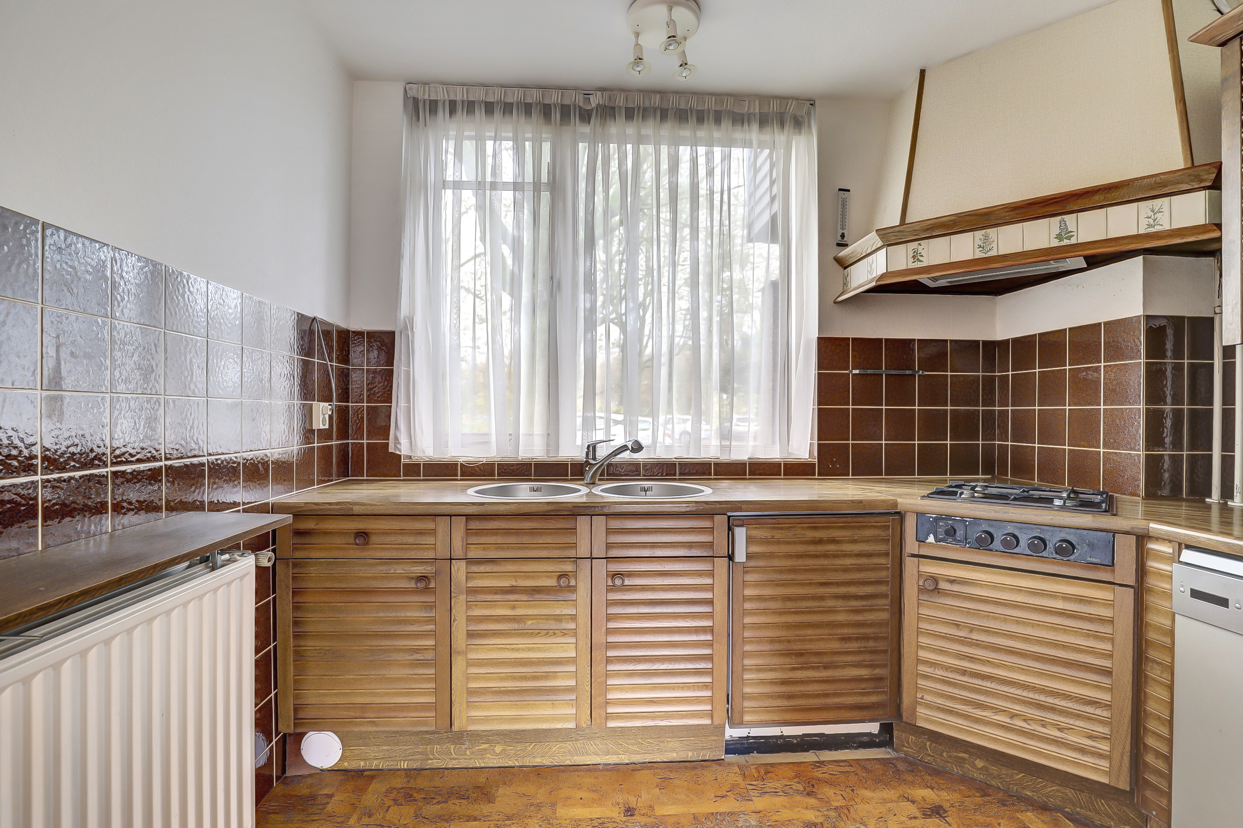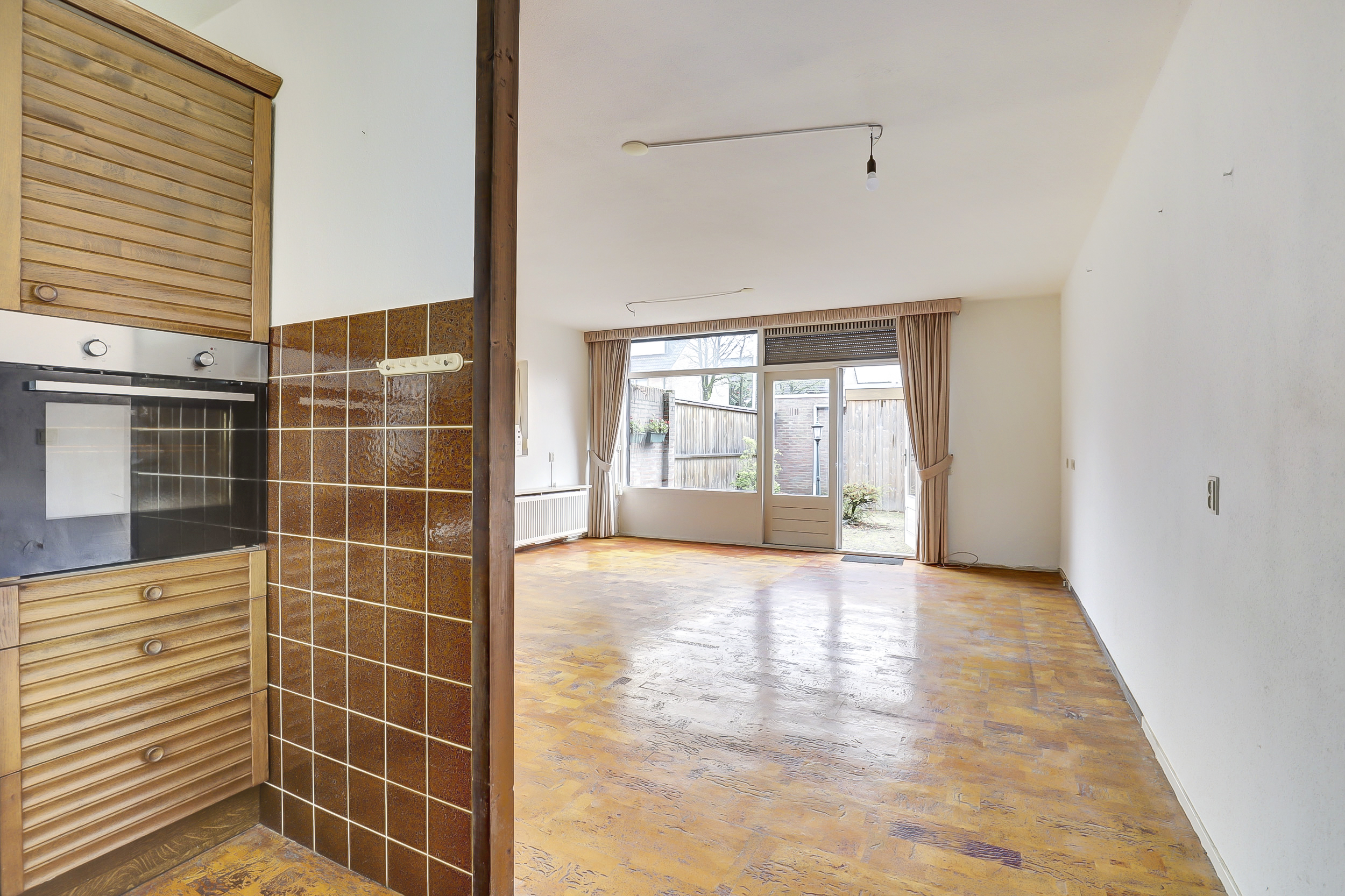 Bij aankomst van de woning wordt je verwelkomd door een voordeur met glas-in-lood. Stap binnen in de ruime hal waar je ruimte hebt voor het ophangen van jassen. Hier bevindt zich ook de meterkast, het toilet met fontein en de vaste trap naar de eerste verdieping. De woonkamer ligt aan de tuinzijde en heeft veel natuurlijk licht dankzij de grote raampartijen. Daarnaast is er een praktische trapkast en zijn er elektrische rolluiken. Vanuit de woonkamer is er direct toegang tot de tuin, waardoor binnen en buiten makkelijk in elkaar overlopen. Aan de voorzijde ligt de halfopen L-vormige keuken: een functionele werkruimte met inbouwapparatuur, oven (2016), 4-pits gasfornuis, vaatwasser, koelkast (2016) en een raam met uitzicht naar buiten en elektrisch rolluik.
